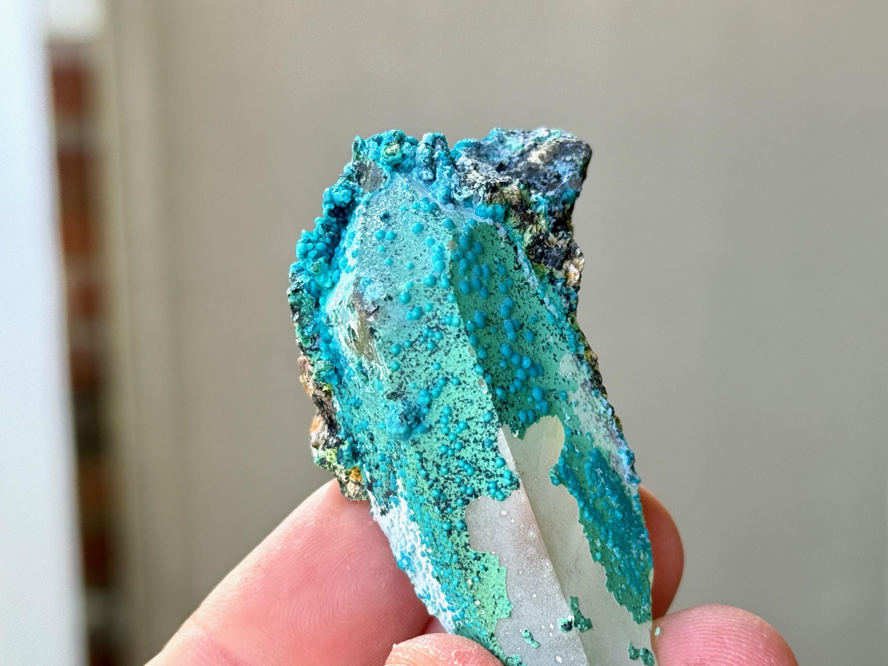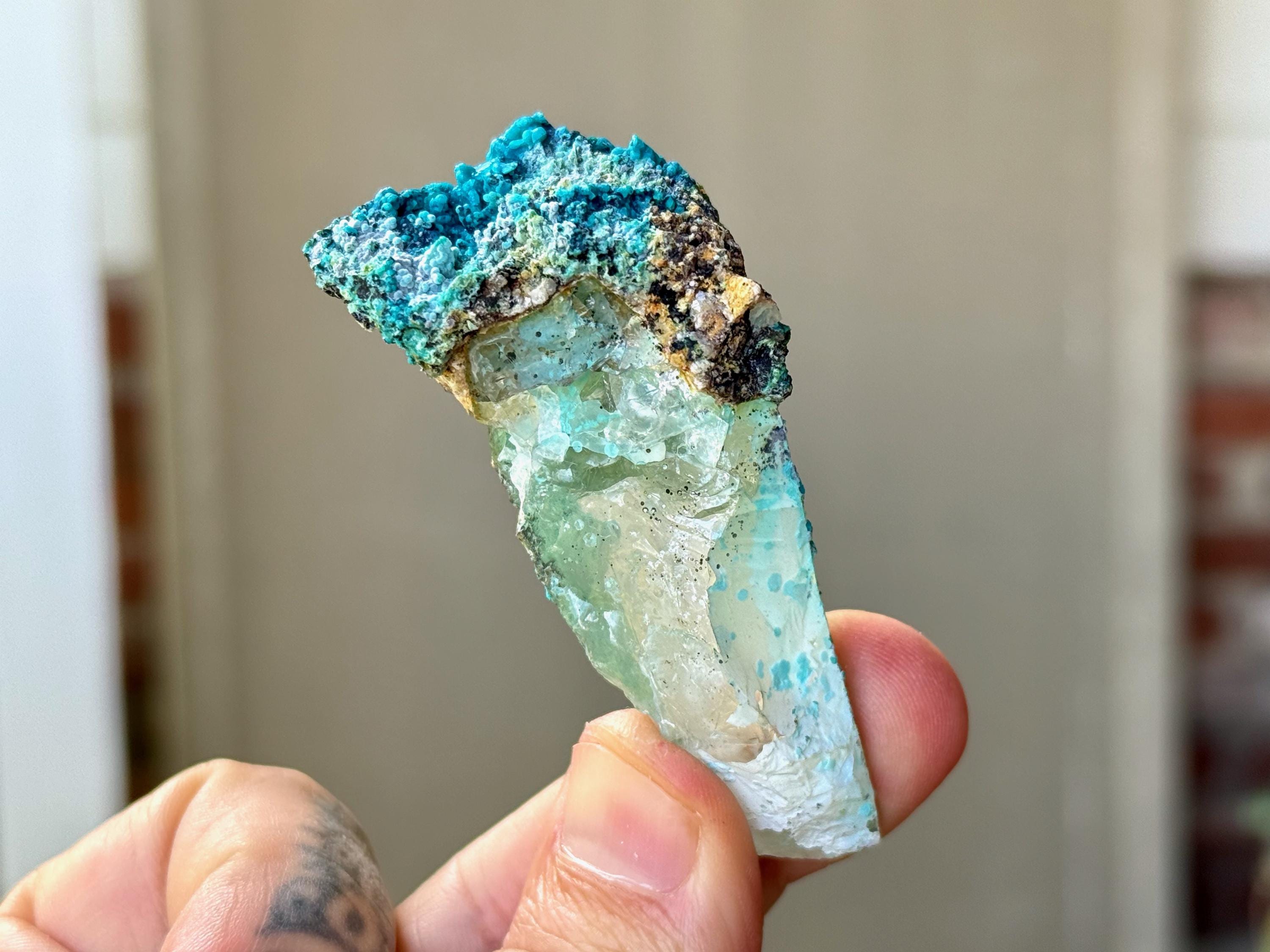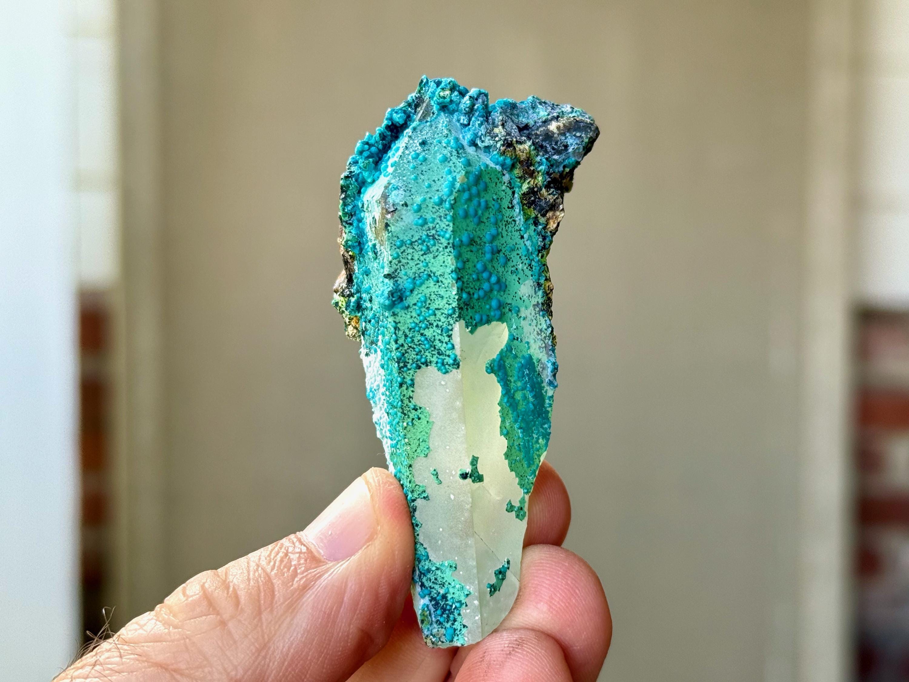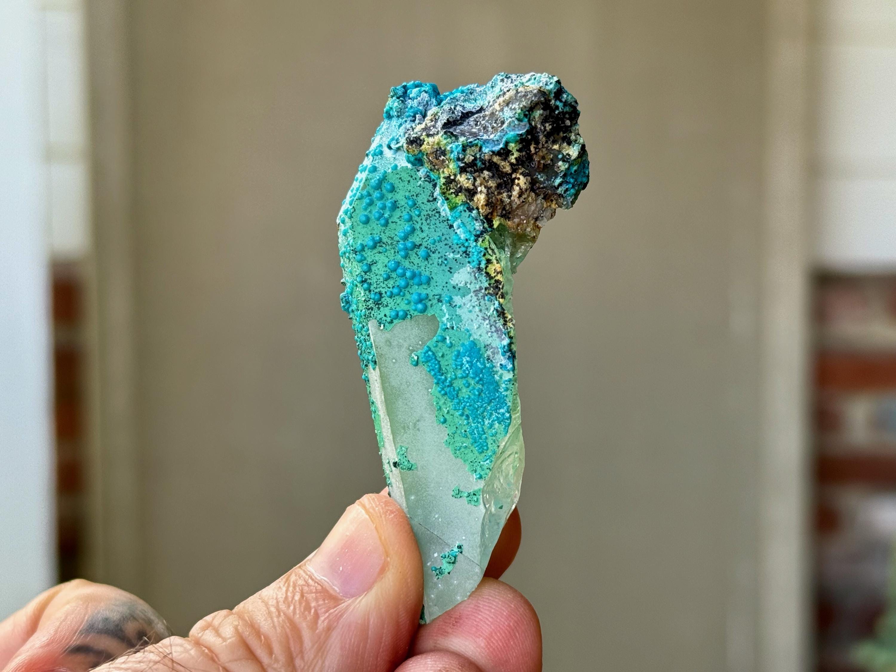 When backlit, as in Photos 3-4, we can see just how beautifully this piece lights up. The Quartz point is fully formed and terminated nicely, with some of the Chrysocolla covering the top. Outstanding color and quality!