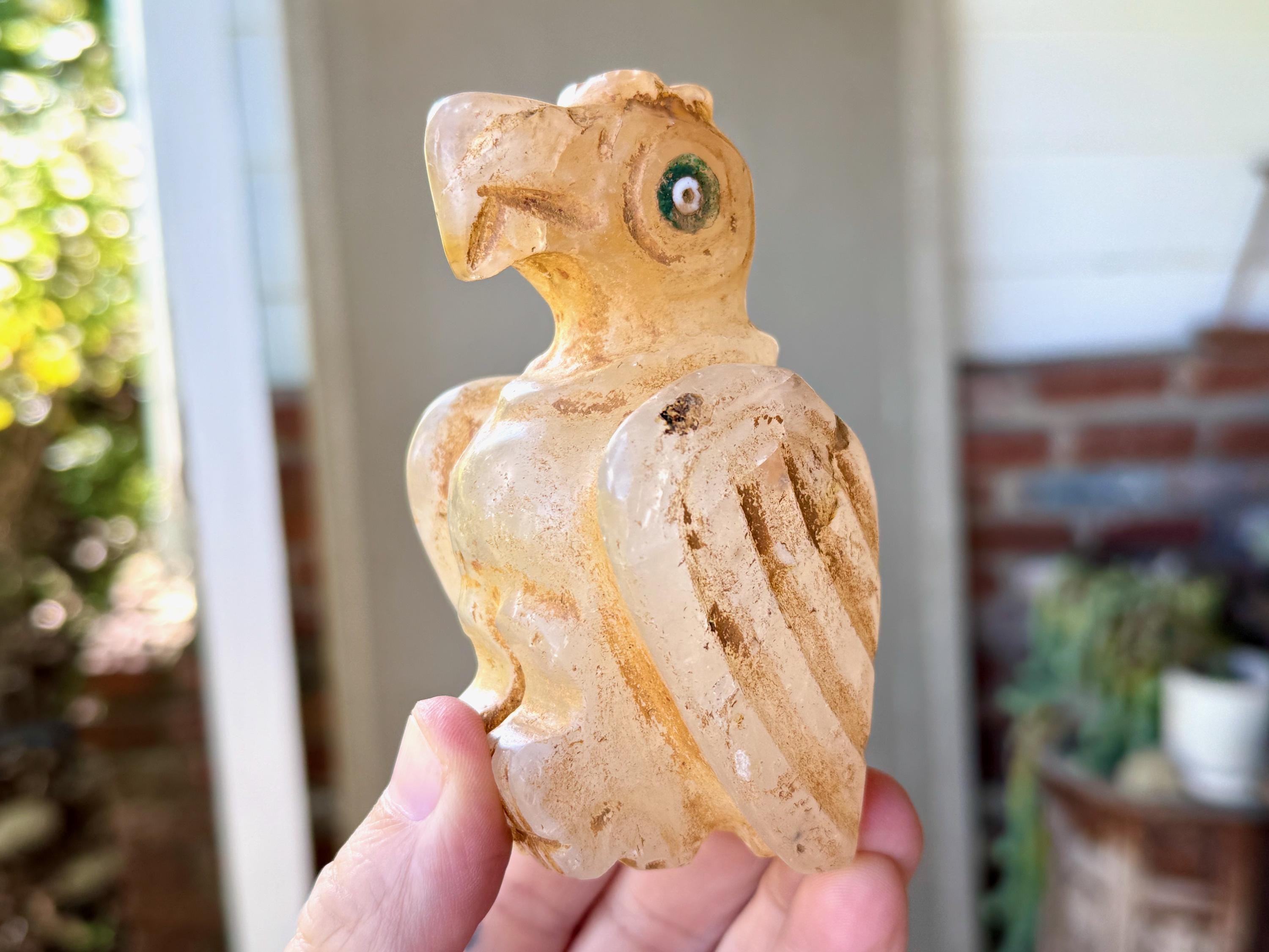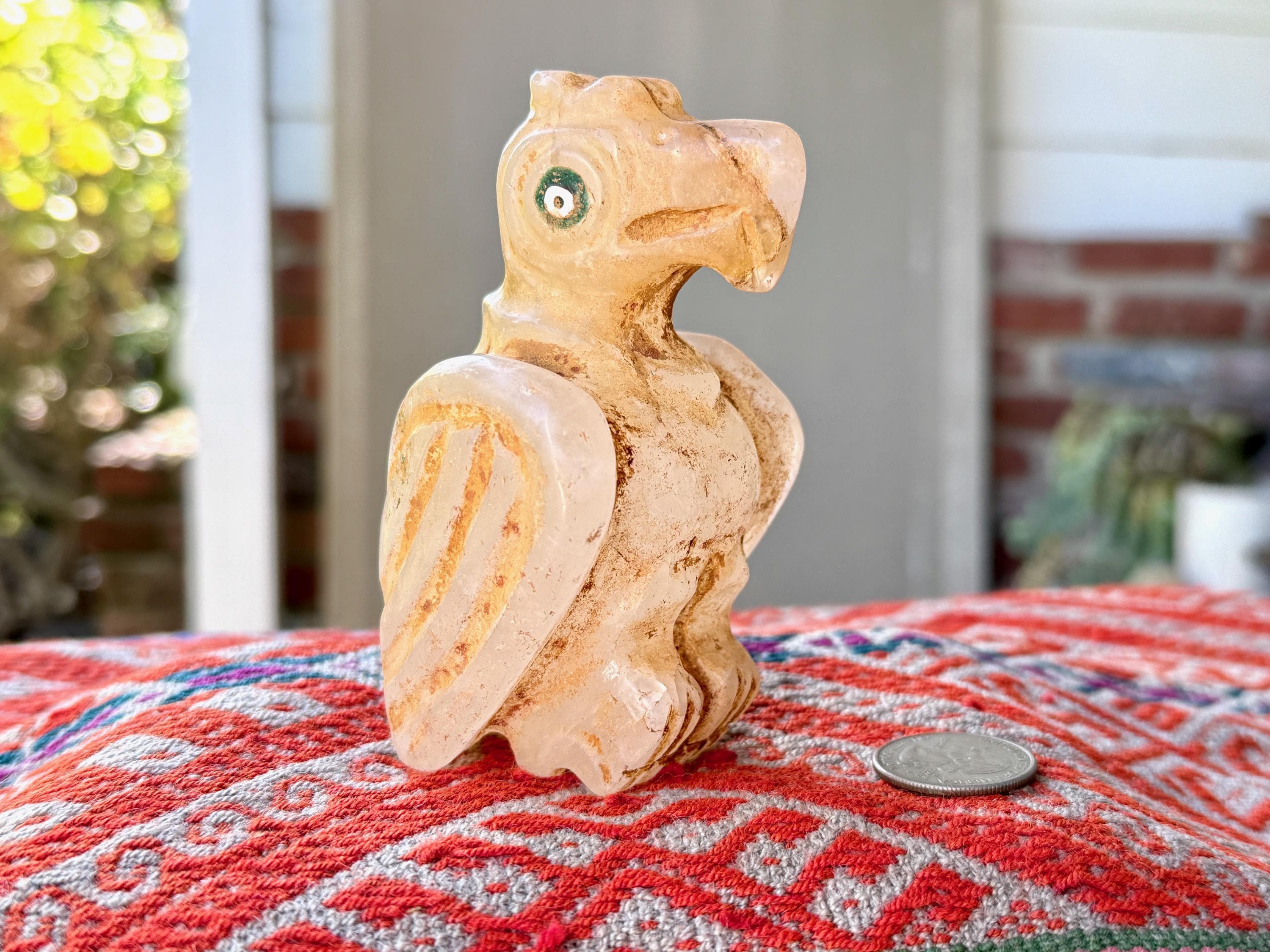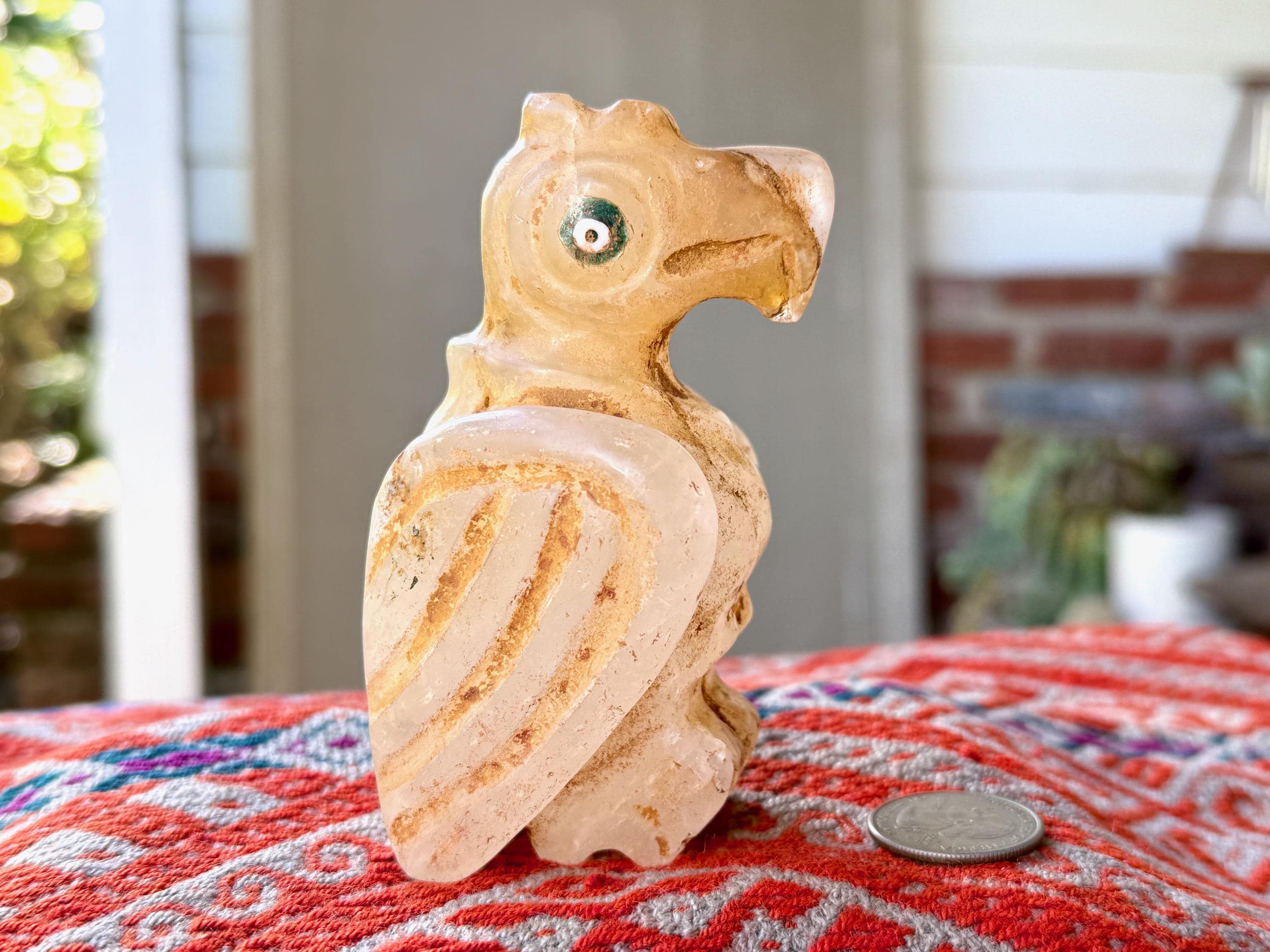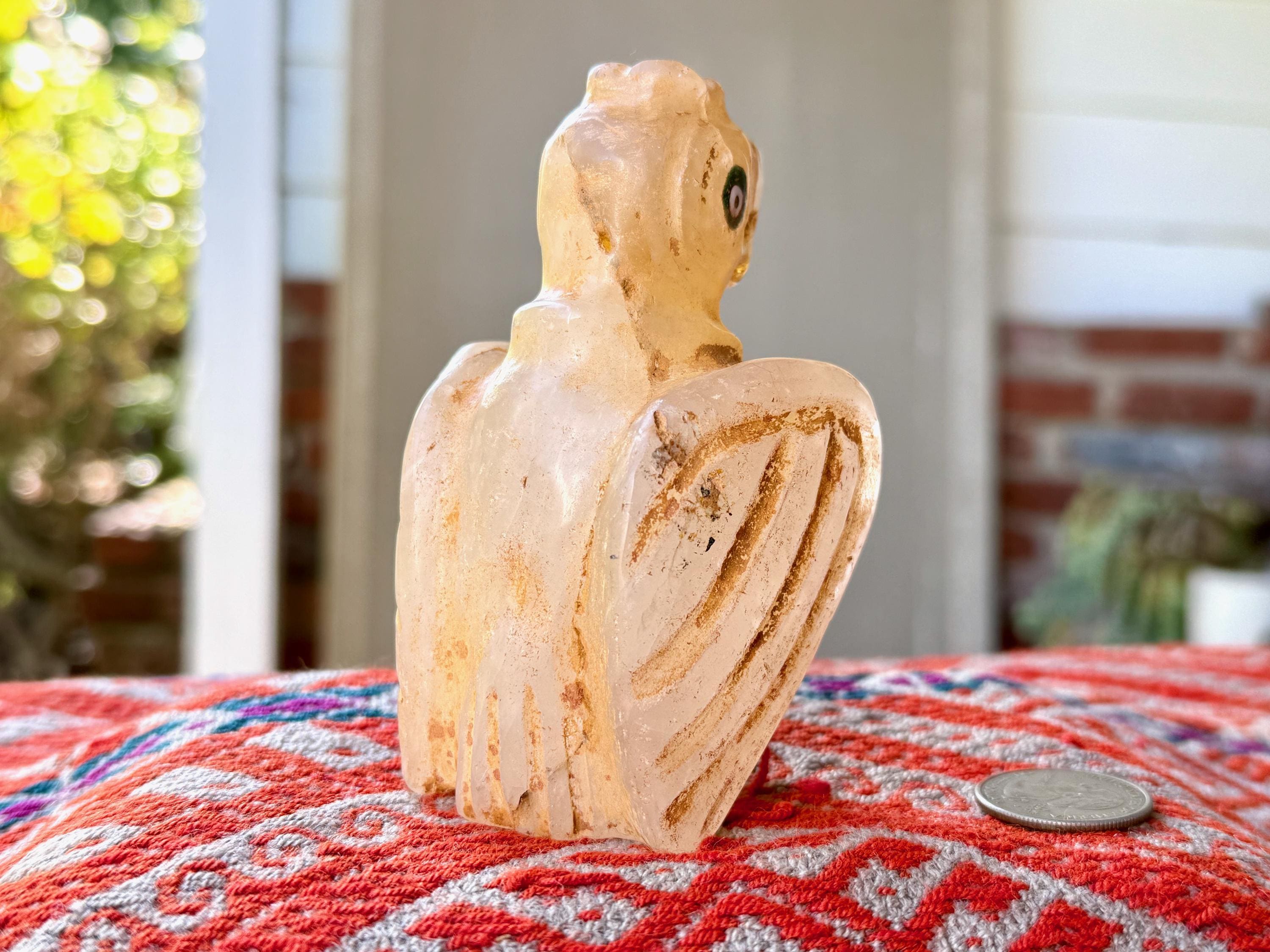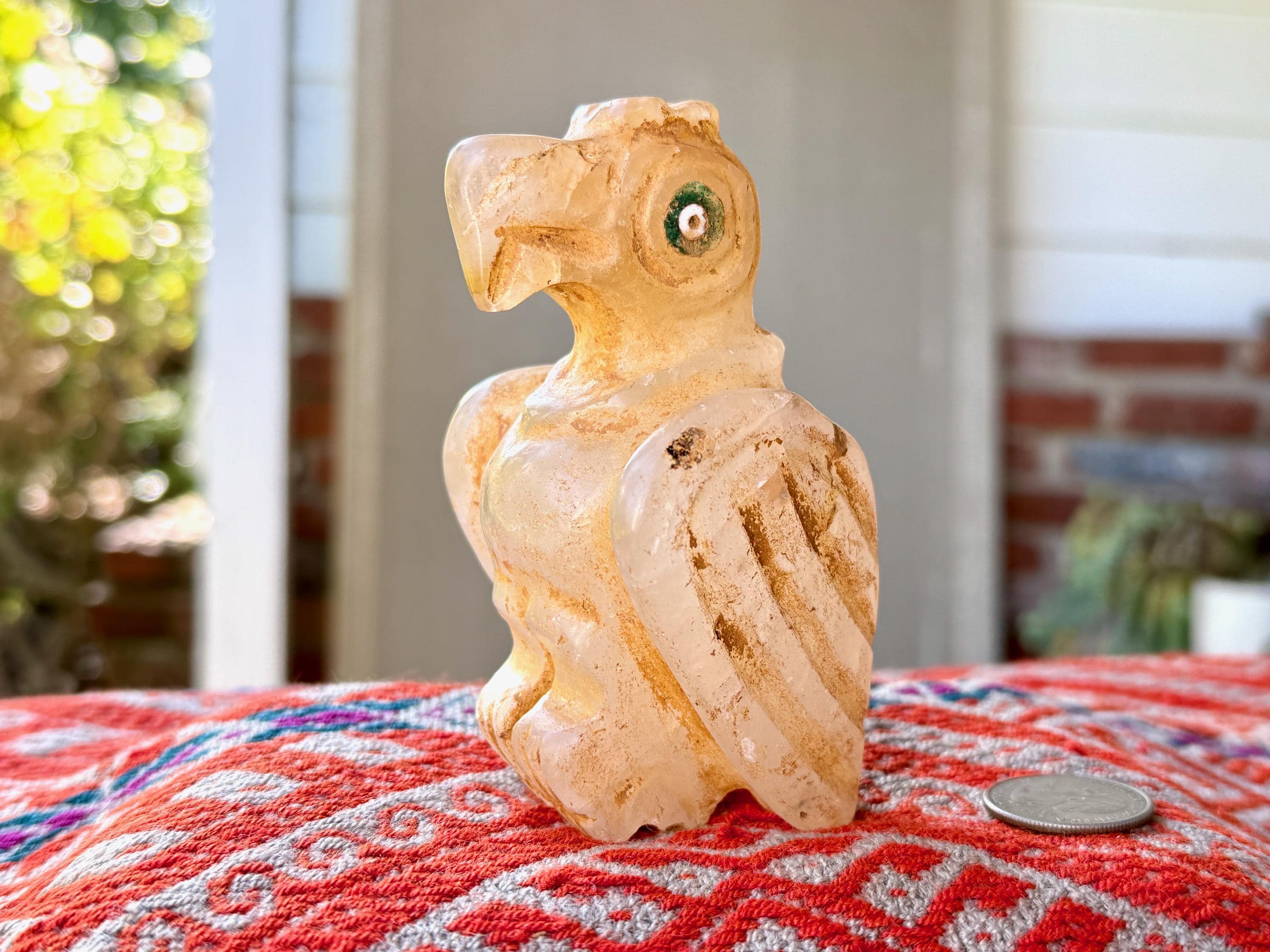 A fierce protector! This Condor statue is incredibly well-articulated, an inspired replica to the Condor totem statues found in Incan tombs surrounding Peru's Sacred Valley. It is carved from a single piece of native Quartz found in this same locale. The expression and detailing is just marvelous, and when we backlight the piece, we can see it passes light beautifully (Photos 5-6).