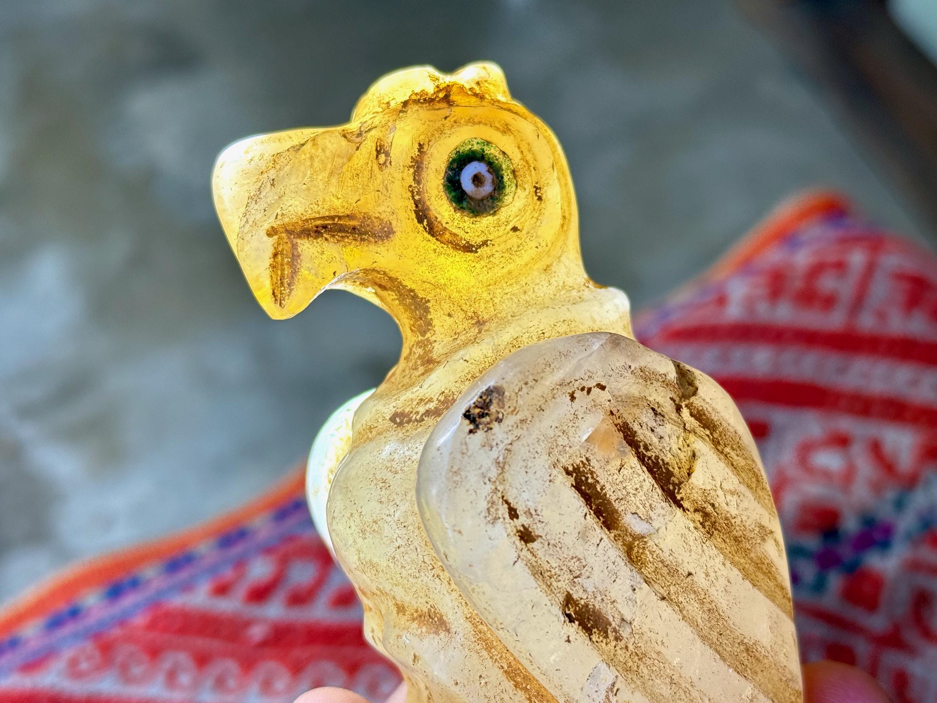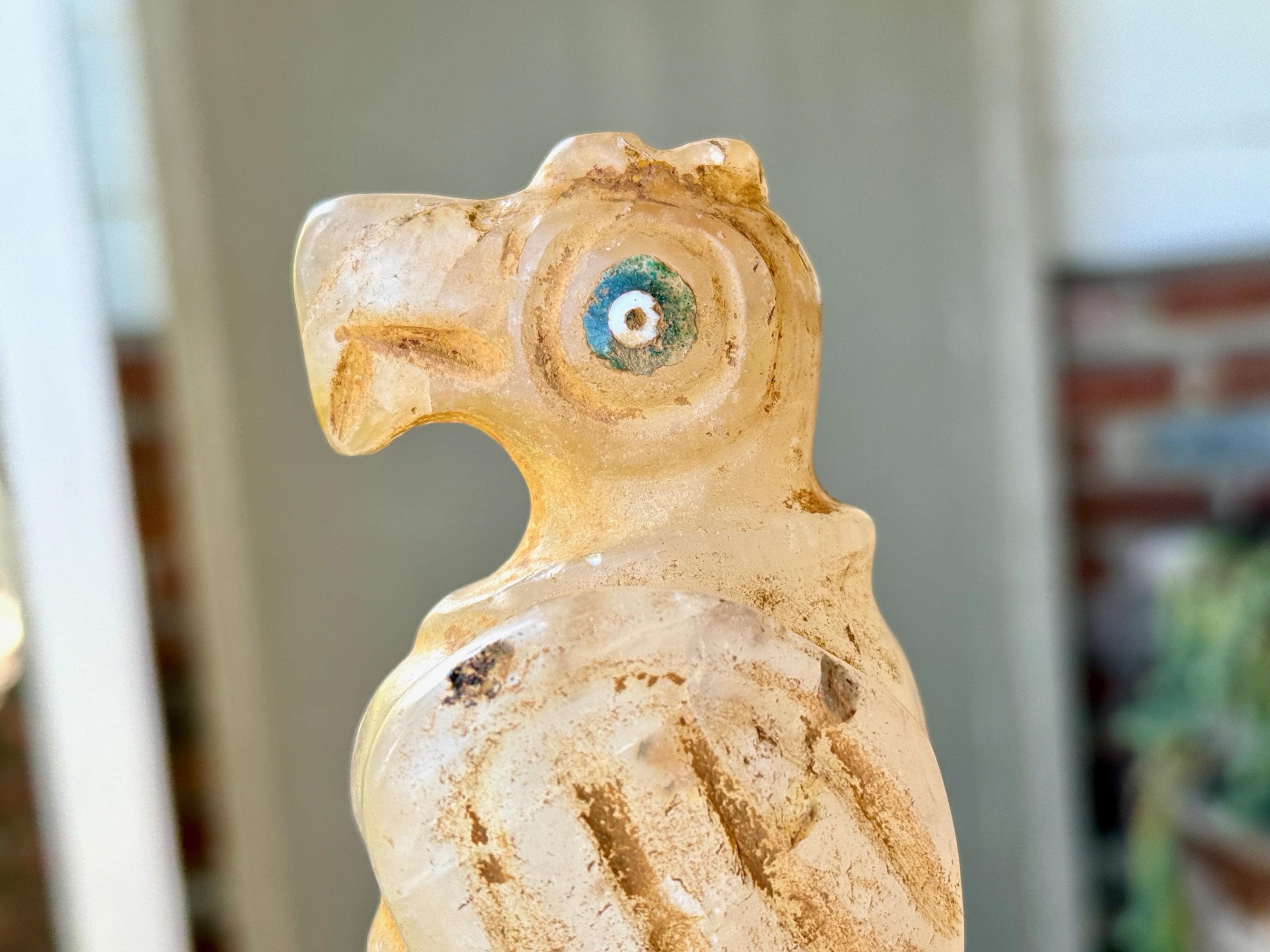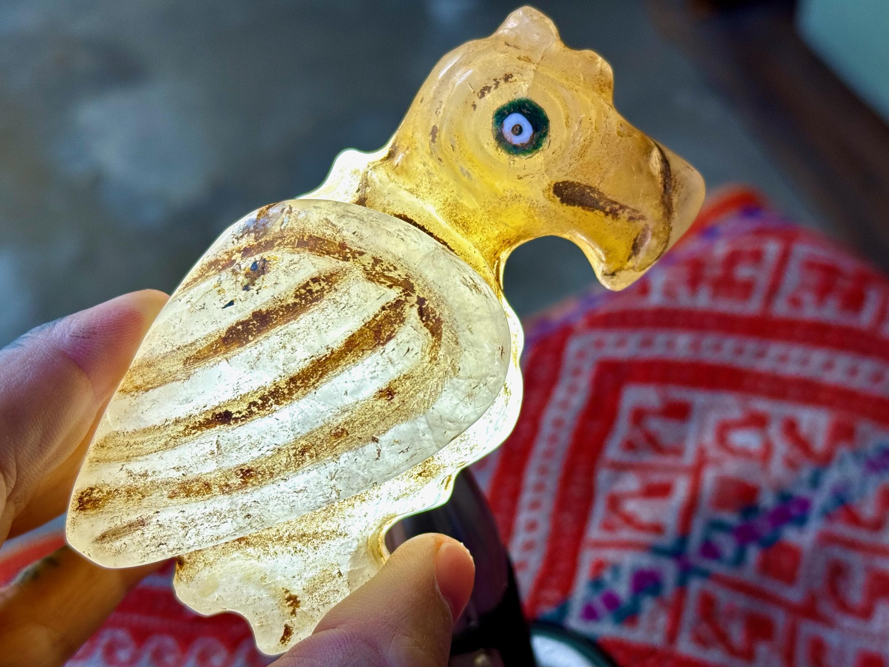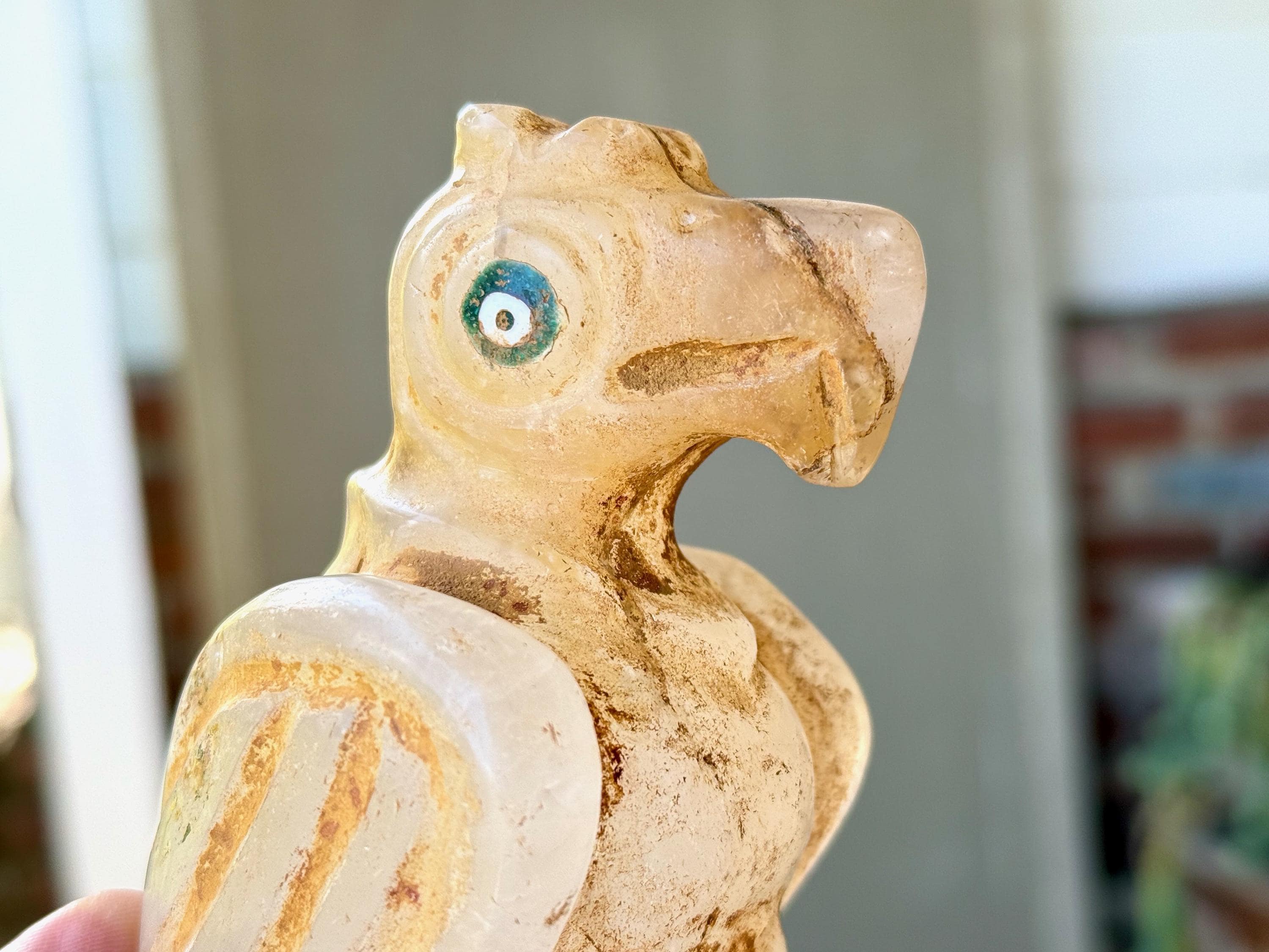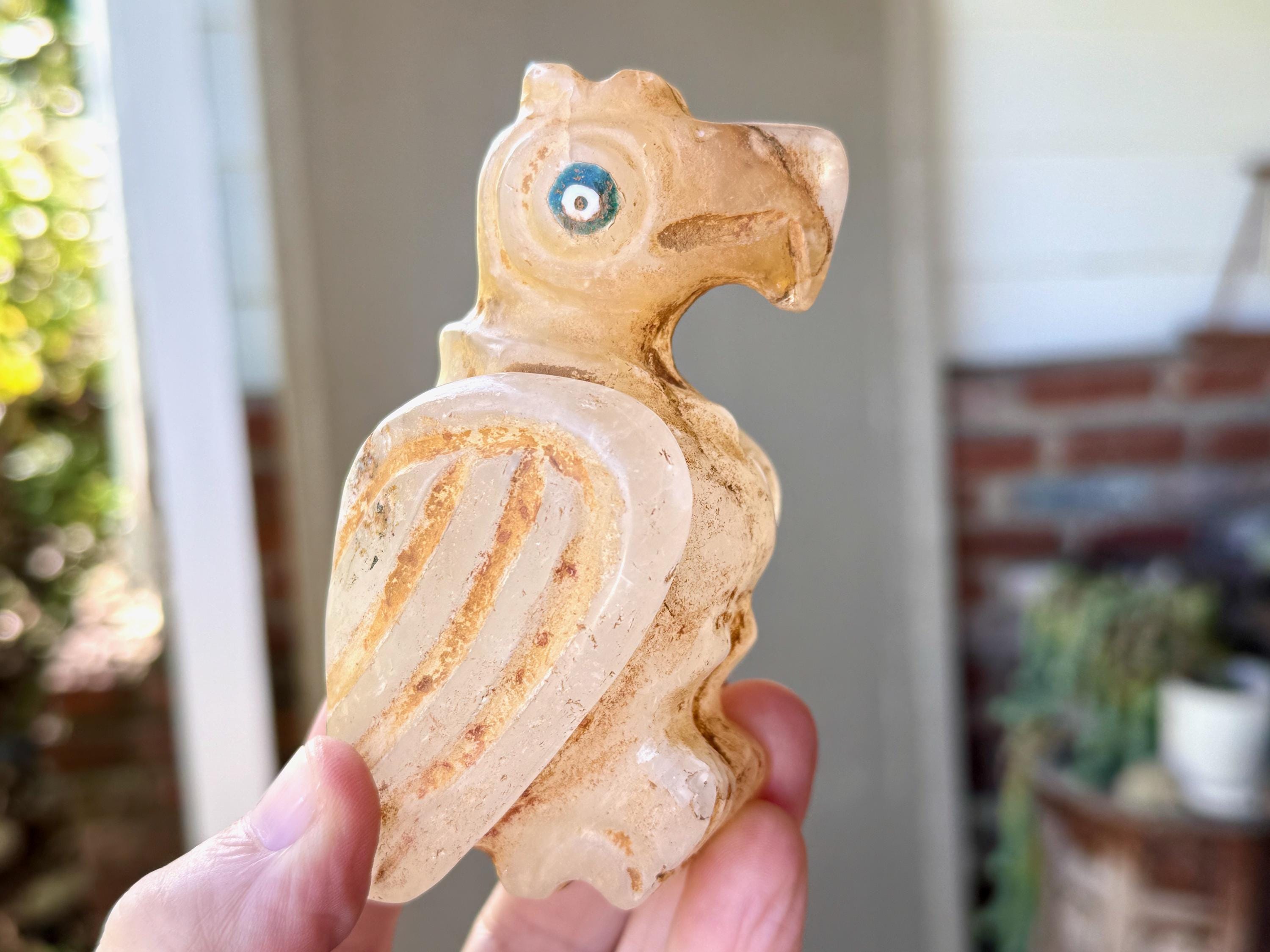 A fierce protector! This Condor statue is incredibly well-articulated, an inspired replica to the Condor totem statues found in Incan tombs surrounding Peru's Sacred Valley. It is carved from a single piece of native Quartz found in this same locale. The expression and detailing is just marvelous, and when we backlight the piece, we can see it passes light beautifully (Photos 5-6).