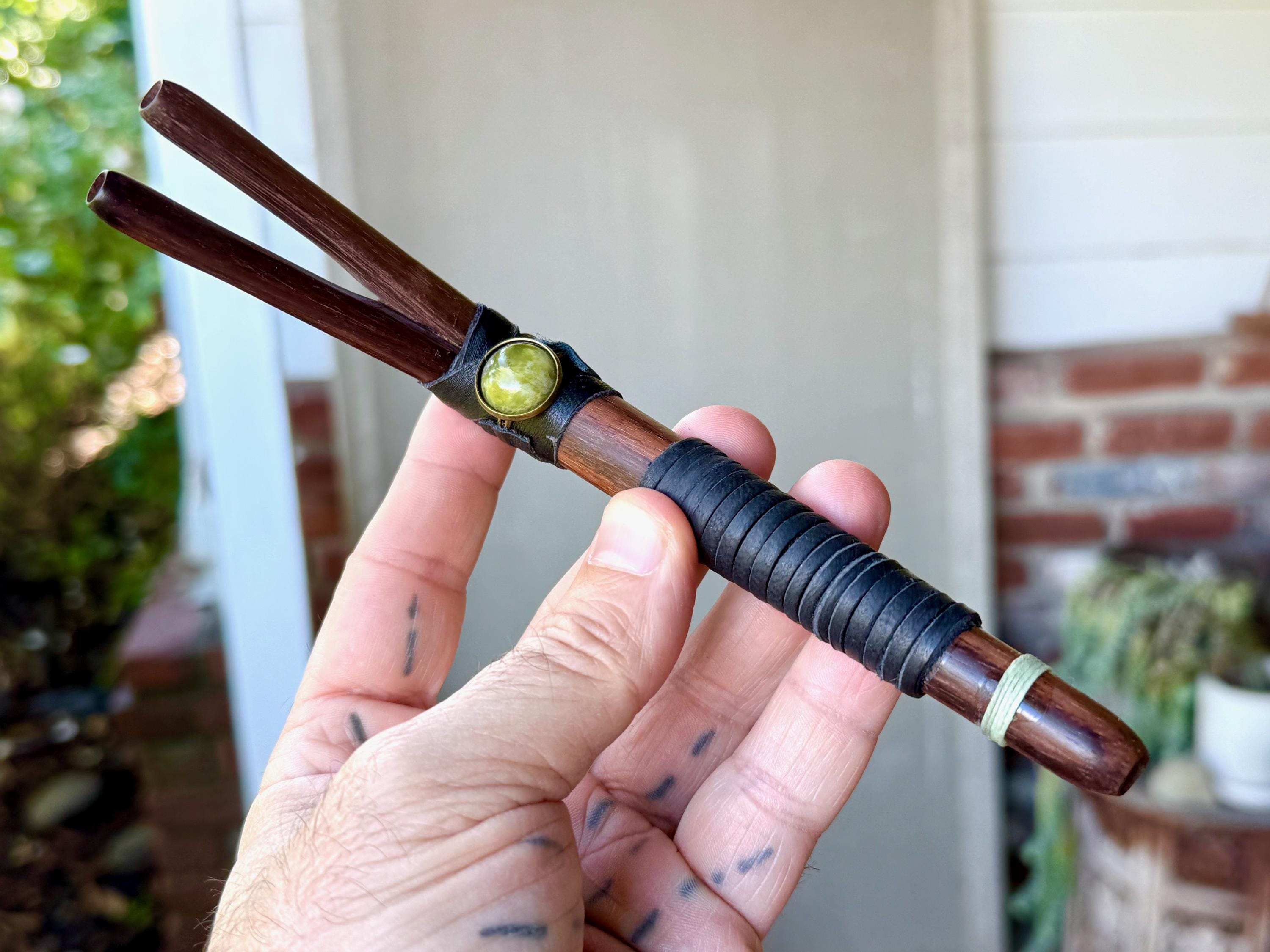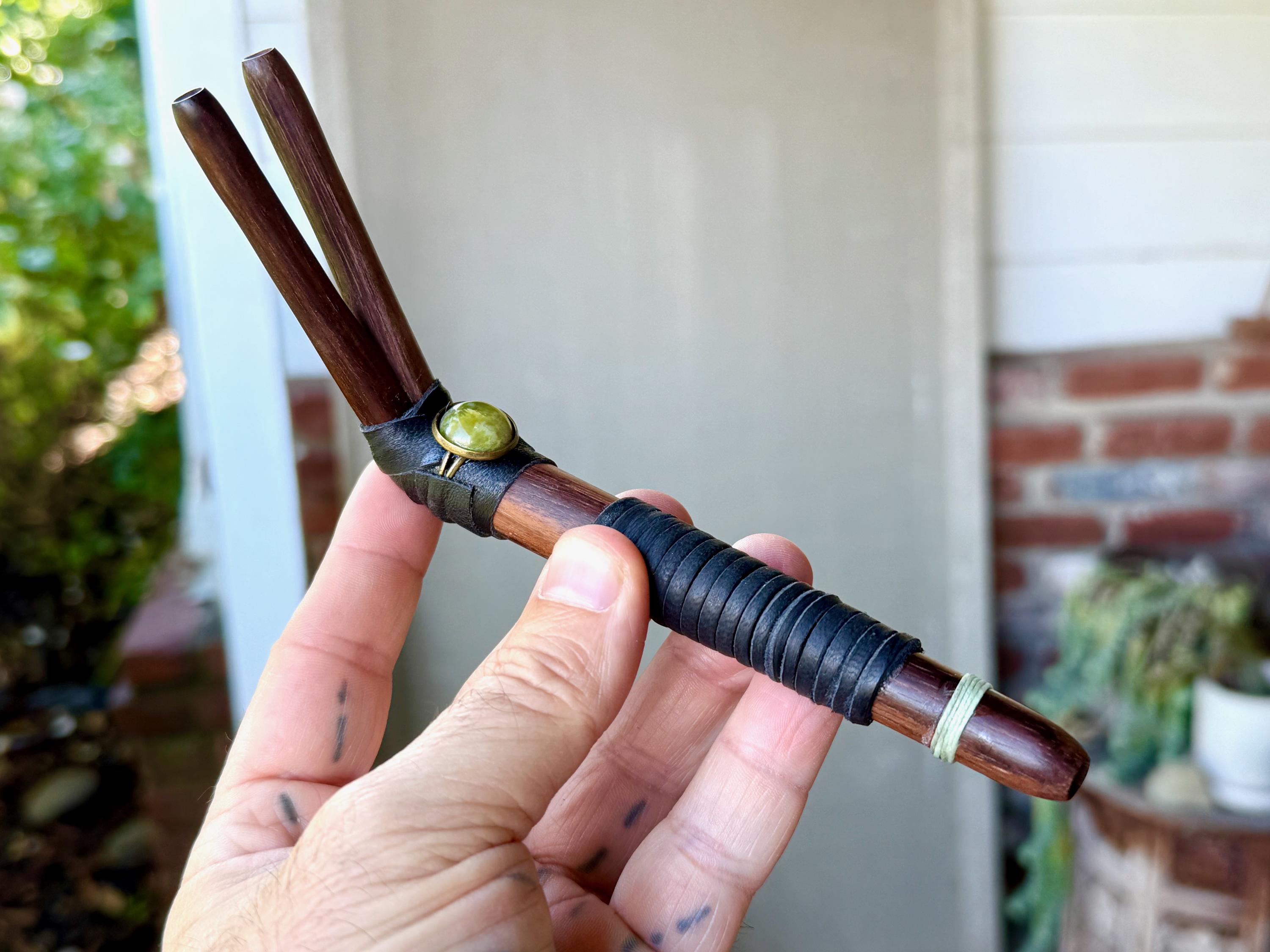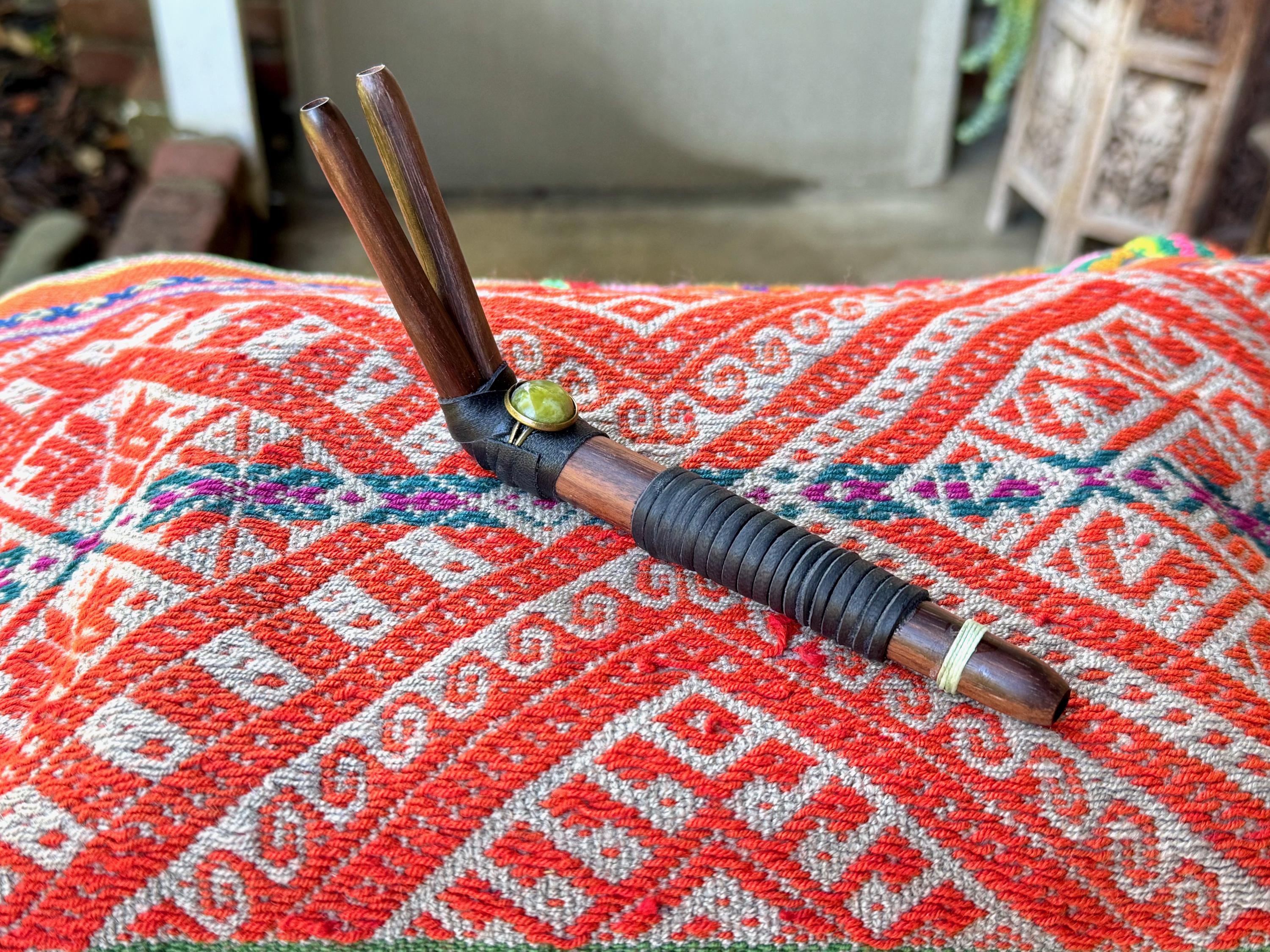 This handcrafted Double Tepi Pipe features natural dark wood, leather, and threaded wrapping, as well as a Serpentine stone cabochon.