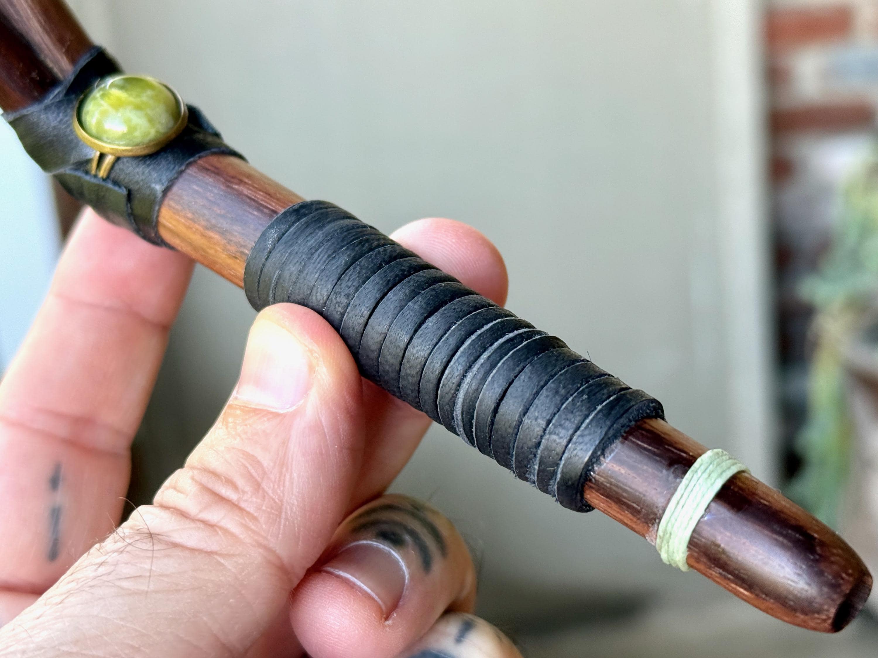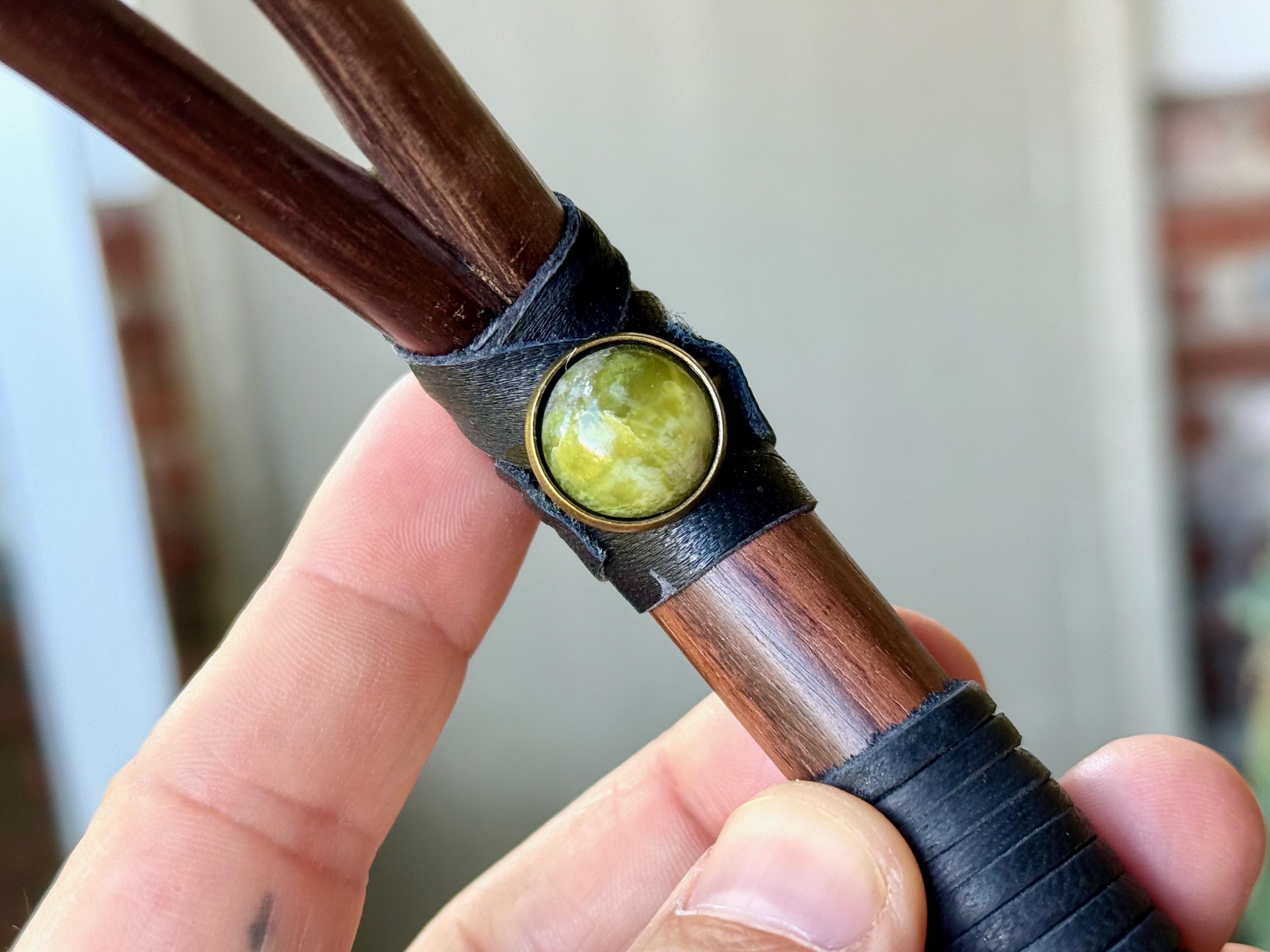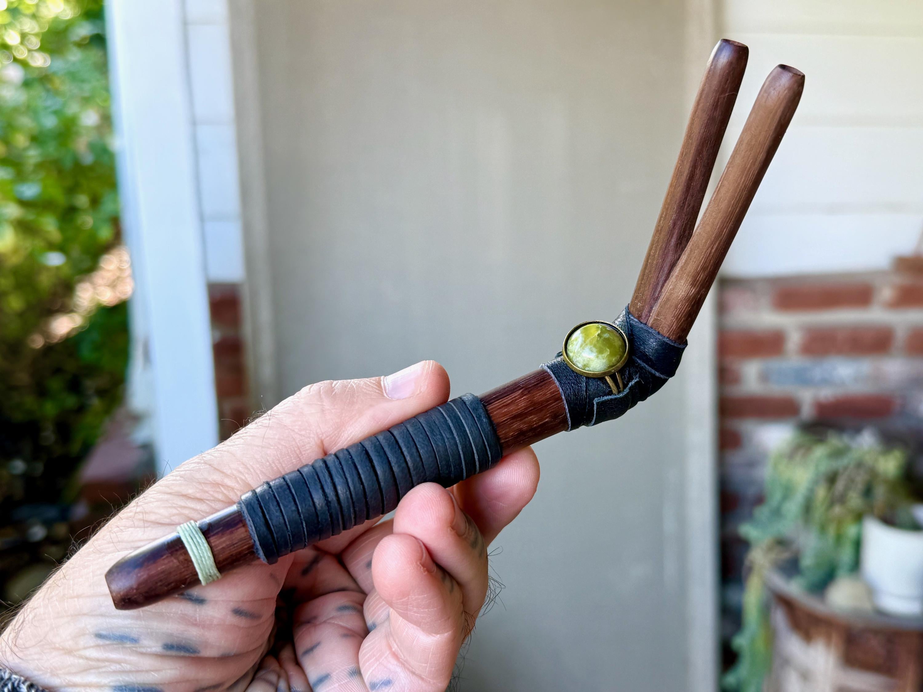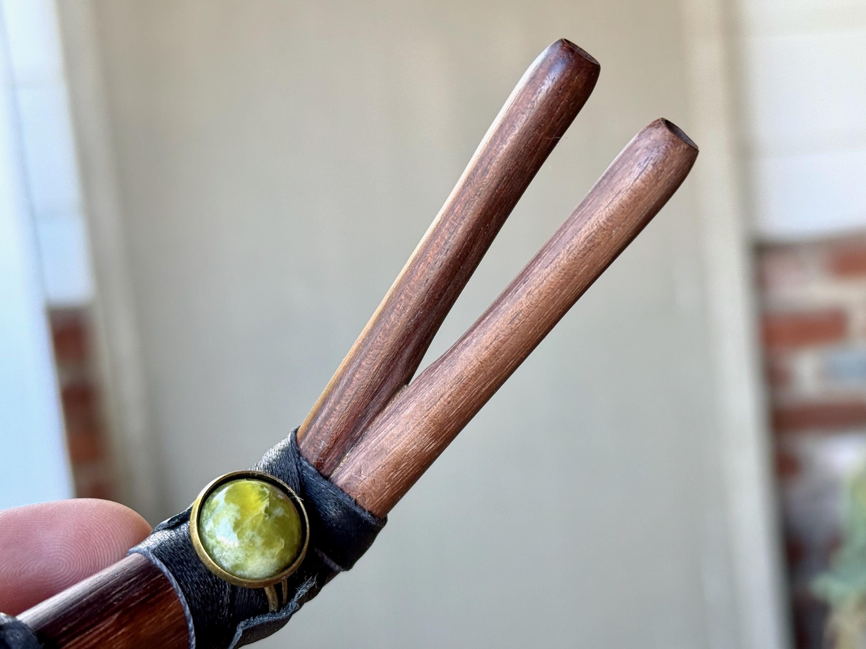 This handcrafted Double Tepi Pipe features natural dark wood, leather, and threaded wrapping, as well as a Serpentine stone cabochon.