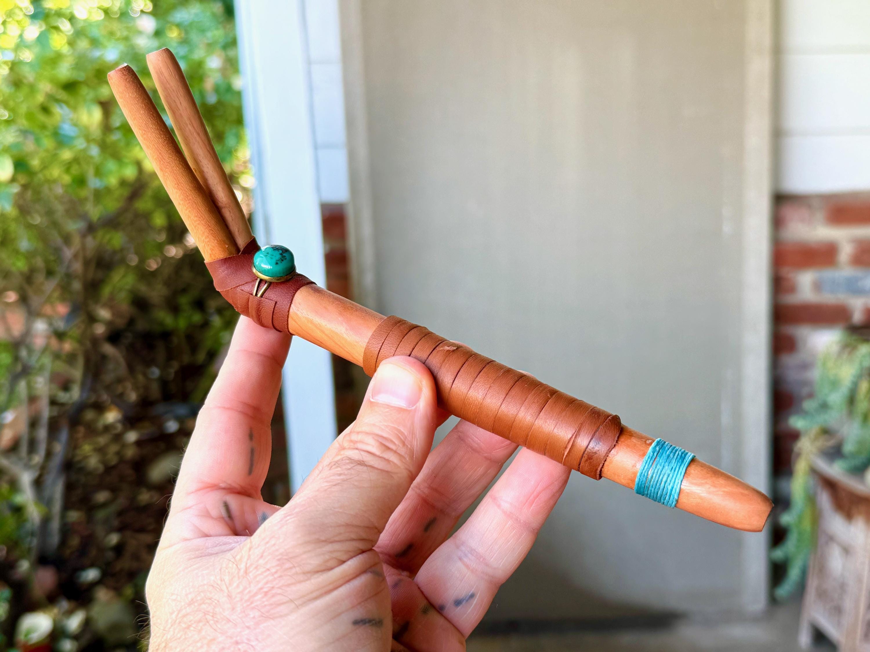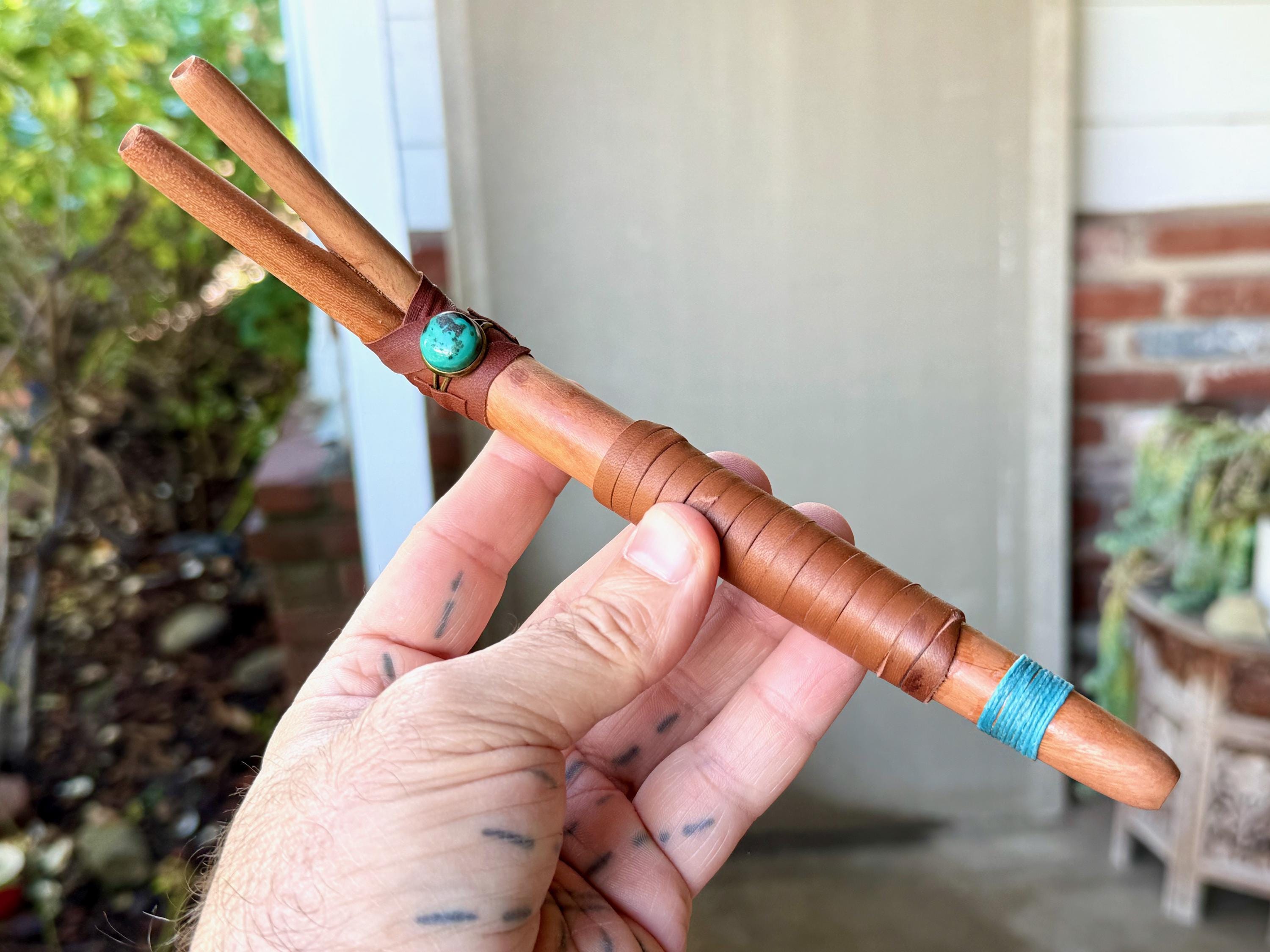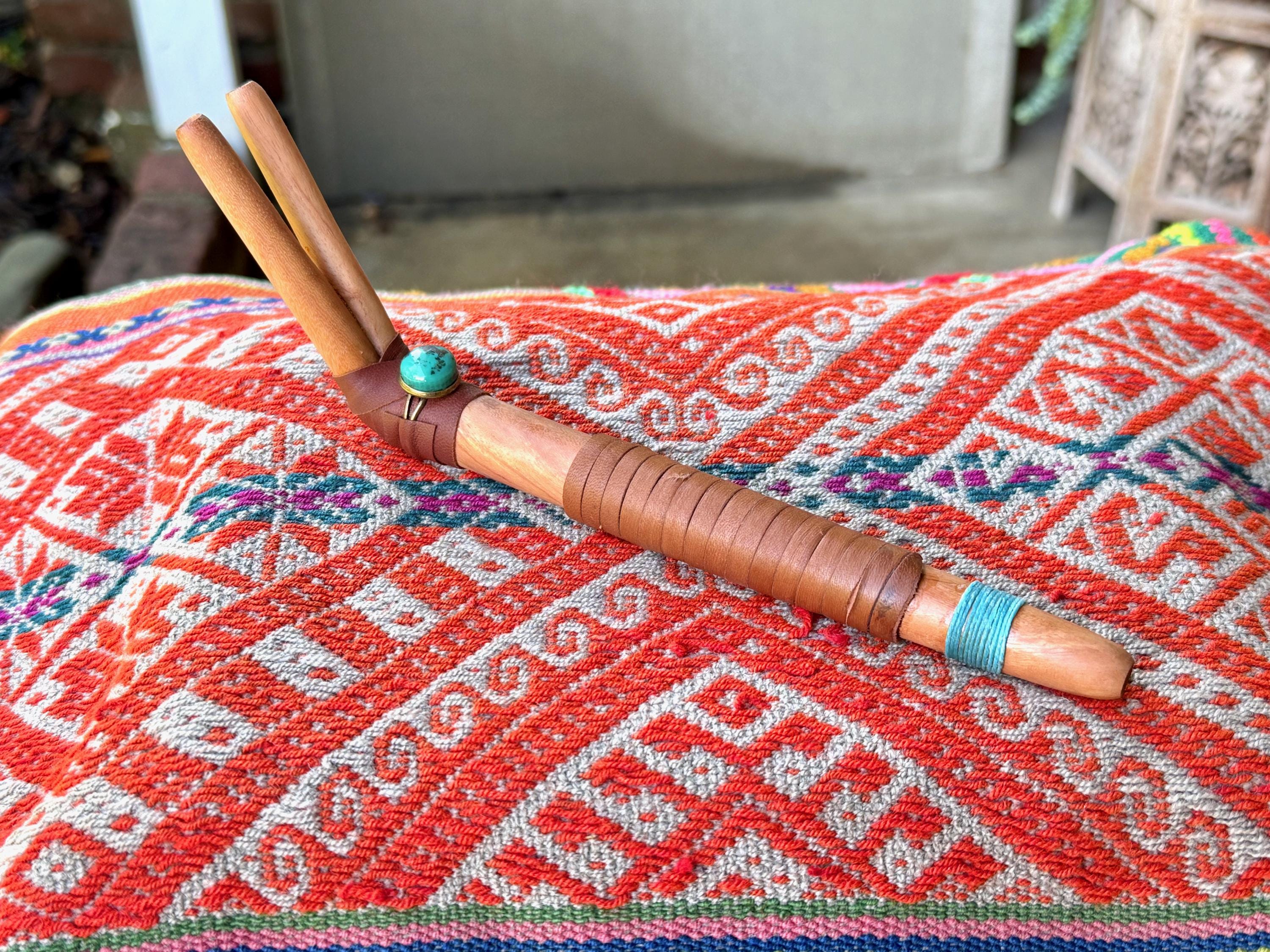 This handsome Double Tepi pipe was handcrafted from natural, tropical hardwood (Cemara). It is adorned with leather wrapping and a Cloud Mountain Turquoise cabochon.