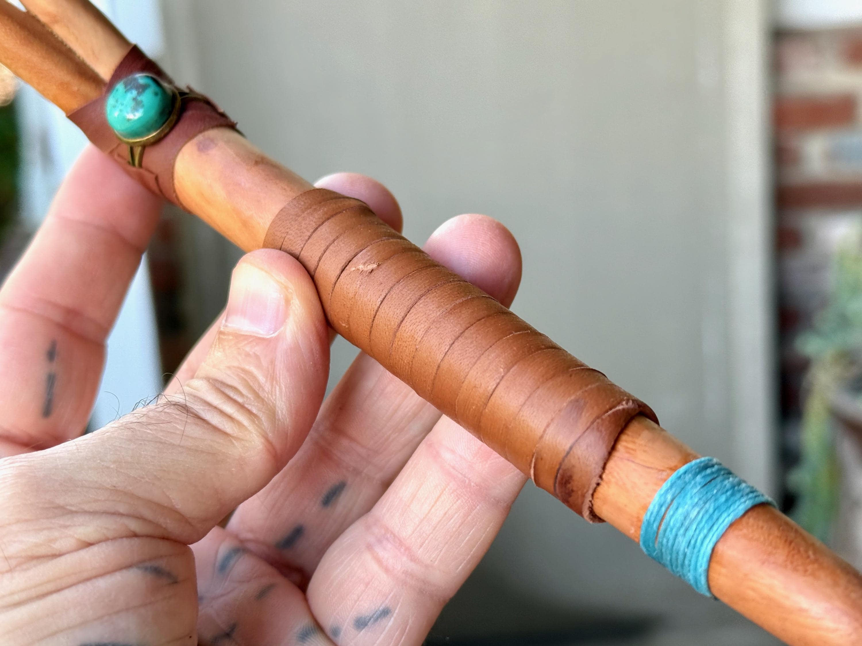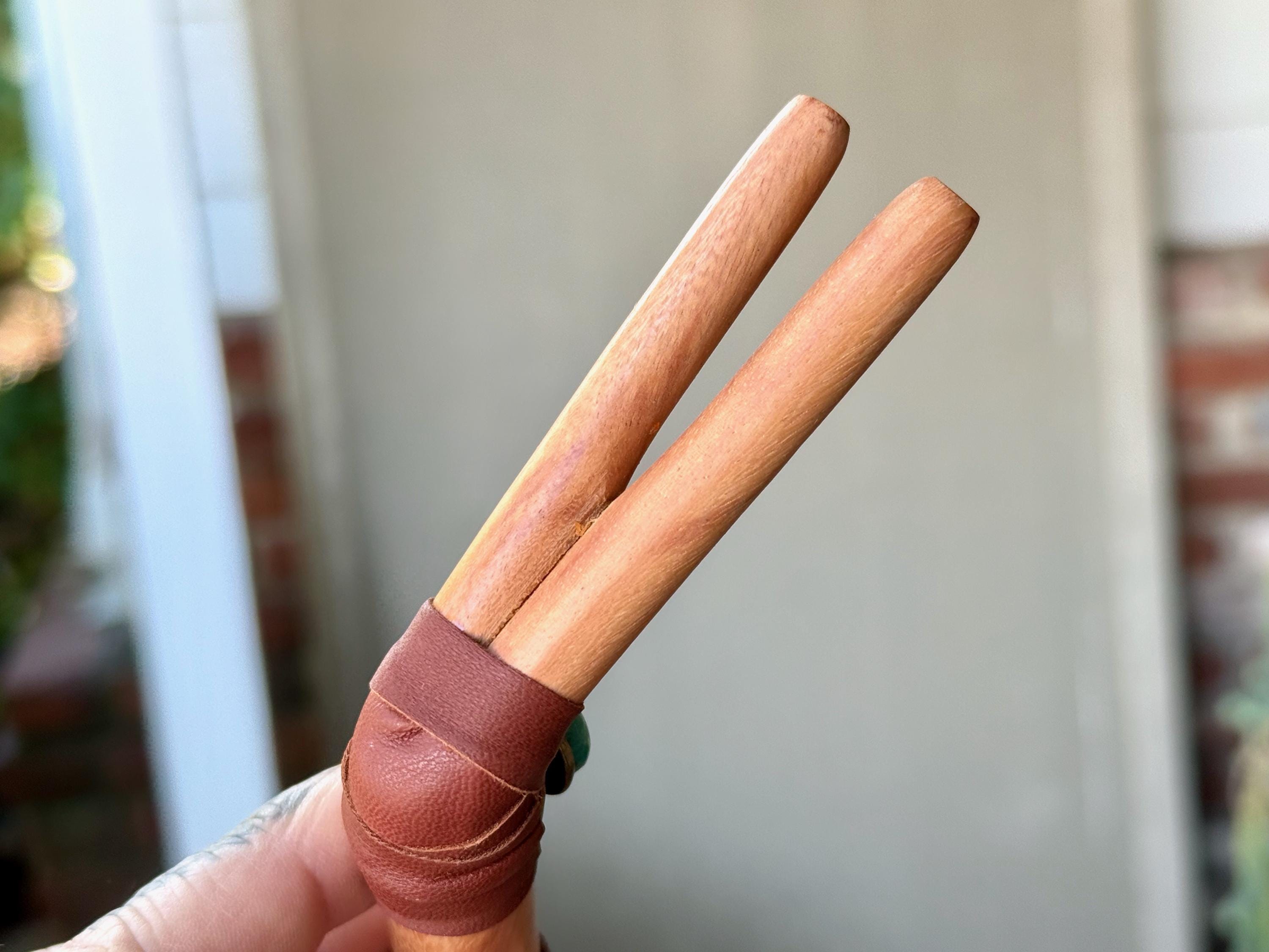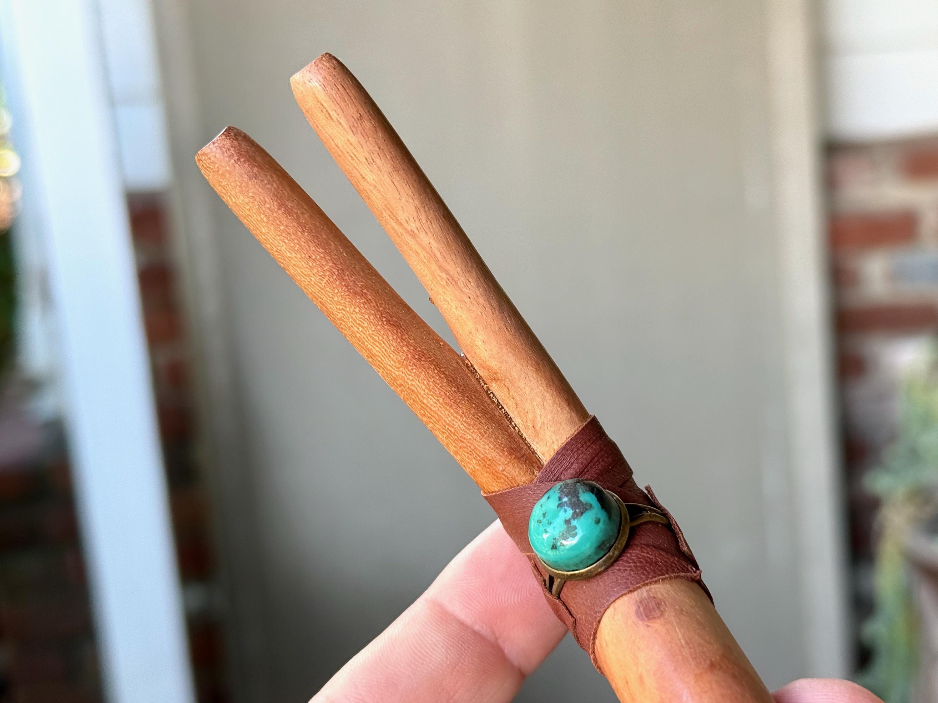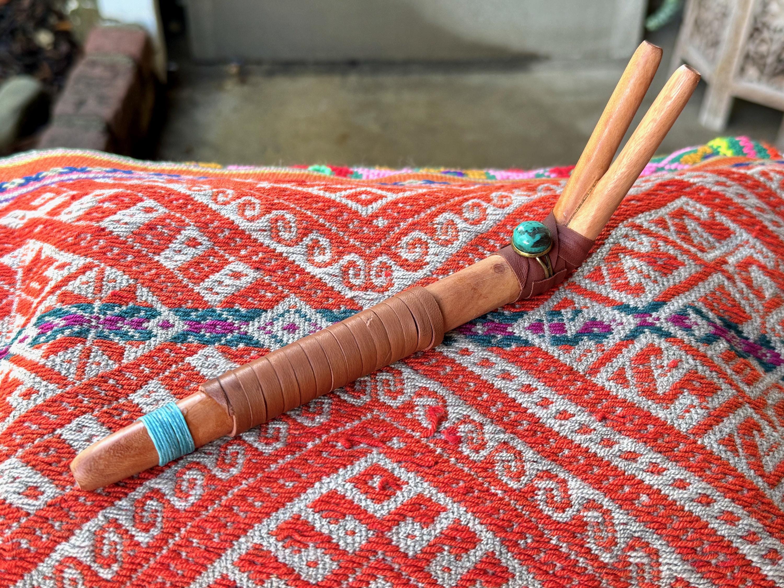 This handsome Double Tepi pipe was handcrafted from natural, tropical hardwood (Cemara). It is adorned with leather wrapping and a Cloud Mountain Turquoise cabochon.
