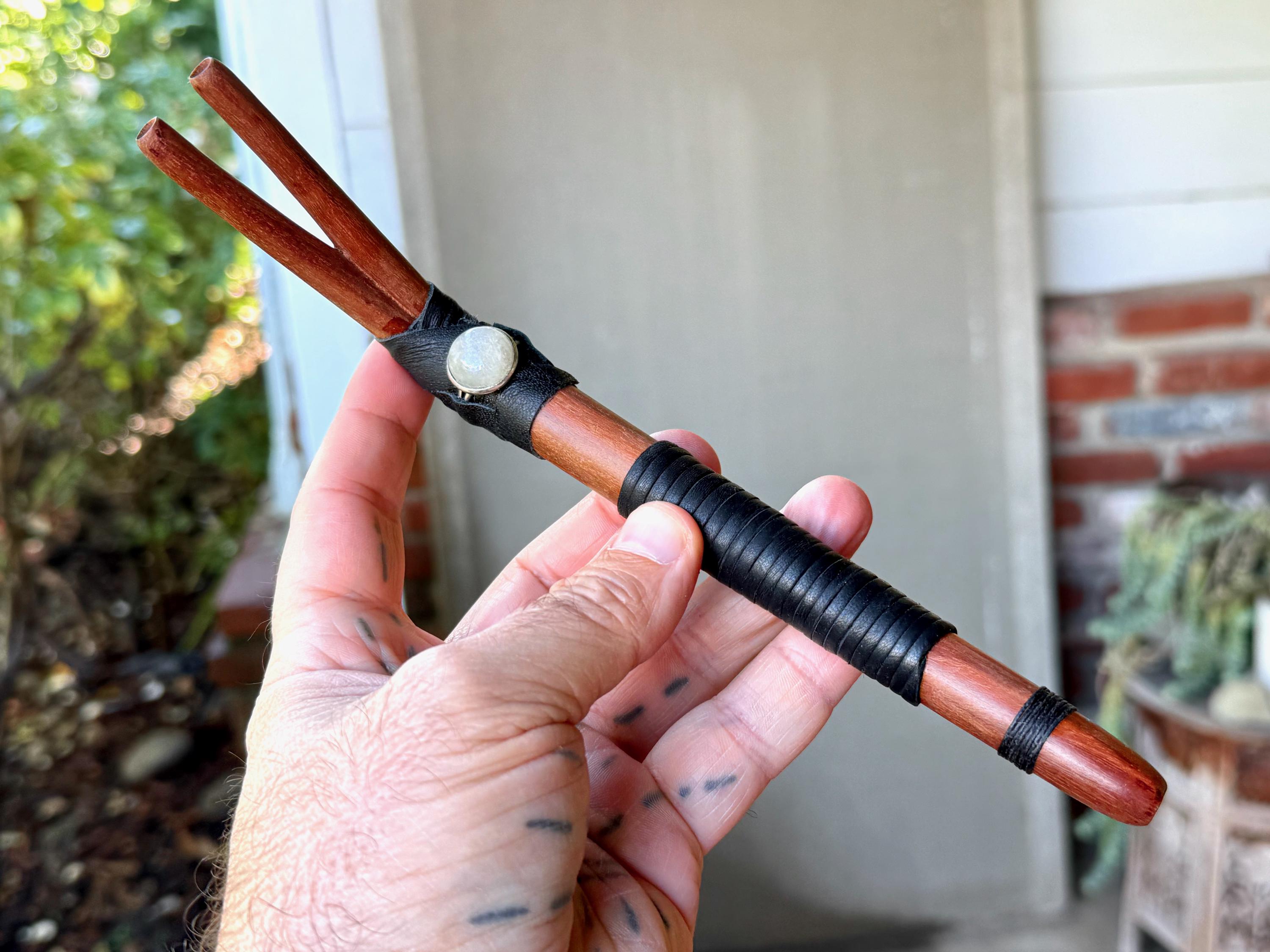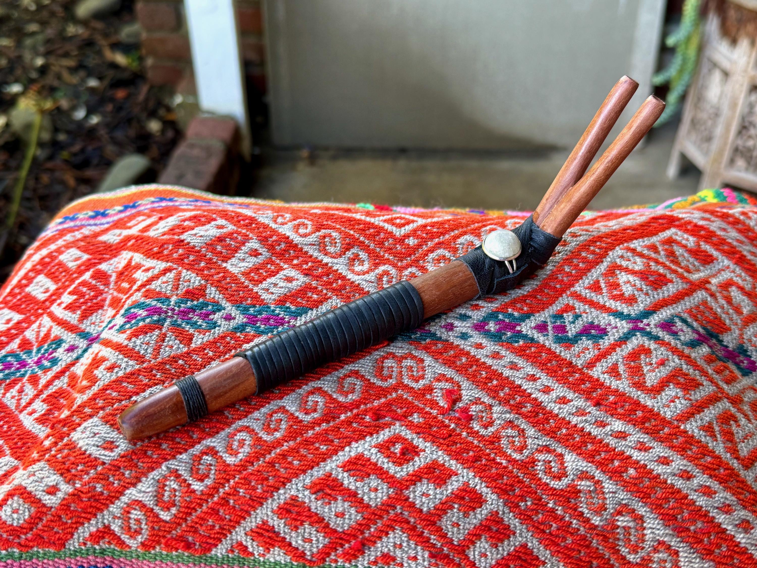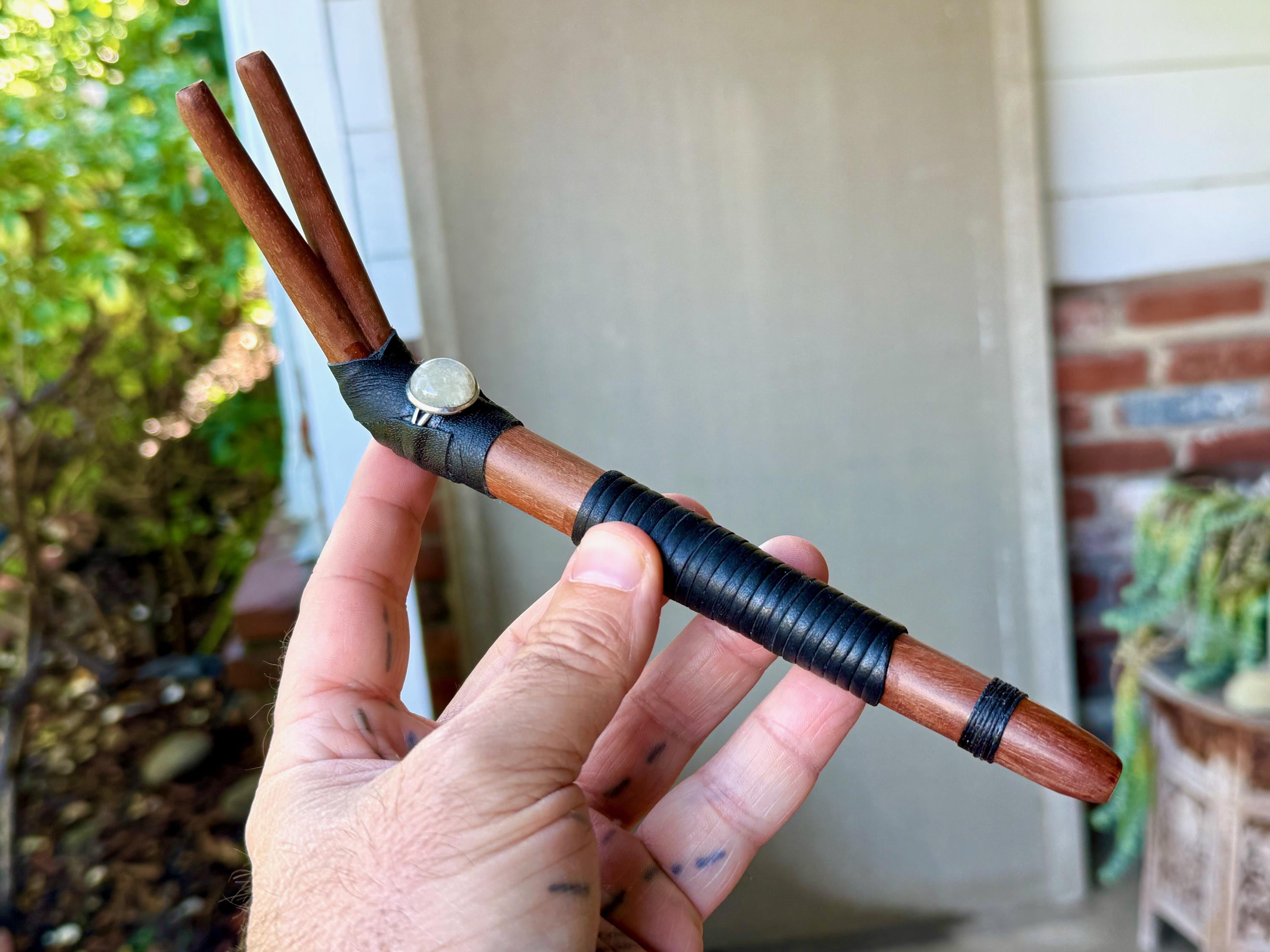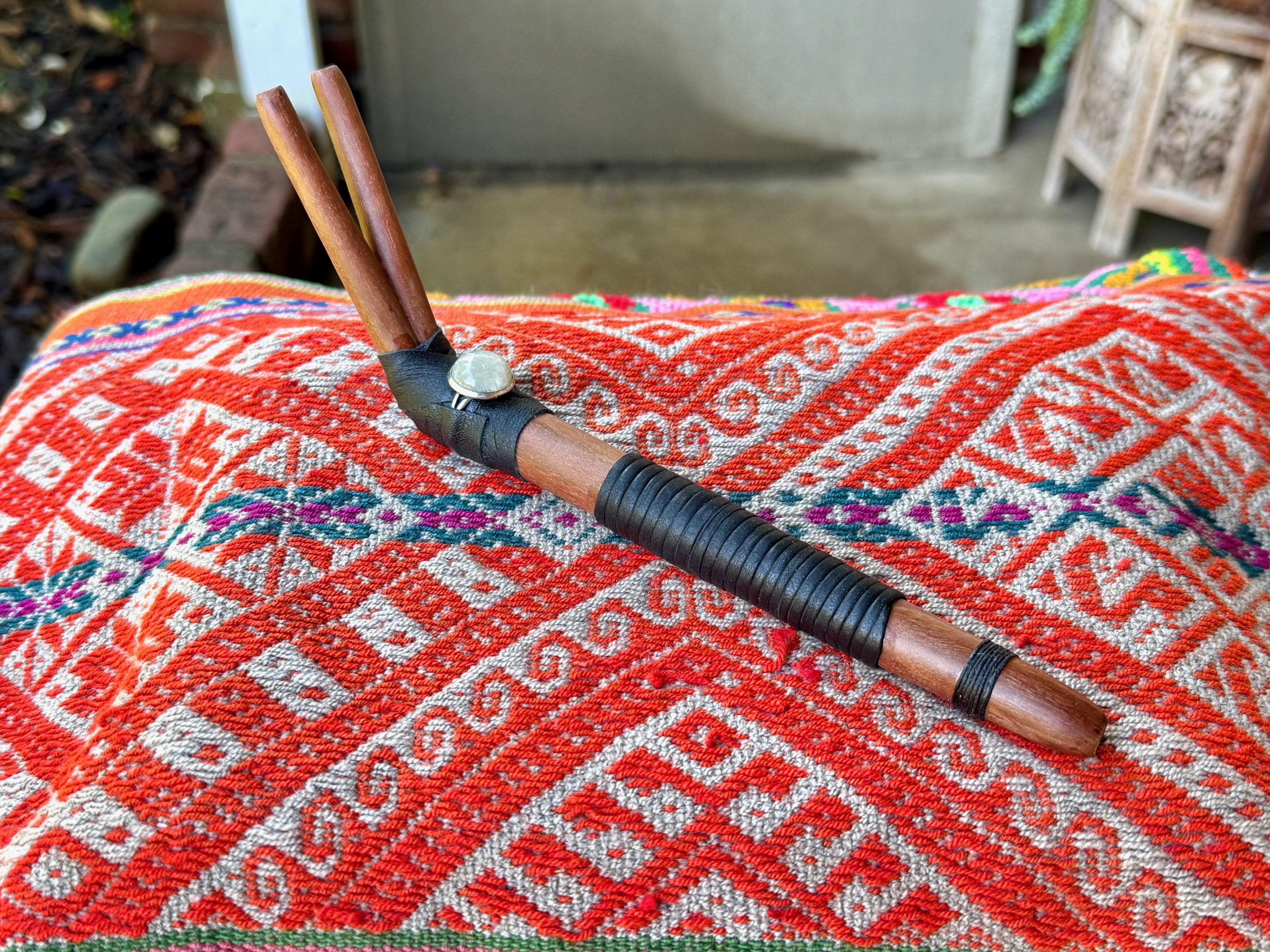This beautiful Double Tepi Pipe was handcrafted from high-quality Teak Wood and adorned with leather wrapping and a Moonstone cabochon.