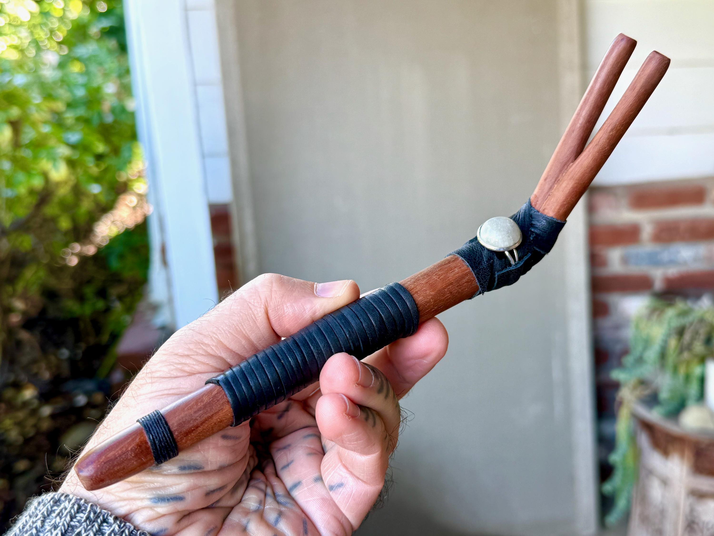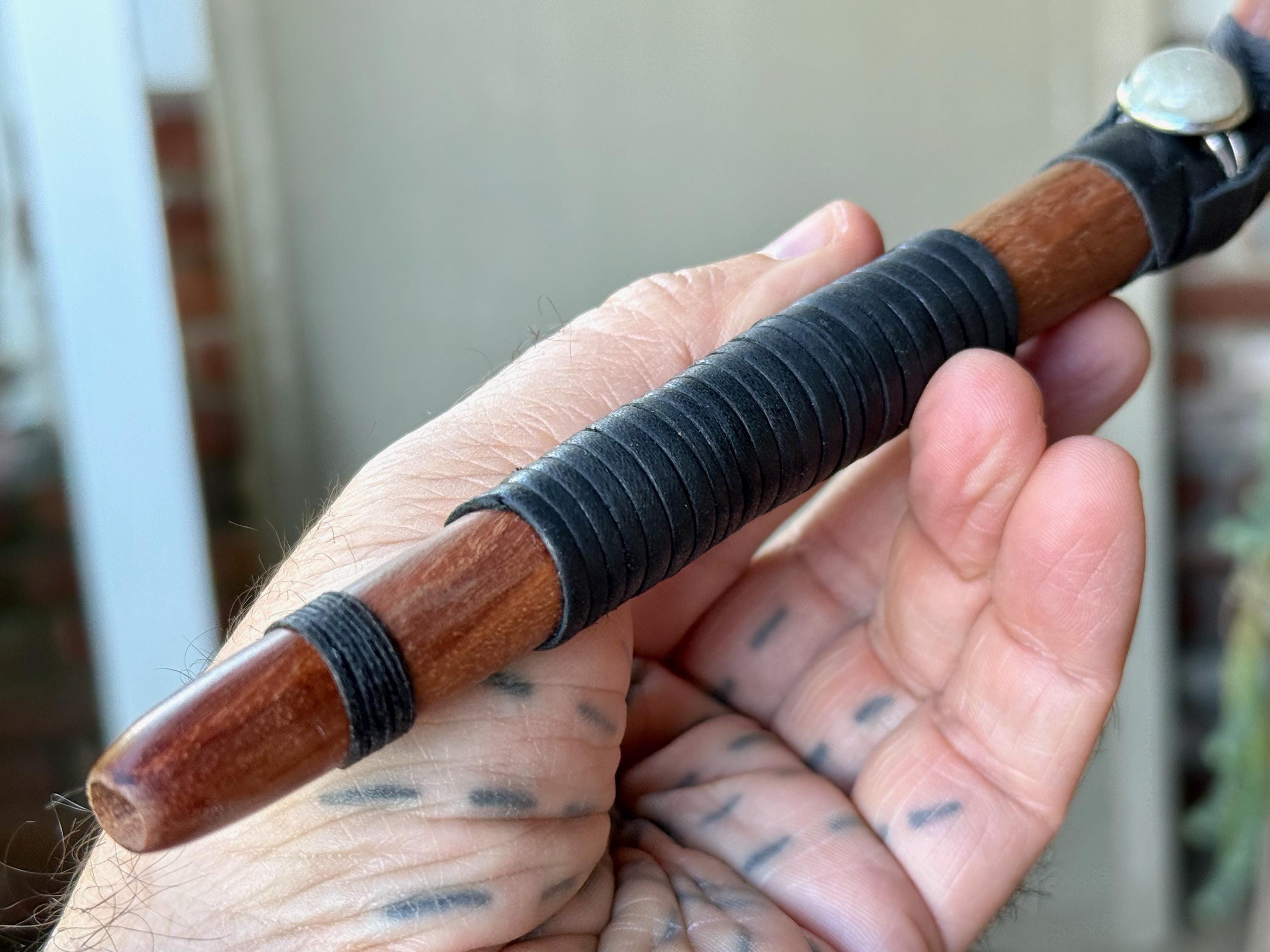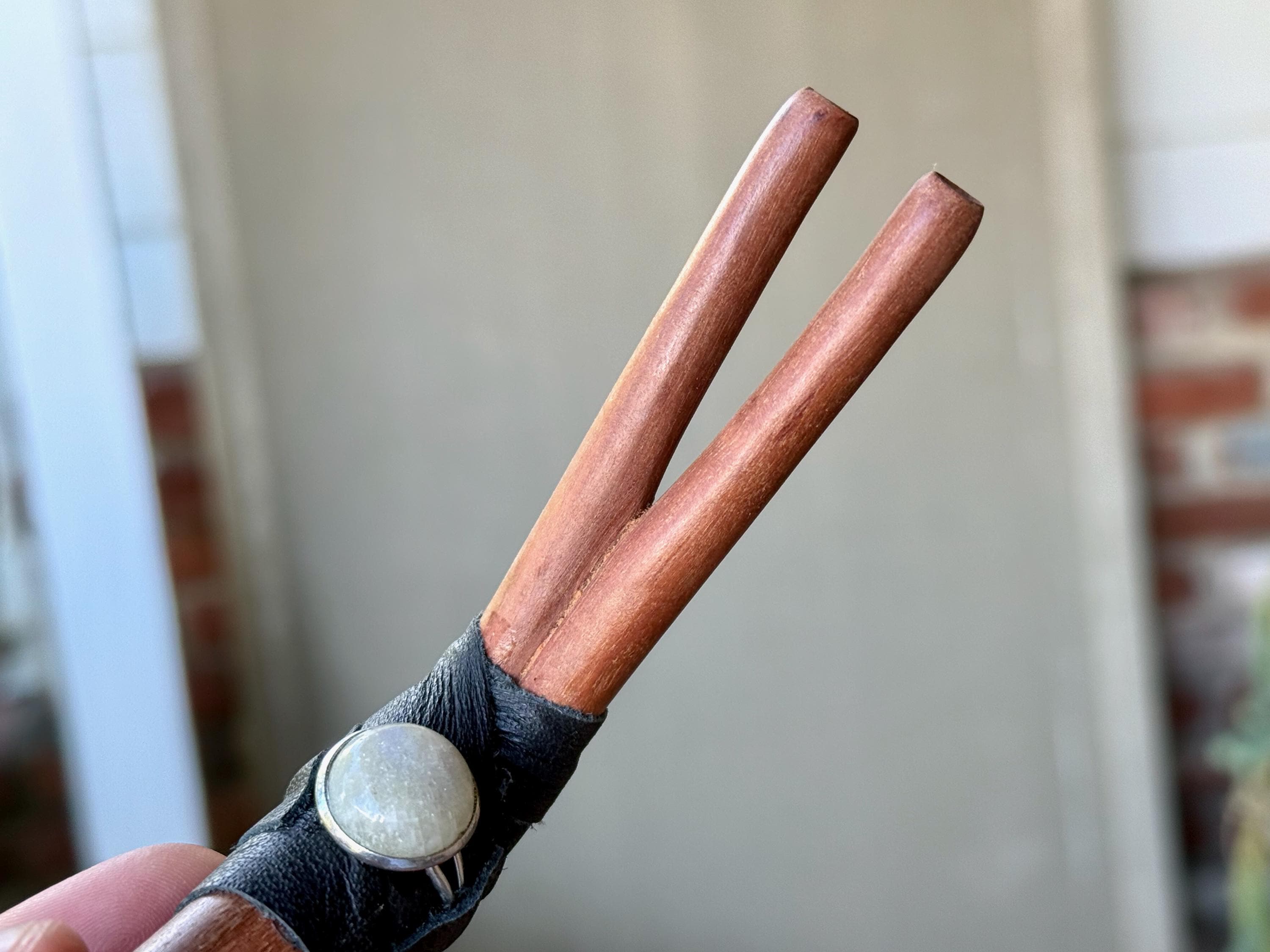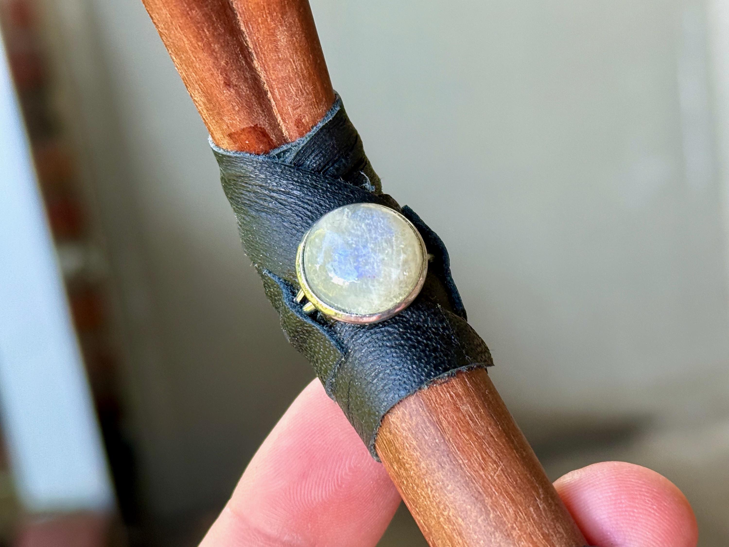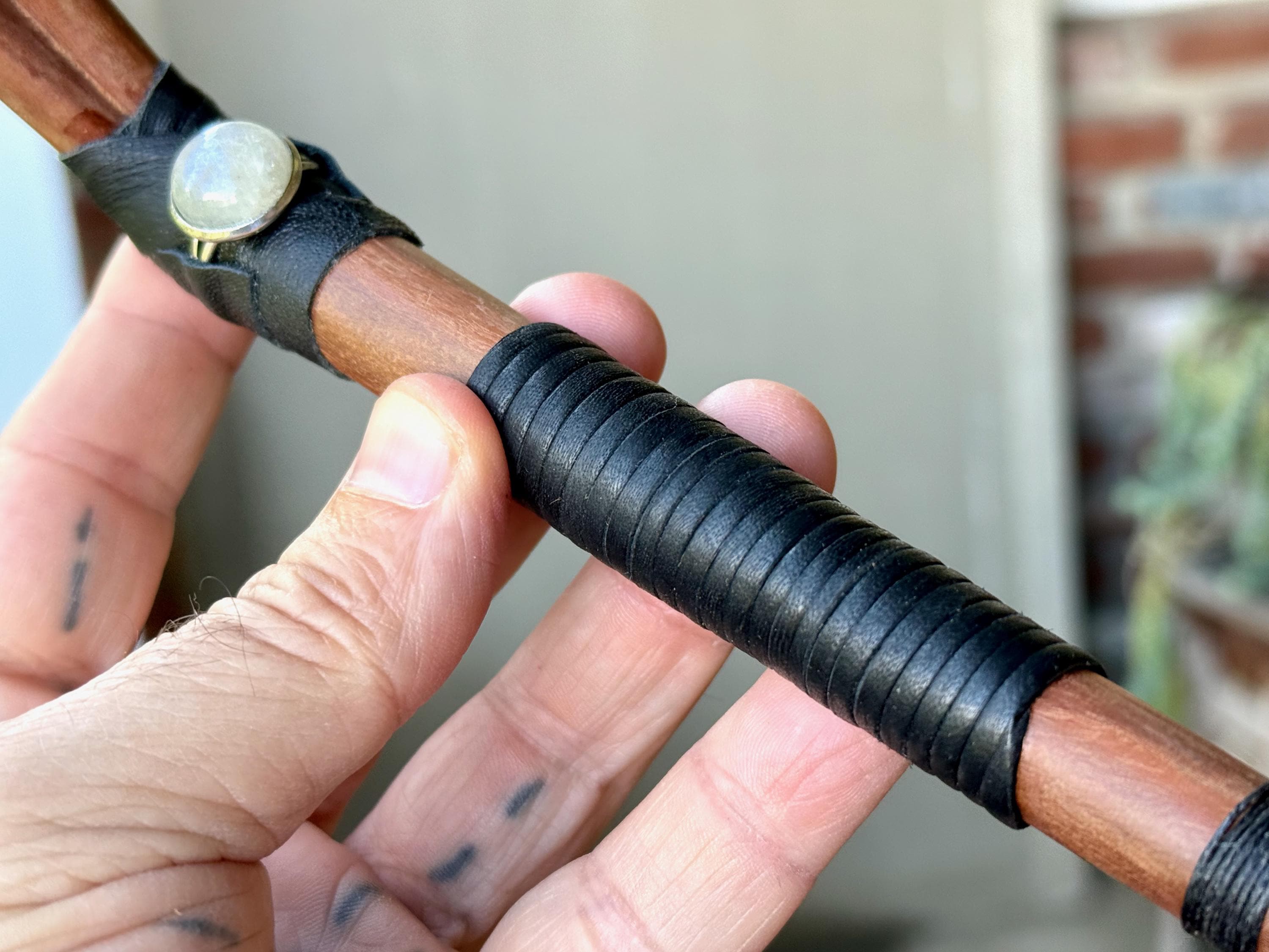 This beautiful Double Tepi Pipe was handcrafted from high-quality Teak Wood and adorned with leather wrapping and a Moonstone cabochon.