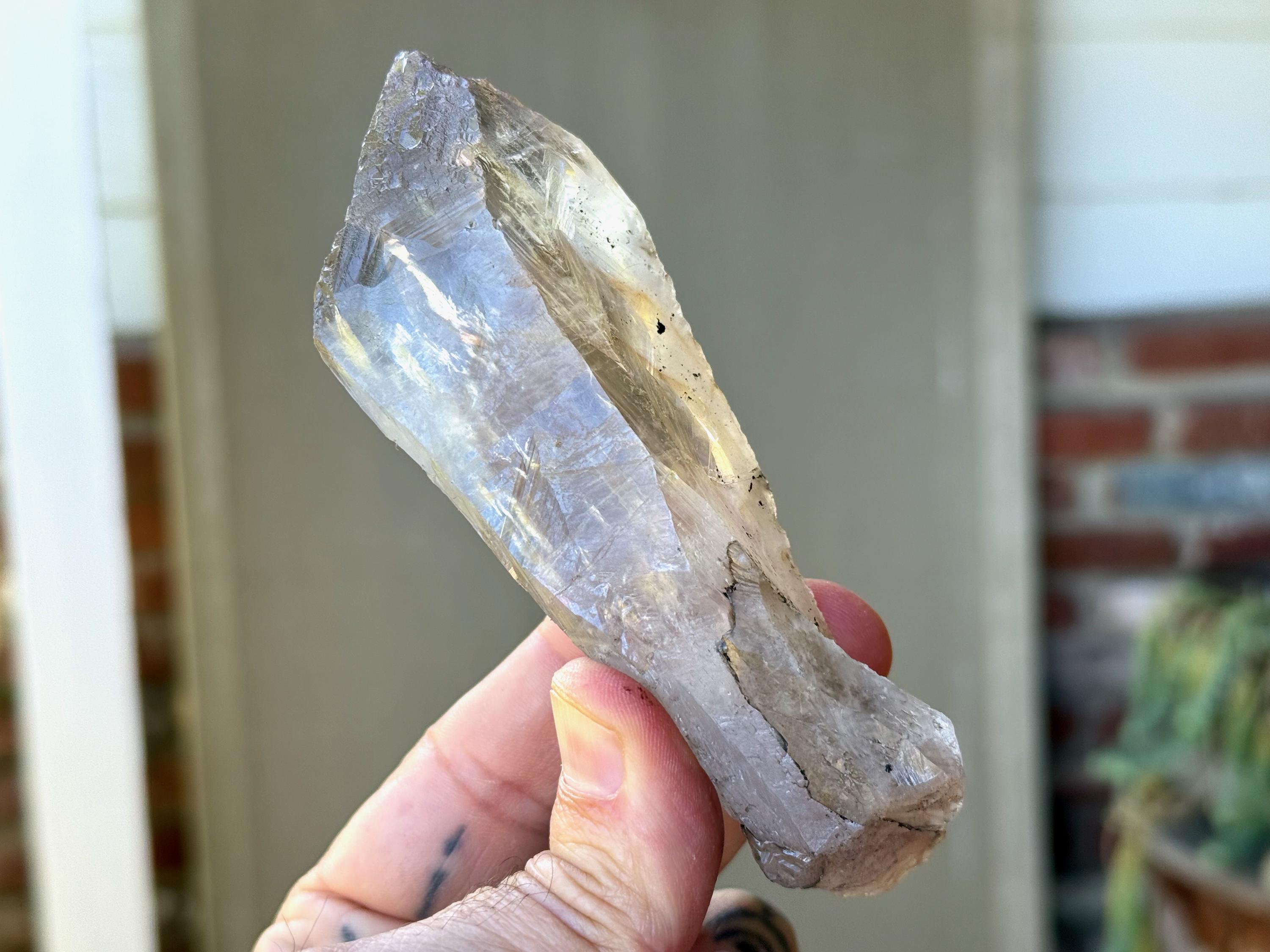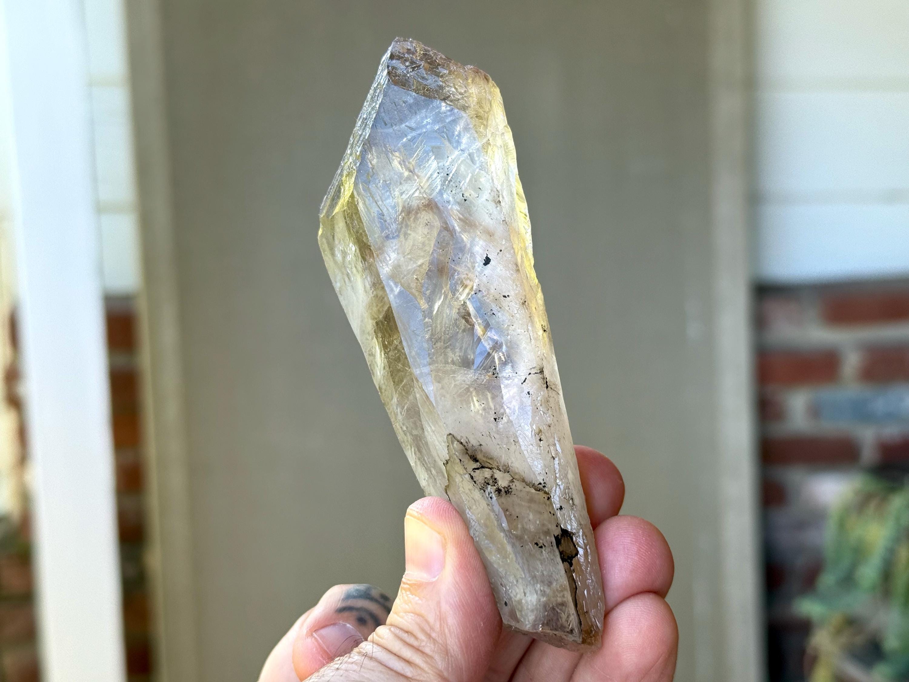 Superb clarity and brilliant luster to this broad and elongated Powellite Phantom Quartz. This "root" crystal features an entire broad side that is a textural contact area. The main facet features beautifully etched textures (Photo 7).