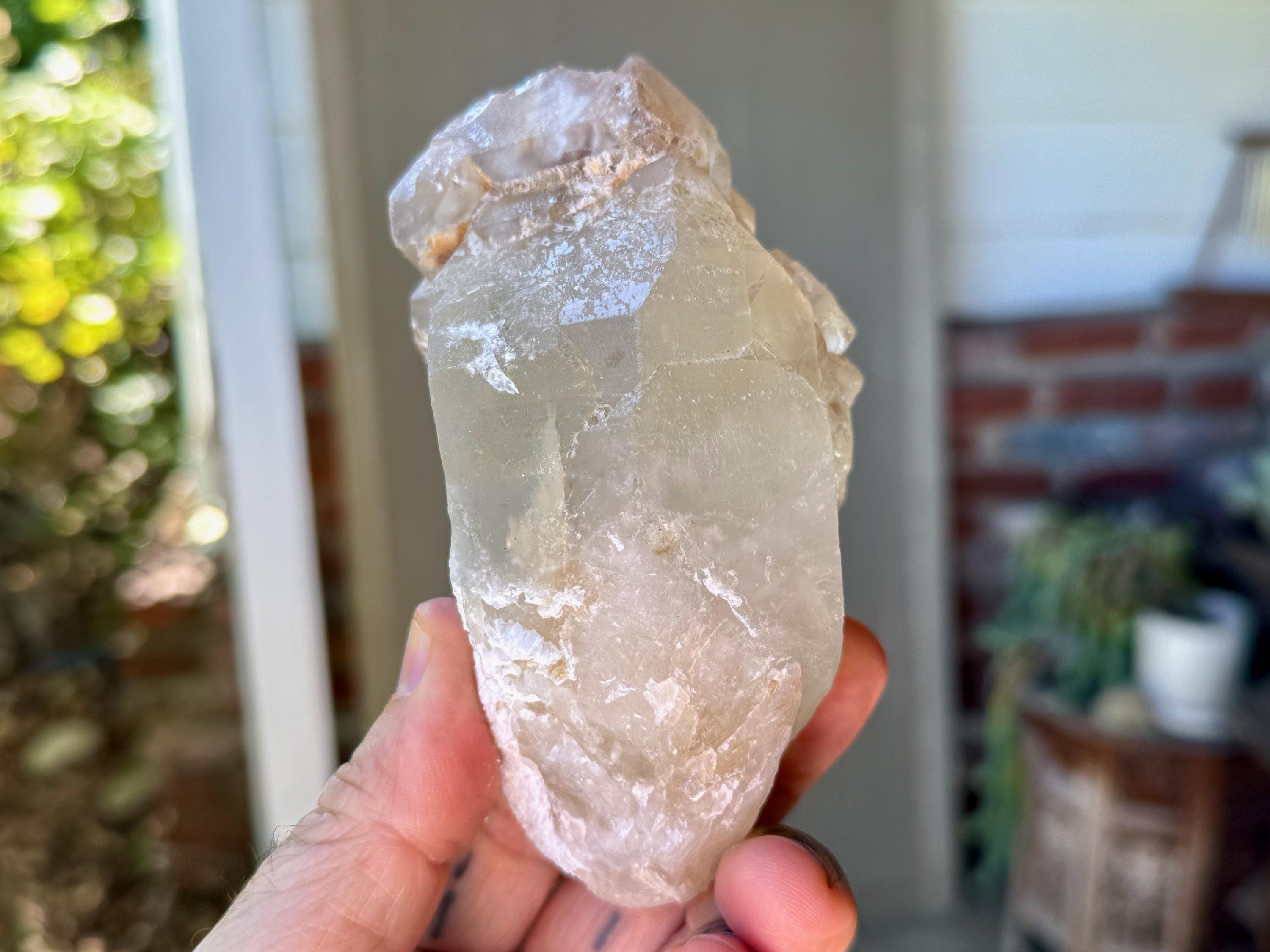 This crystal features a primary Quartz point in a traditional formation. However, growing over the main facet area is an array of sceptered, secondary Elestial growth, creating a beautiful aesthetic formation. The quartz itself is mildly cloudy with a mild golden tinge, indicating some likely Citrine inclusion.