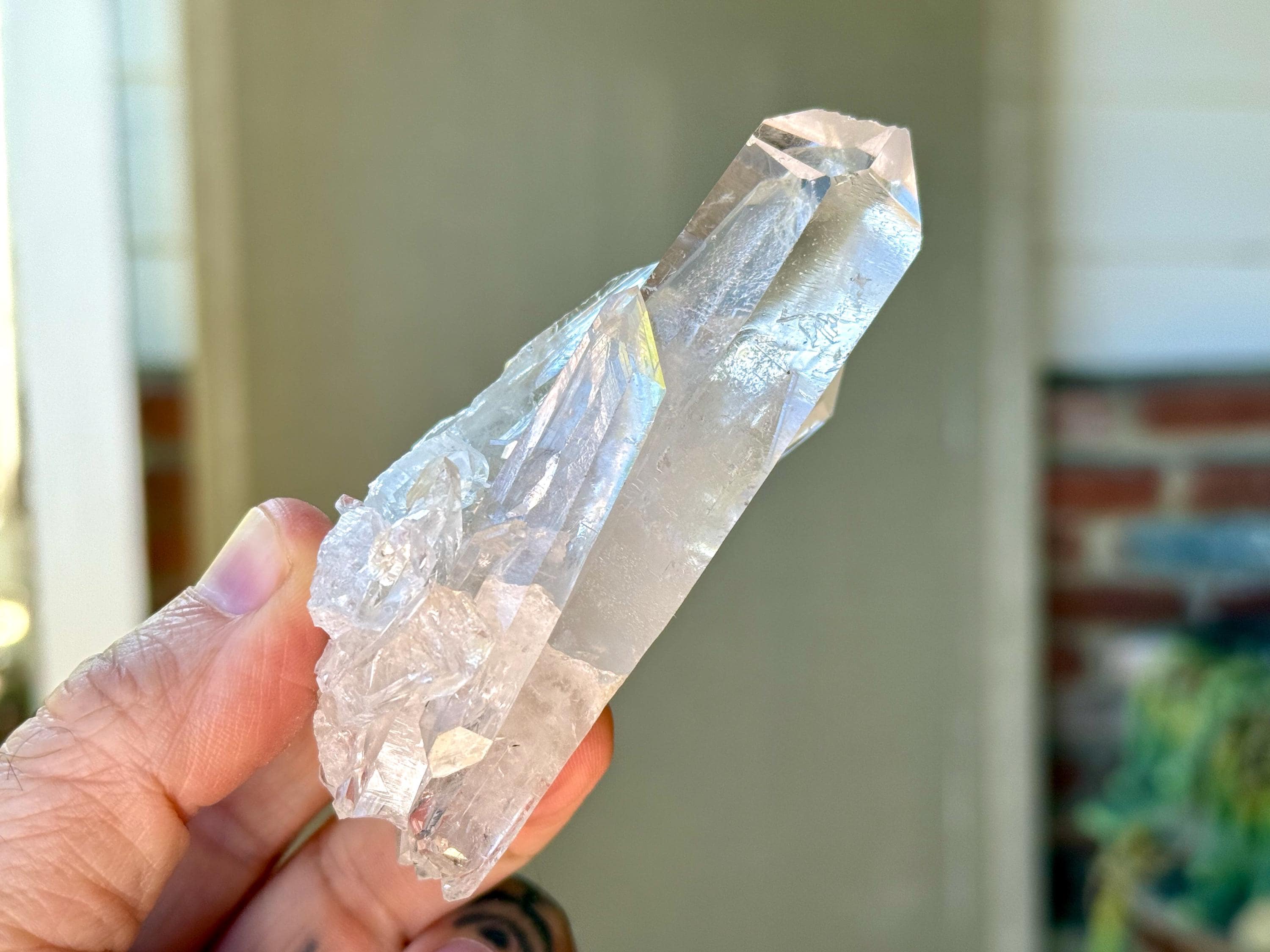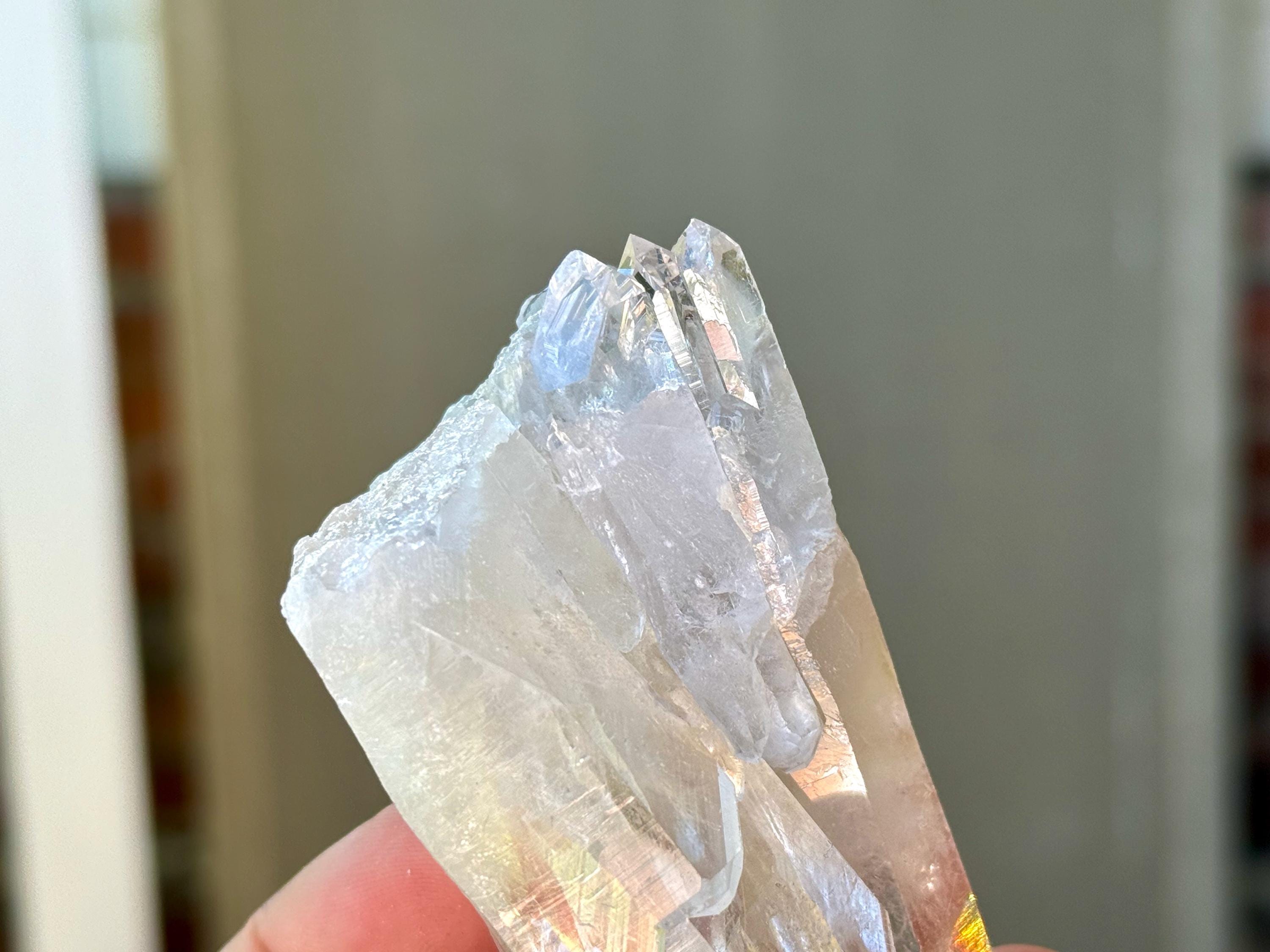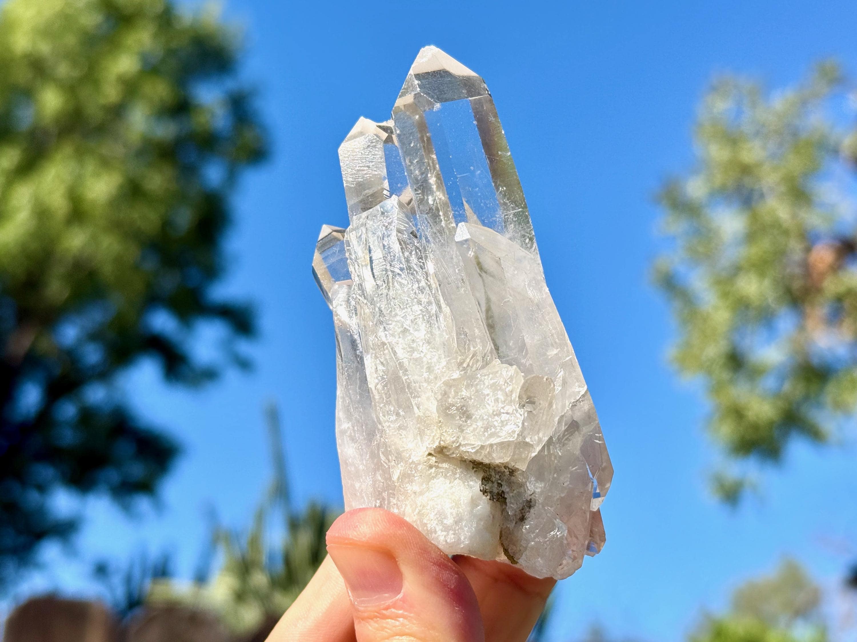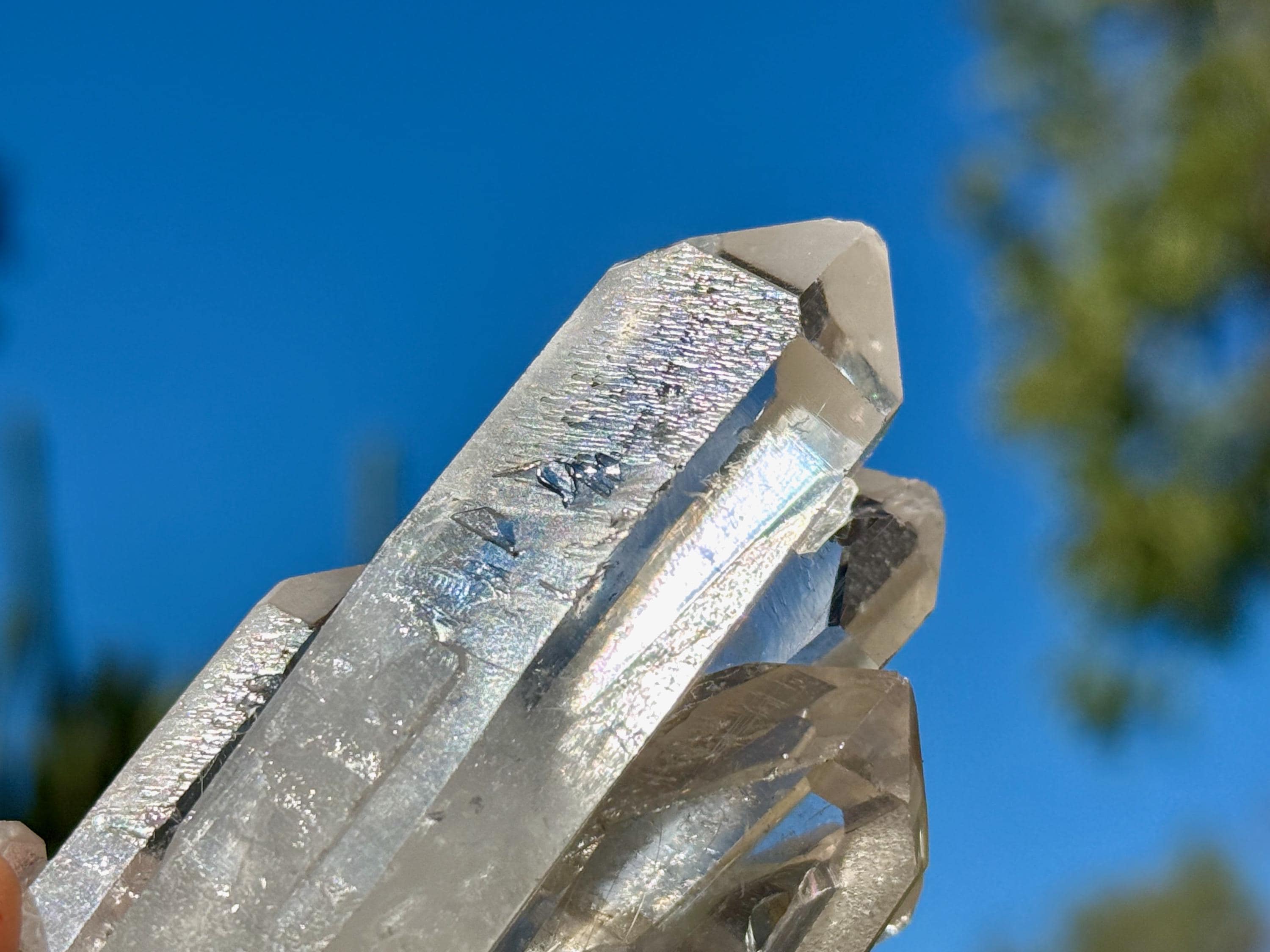 The complexion is glassy and ethereal. The largest primary crystal features a Double Termination (Photo 8). There are minor chips to both primary crystals on the main facet areas, both mildly abut the terminations. However, this minor flaw does little to detract from the beauty of this piece. Great quality and energy!
