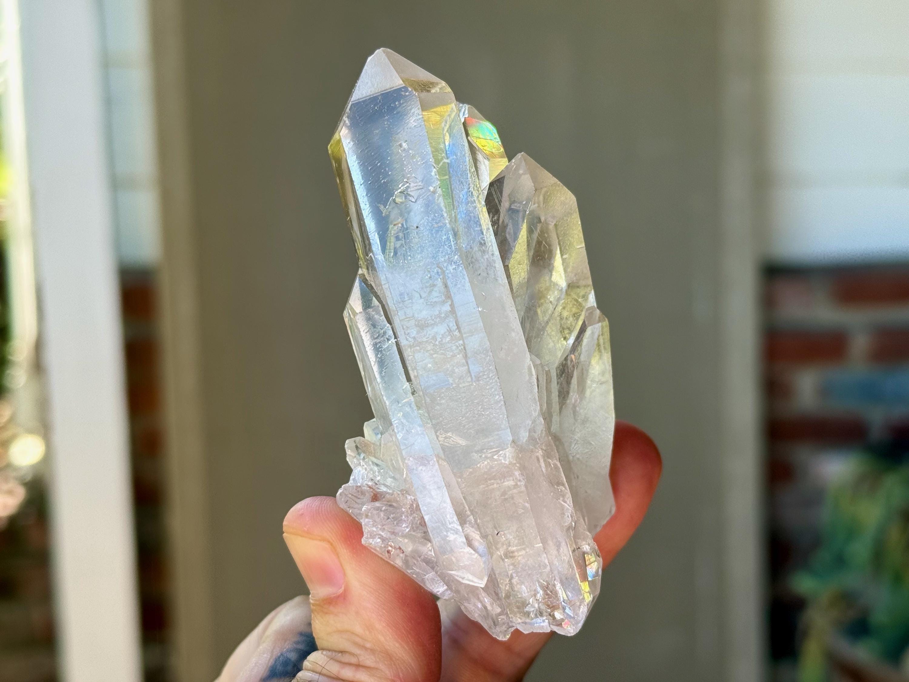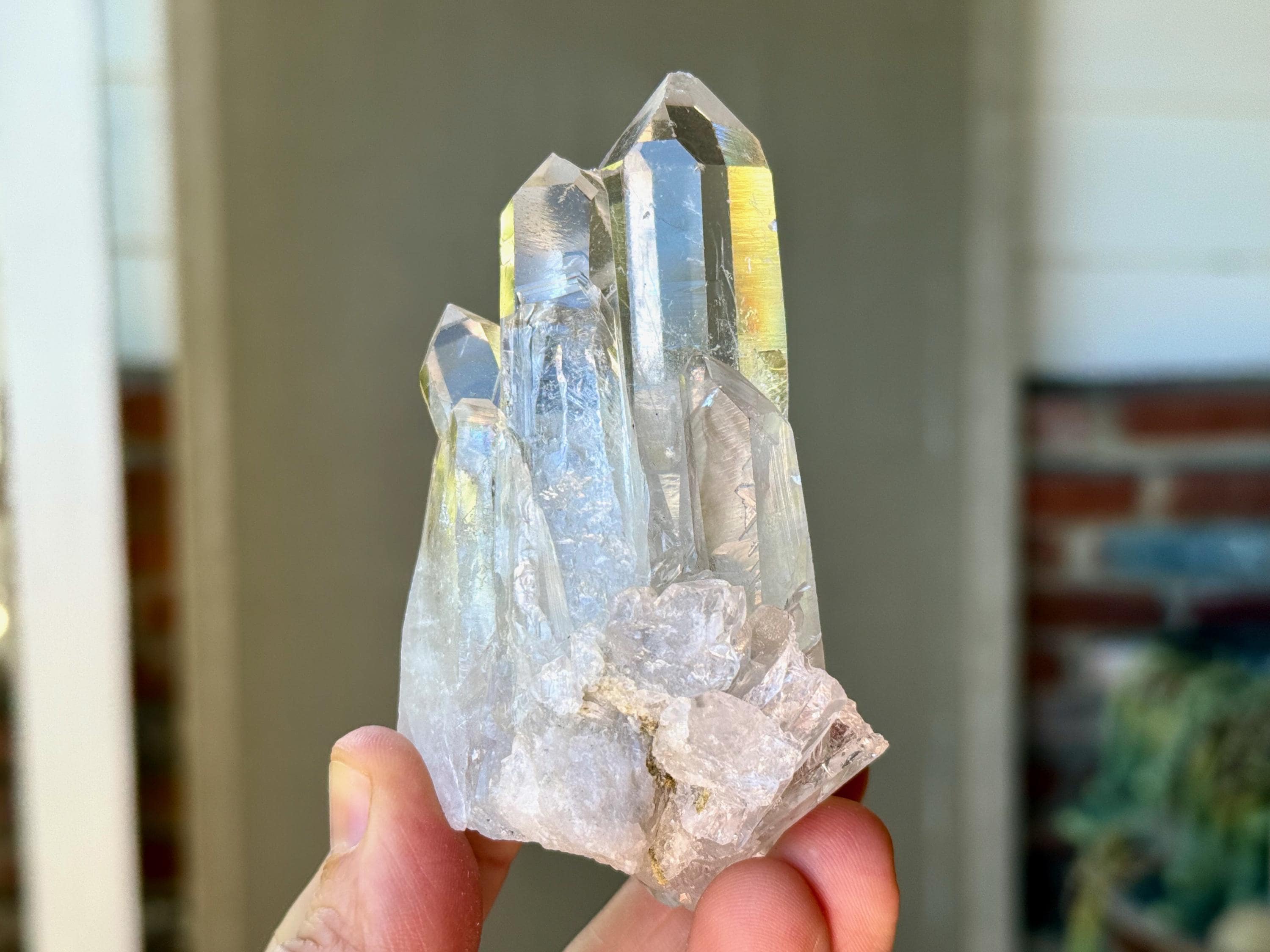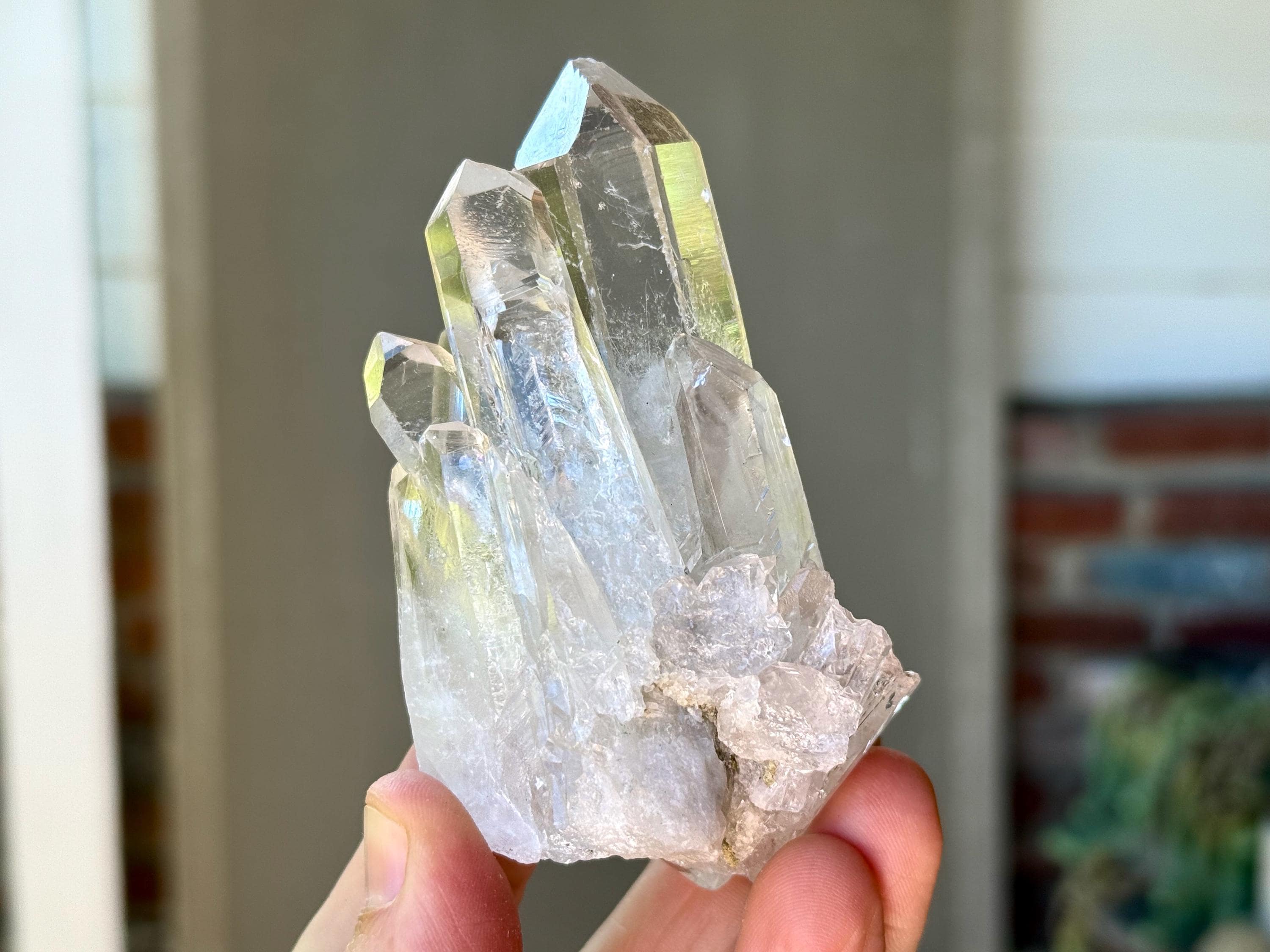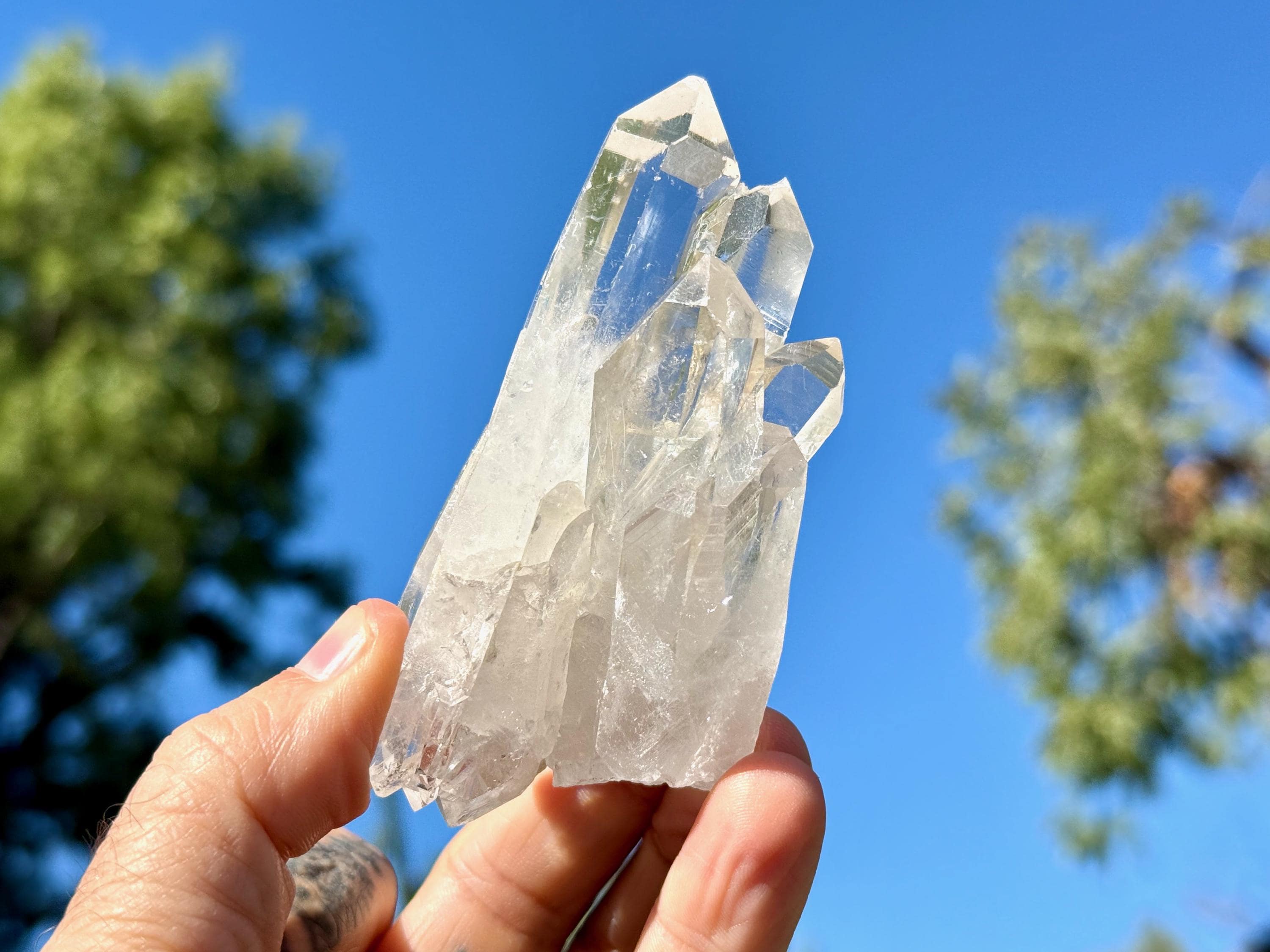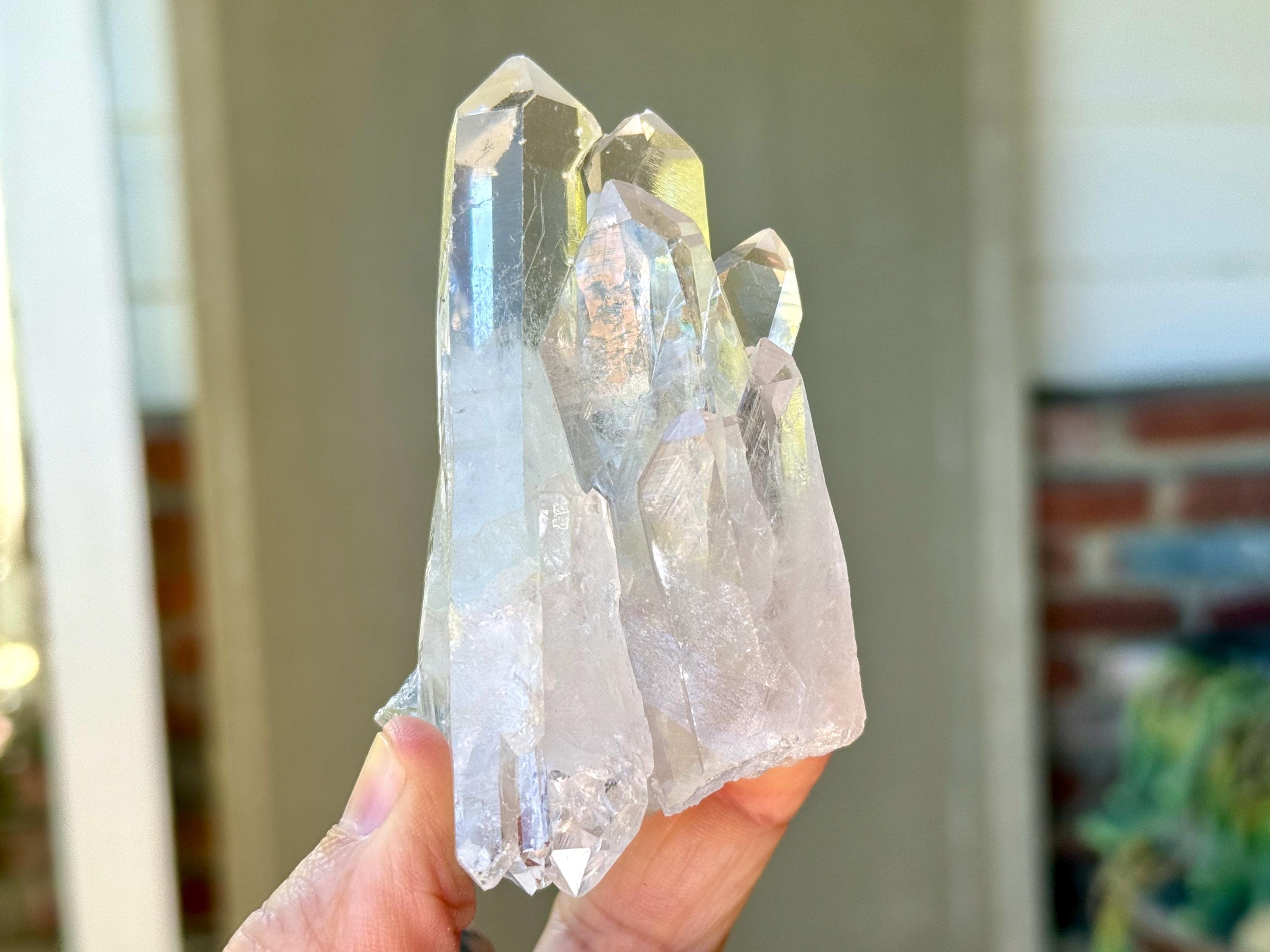 Water clear clarity and brilliant luster to this superb Starbrary Quartz crystal in a beautiful "bloom" of a cluster formation. This crystal possesses mild Starbrary markings on the primary crystals.