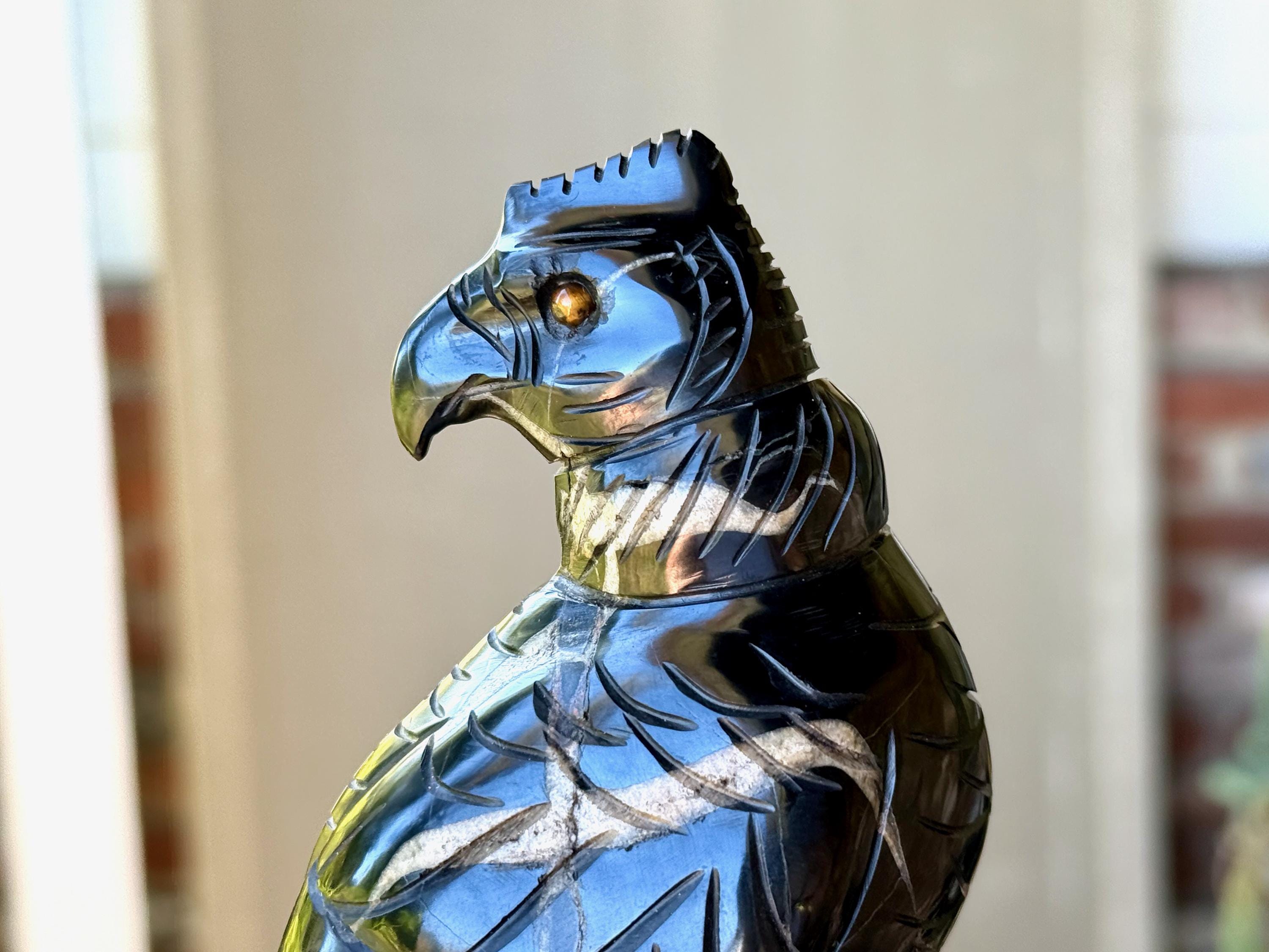 This is a truly masterful work of art, so weighty and powerful in its presence, and striking in its composition. The attention to detail is quite amazing, as we see in the eyes, where the artist used Tiger's Eye inlays. The white veining we see running through Onyx is Septarian Stone (a combination of Limestone, Calcite and Aragonite), and provides wonderful aesthetic contrast and detail to this figure.