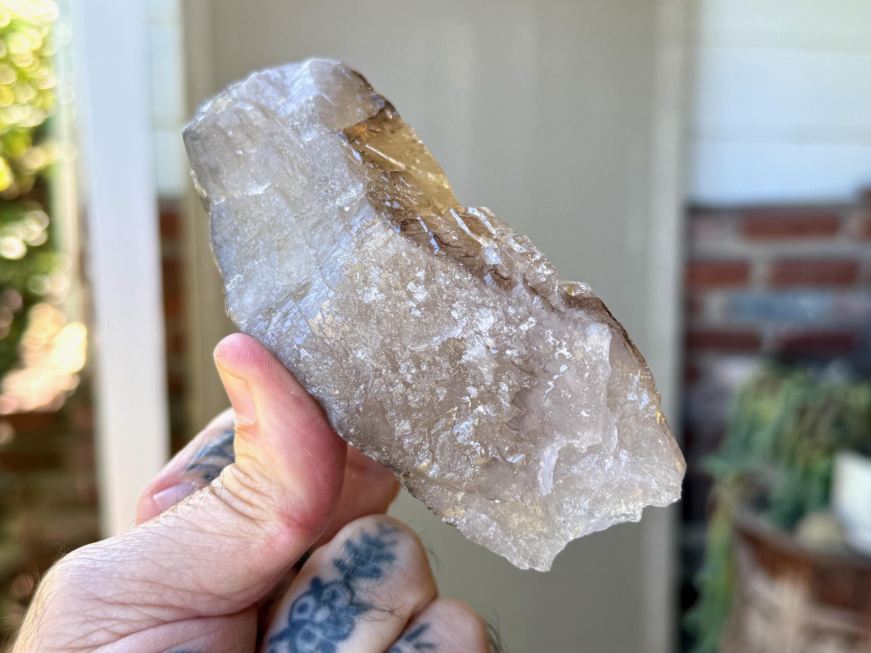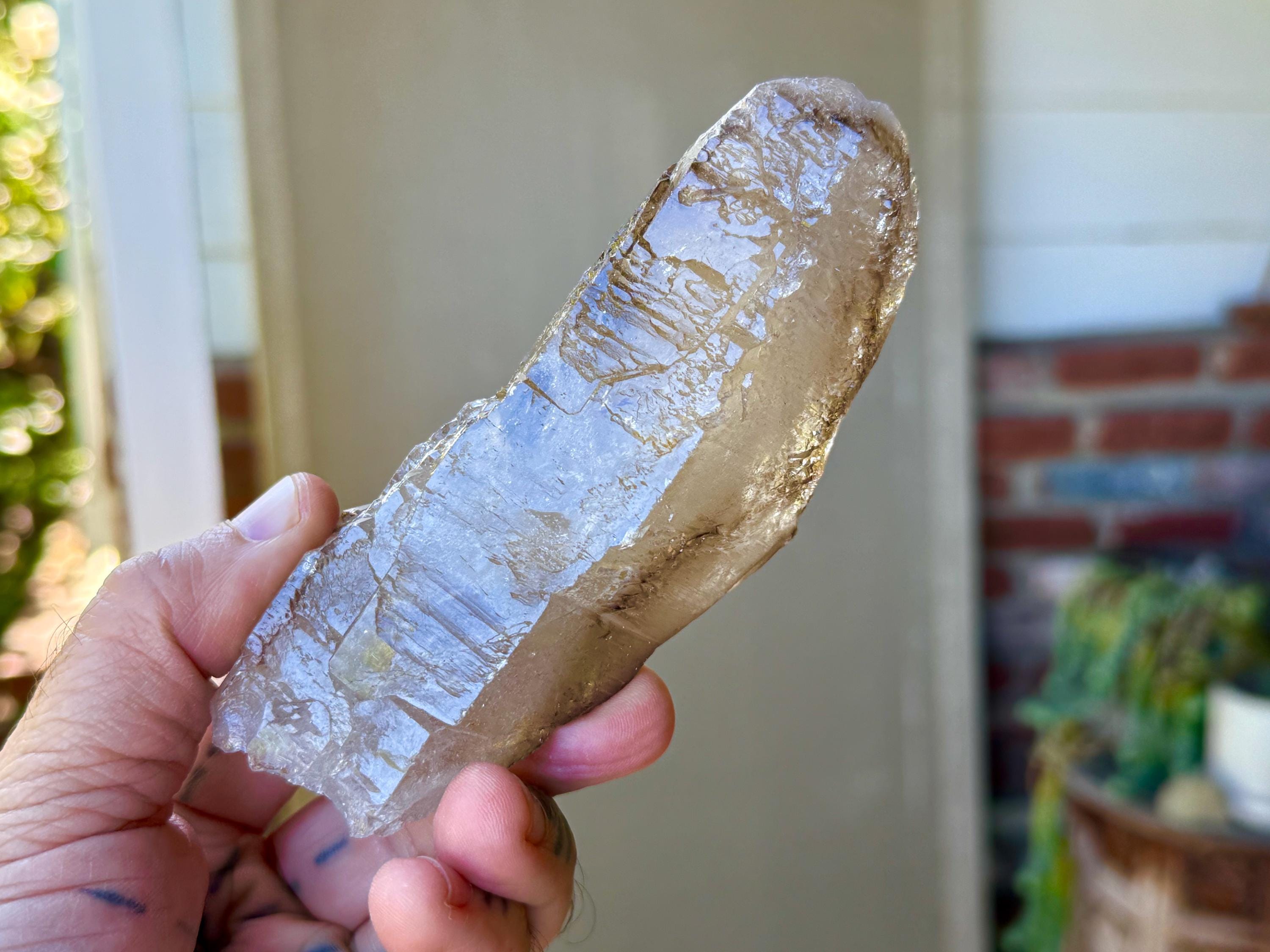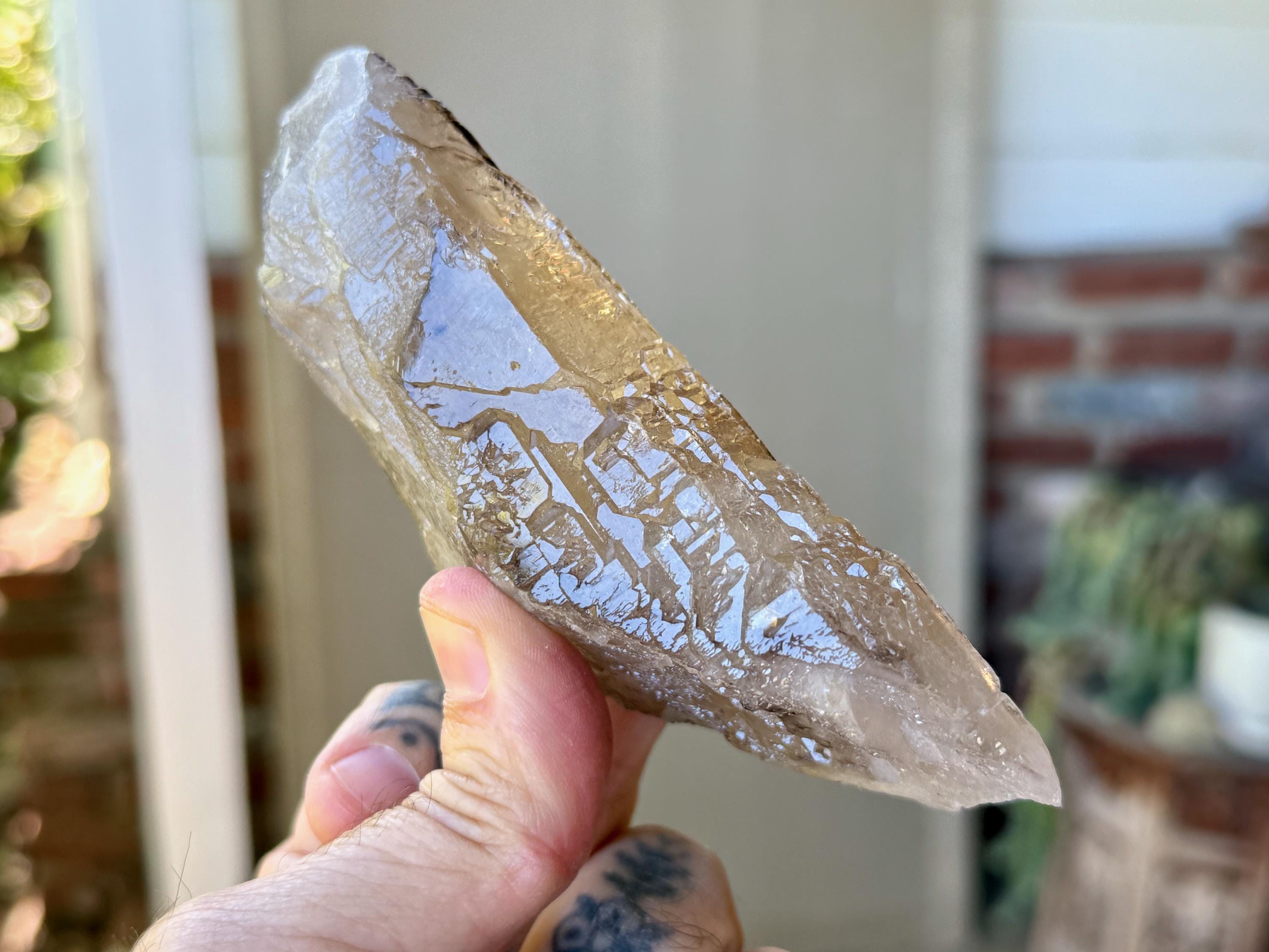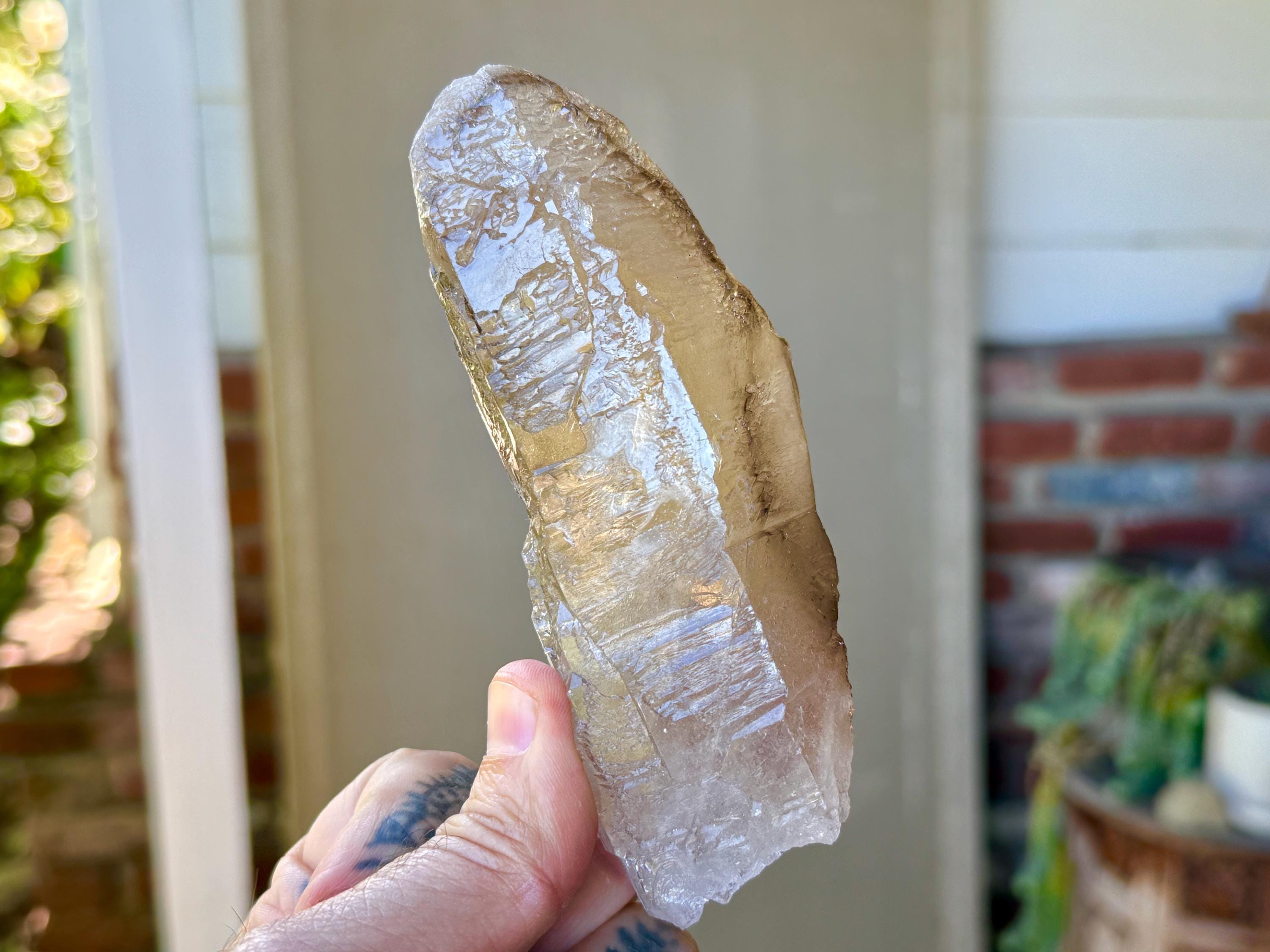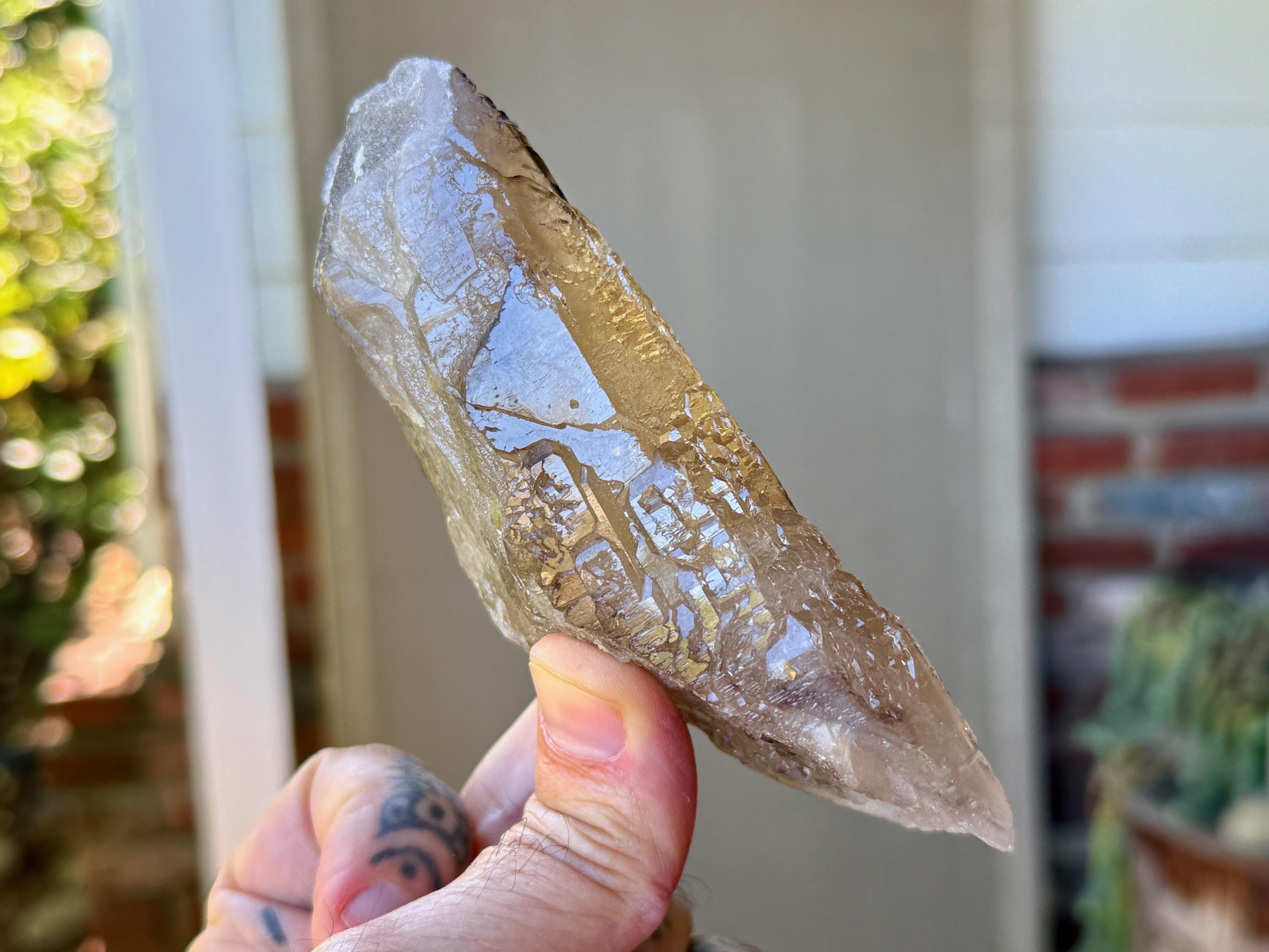 Magnificent luster to this beautiful Elestial Smoky Citrine crystal with a smoky-golden hue and superb etched textures covering its broad sides.