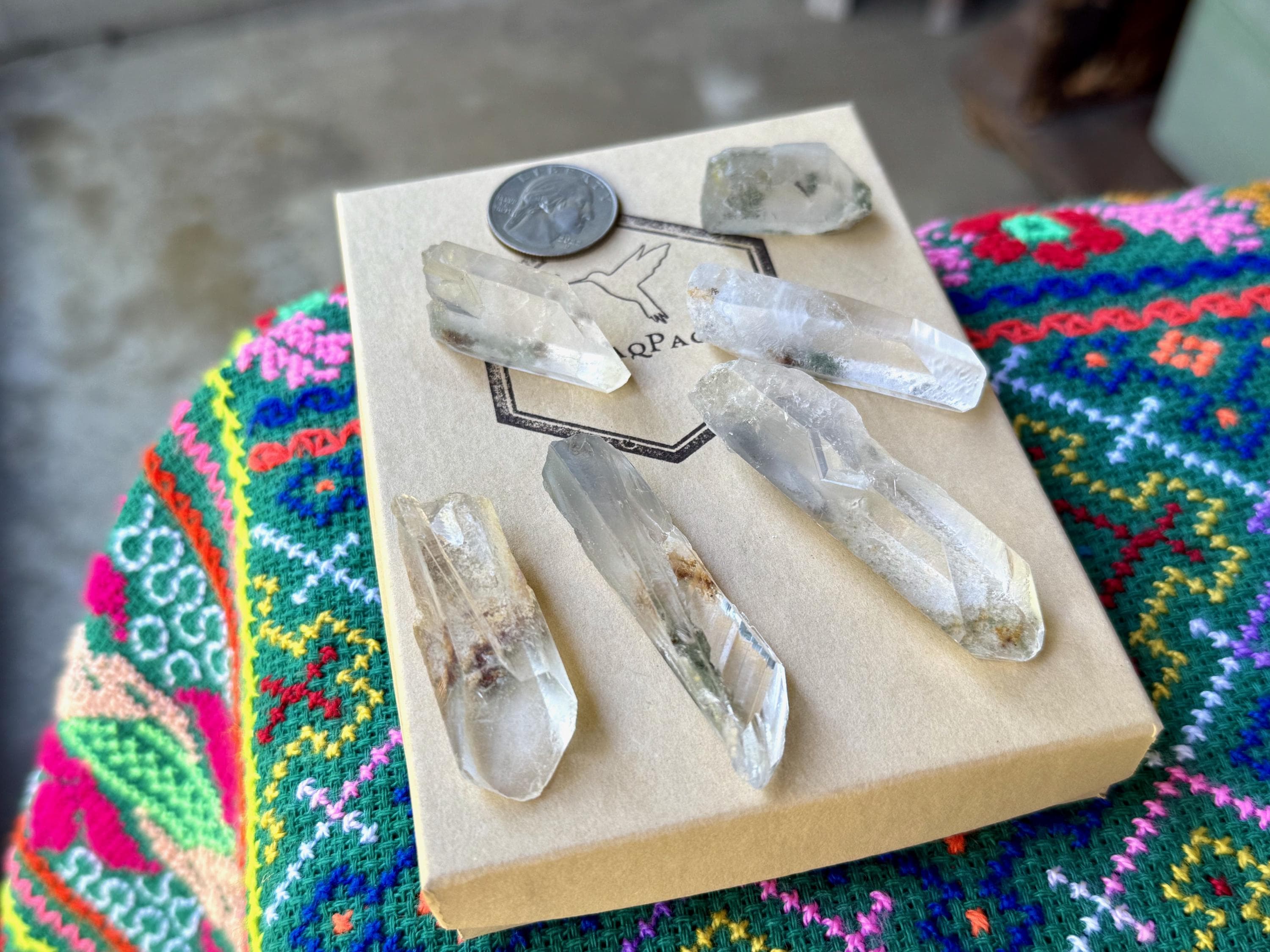 Wonderful clarity and excellent luster to these Green Chlorite Phantom Quartz crystals. Each of these has some mild inclusion of Green Chlorite, and in some cases, Hematite or Kaolinite. Two of these appear to be Lemurians!