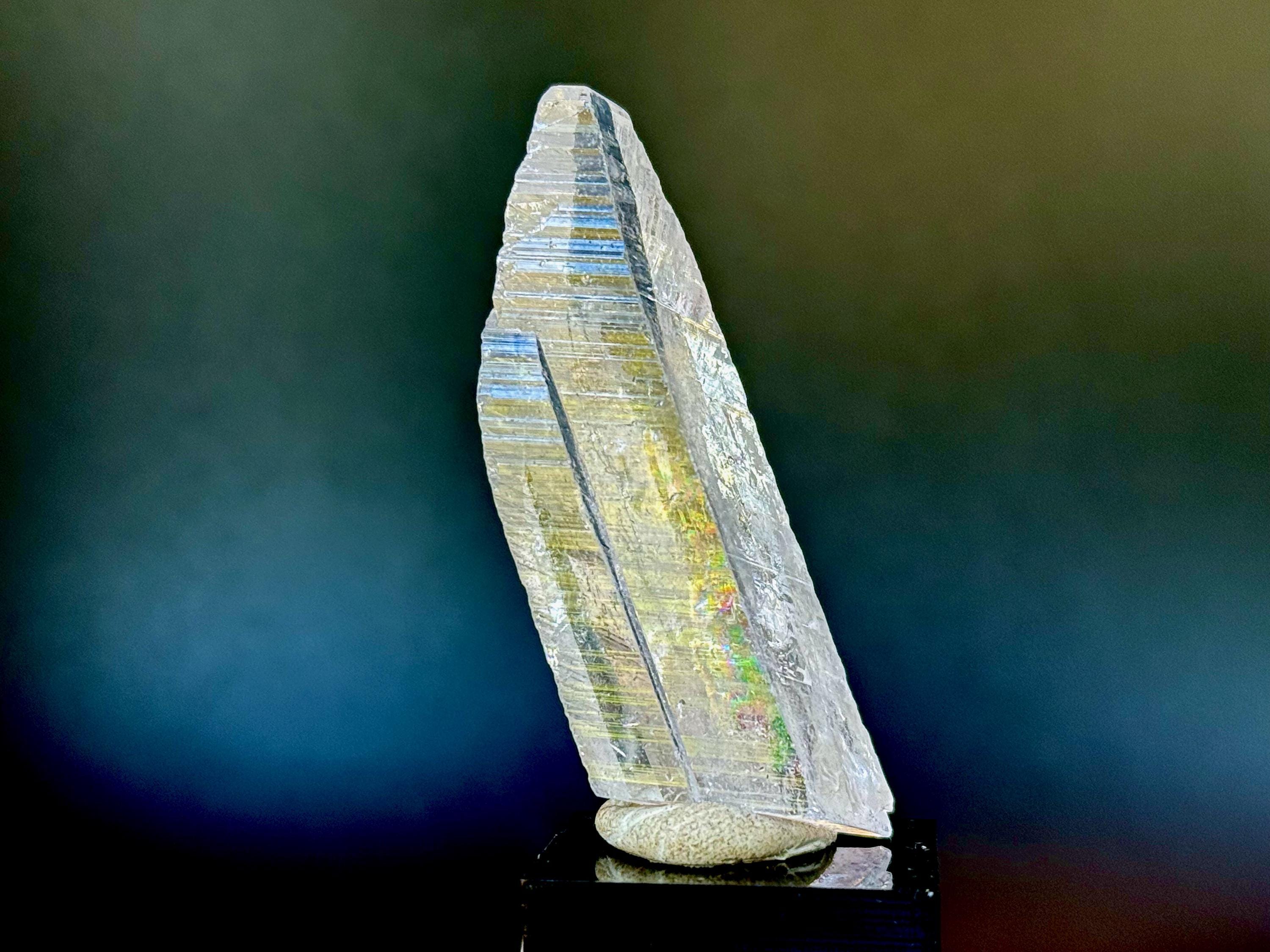 On its sides, we can see deep diagonal striations that run from top to bottom. There's a mild rainbow inclusion within as well.