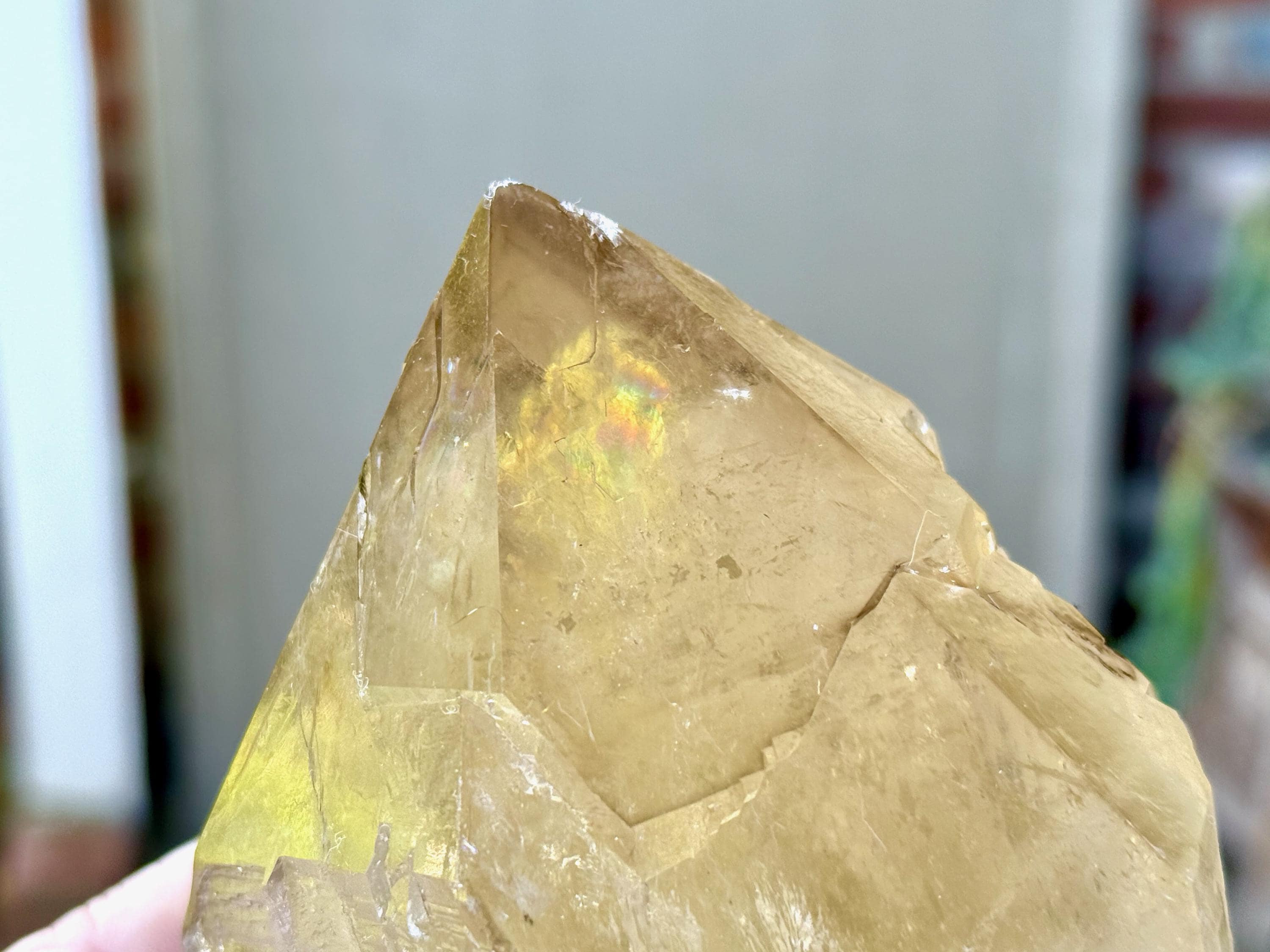 One of the largest and finest crystals from this new find, this superb Cathedral Citrine features a vibrant yellow-golden color, paired with exceptional luster. Its broad sides feature gorgeous etched textures, and the main facets exhibit beautiful cathedralization. You may even catch a flashing rainbow when the light hits right in the center of the main facet (Photo 5).