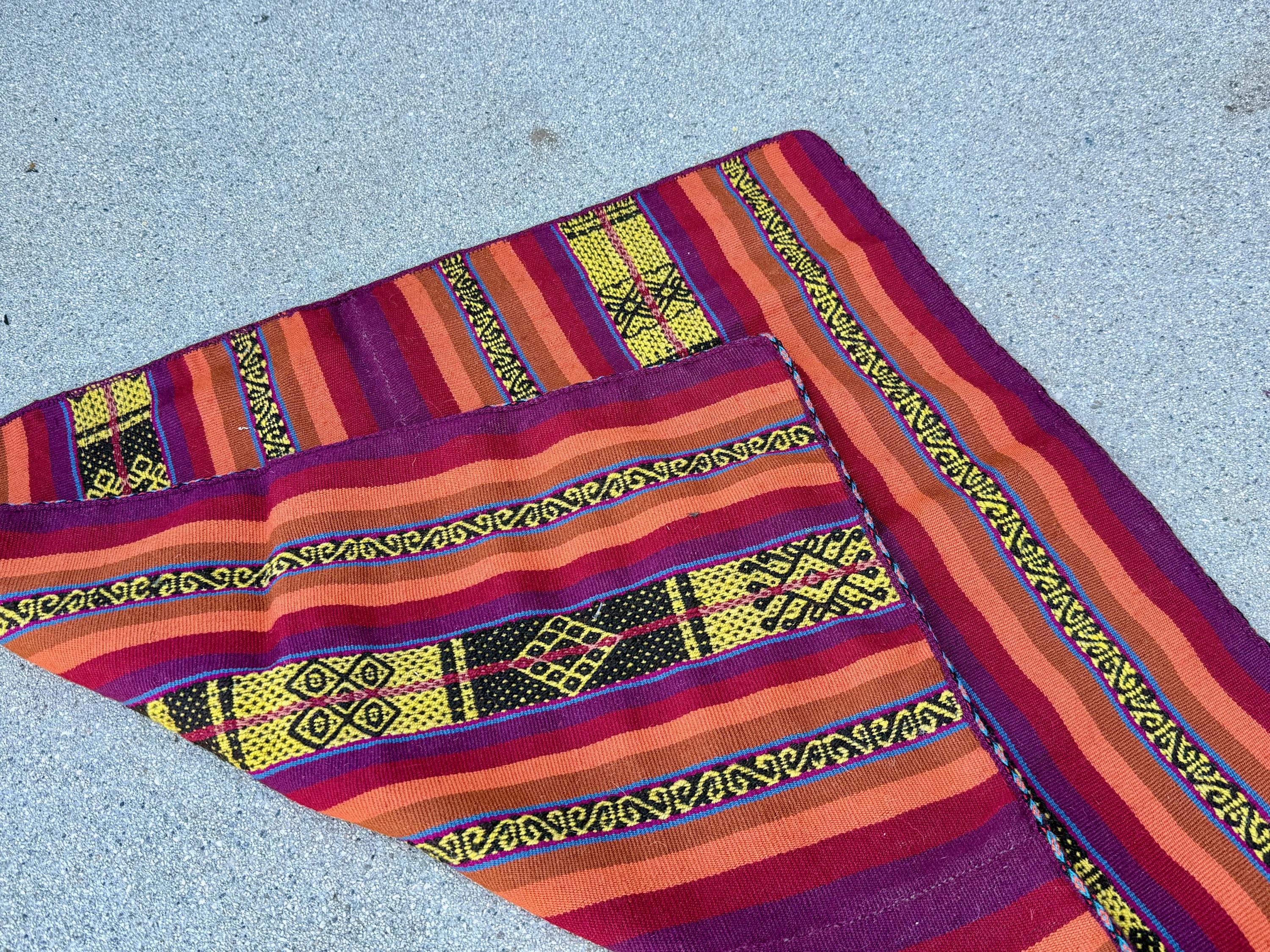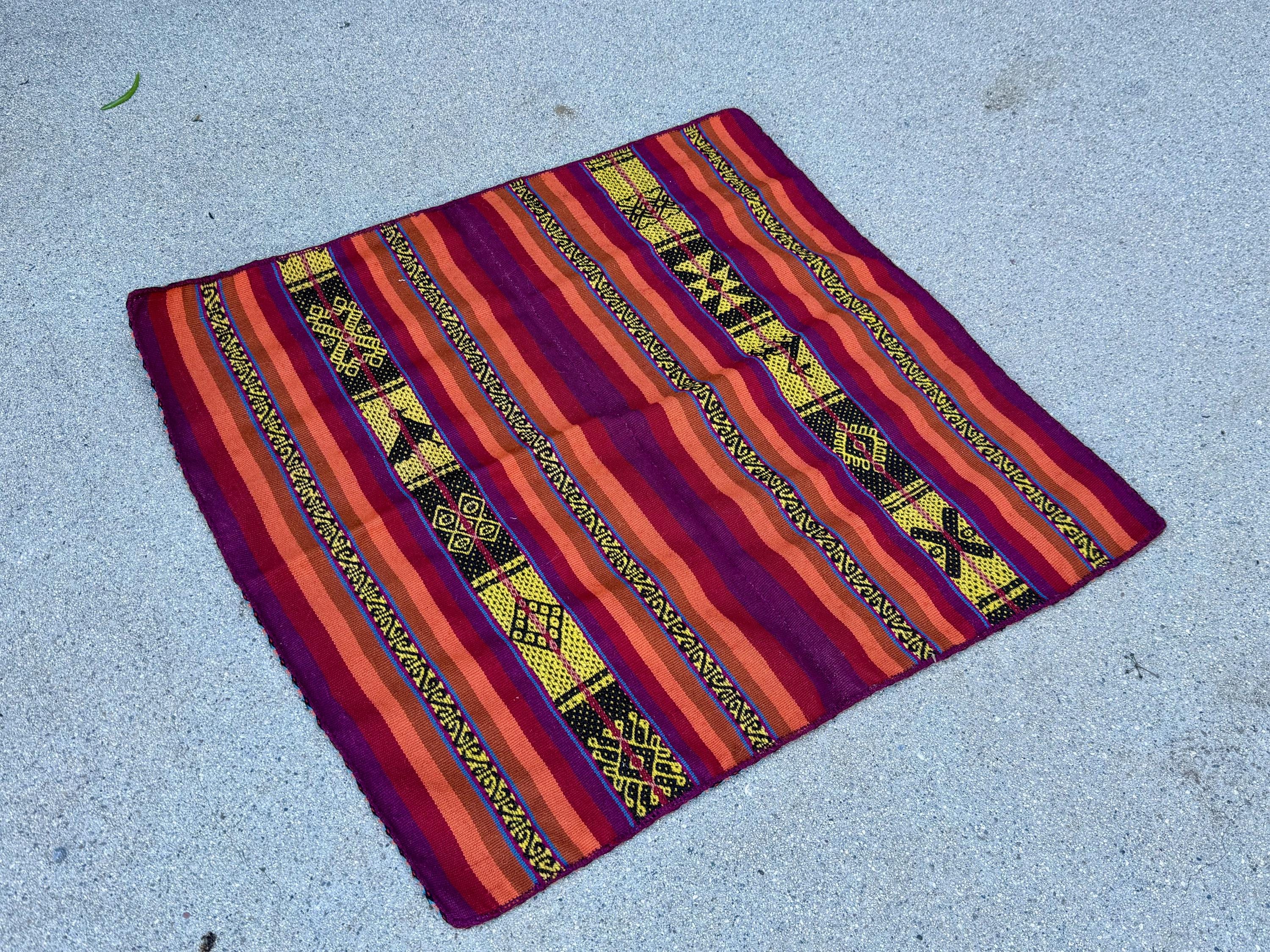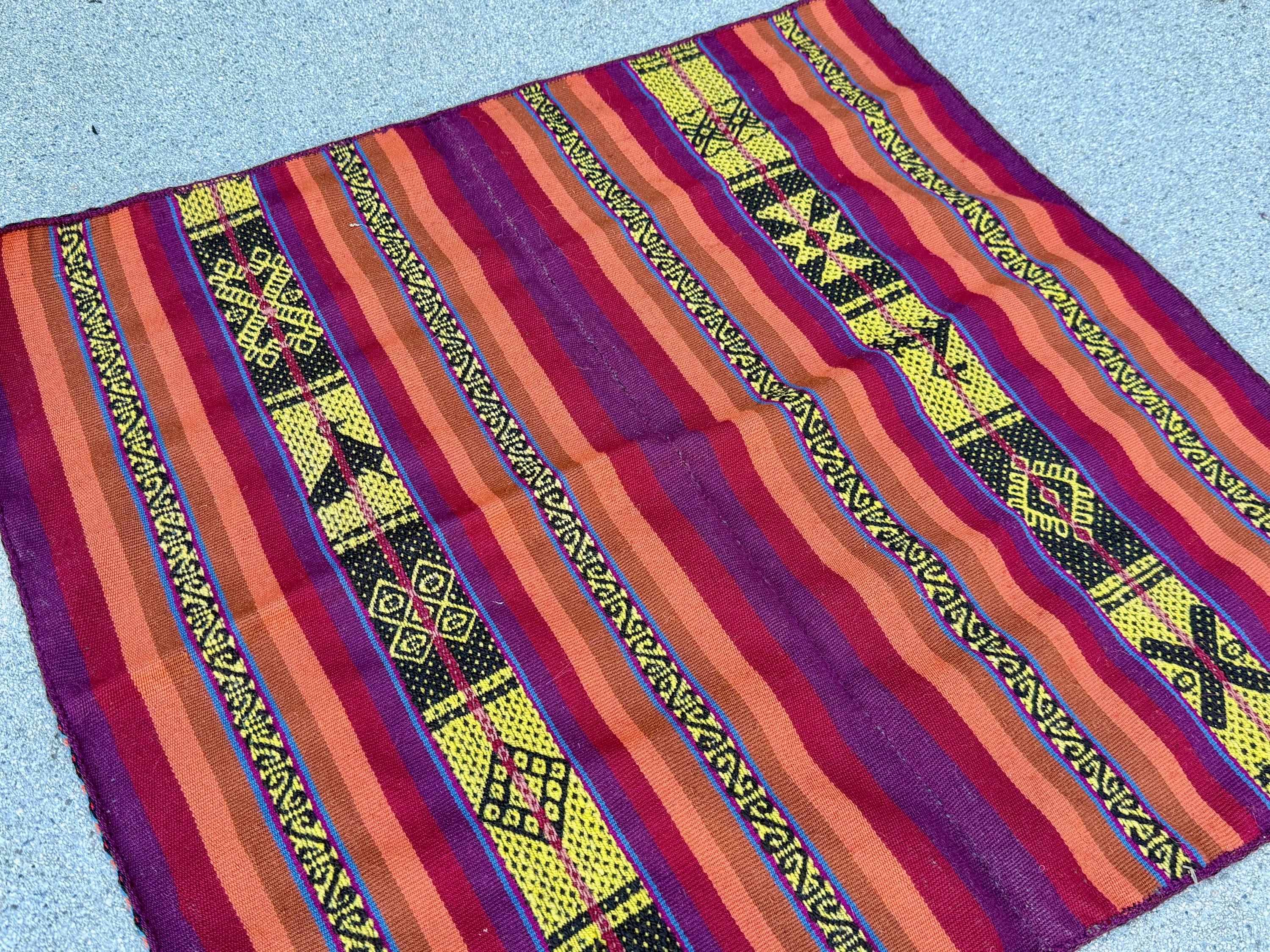 Vibrant colors to this beautiful manta cloth with narrow vertical swaths of reds and orange, and broader swaths of yellow. Over the yellow areas are a variety of geometric symbols and animals. It is a practical medium size, can be used either vertically or horizontally, and is also reversible (as pictured).