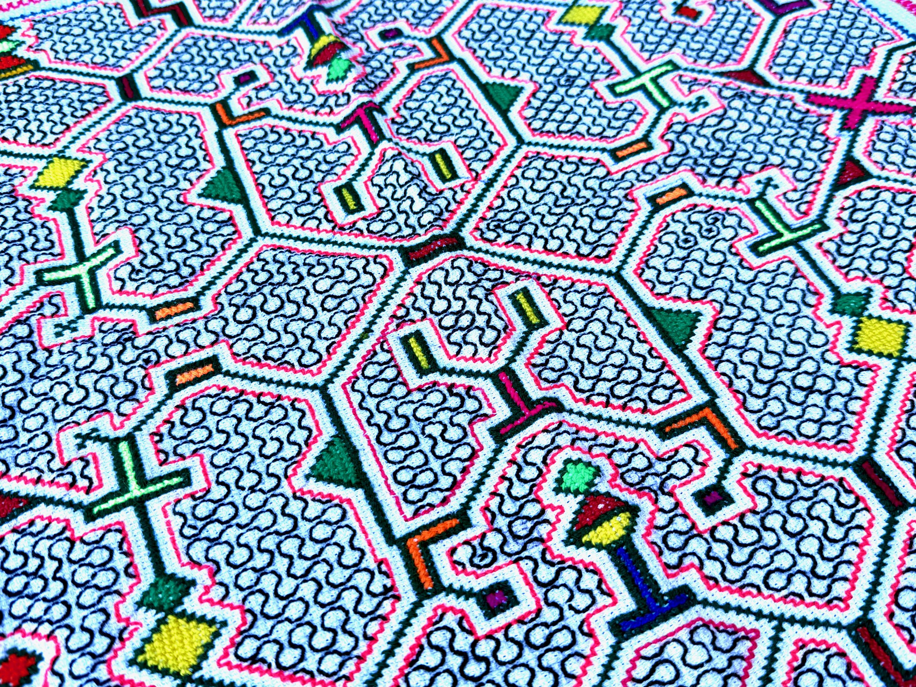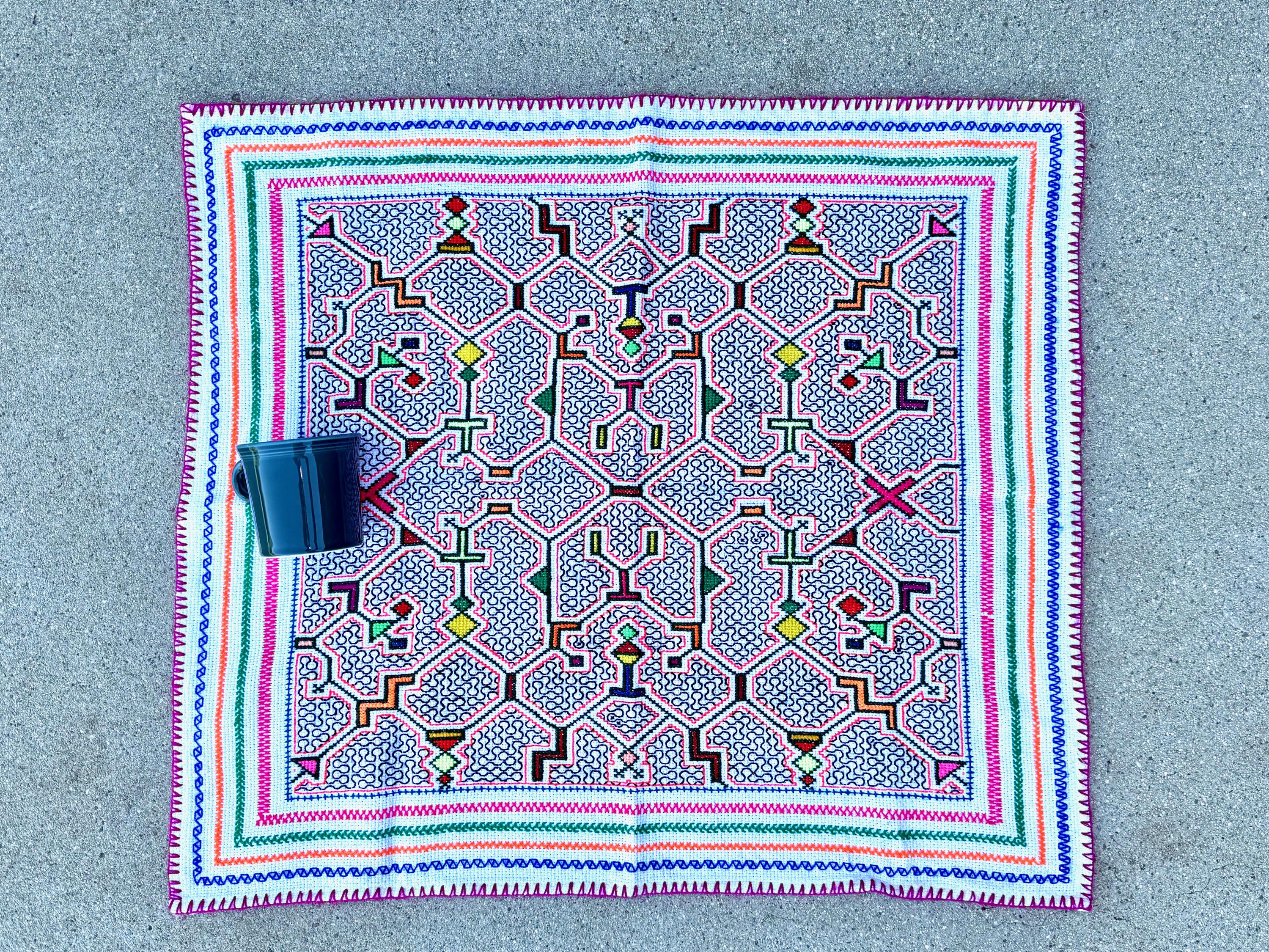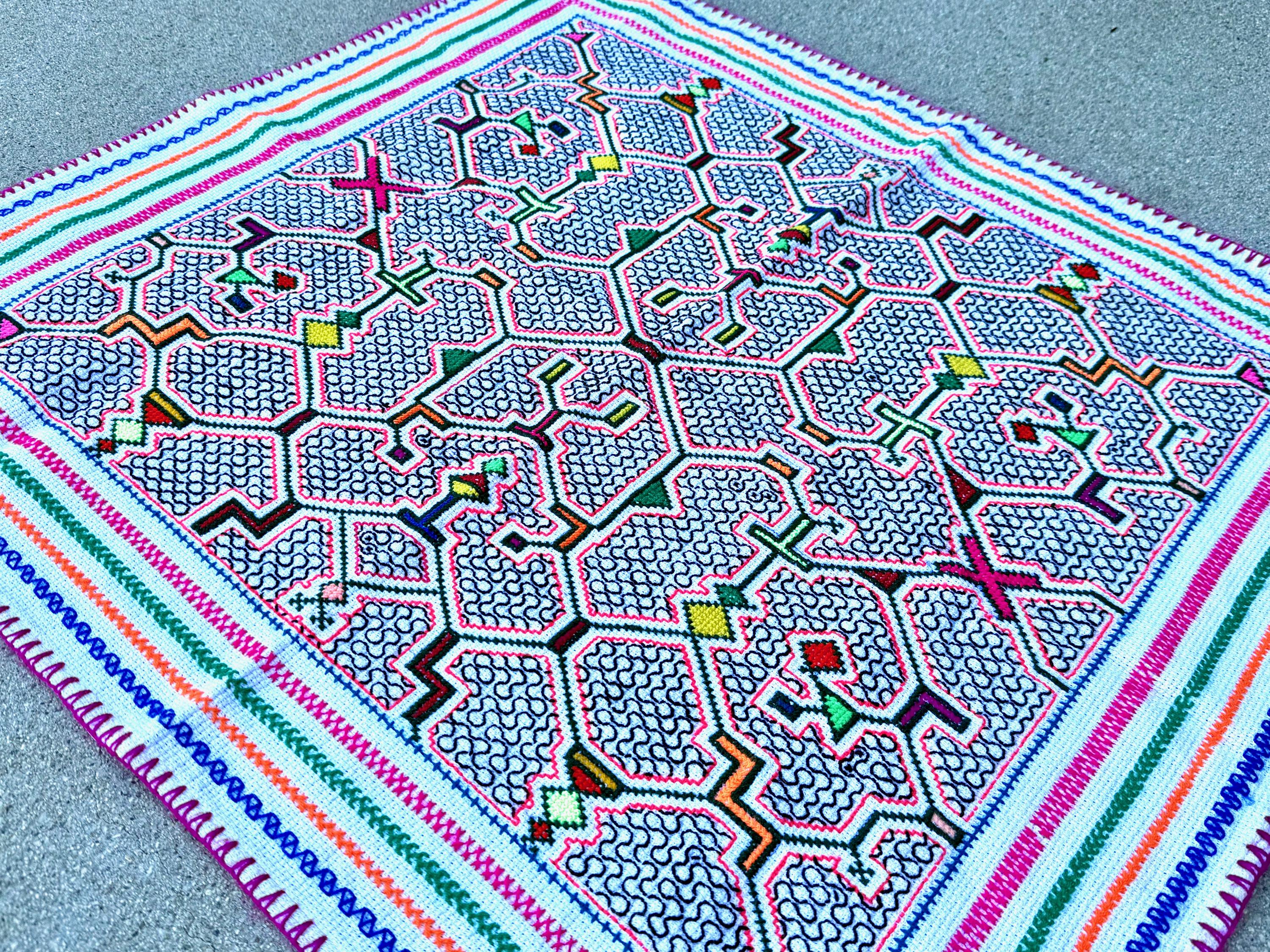 This traditional Shipibo Manta cloth was hand-embroidered by the talented Peruvian artisan Laura Rengifo in Pucallpa, Peru.