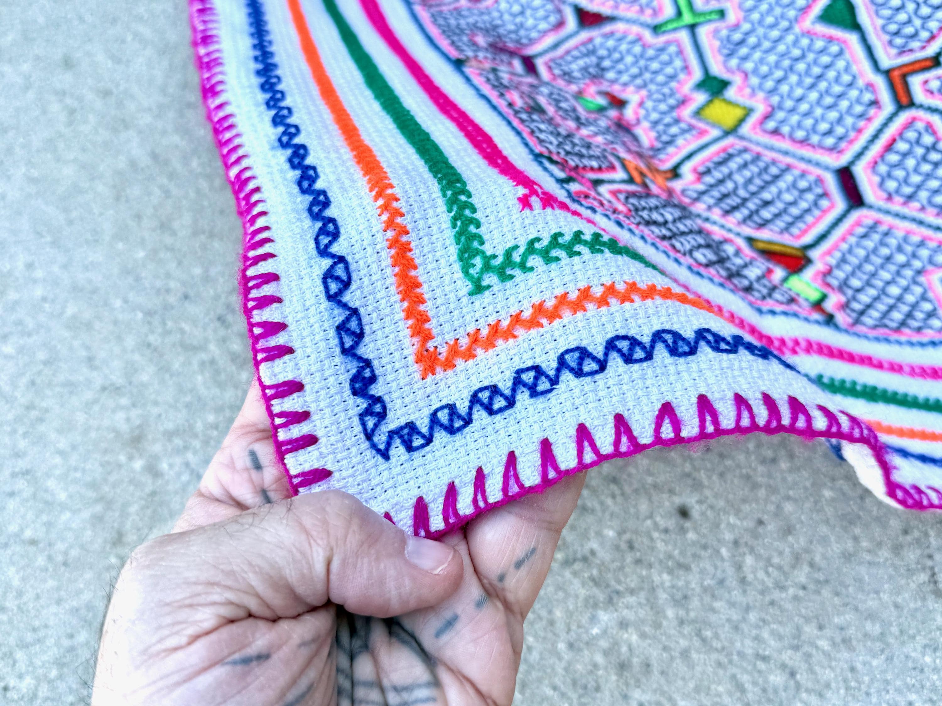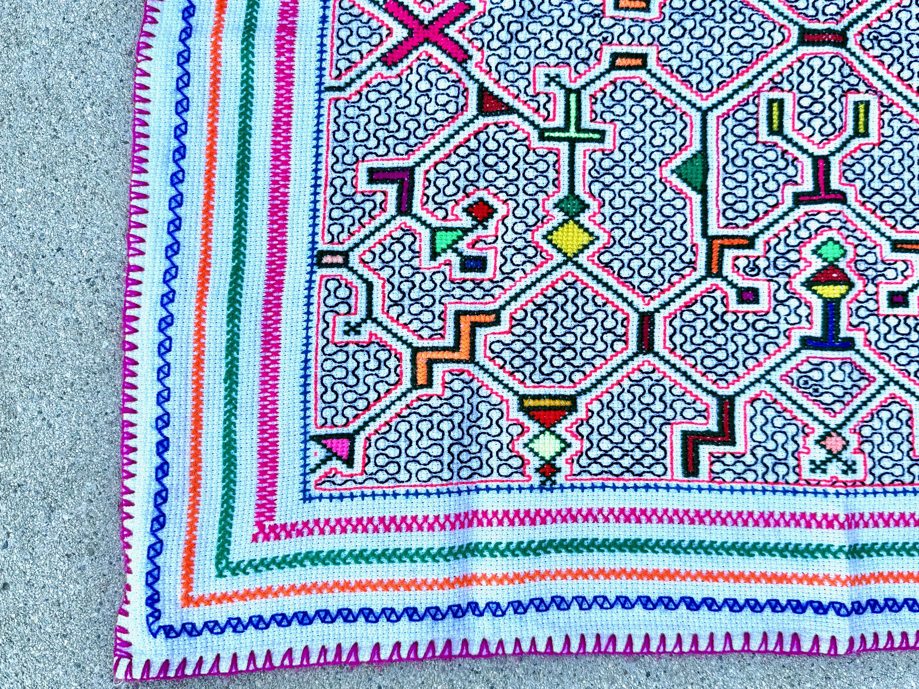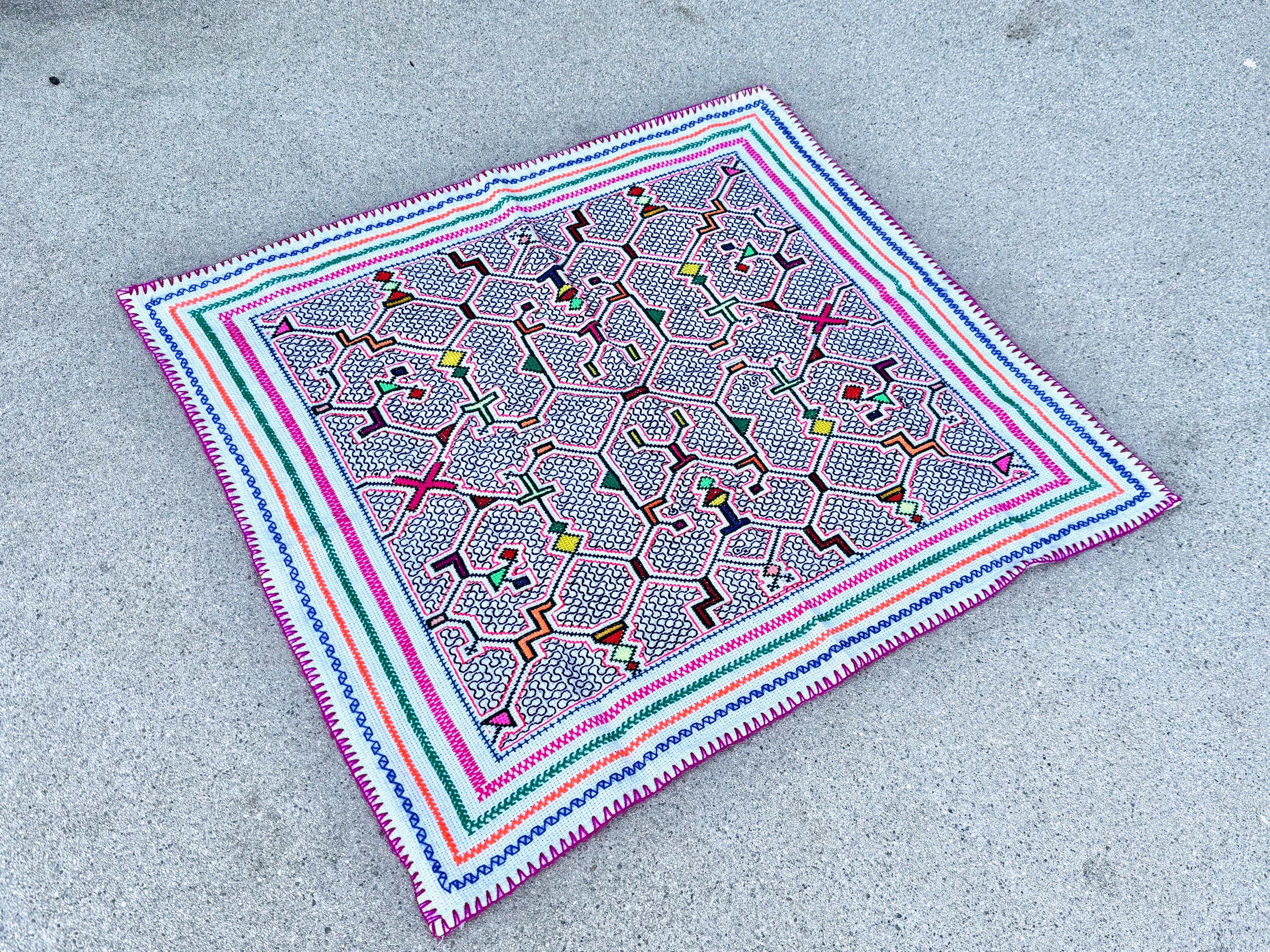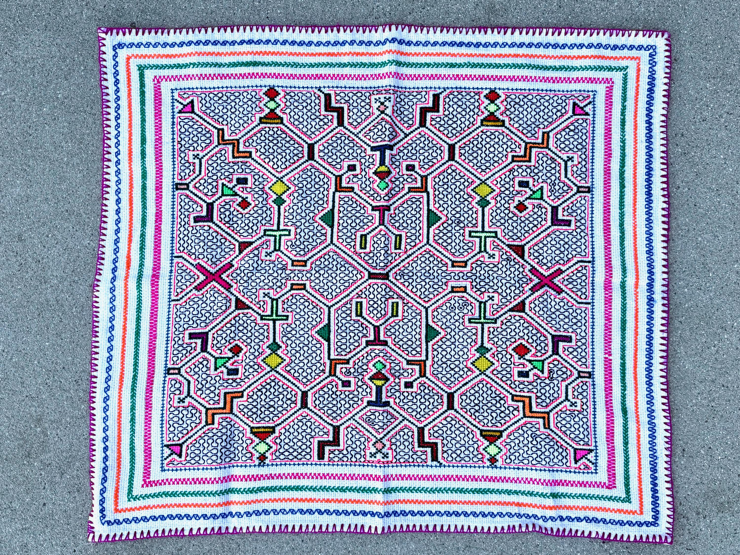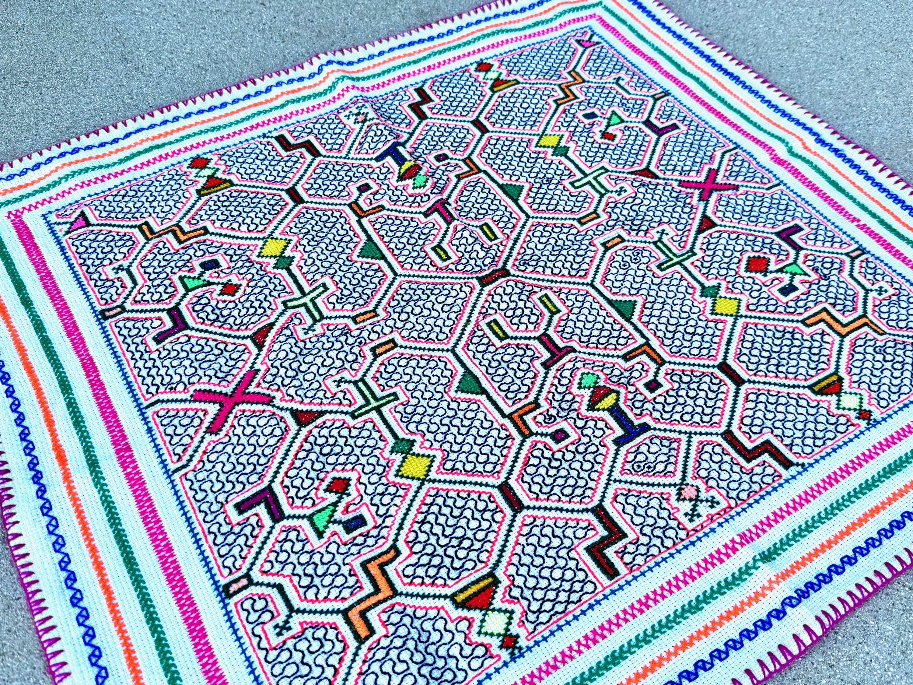 Well-executed embroidery on this magnificent manta cloth with beautiful patterns throughout. This is a very traditional, quintessential Shipibo design, with gorgeous "kene" designs, interspersed with colorful geometric shapes on a white background.