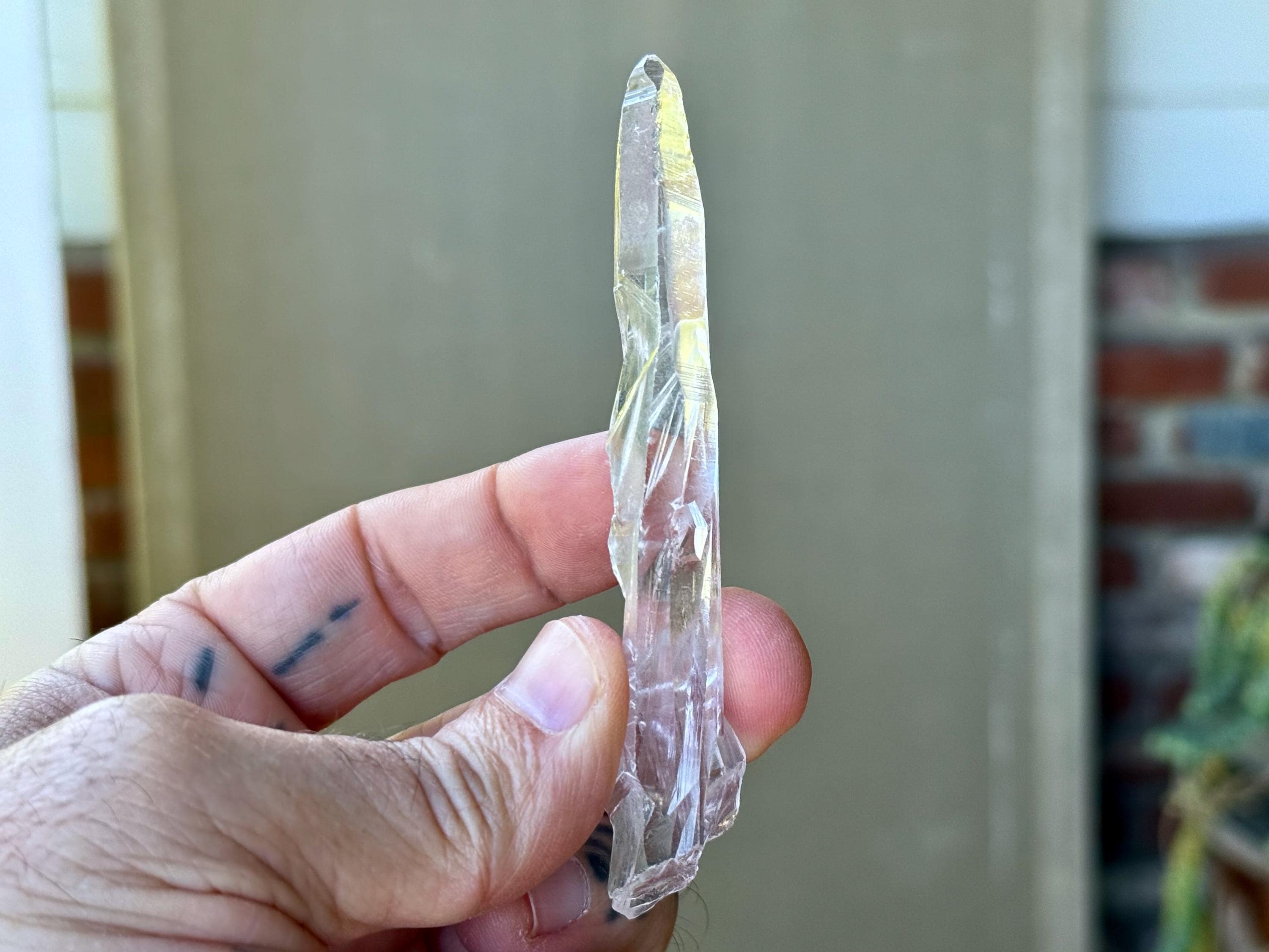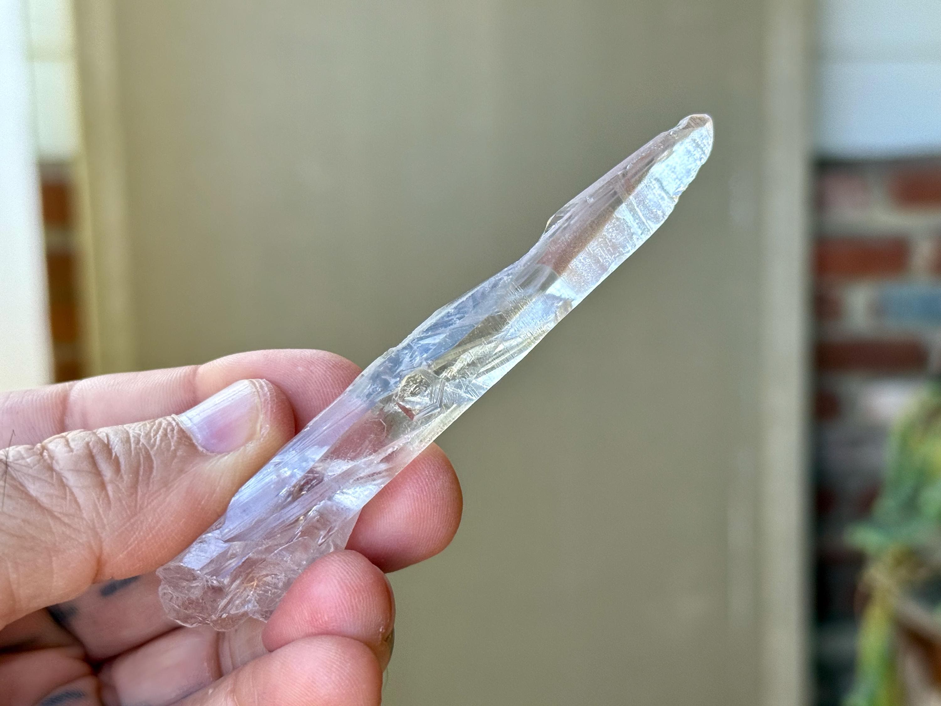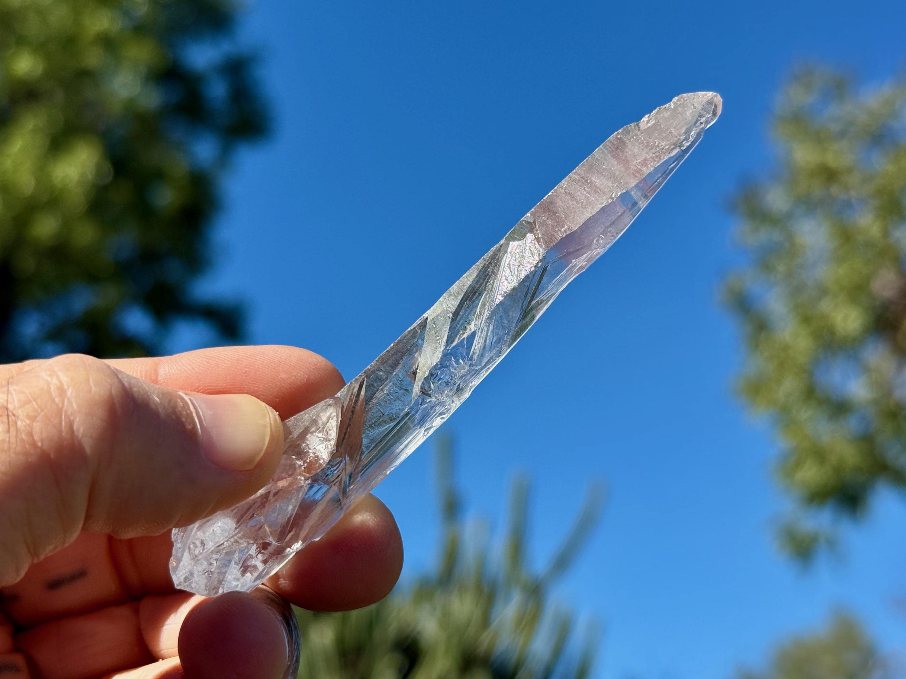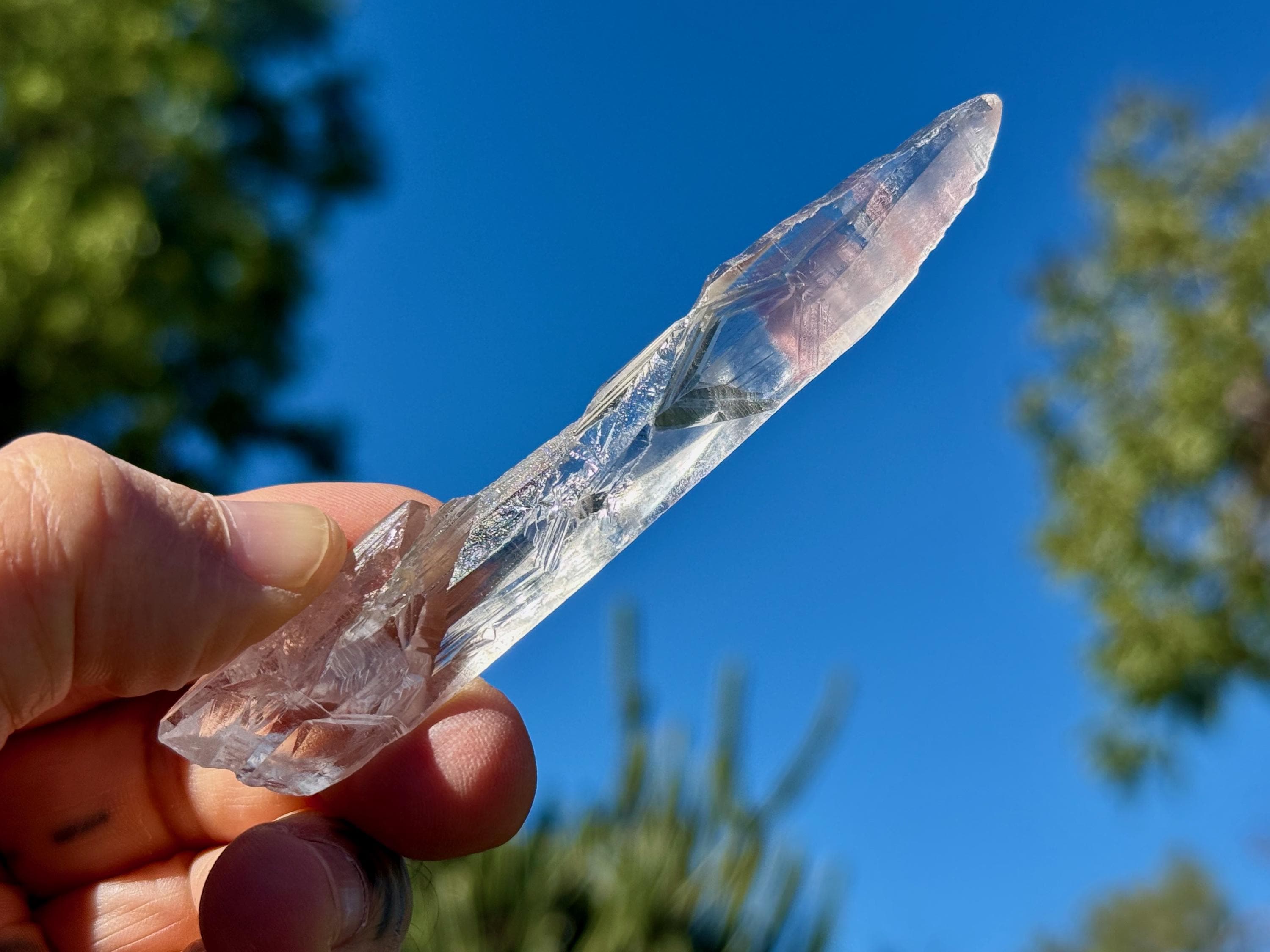 Water clear clarity and brilliant luster to this elongated Lemurian "Root" Quartz with a mild pink Hematite inclusion at the top. "Root" Quartz is the name given to crystals that form at the base of a larger crystal cluster, and therefore display an array of contact impressions where other crystals in the same cluster may have grown next to it.