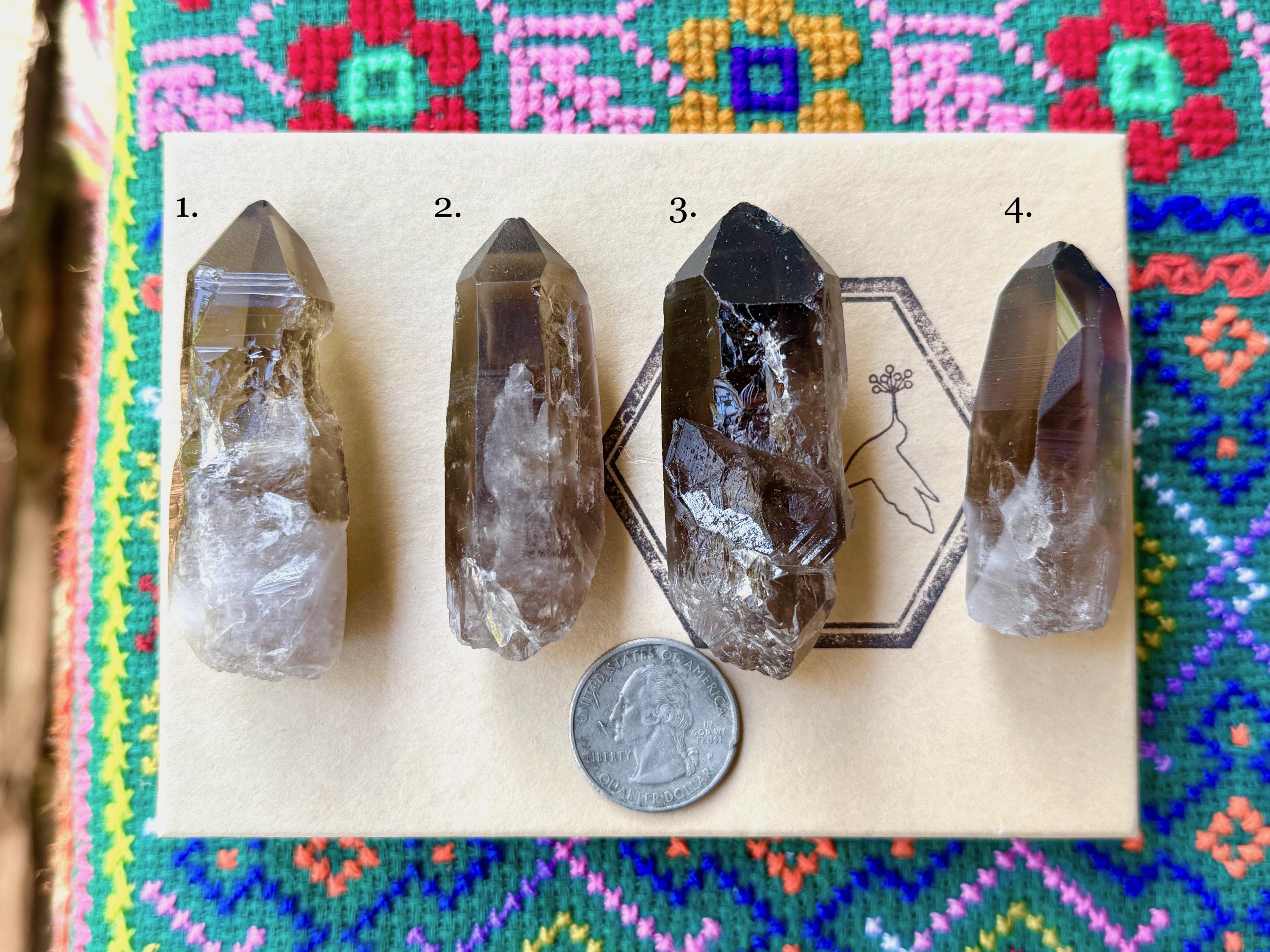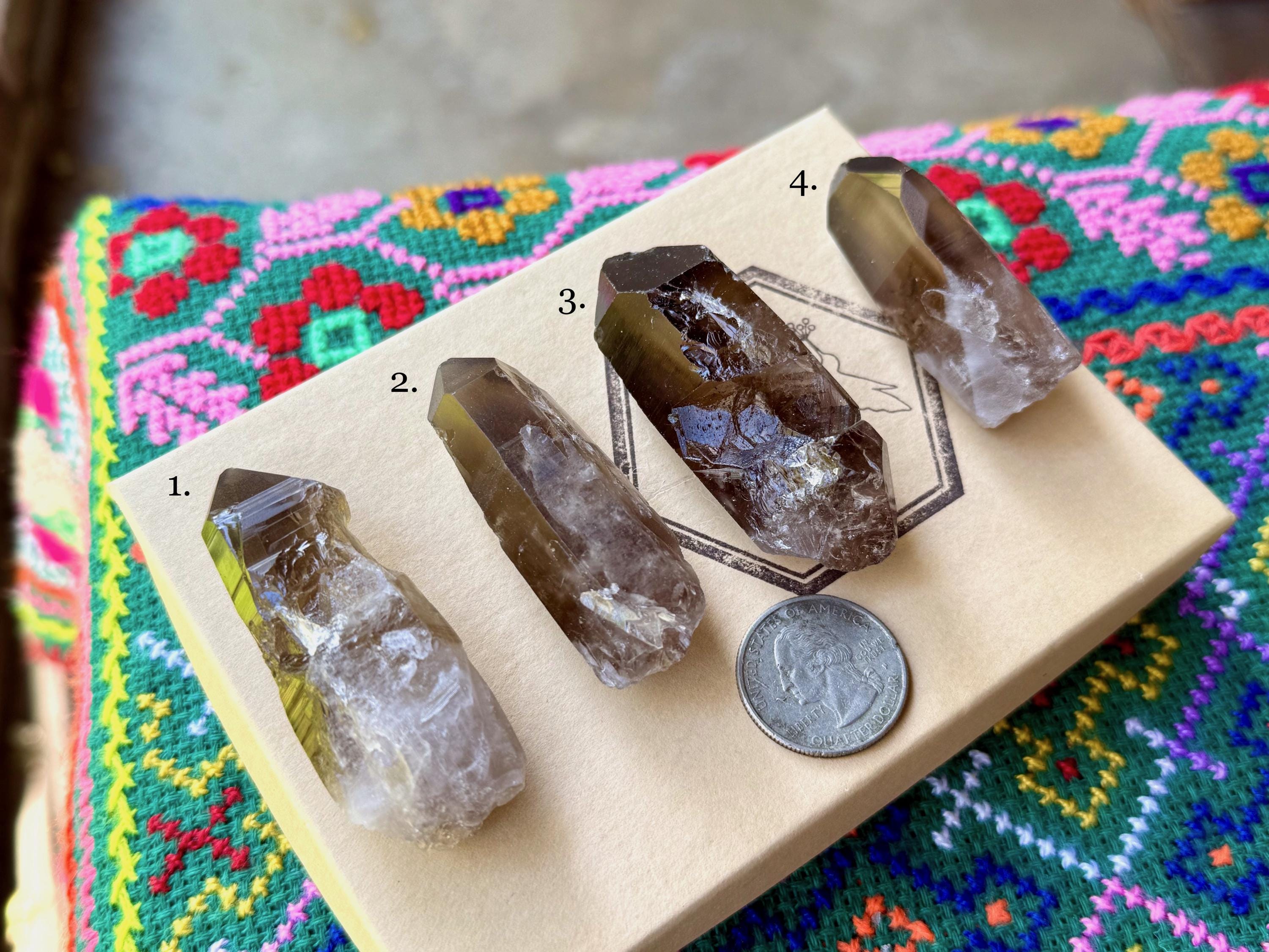 These crystals are similar in size, with some slightly larger or smaller. You can see the Quarter in the photo for size comparison and general measurements below. The terminations are all intact, though some may have minor dings which are indicated in the photo text.
