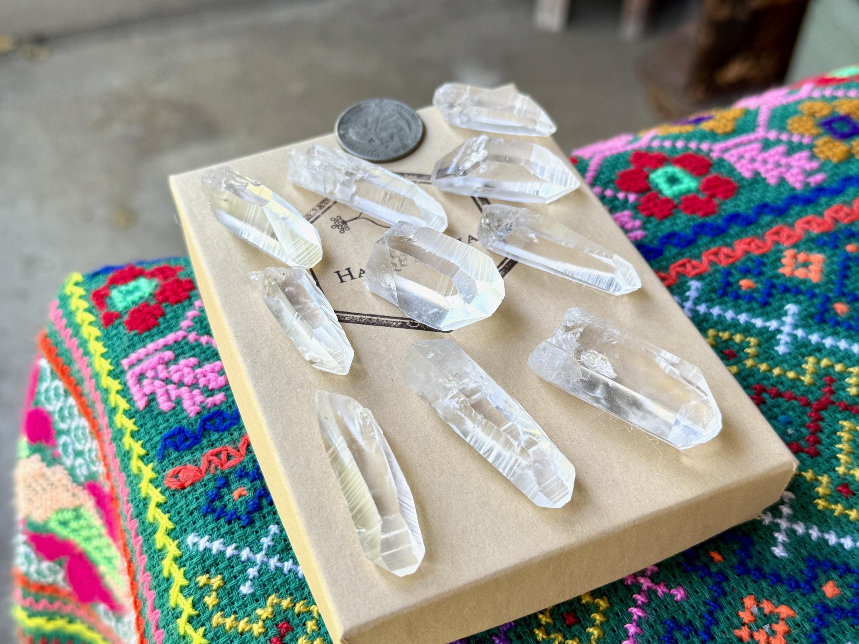 These are mostly smaller to medium sized points included here (see measurements below and Quarter in photos for size comparison). This is an ideal lot for resellers, jewelry makers, crystal gridders, etc.