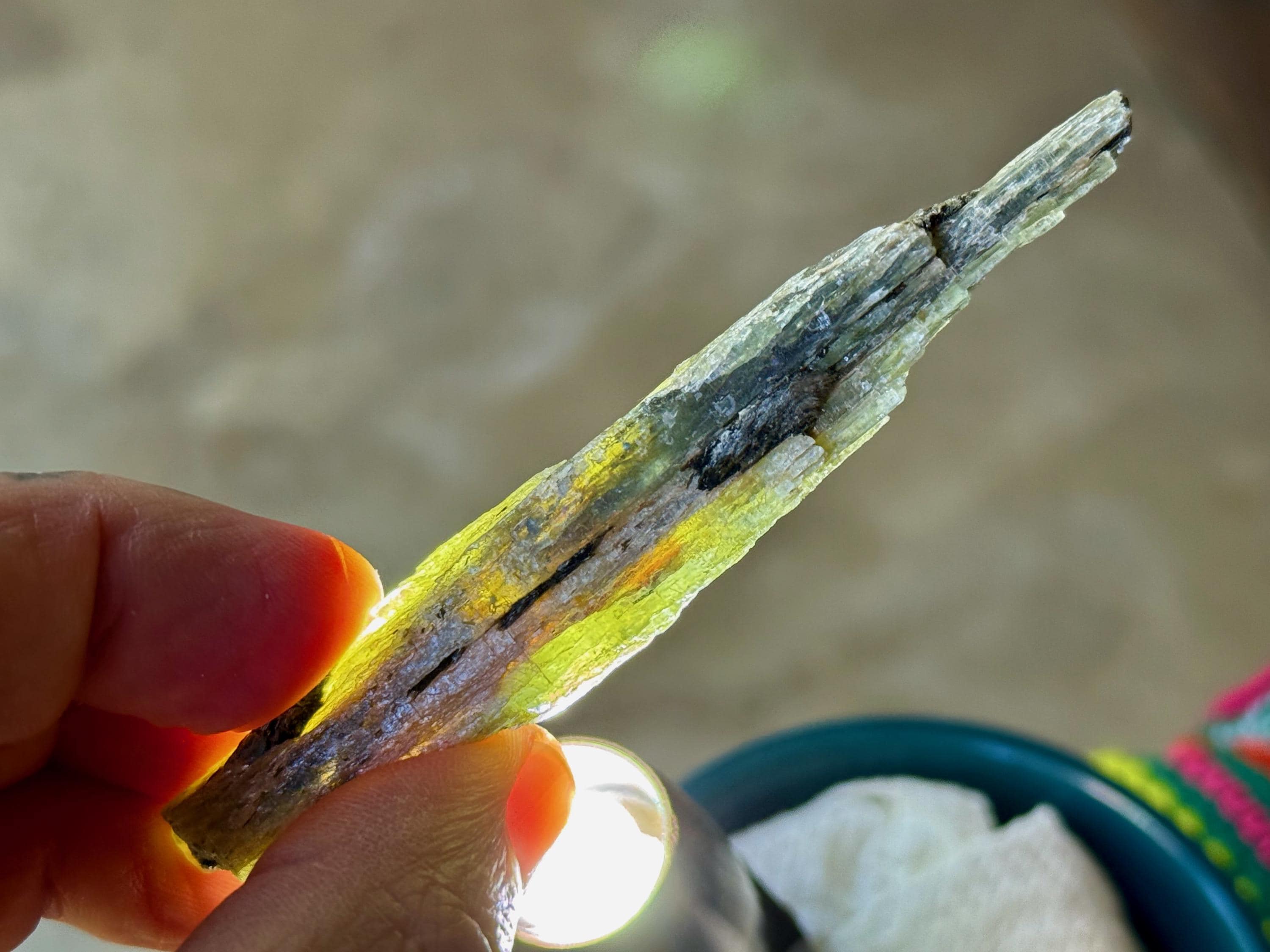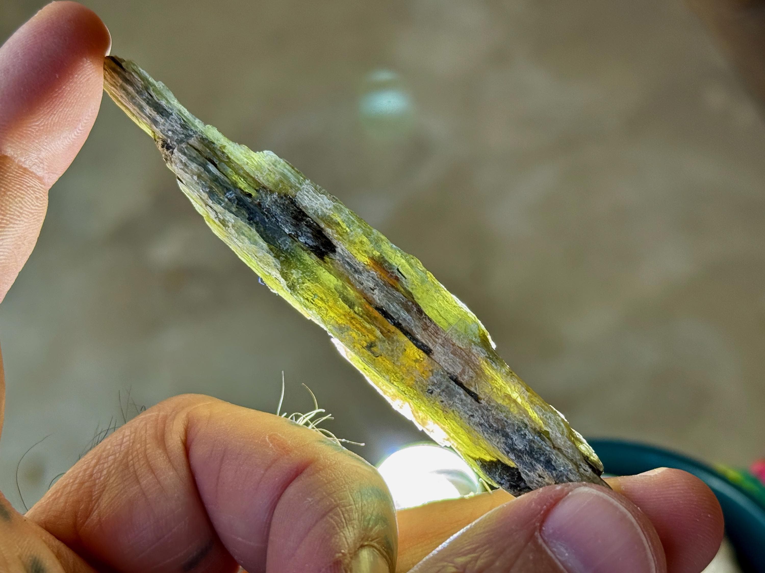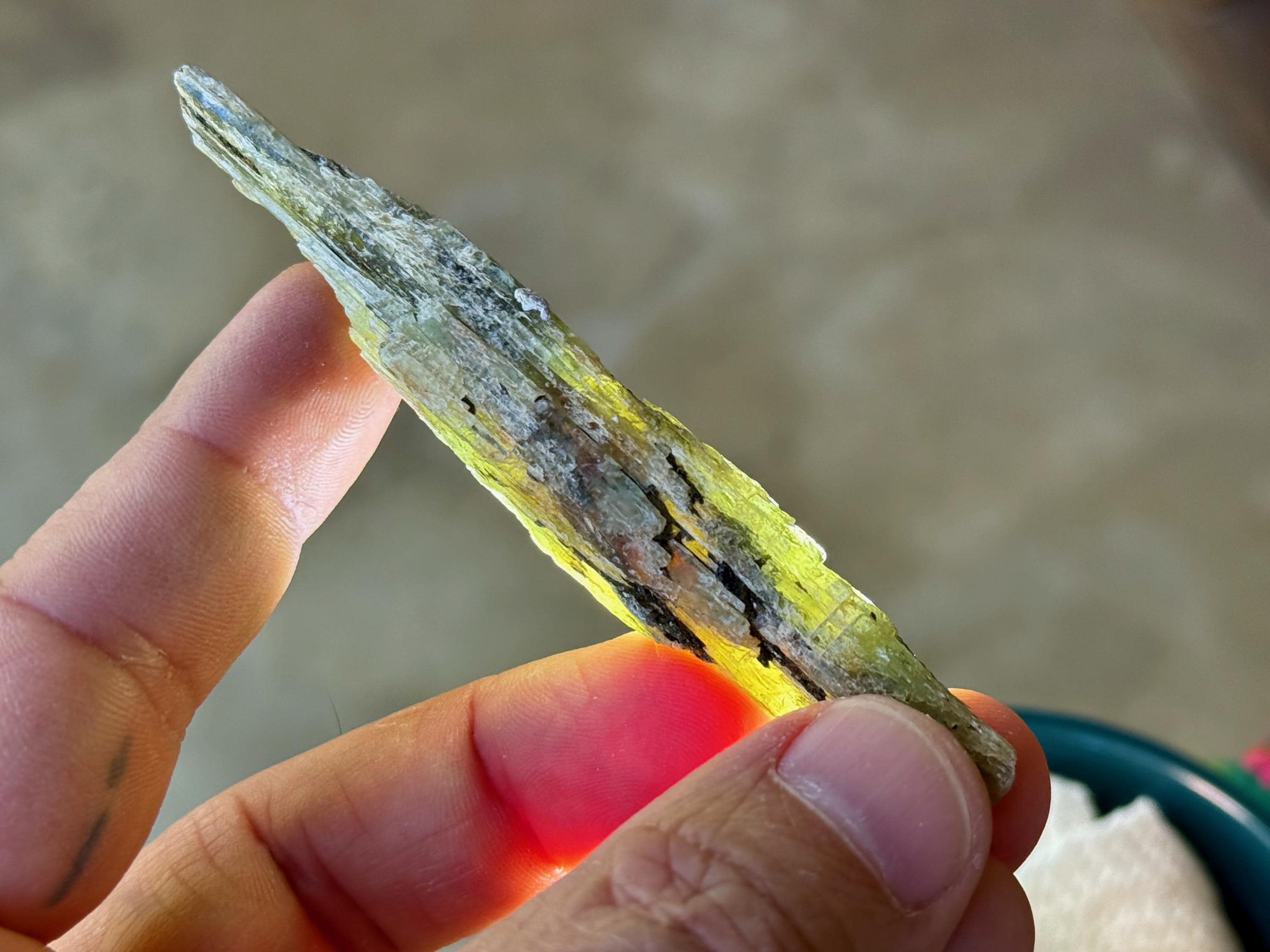 This is a really nice Green Kyanite "blade" with metallic green hues and some silvery black inclusions as well. When backlit, this piece has some nice translucency in areas (see Photos 2-5). One of the last pieces we have from this find!