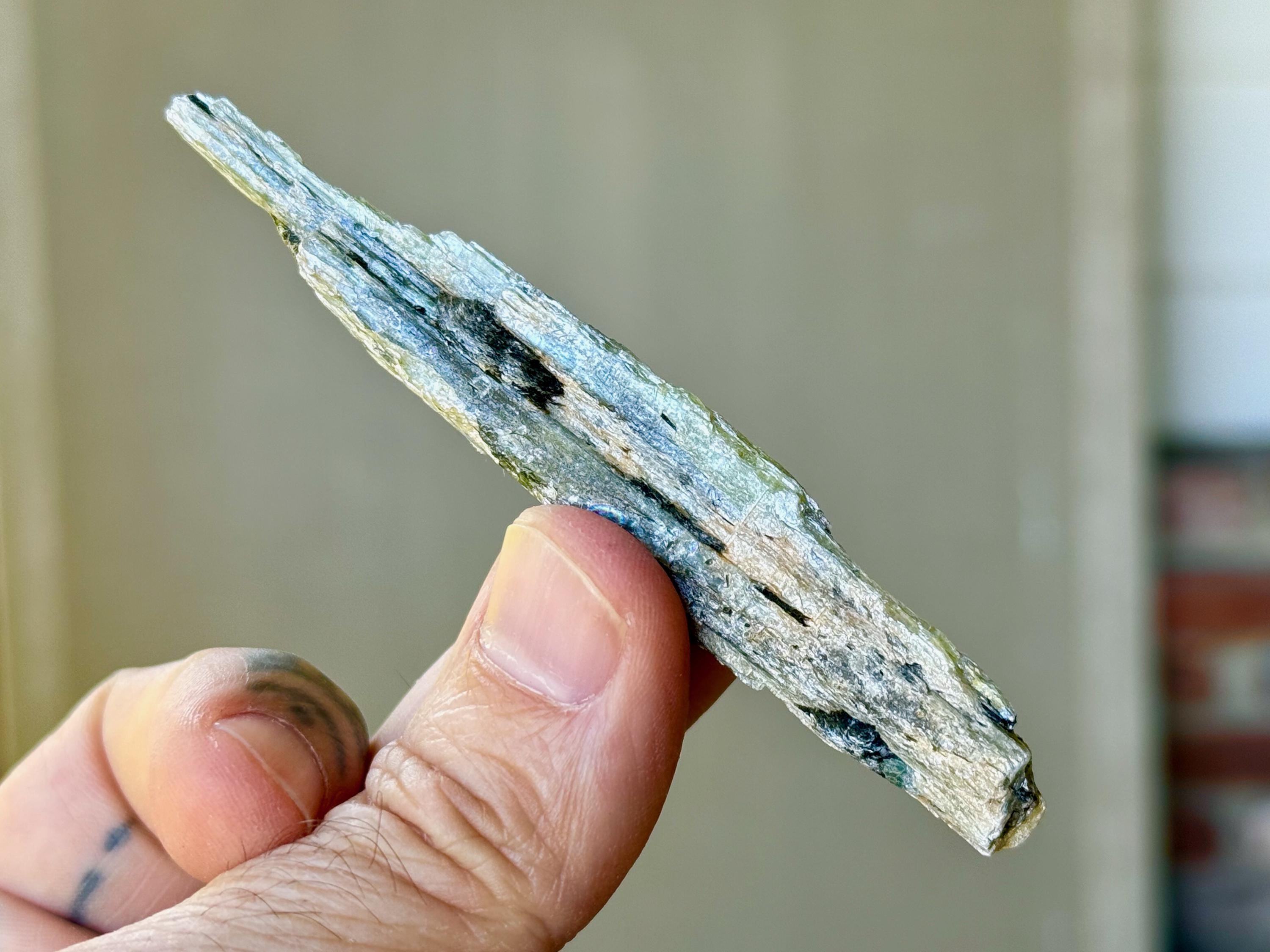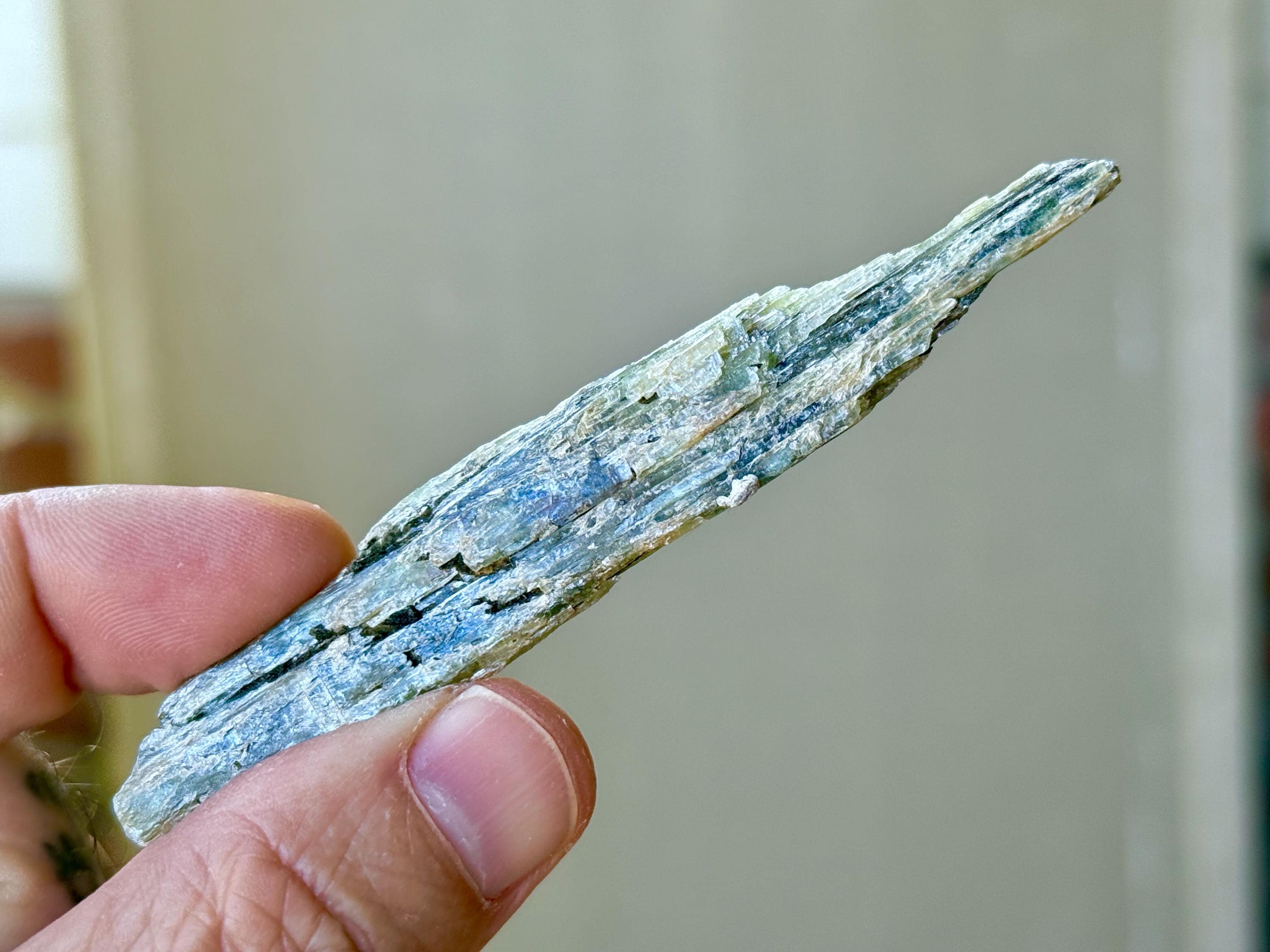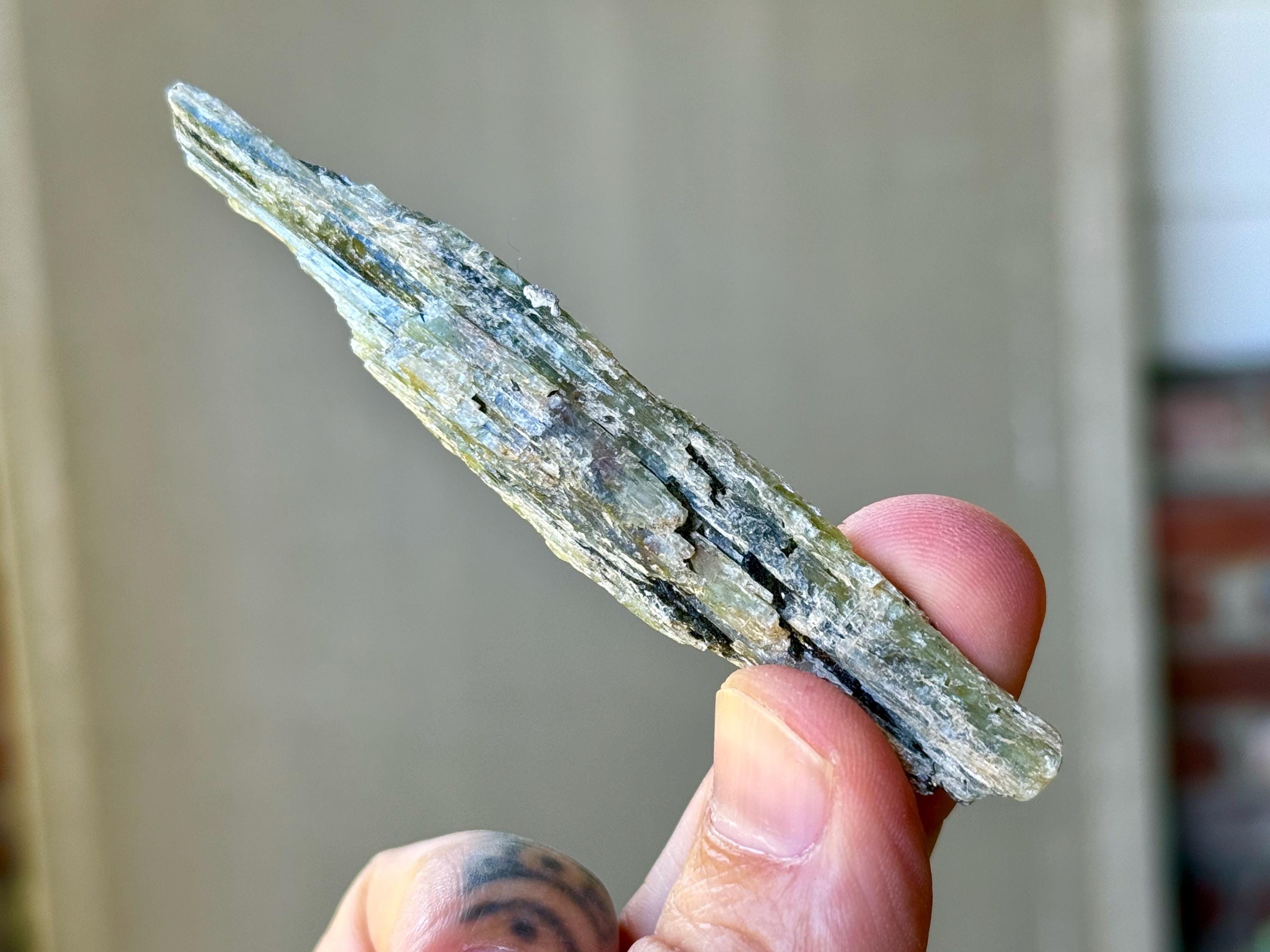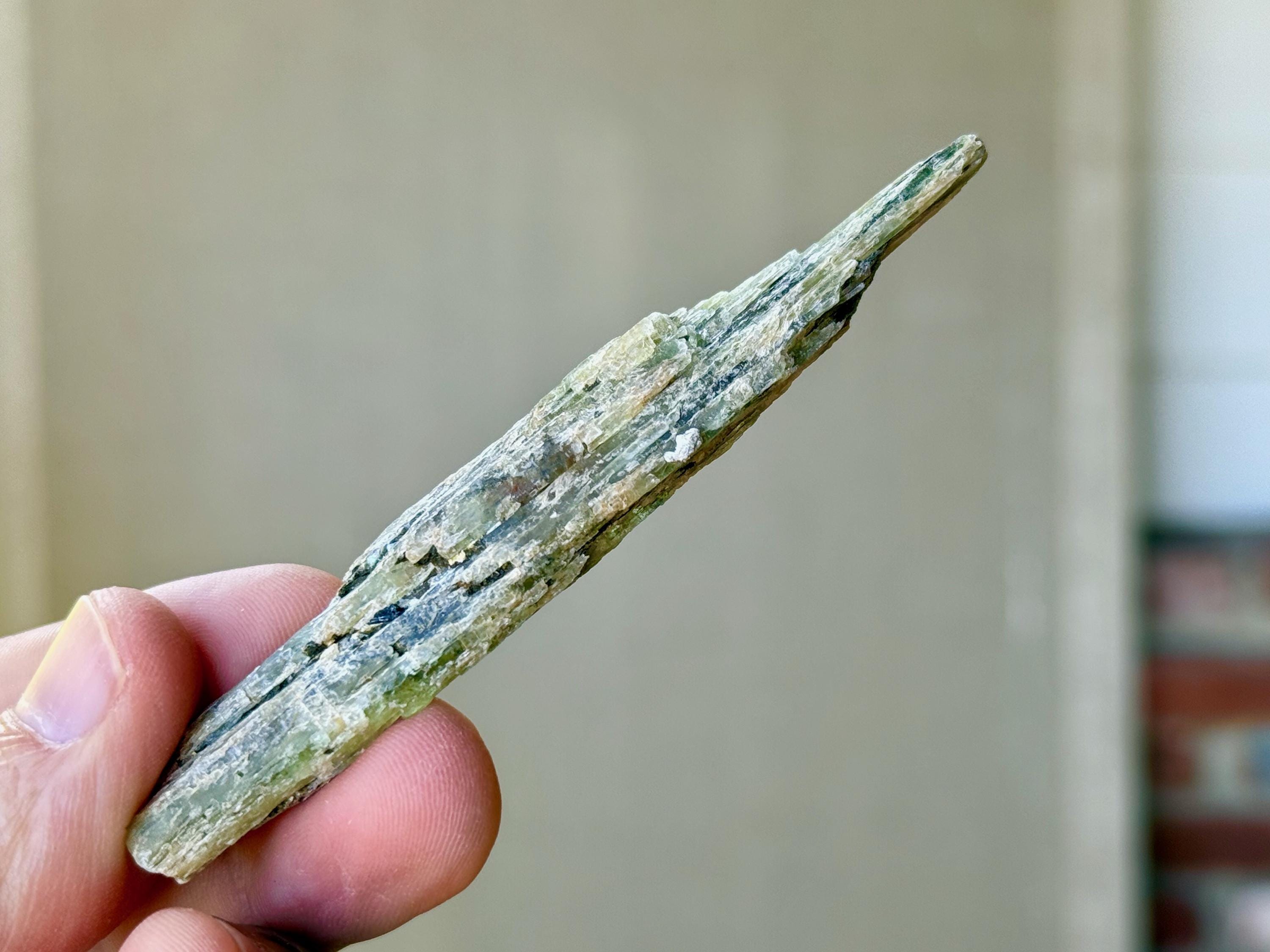 This natural Green Kyanite crystal comes from an old find in Minas Gerais, Brazil. Green Kyanite is one of our favorite crystals for balancing and aligning the Heart Chakra, using to commune with Nature Spirits and channeling Earth Energy, as well as to facilitate lucid dreaming.