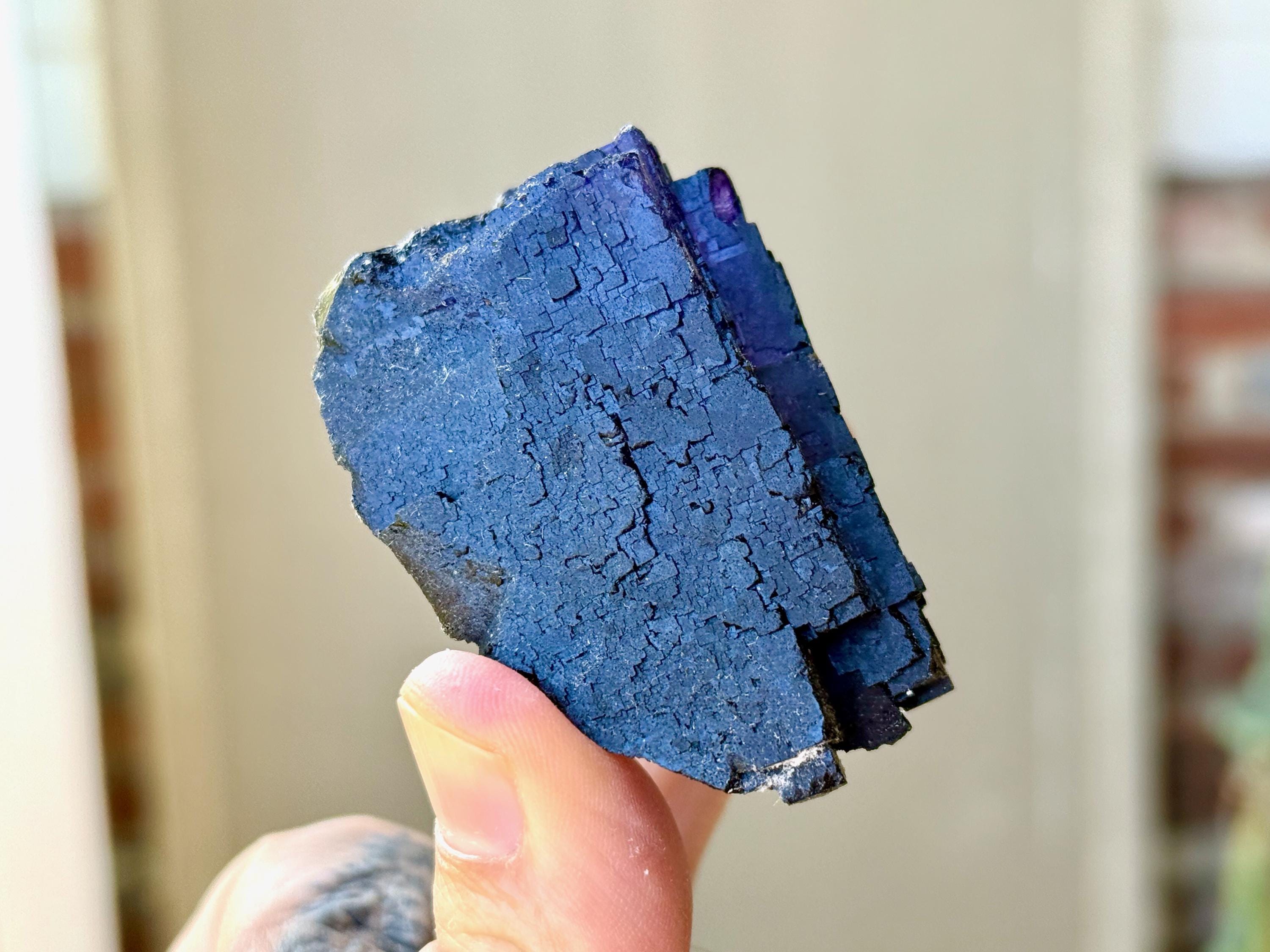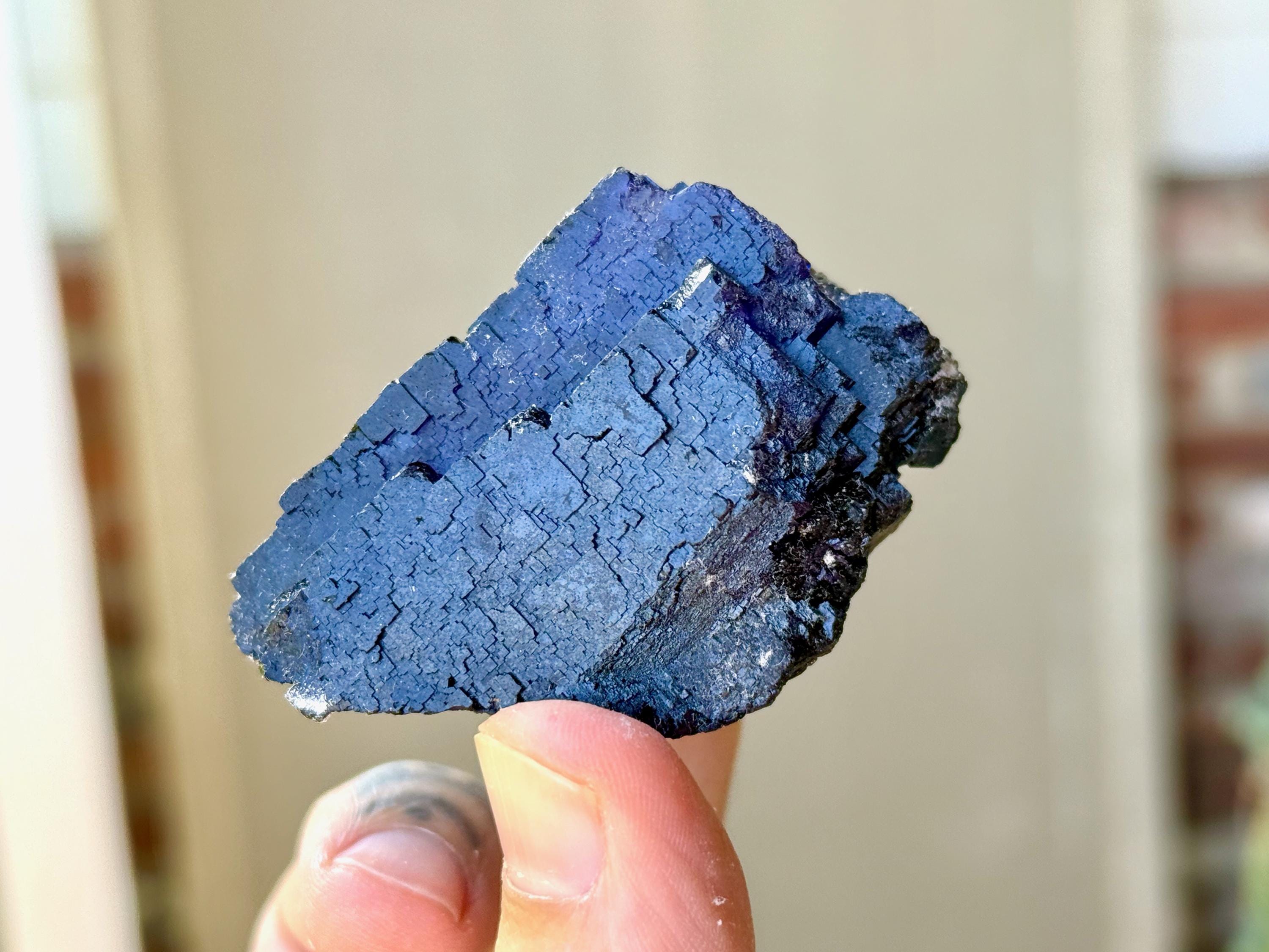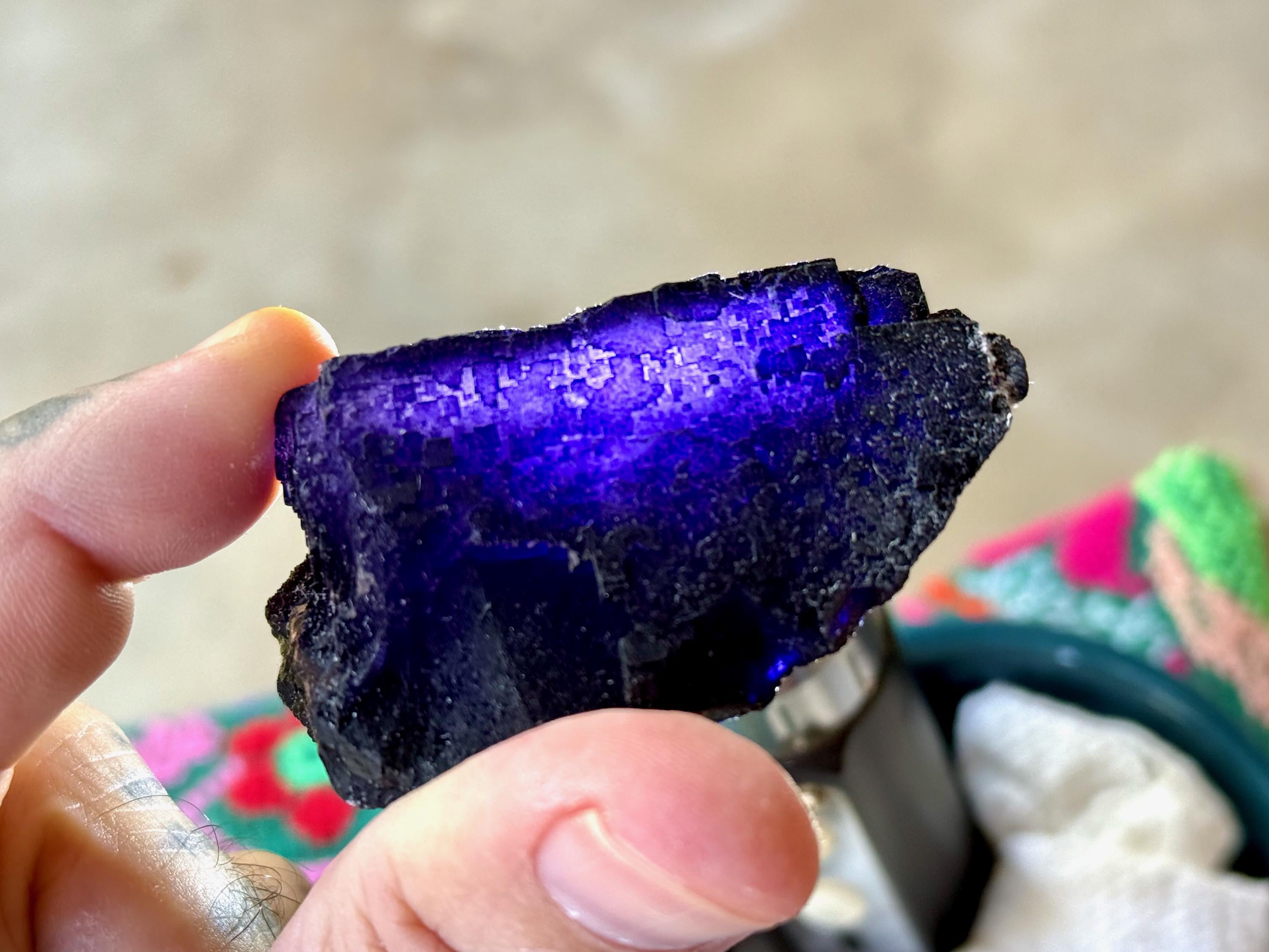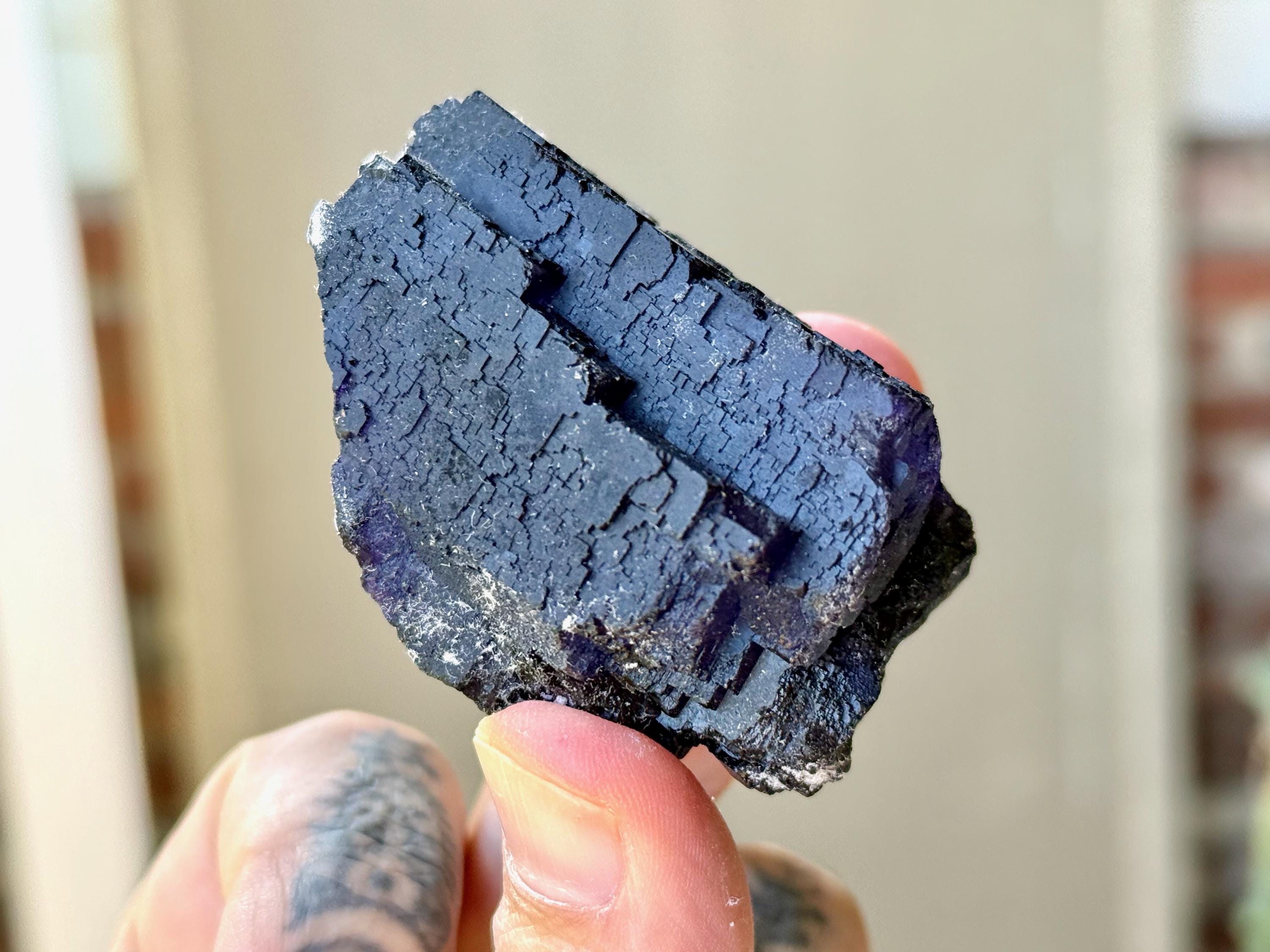 Perhaps our favorite piece from this old collection, this dark and mysterious Purple Fluorite displays a marvelous cubic formation that looks akin to some kind of ancient microchip! In natural light, it appears almost black with just a dark purplish tinge. However, when backlit we see the true colors of royal blue and deep purple come to life (Photos 1, 3-5).