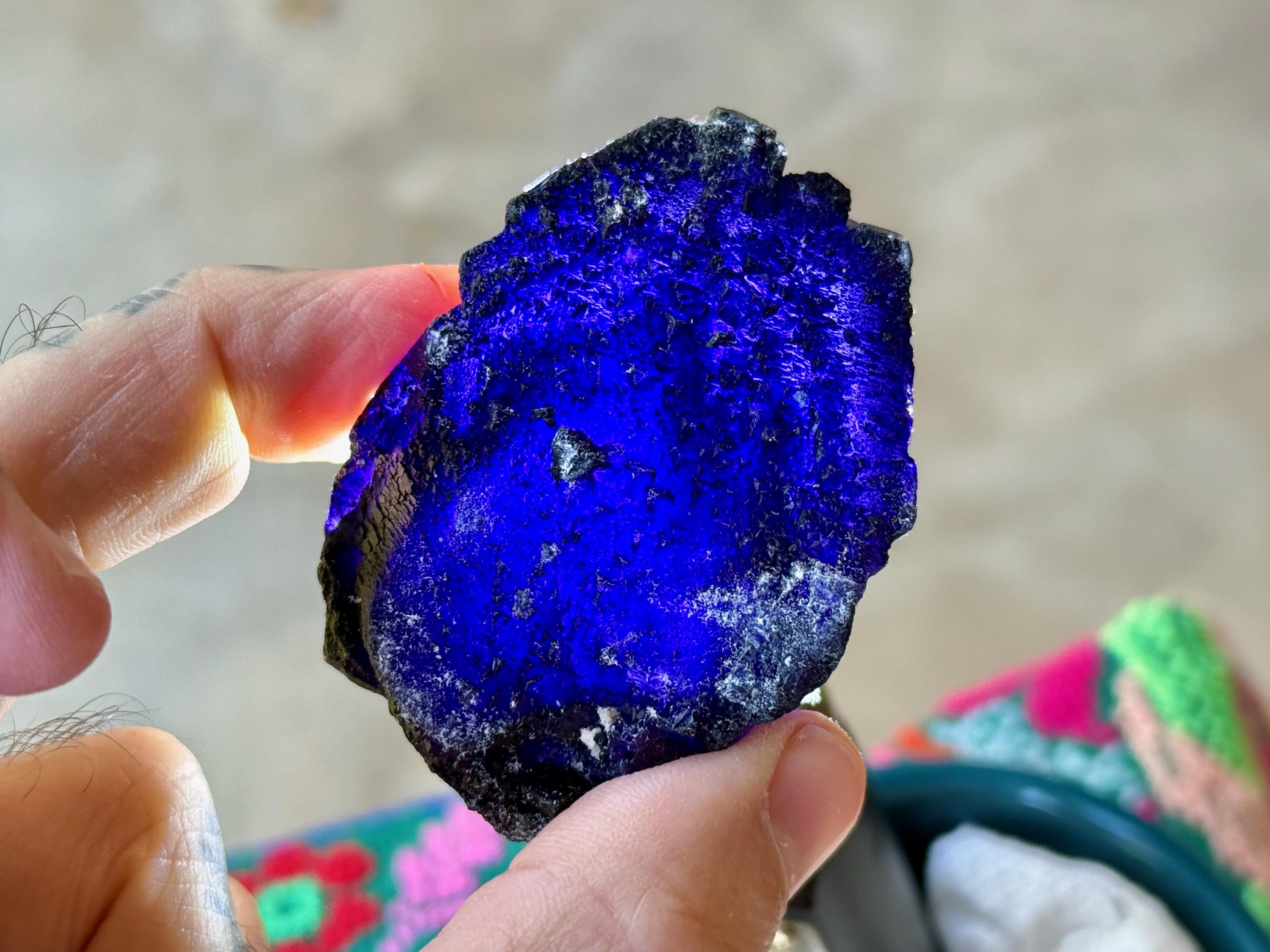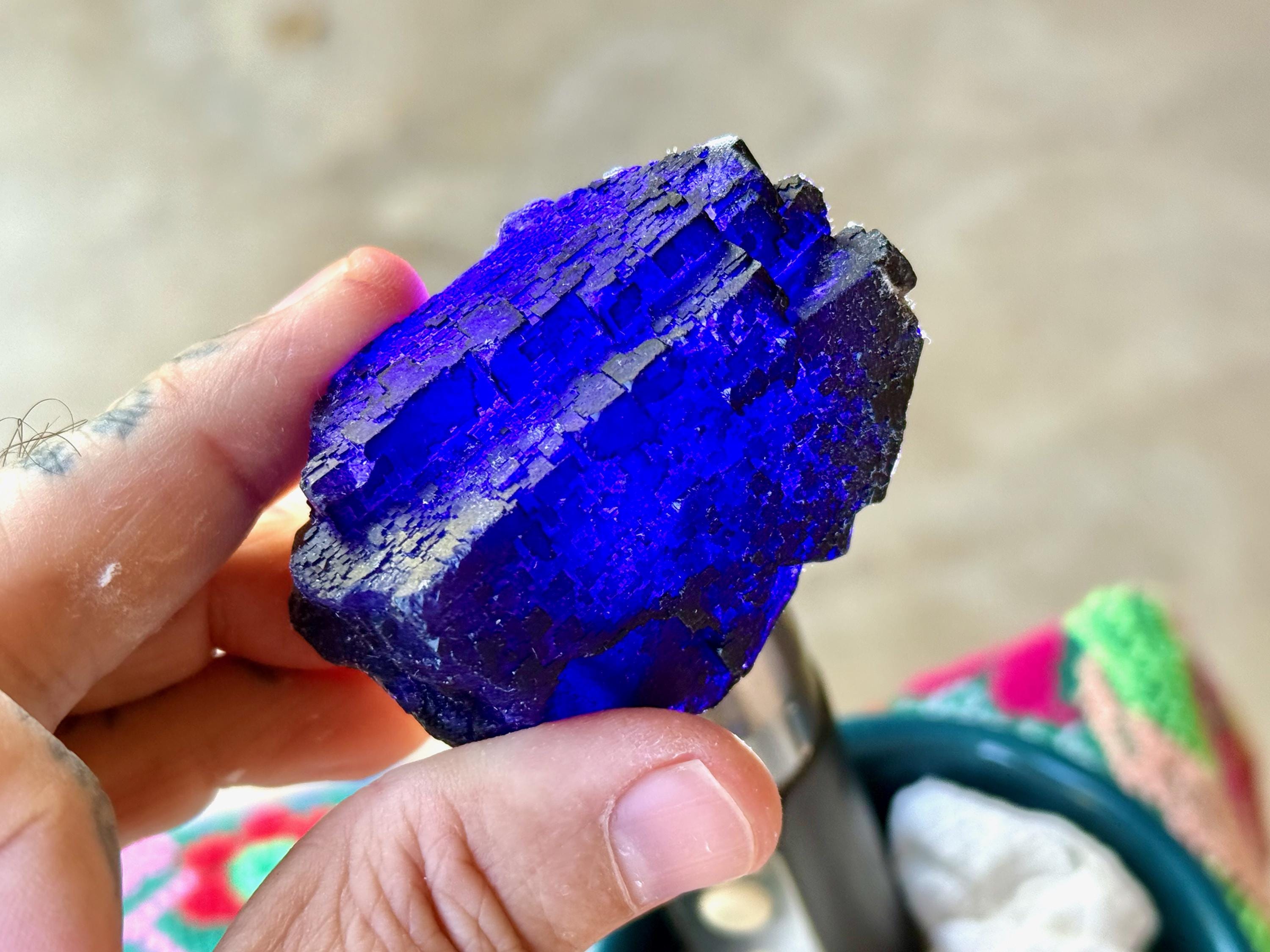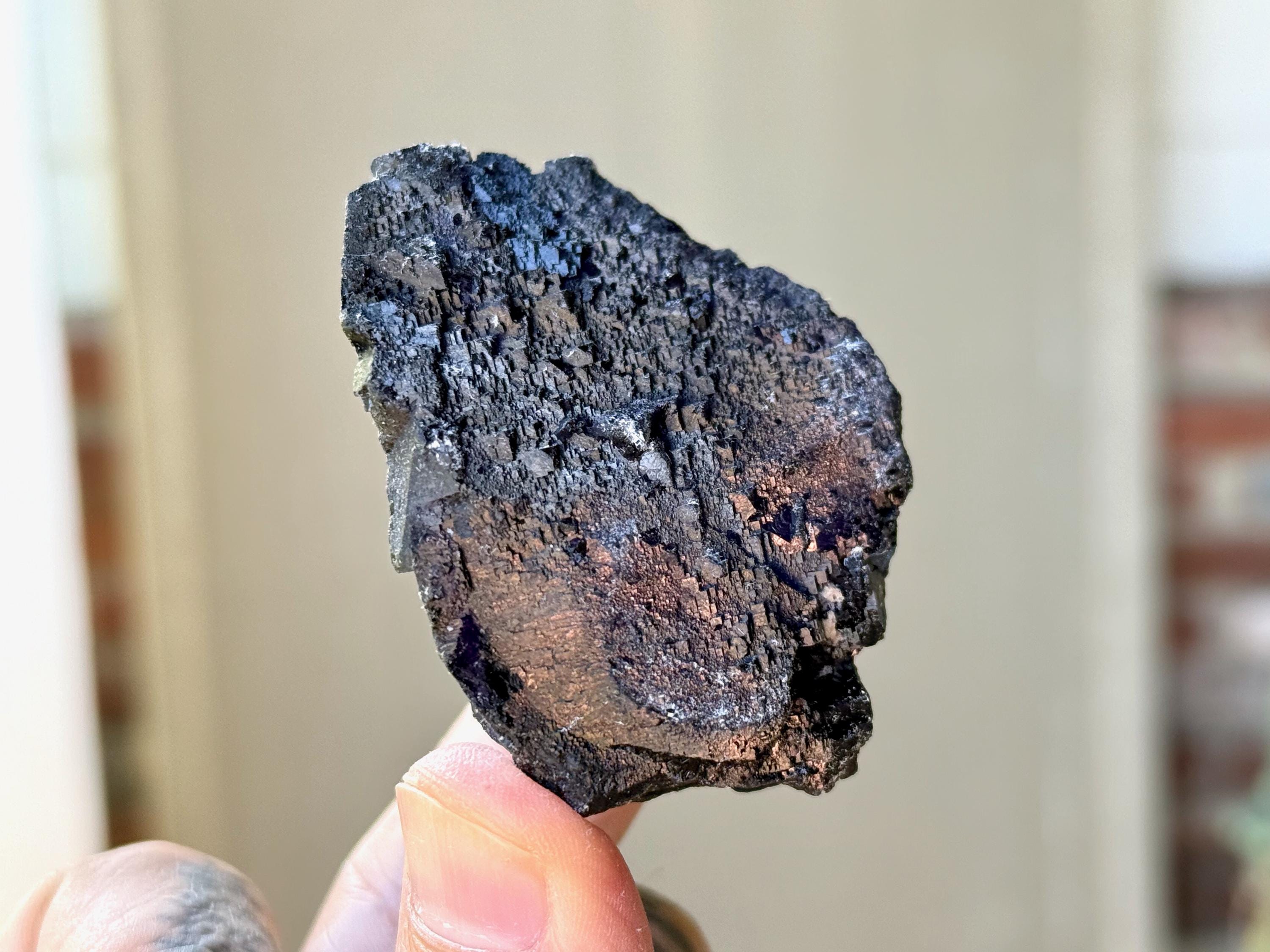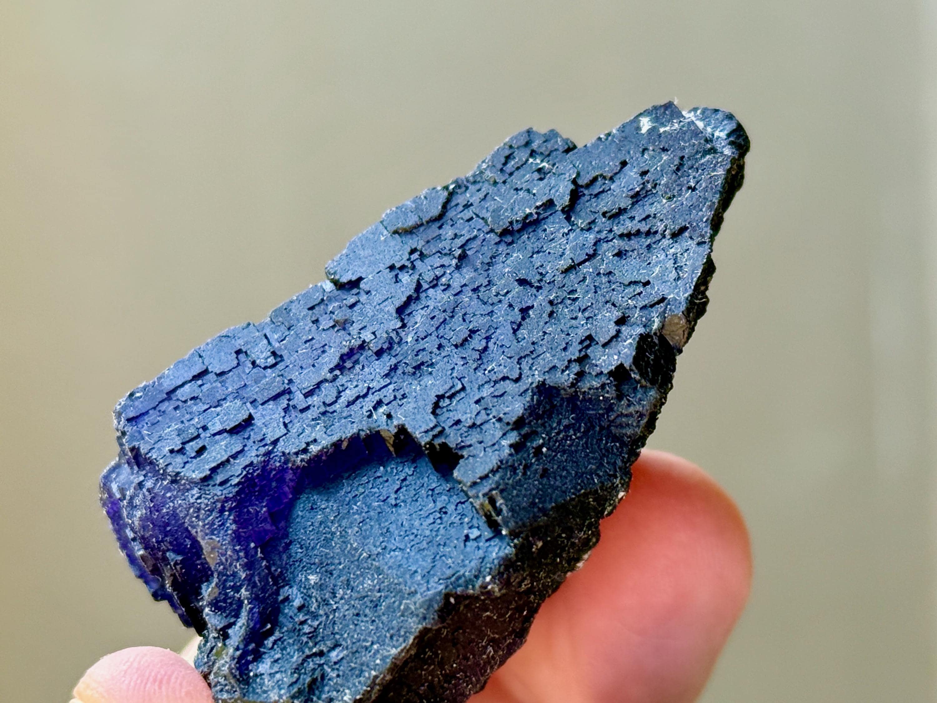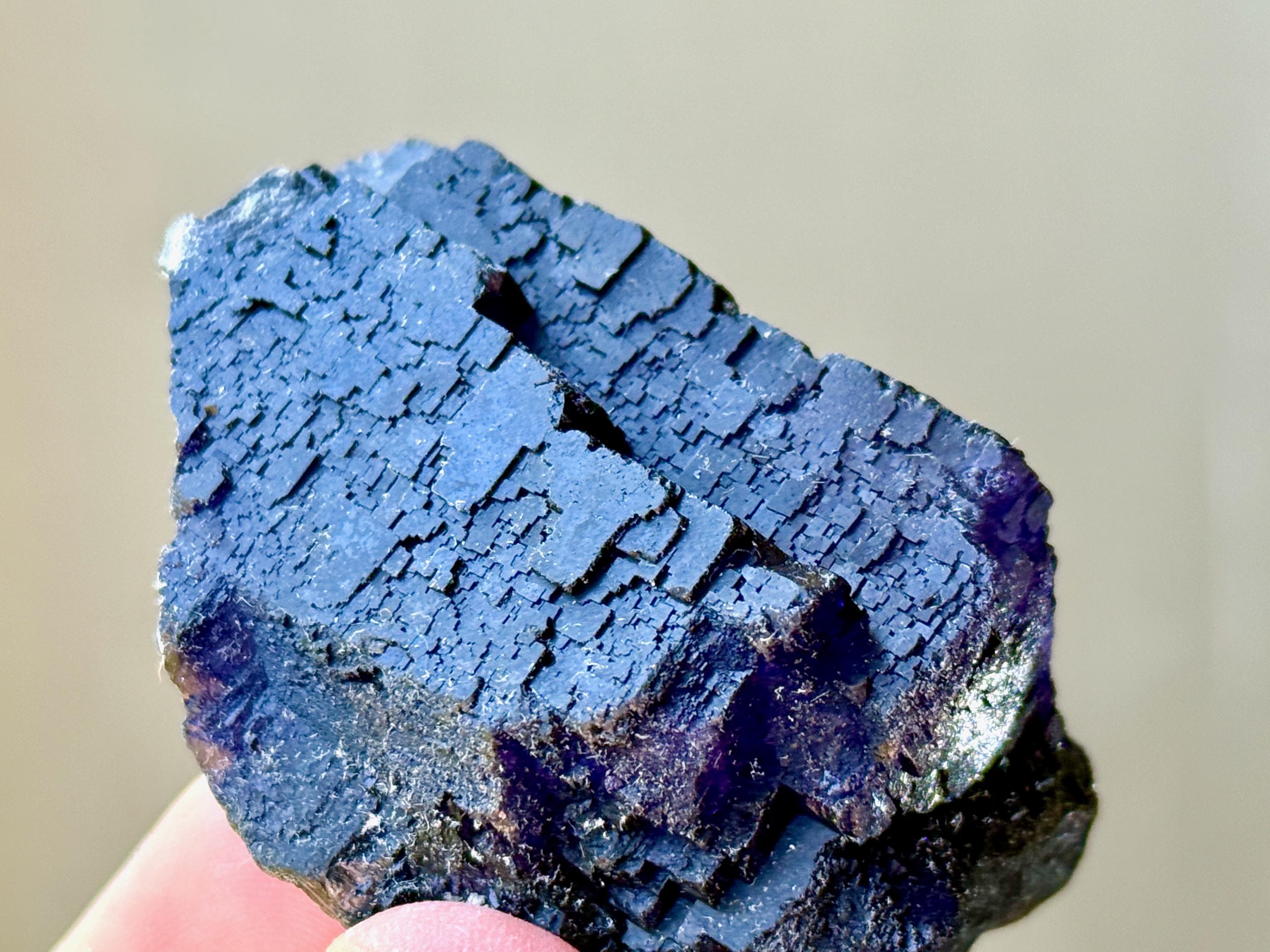 Perhaps our favorite piece from this old collection, this dark and mysterious Purple Fluorite displays a marvelous cubic formation that looks akin to some kind of ancient microchip! In natural light, it appears almost black with just a dark purplish tinge. However, when backlit we see the true colors of royal blue and deep purple come to life (Photos 1, 3-5).