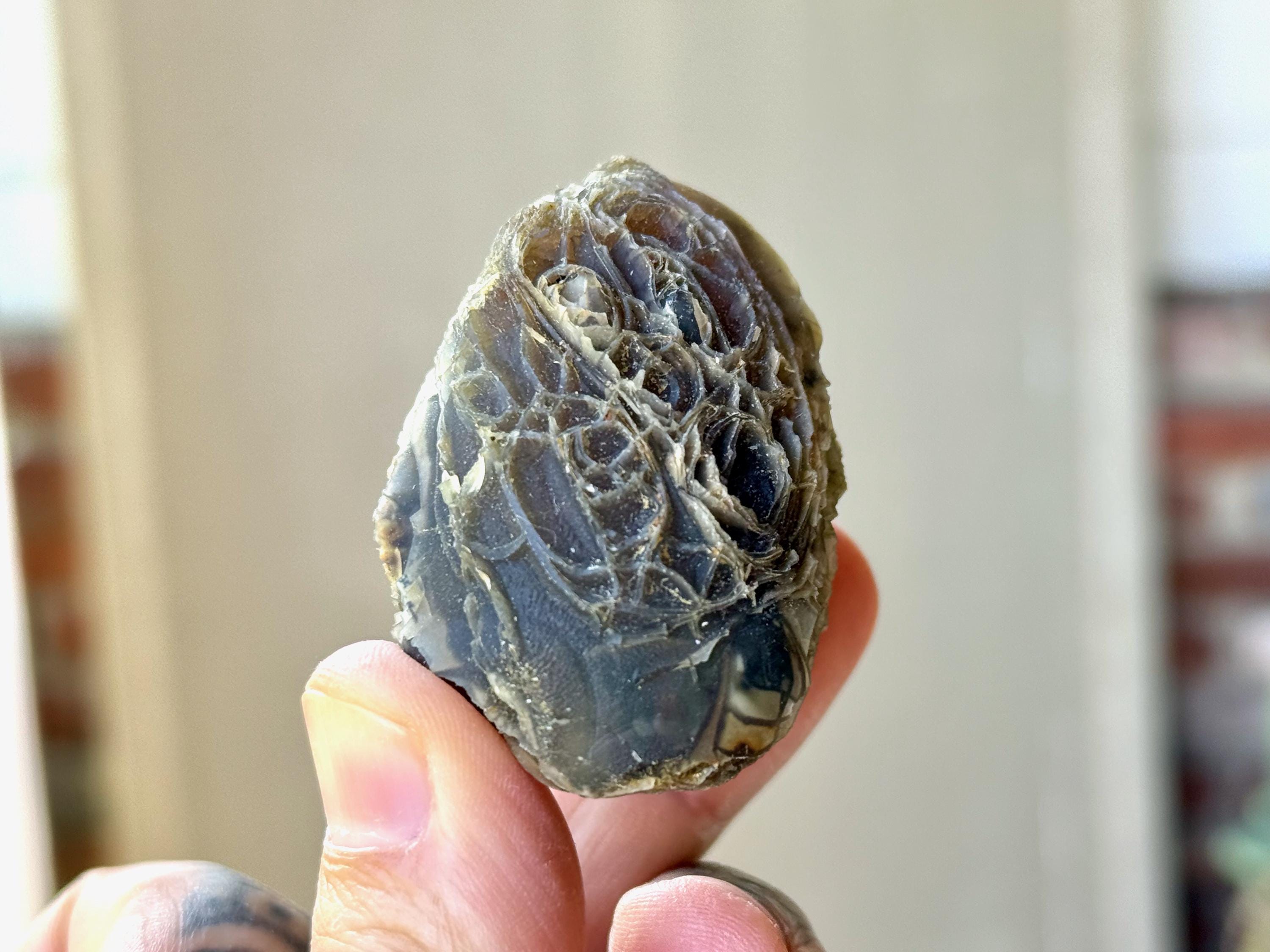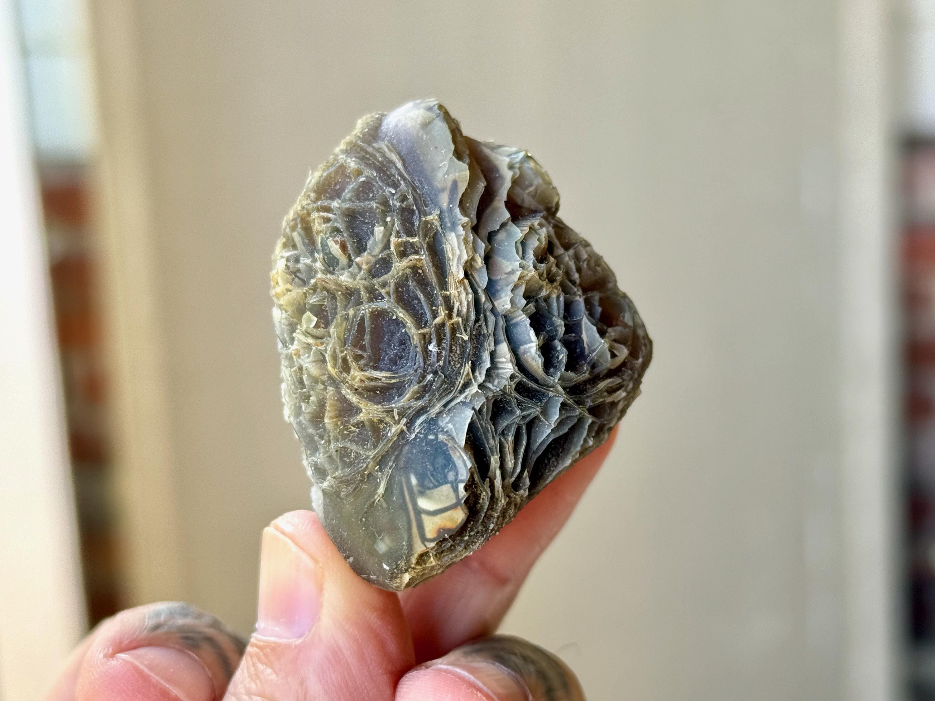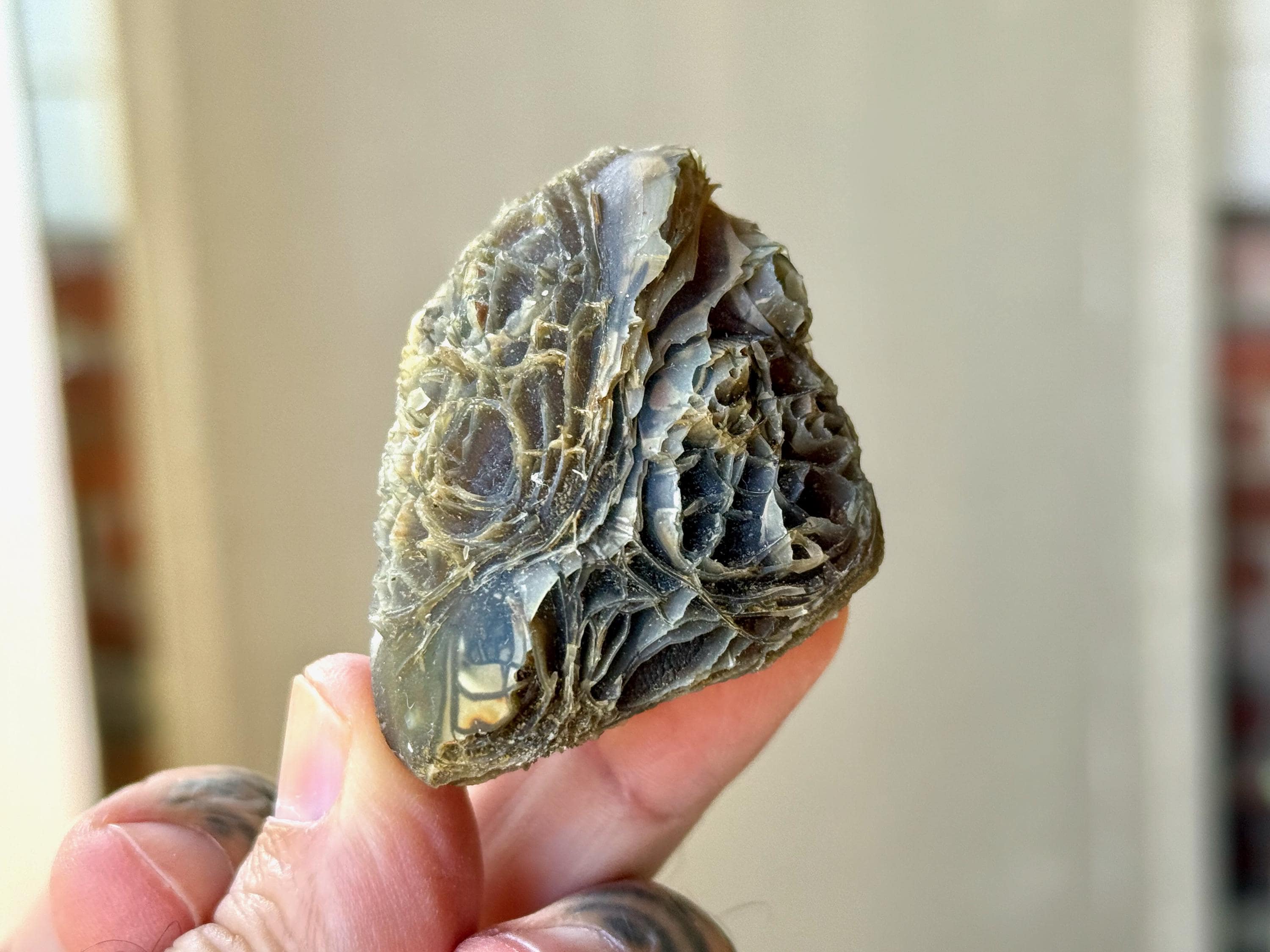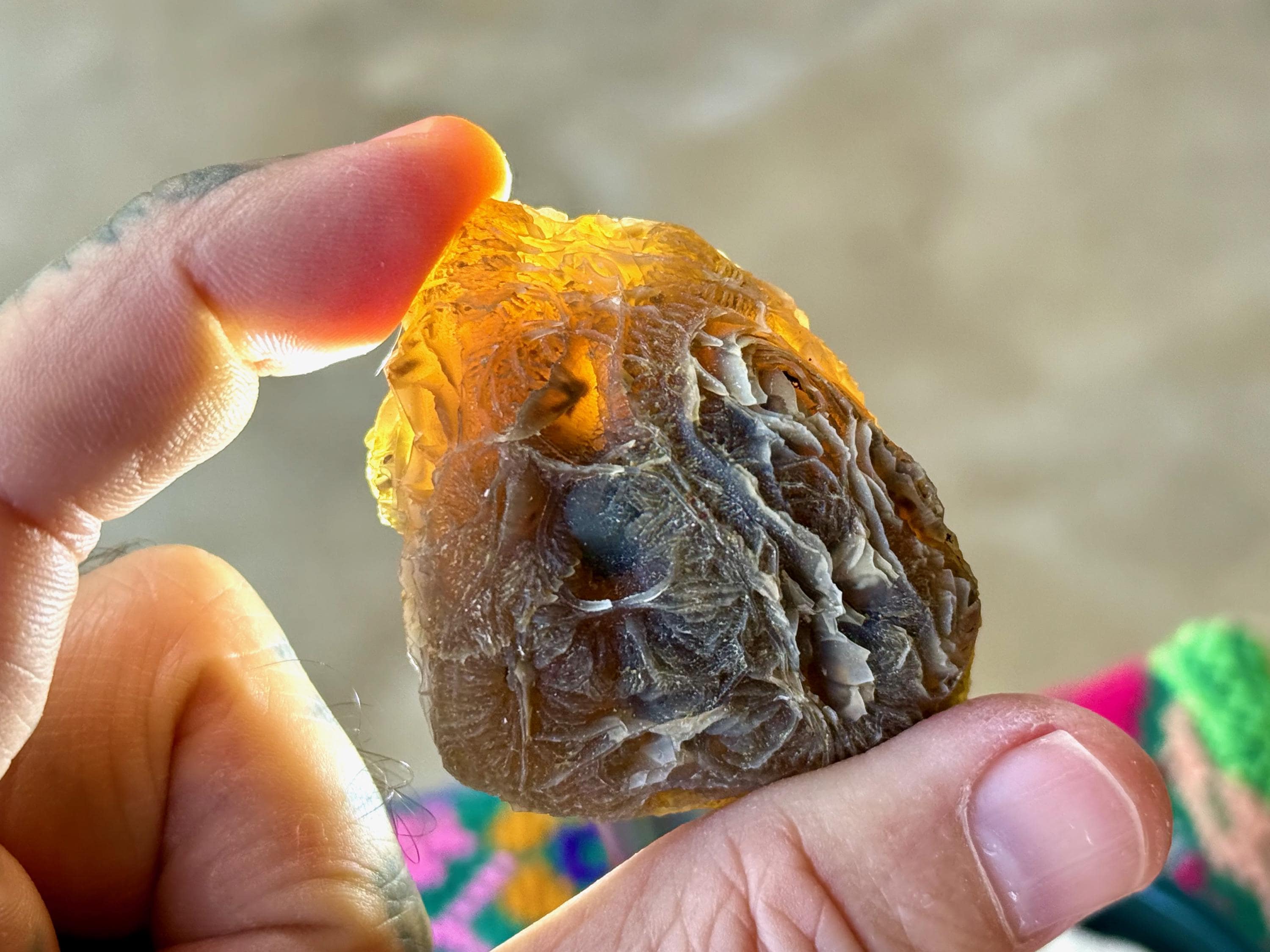 Layers upon layers of unique textures to this unusual Black Mountain Gobi Agate! In natural light, this stone has a grayish-black color with intricate patterning throughout. When backlit, this stone lights up brilliantly! (Photos 2-4). Really one of the coolest pieces from this collection.