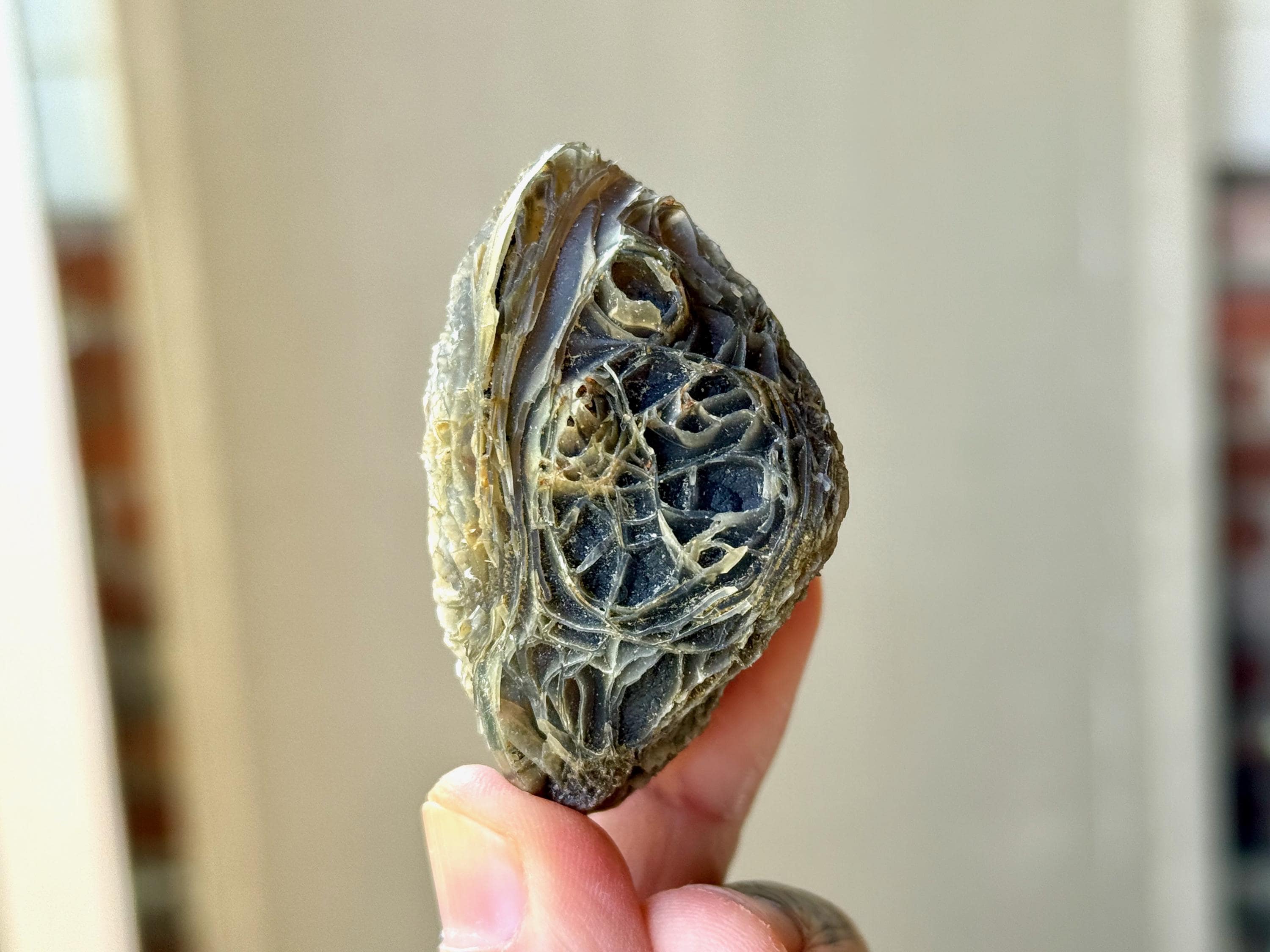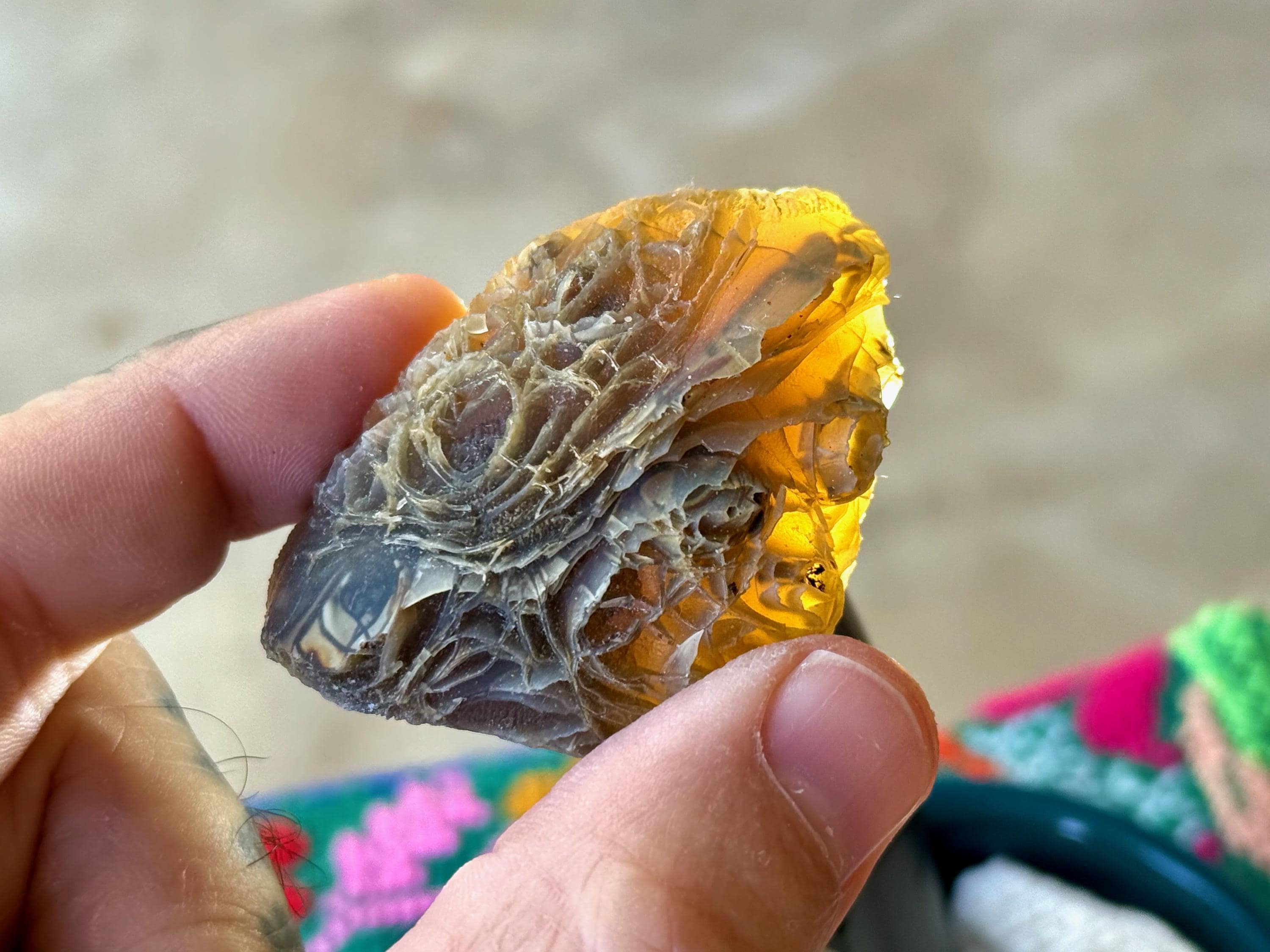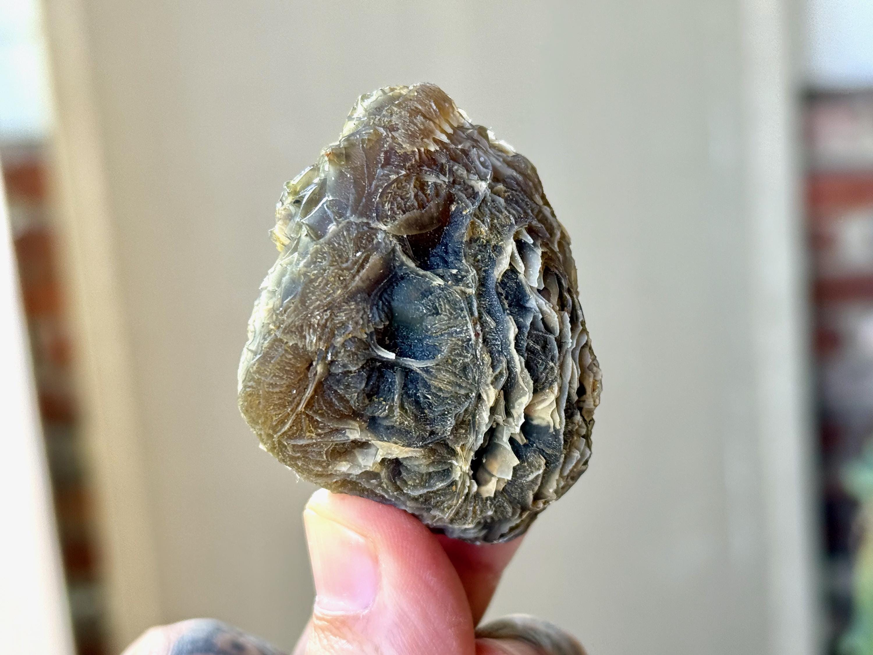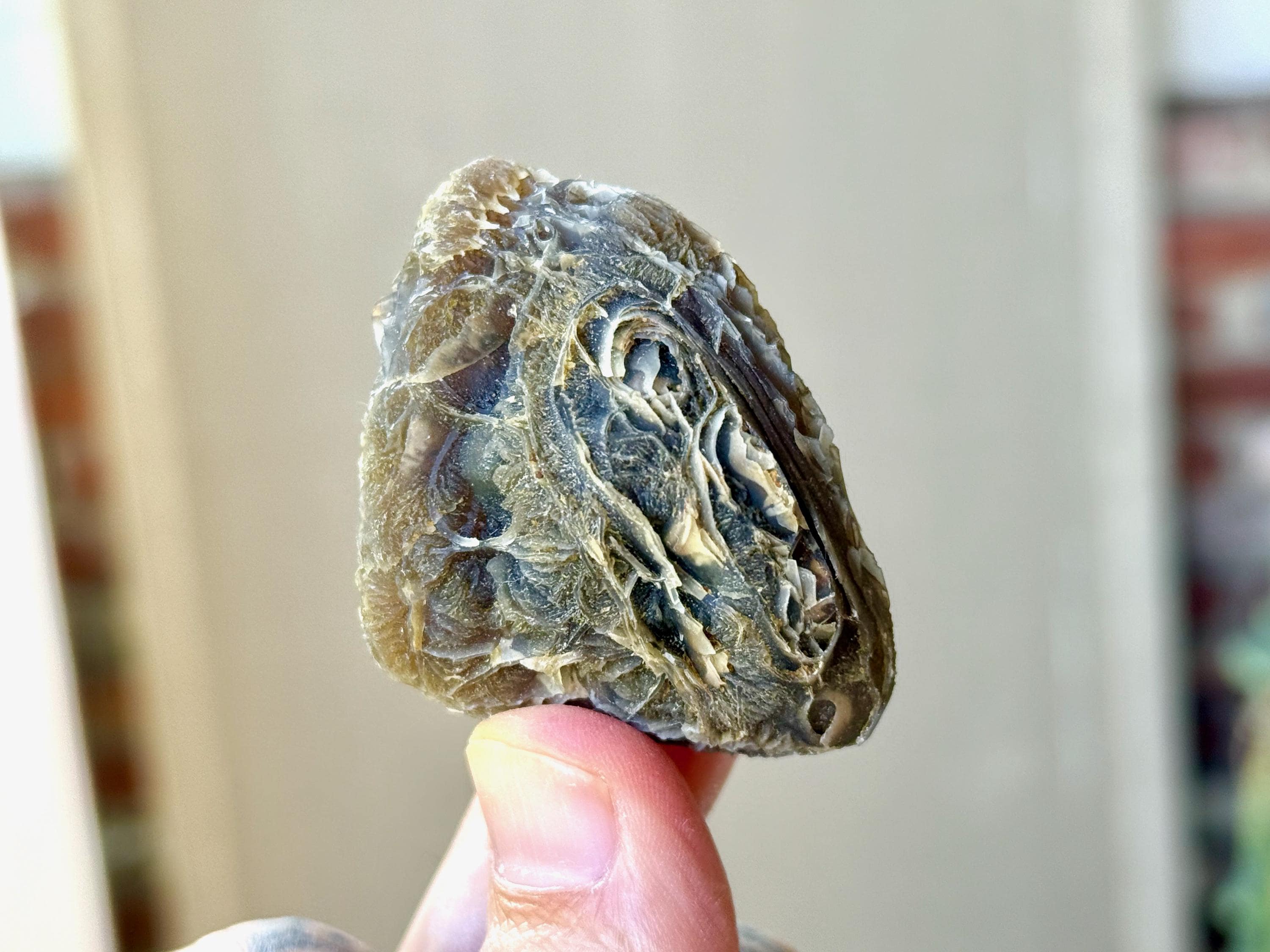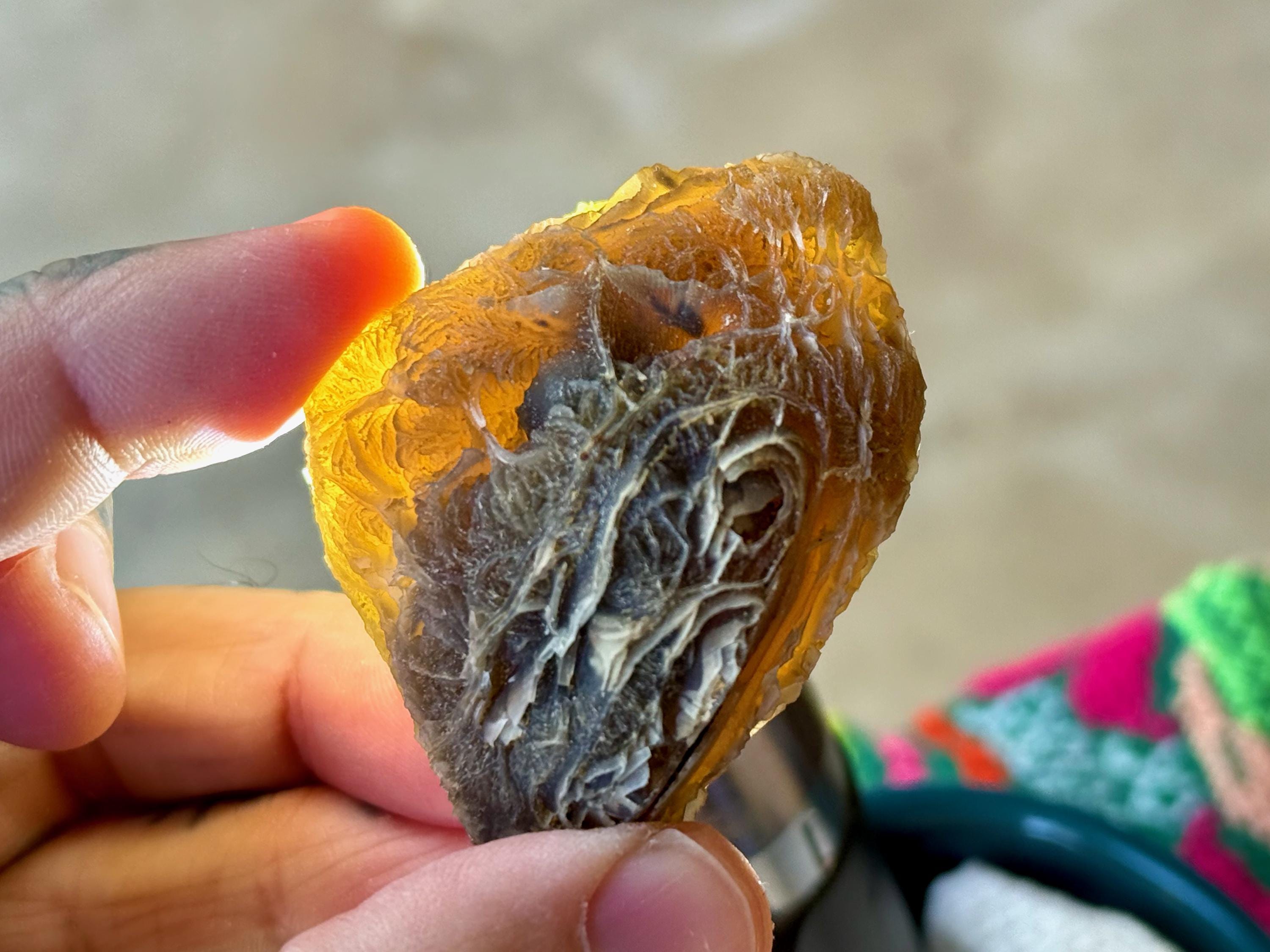 Layers upon layers of unique textures to this unusual Black Mountain Gobi Agate! In natural light, this stone has a grayish-black color with intricate patterning throughout. When backlit, this stone lights up brilliantly! (Photos 2-4). Really one of the coolest pieces from this collection.