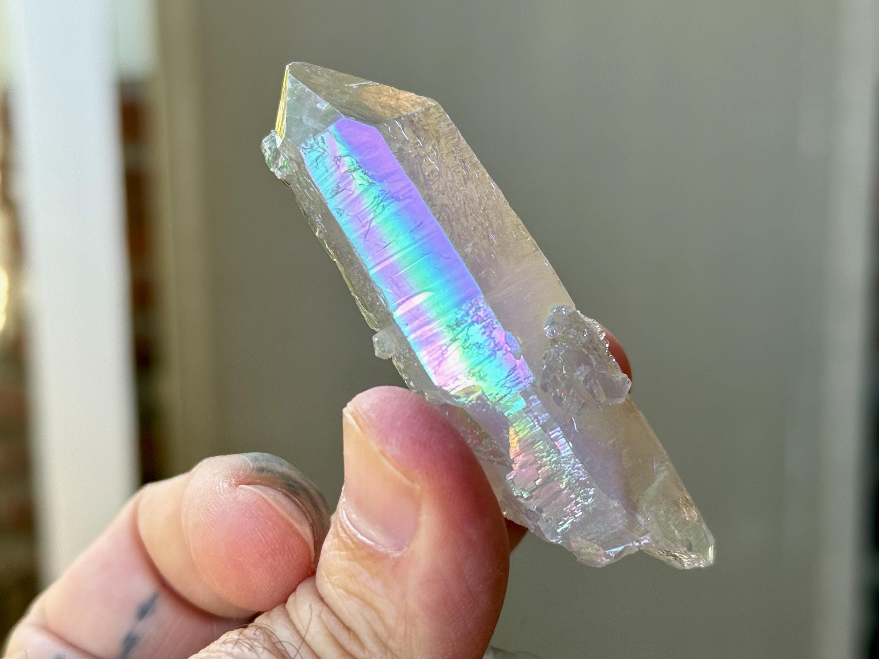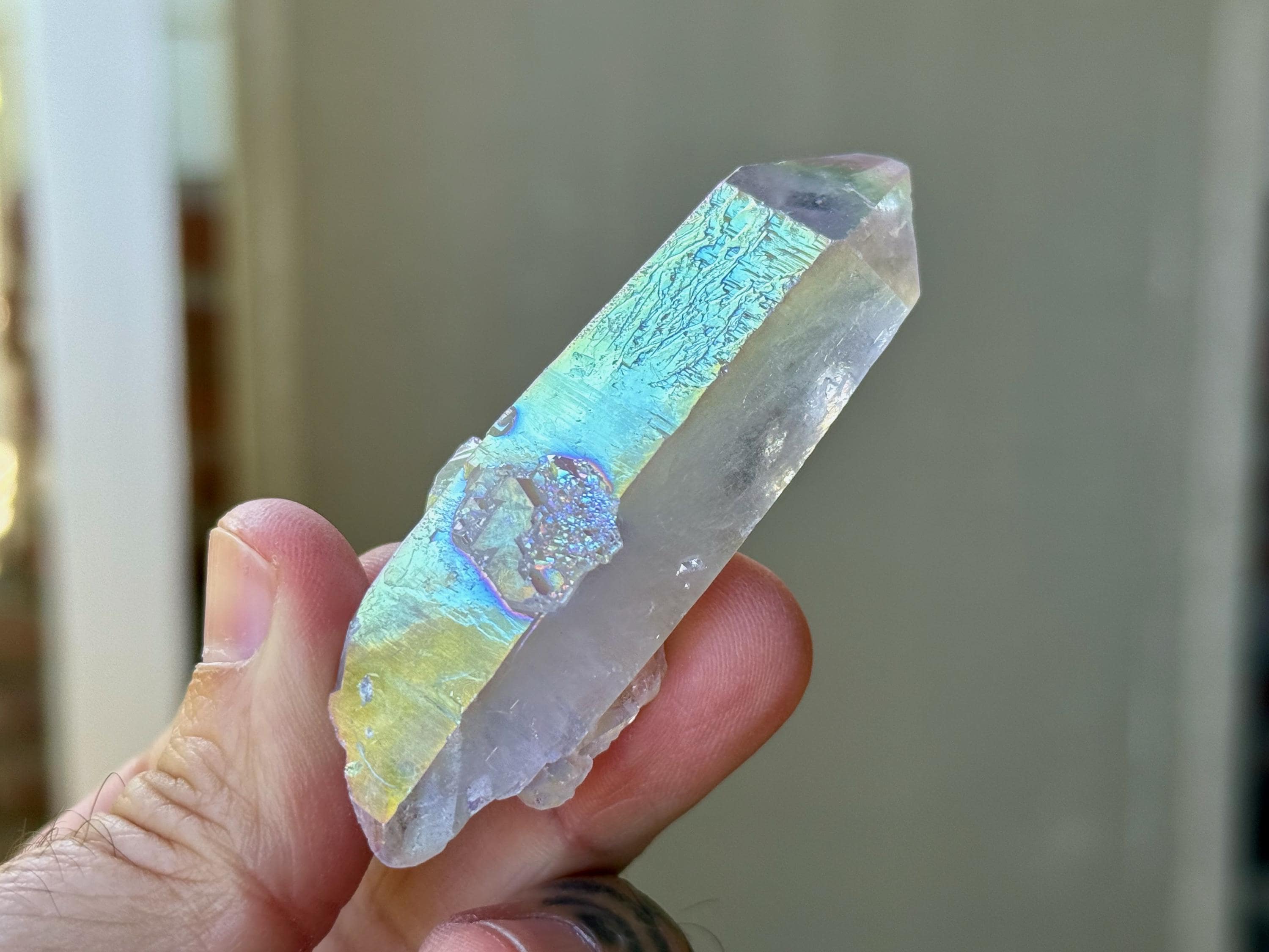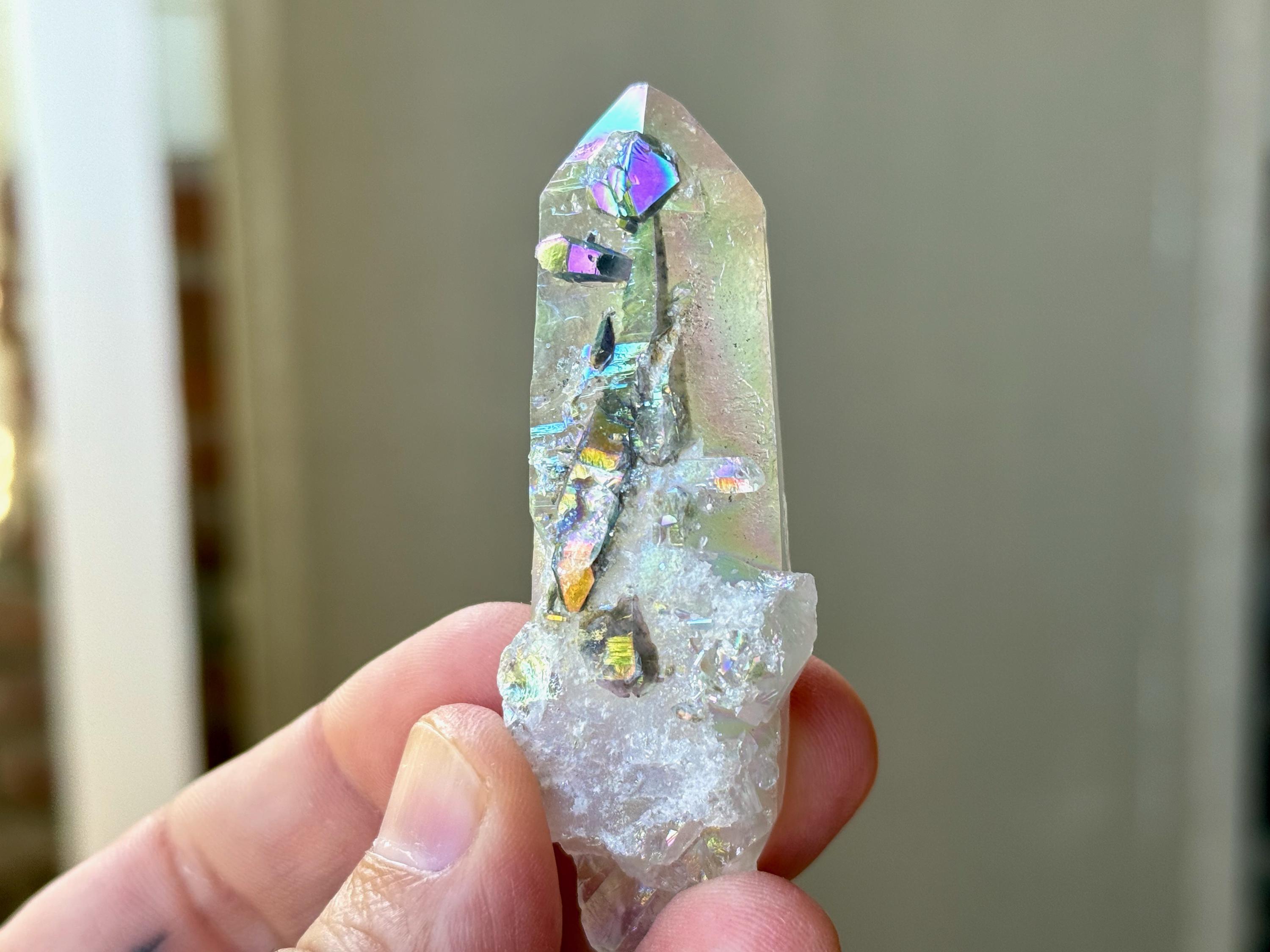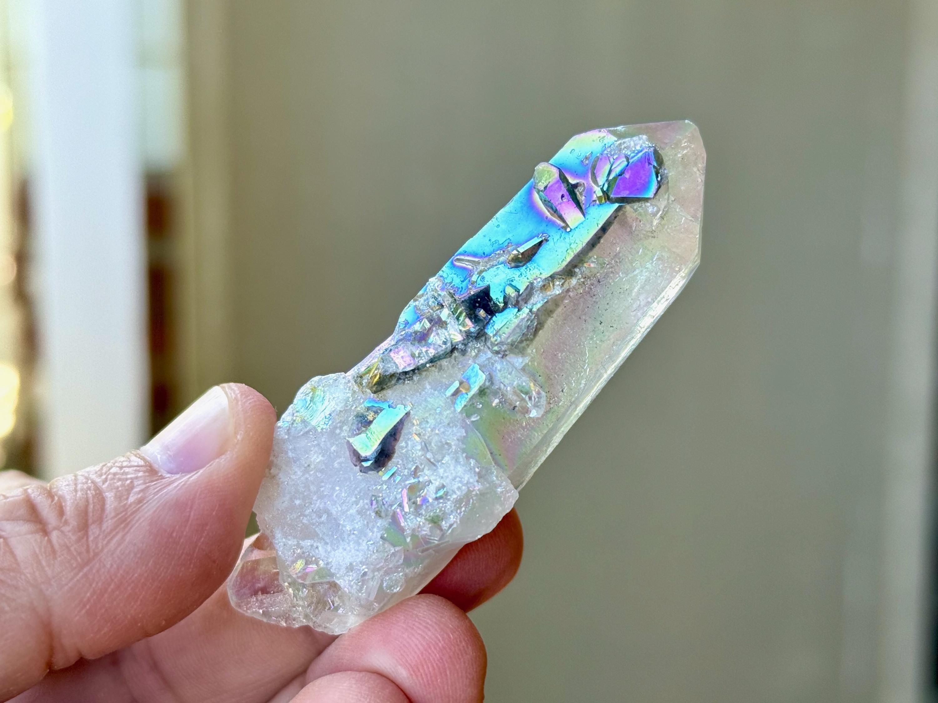 This exquisite Opal Aura Starbrary Quartz crystal comes from an old collection. Also known as "Angel Aura" Quartz, these crystals are the result of a lab process which bonds Platinum with, in this case, a very high-quality Starbrary Quartz crystal from Brazil. The result is a heavenly opalescence, creating a truly ethereal, prismatic effect, while retaining all the physical and energetic features of the Quartz itself.