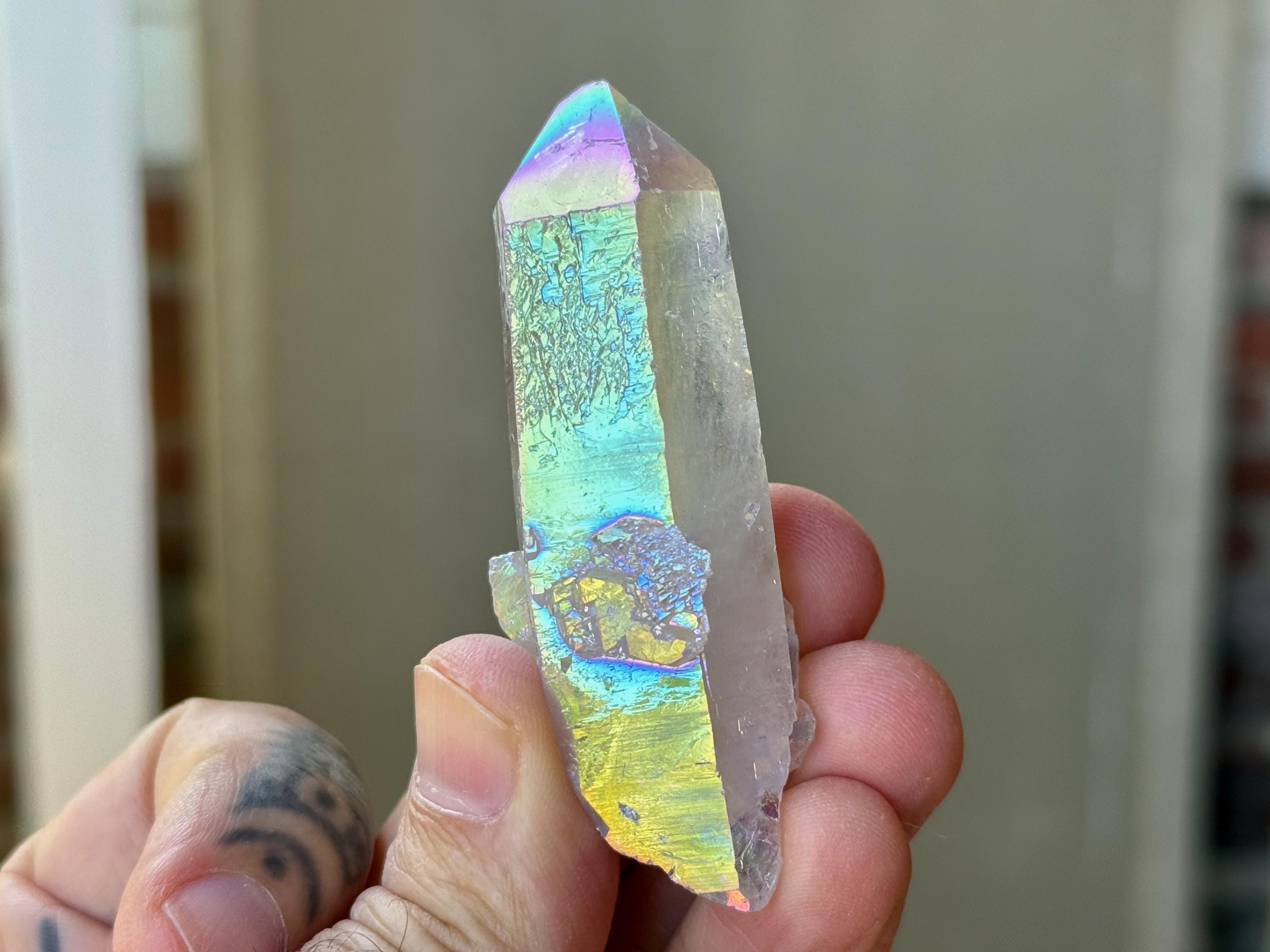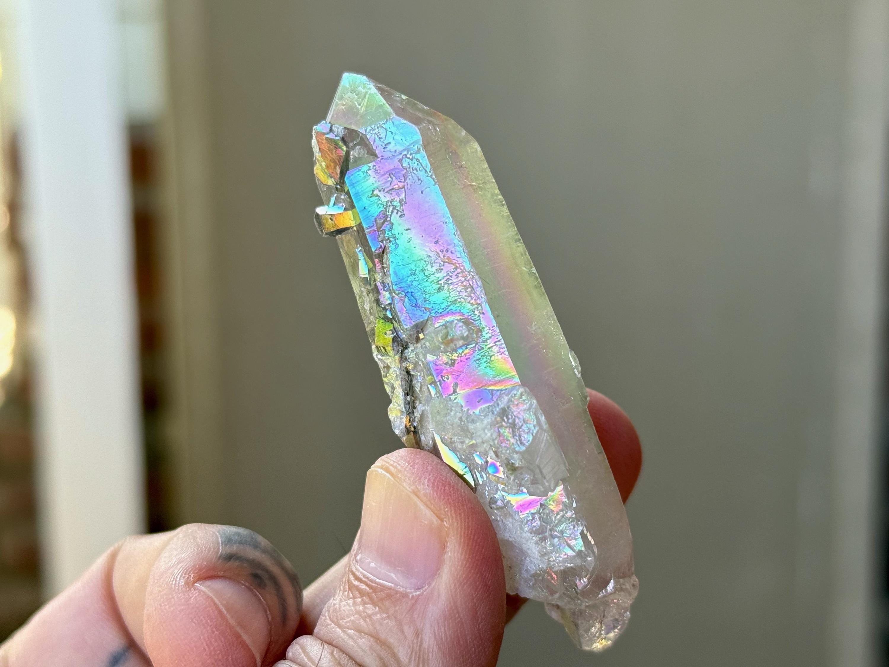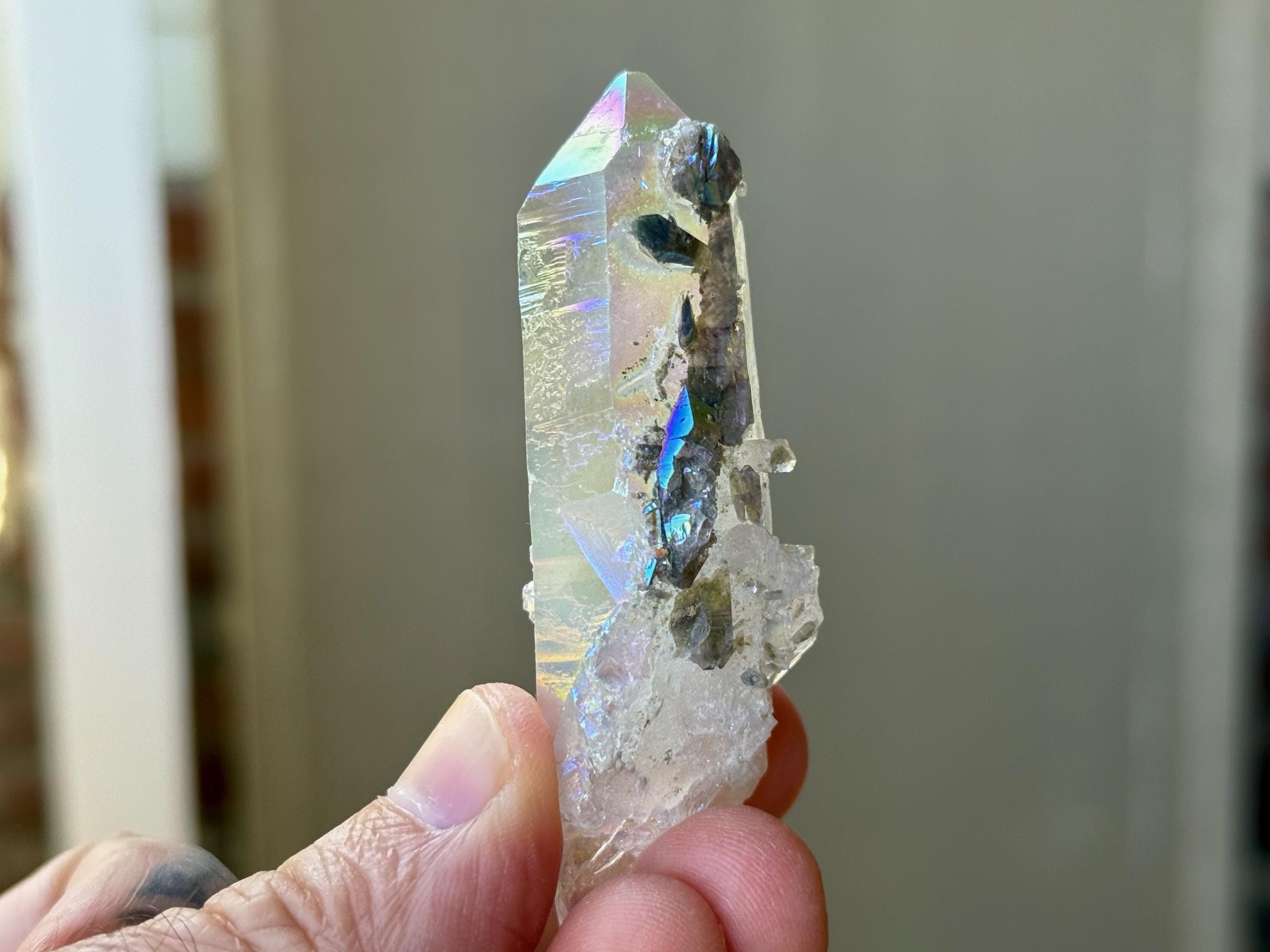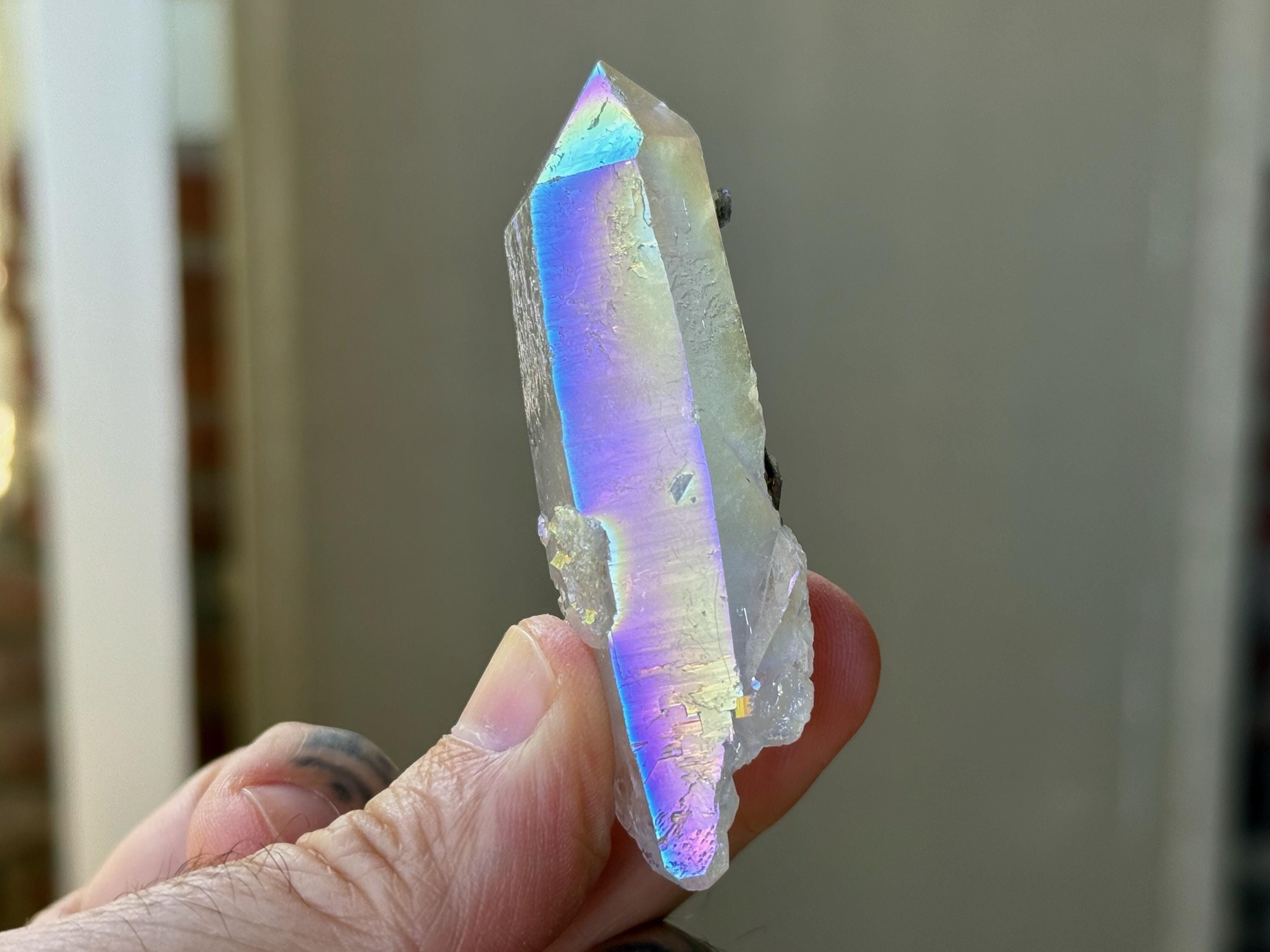 This exquisite Opal Aura Starbrary Quartz crystal comes from an old collection. Also known as "Angel Aura" Quartz, these crystals are the result of a lab process which bonds Platinum with, in this case, a very high-quality Starbrary Quartz crystal from Brazil. The result is a heavenly opalescence, creating a truly ethereal, prismatic effect, while retaining all the physical and energetic features of the Quartz itself.
