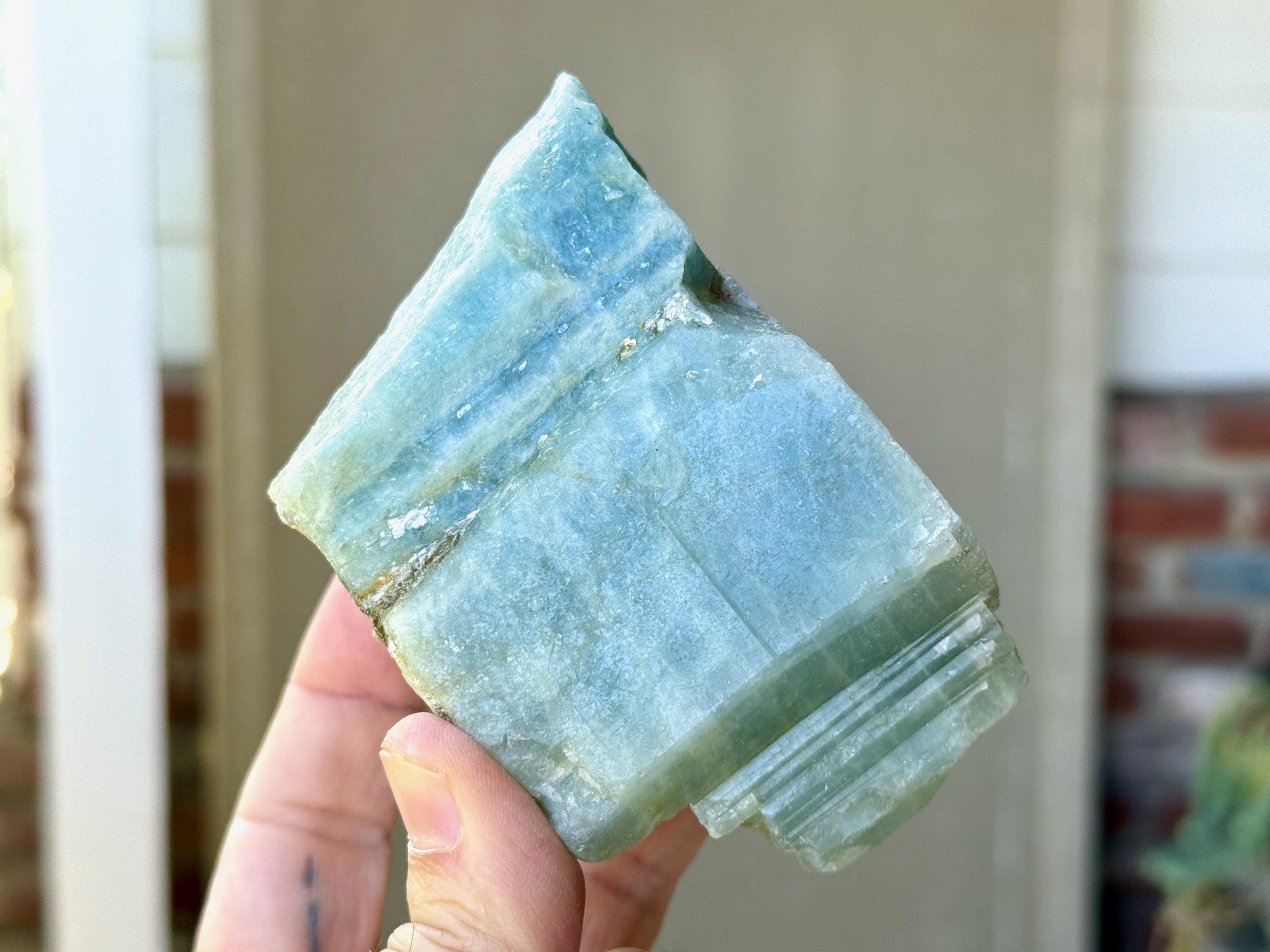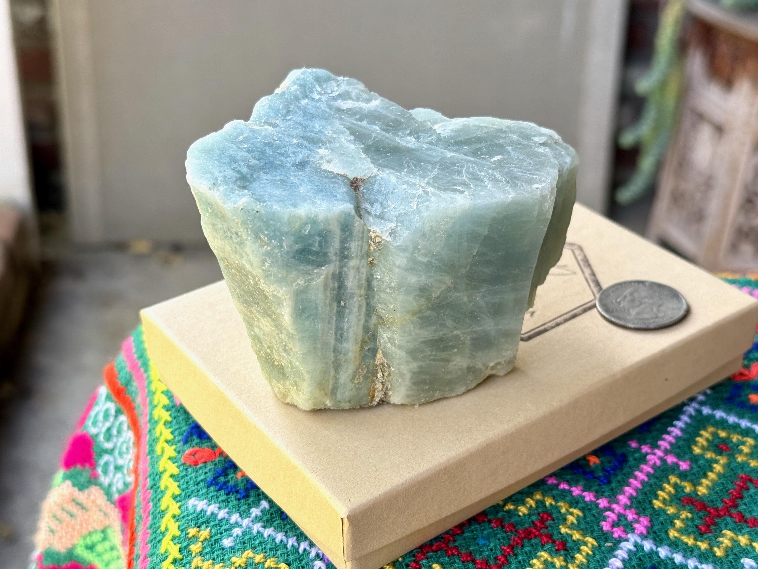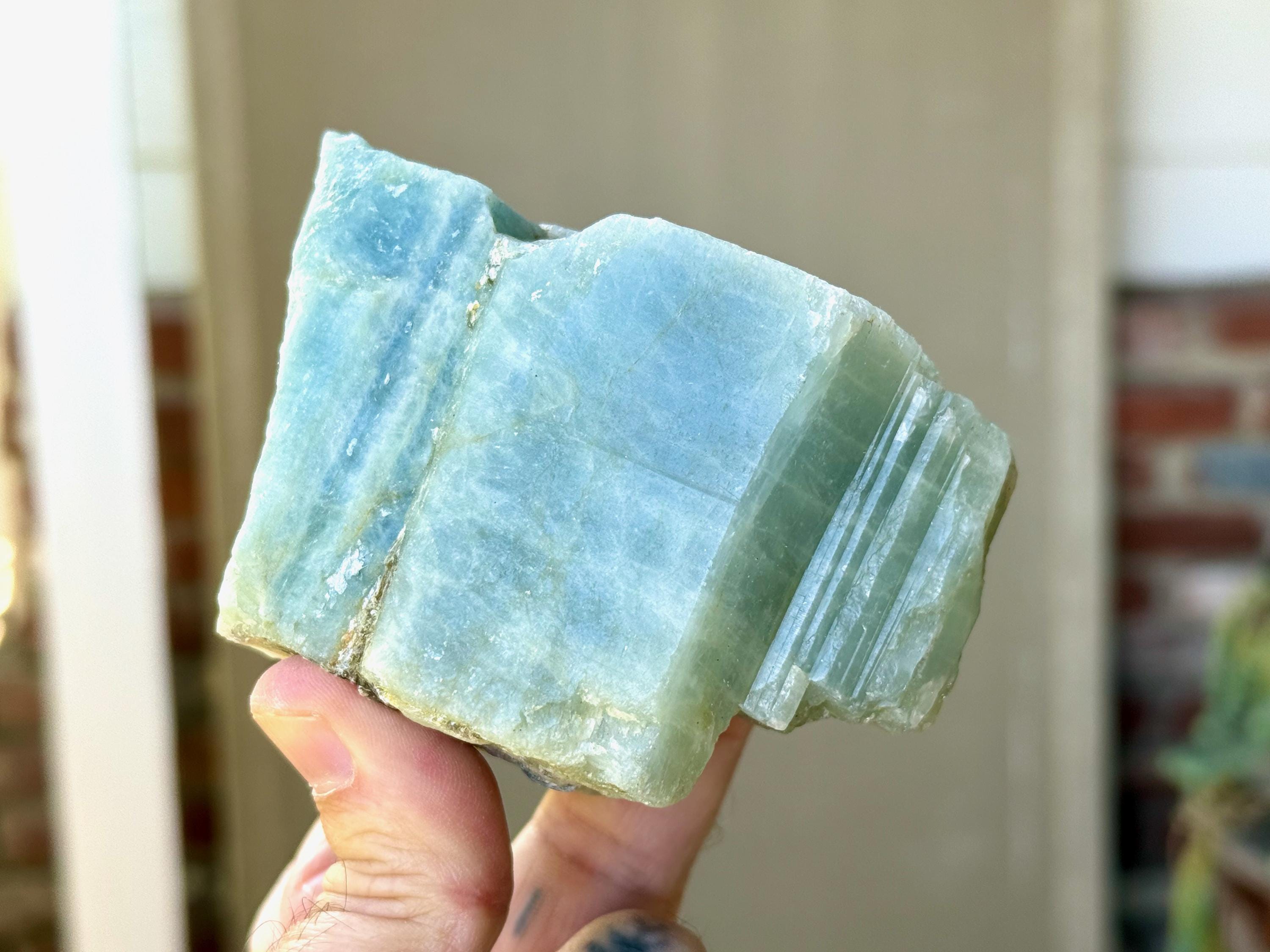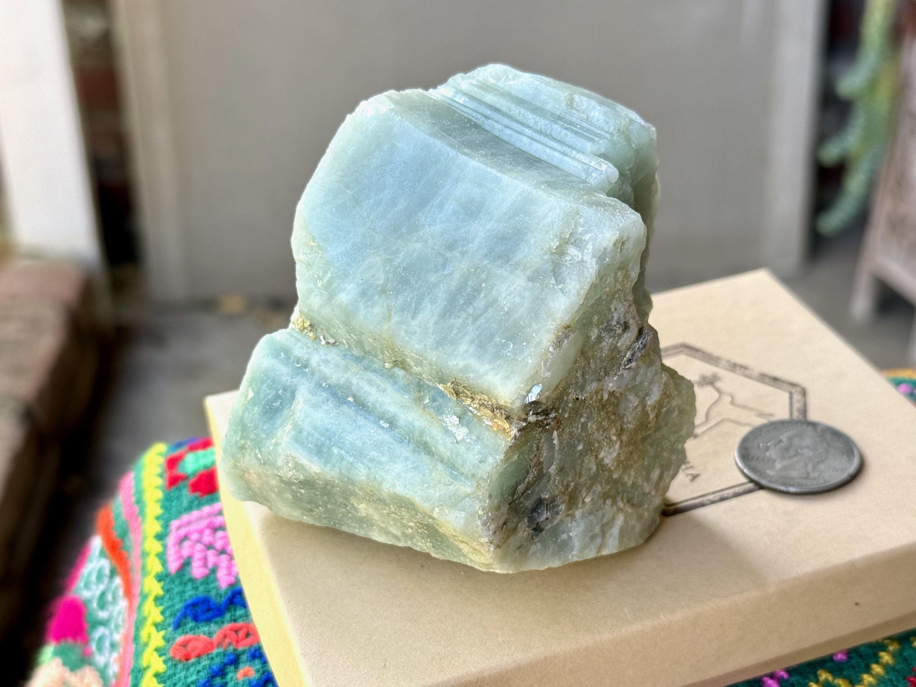 This natural Aquamarine crystal comes from a recent find in Bahia, Brazil. Aquamarine is the blue mineral in the Beryl family and is a powerful crystal for aiding in self-expression and emotional cleansing.