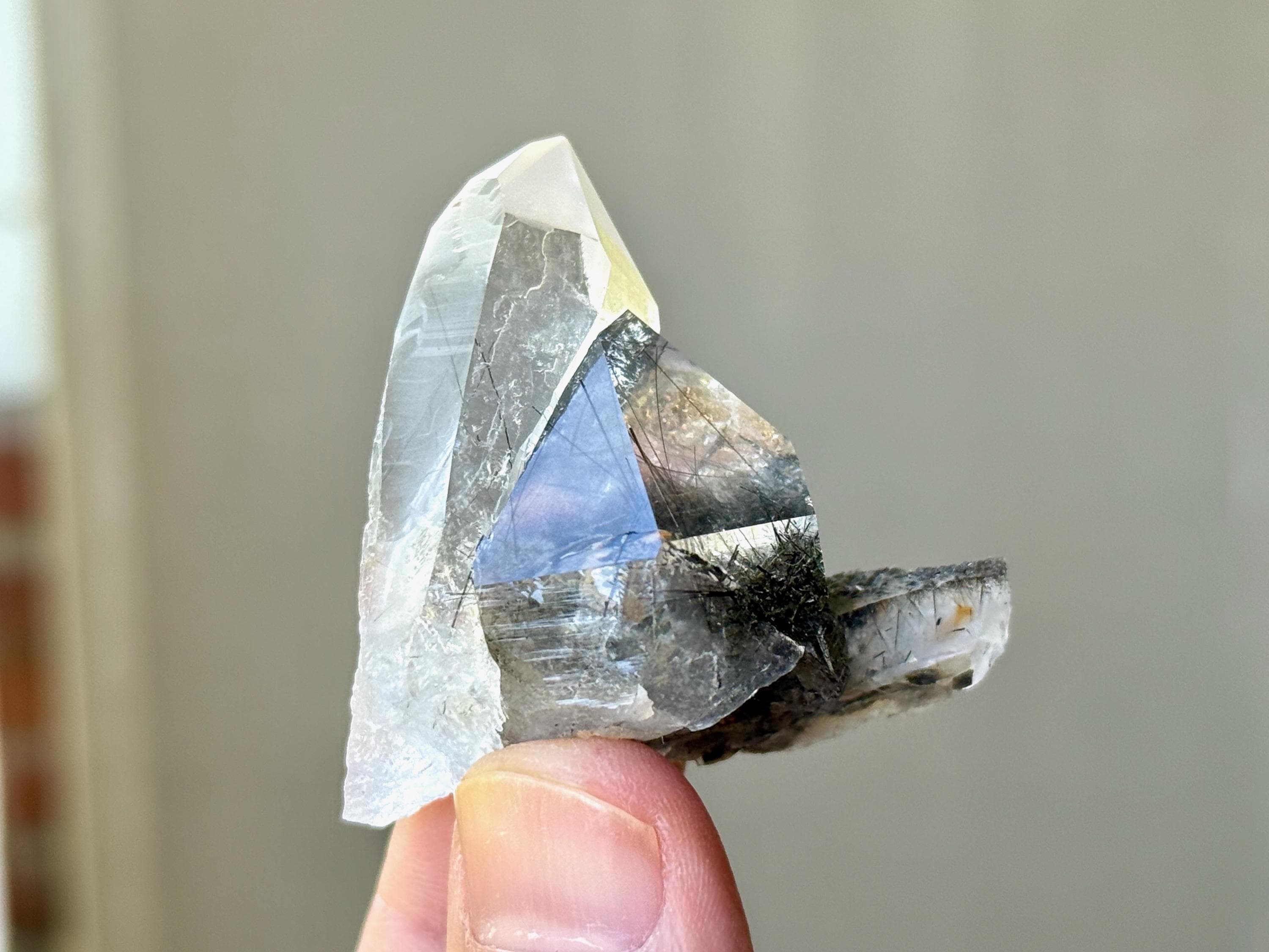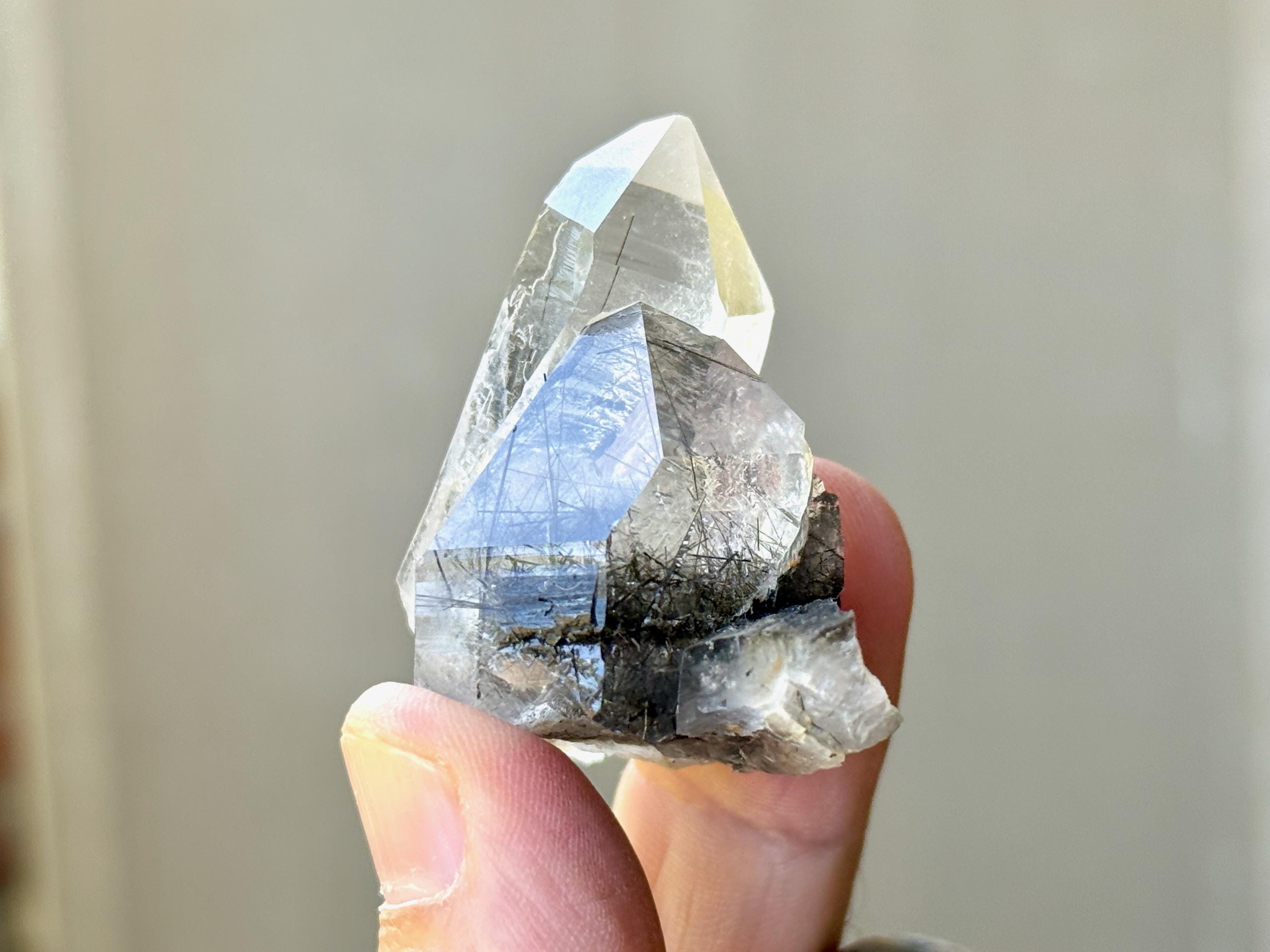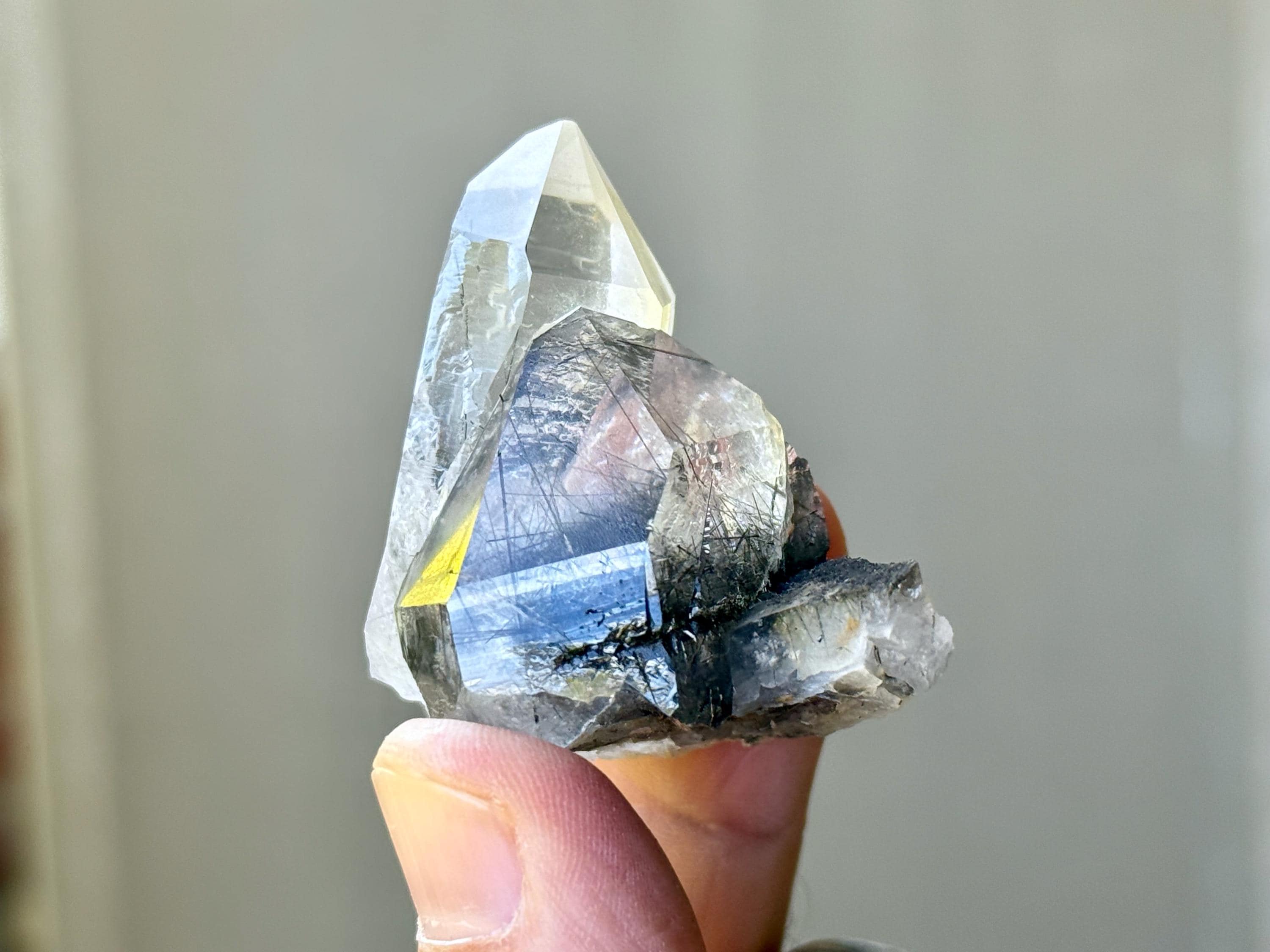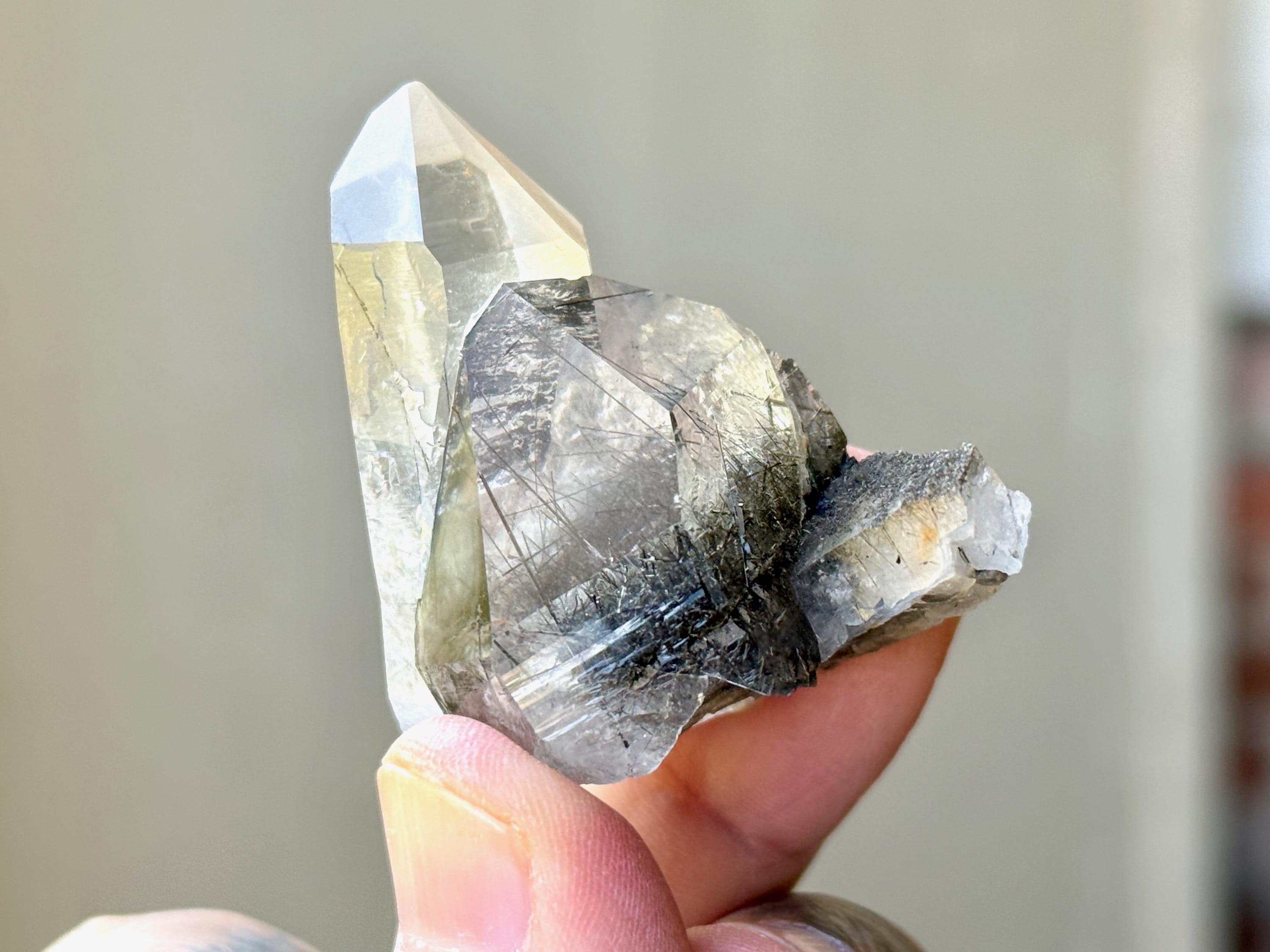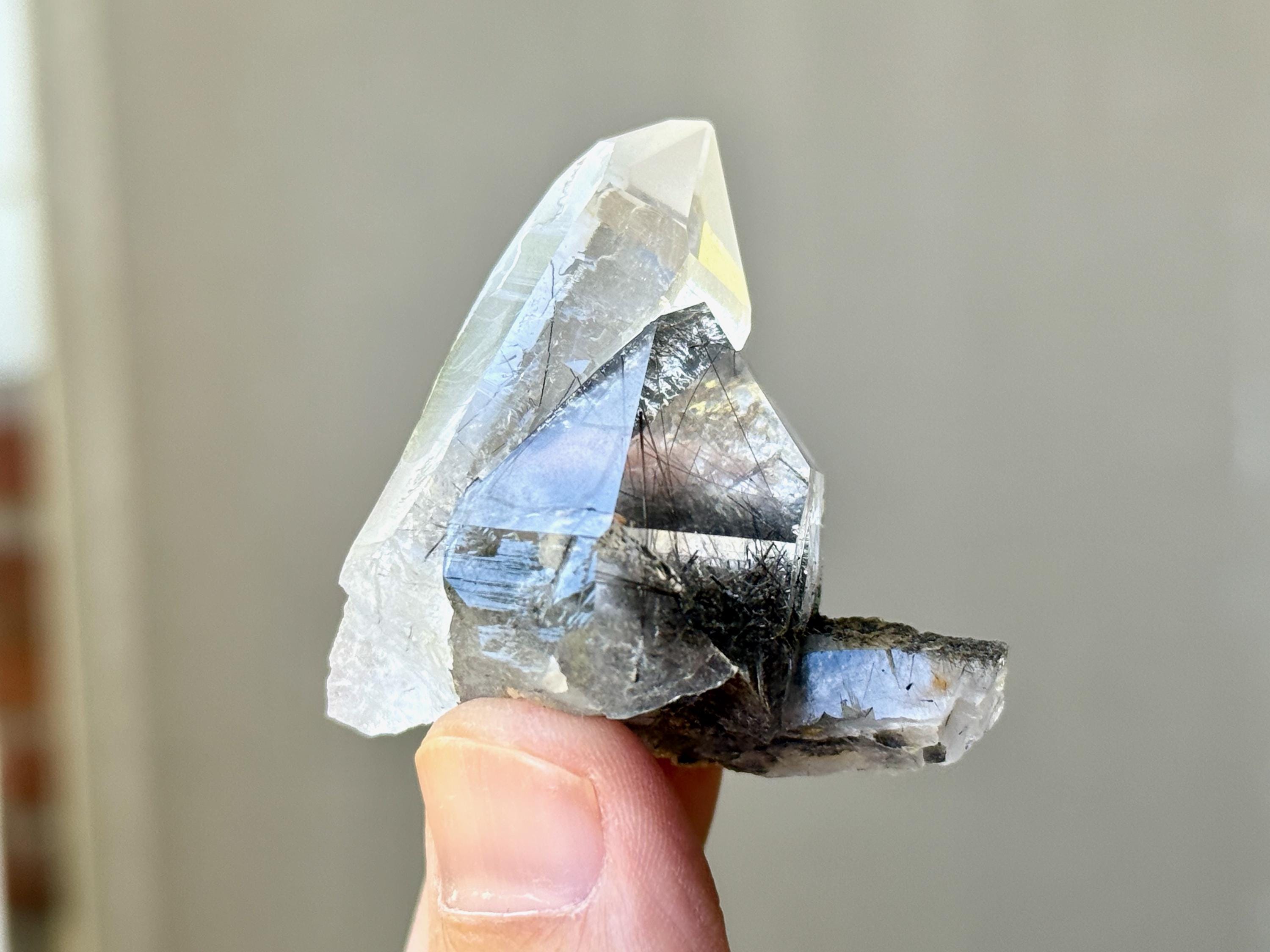 Superb luster and outstanding clarity to this beautiful Quartz Crystal with Black Tourmaline needle inclusions throughout. This is a rather unique Tantric Twin formation, with a shorter pyramidal crystal nested next to an elongated point formation. The base is naturally flat, so this piece sits nicely on its own (Photo 3). Excellent terminations as well!