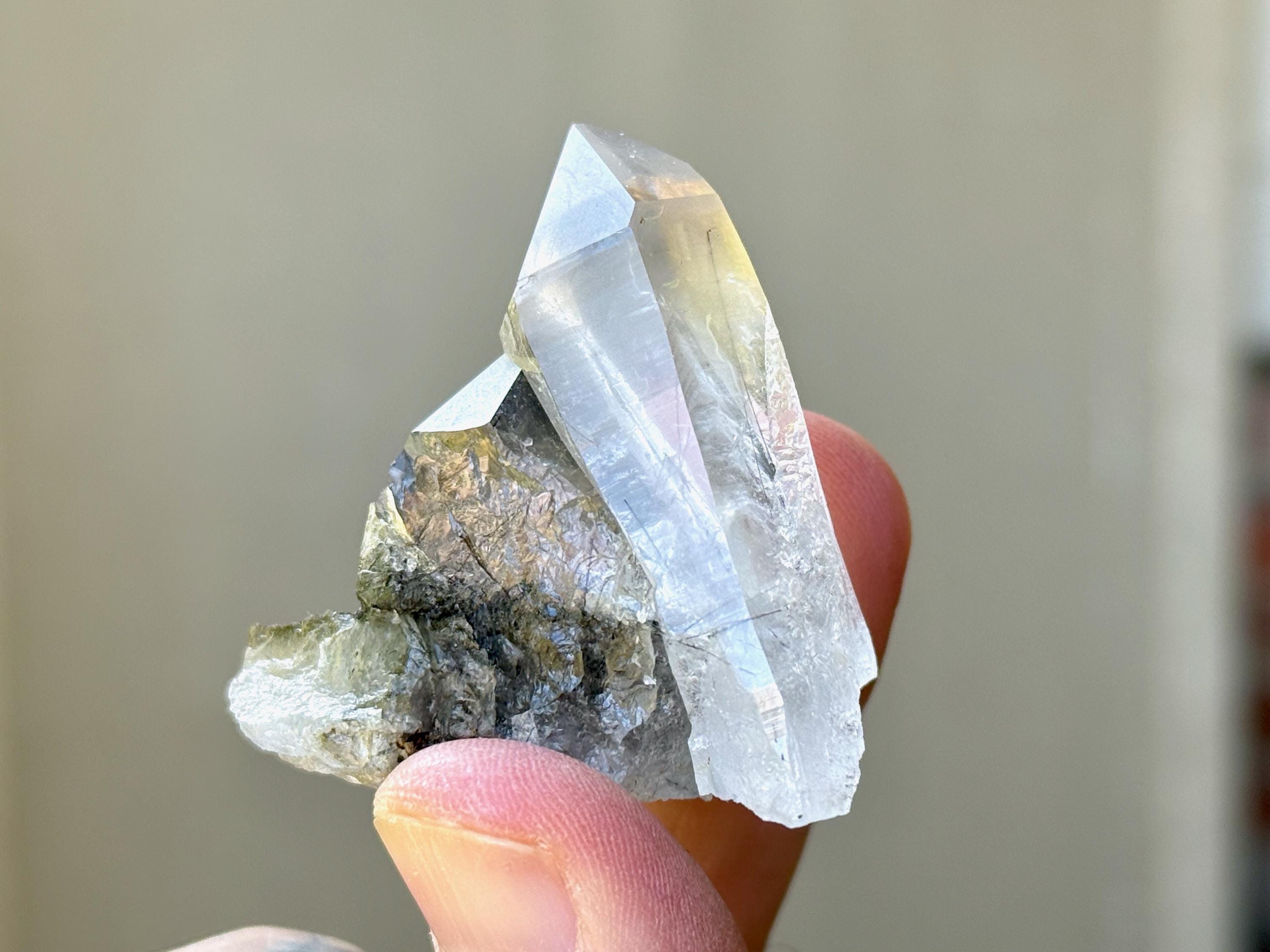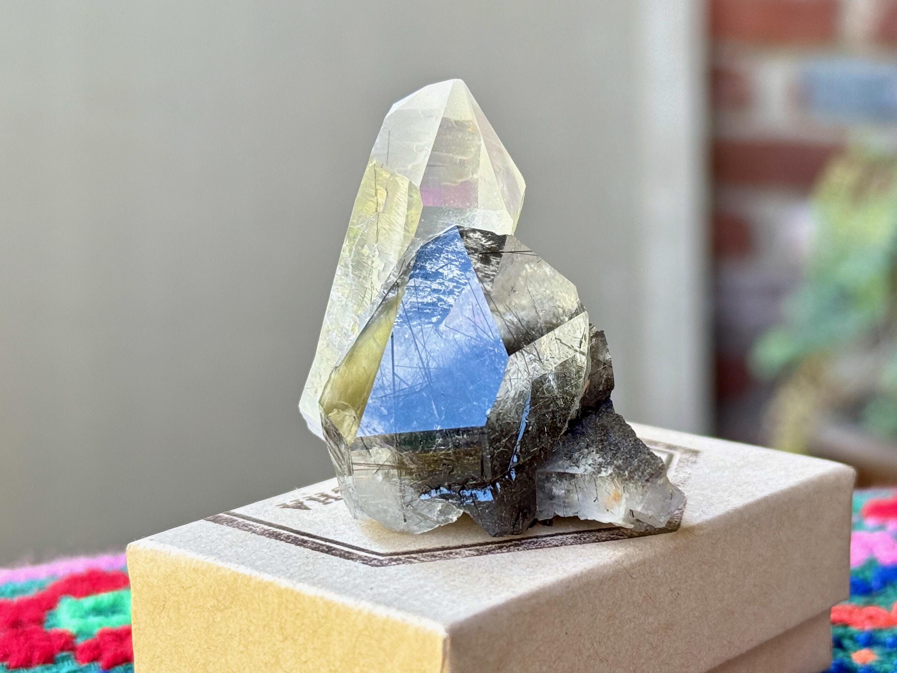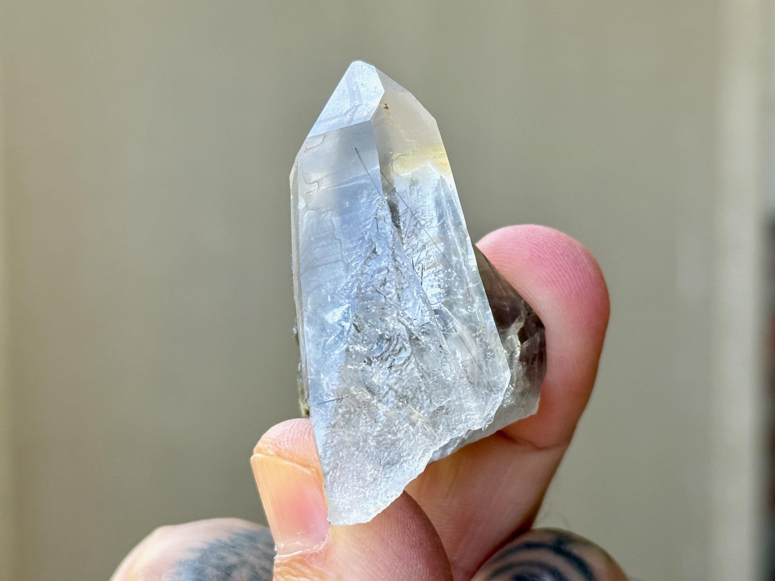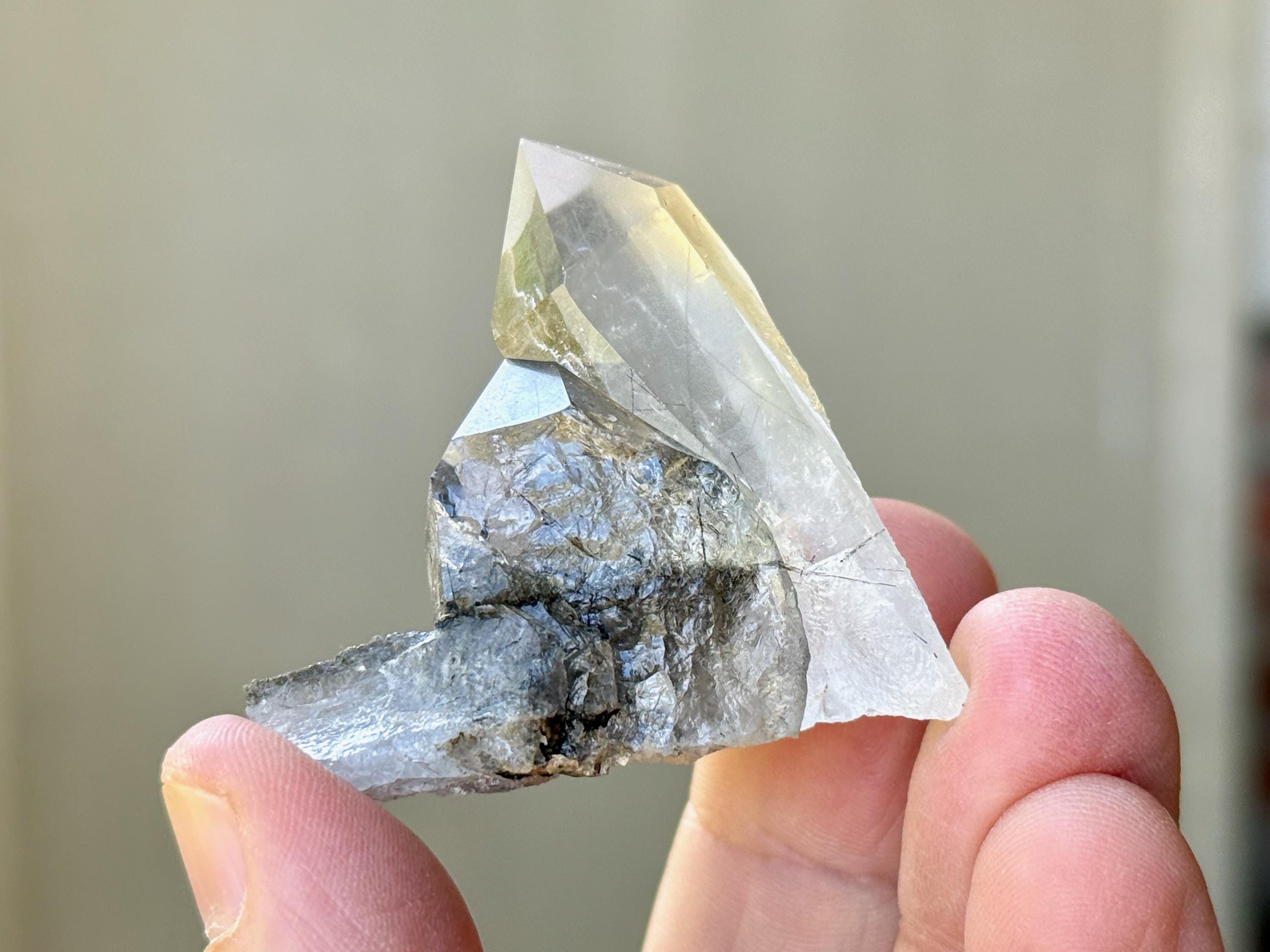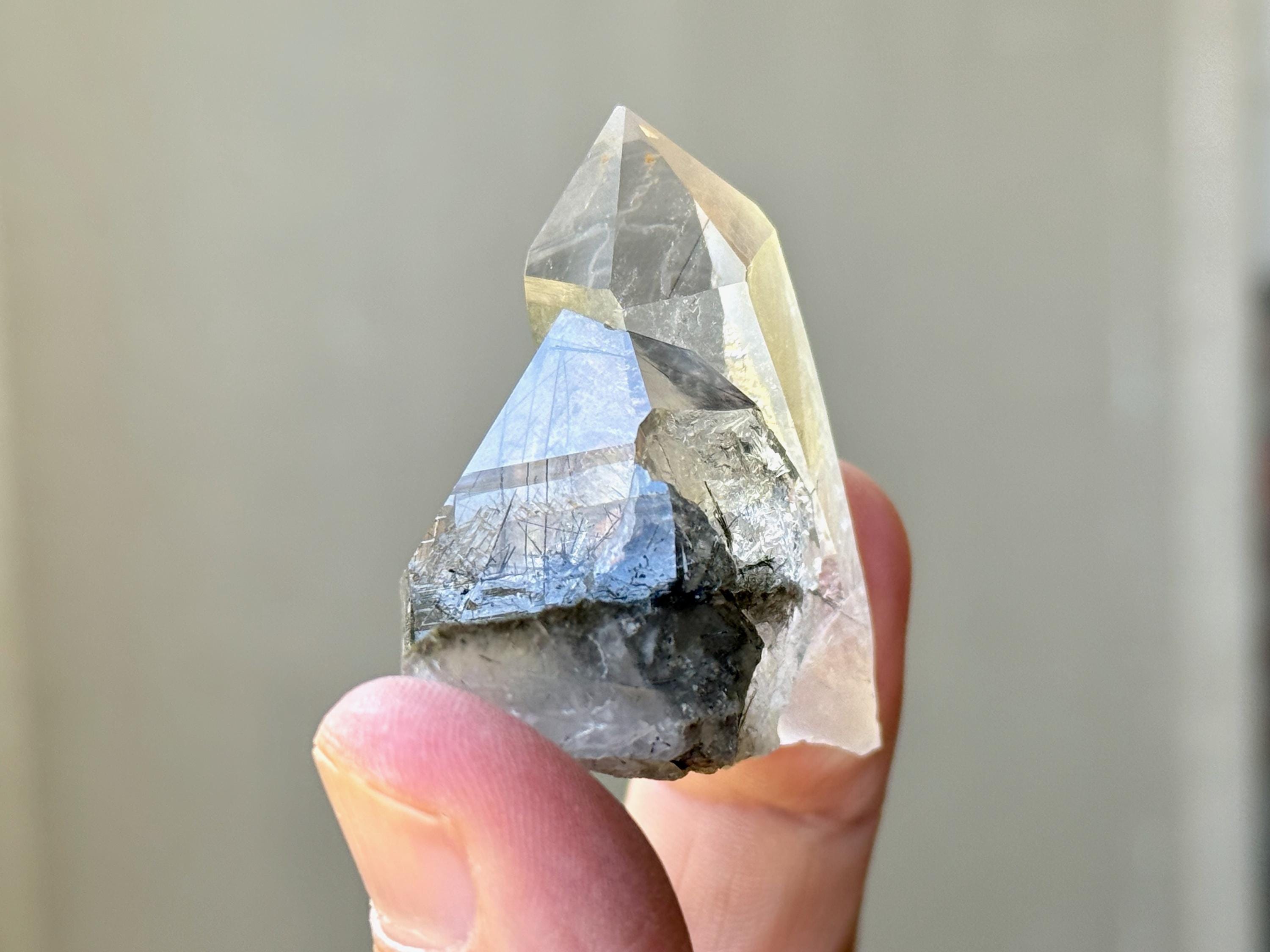 Superb luster and outstanding clarity to this beautiful Quartz Crystal with Black Tourmaline needle inclusions throughout. This is a rather unique Tantric Twin formation, with a shorter pyramidal crystal nested next to an elongated point formation. The base is naturally flat, so this piece sits nicely on its own (Photo 3). Excellent terminations as well!