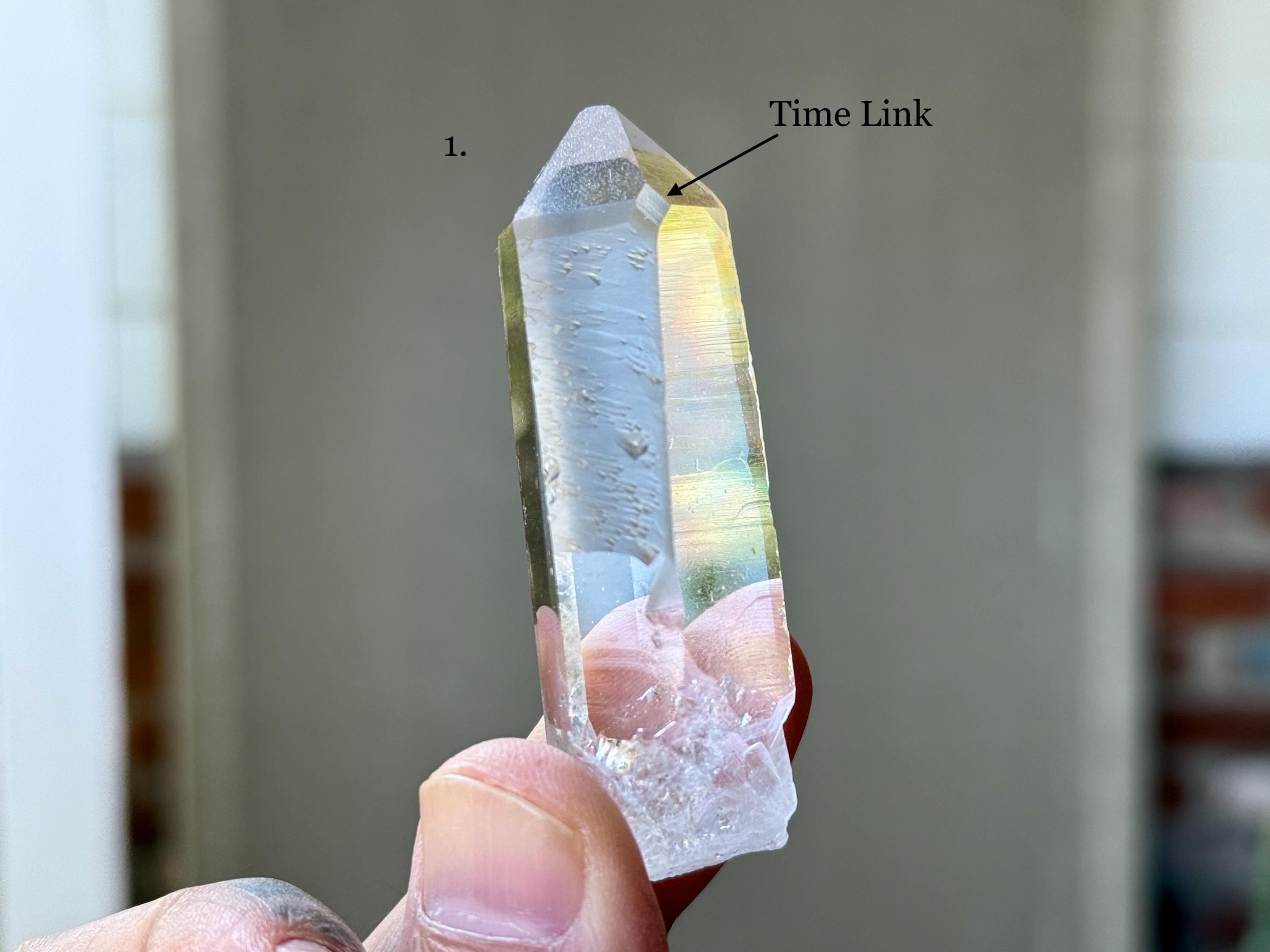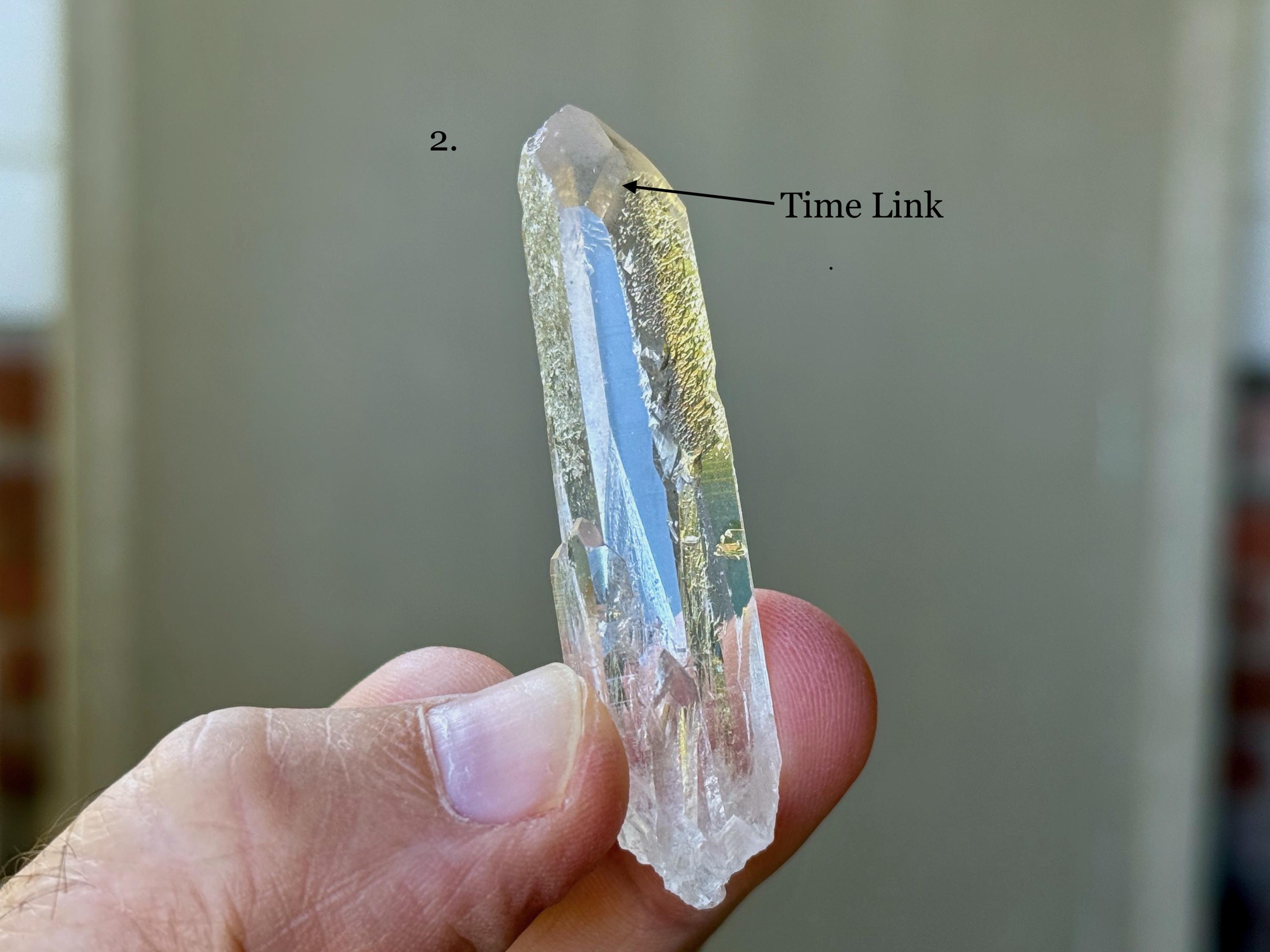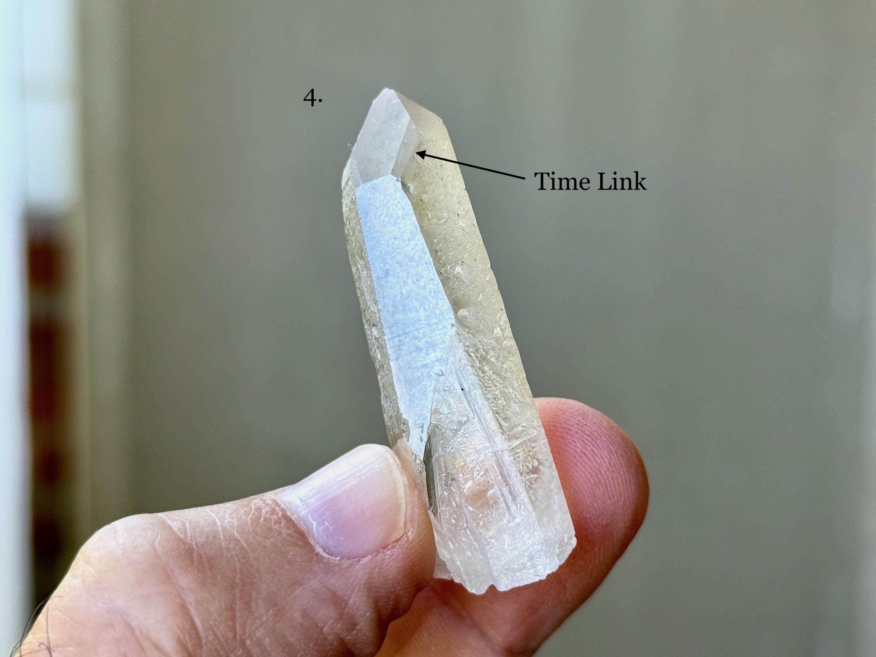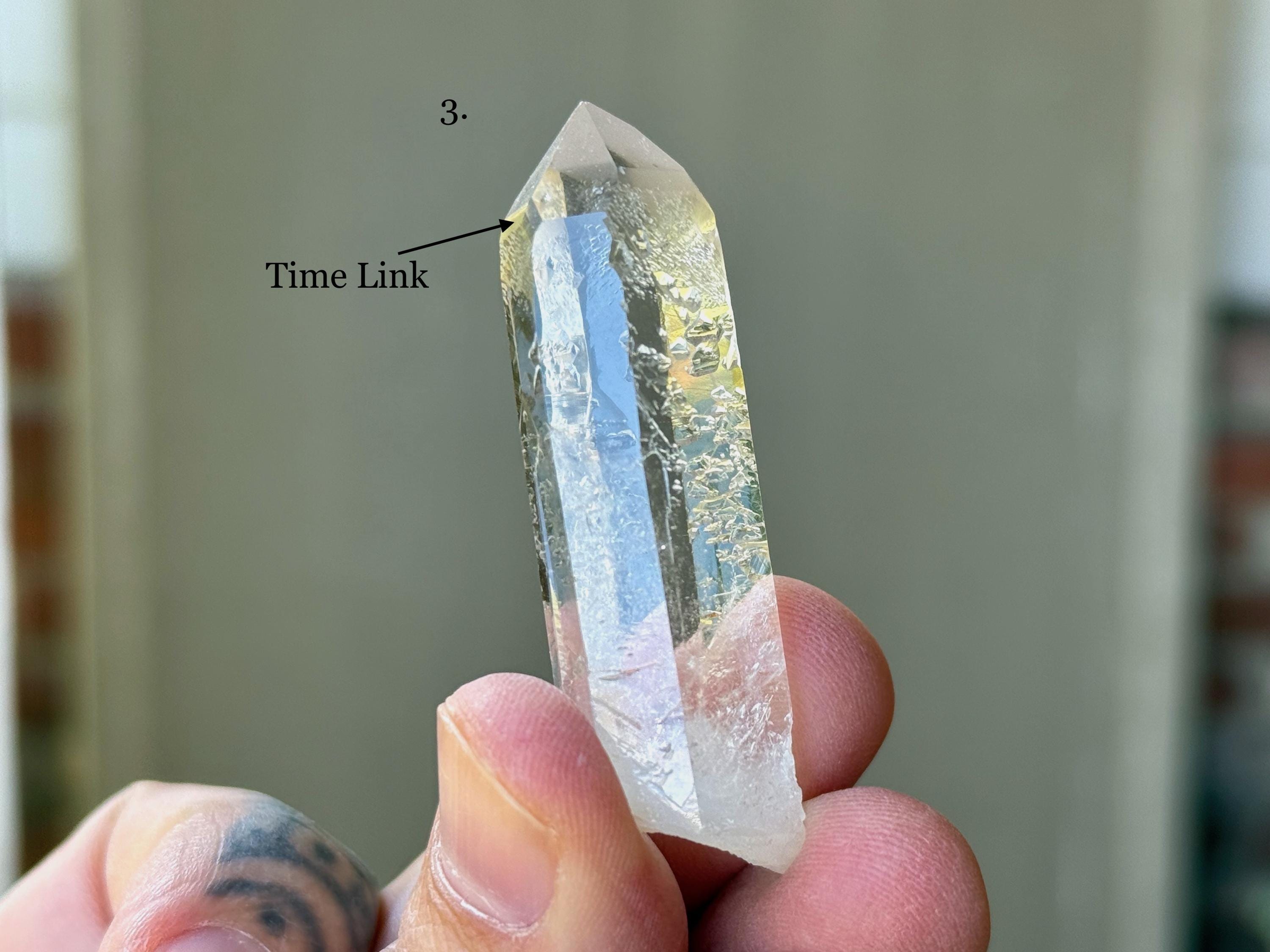 Water clear clarity, brilliant luster and deeply imprinted "glyphs" to each of these Starbrary Quartz. Each of these crystals features a "Time Link" to either the left or right of the main facet (see more on this formation below). We've included some closeups of their markings as well.