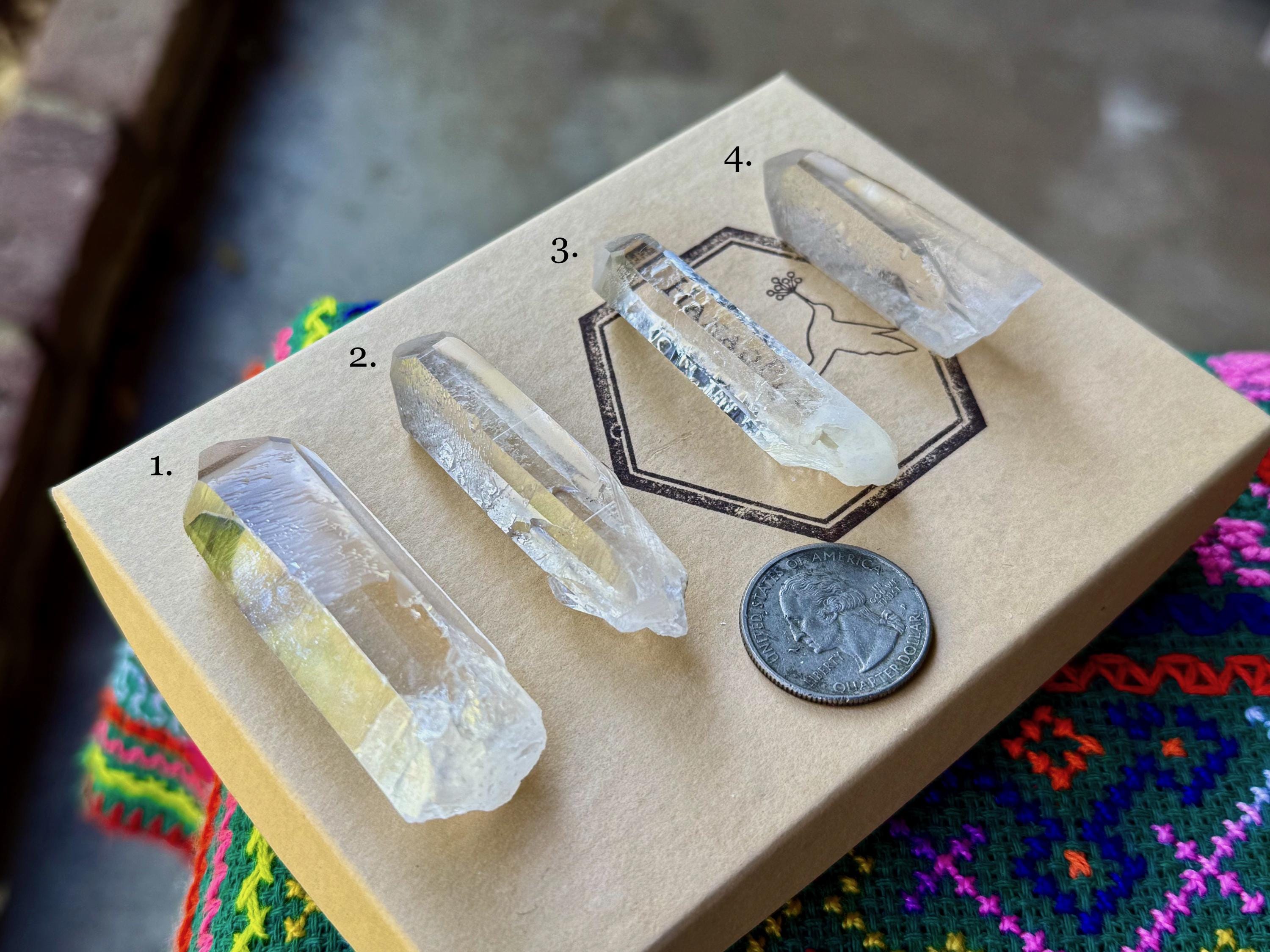 These crystals are similar in size, with some slightly larger or smaller. You can see the Quarter in the photo for size comparison and general measurements below. The terminations are excellent.