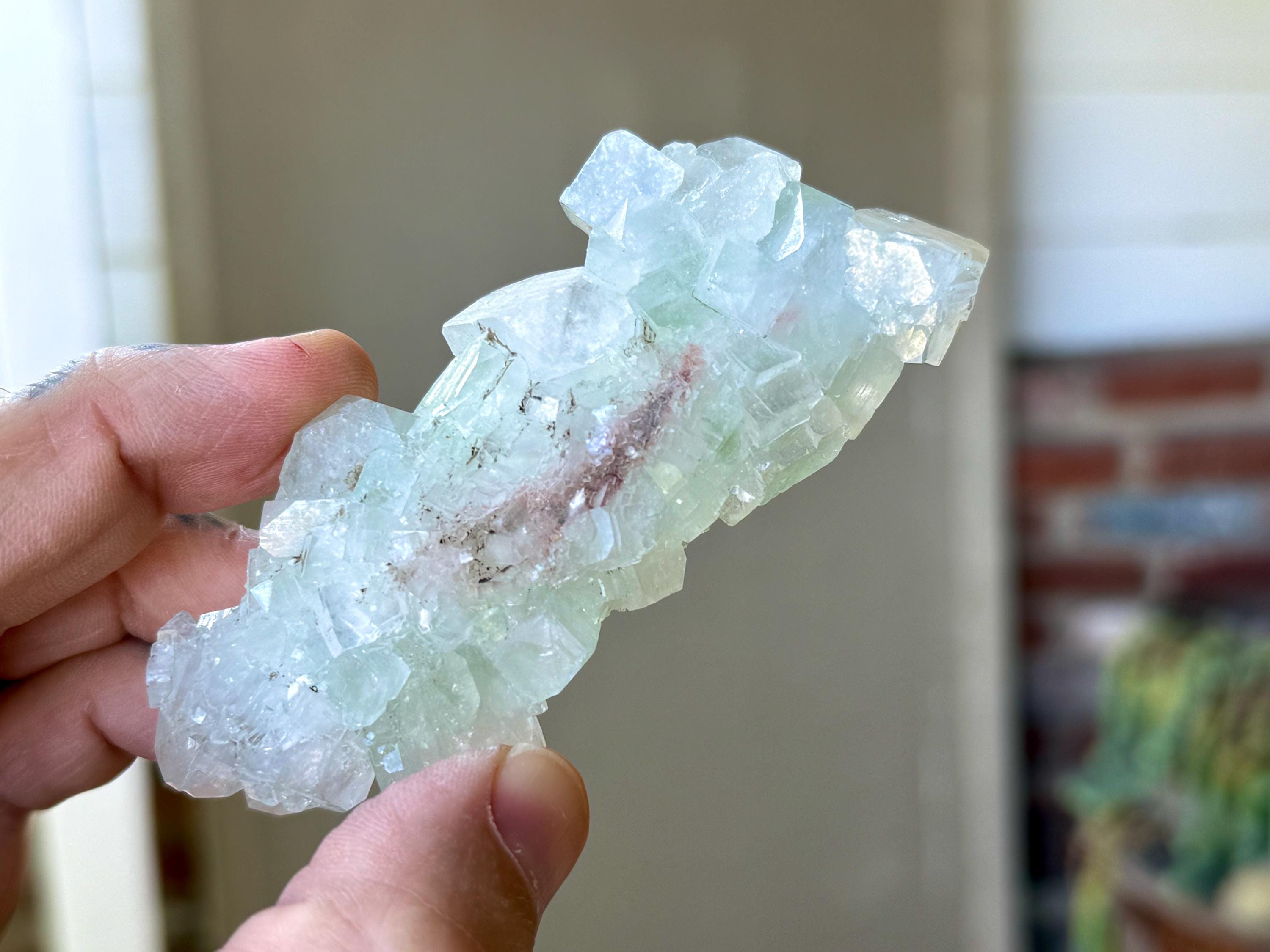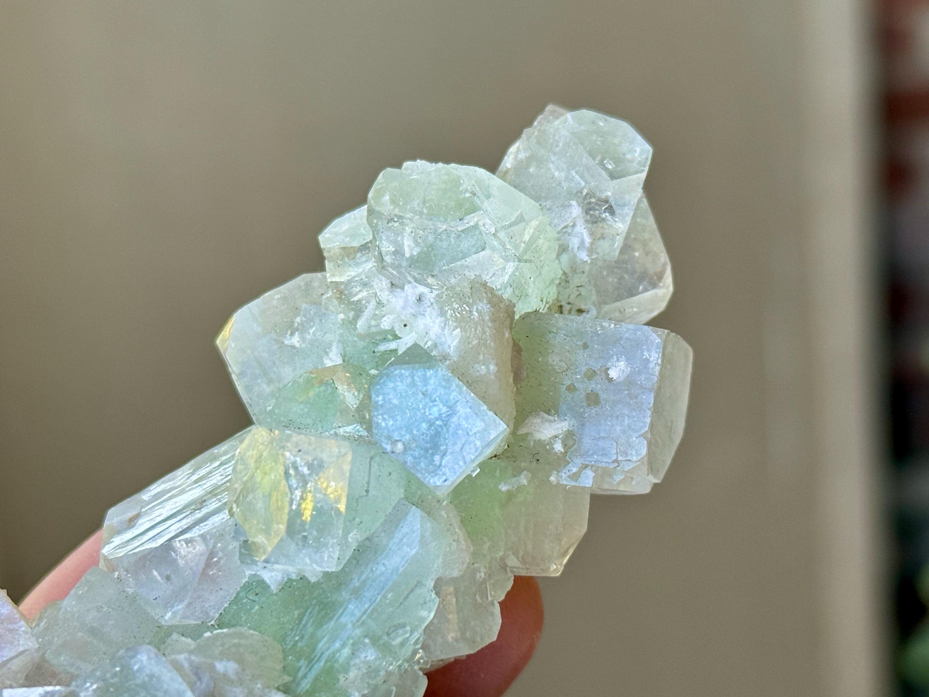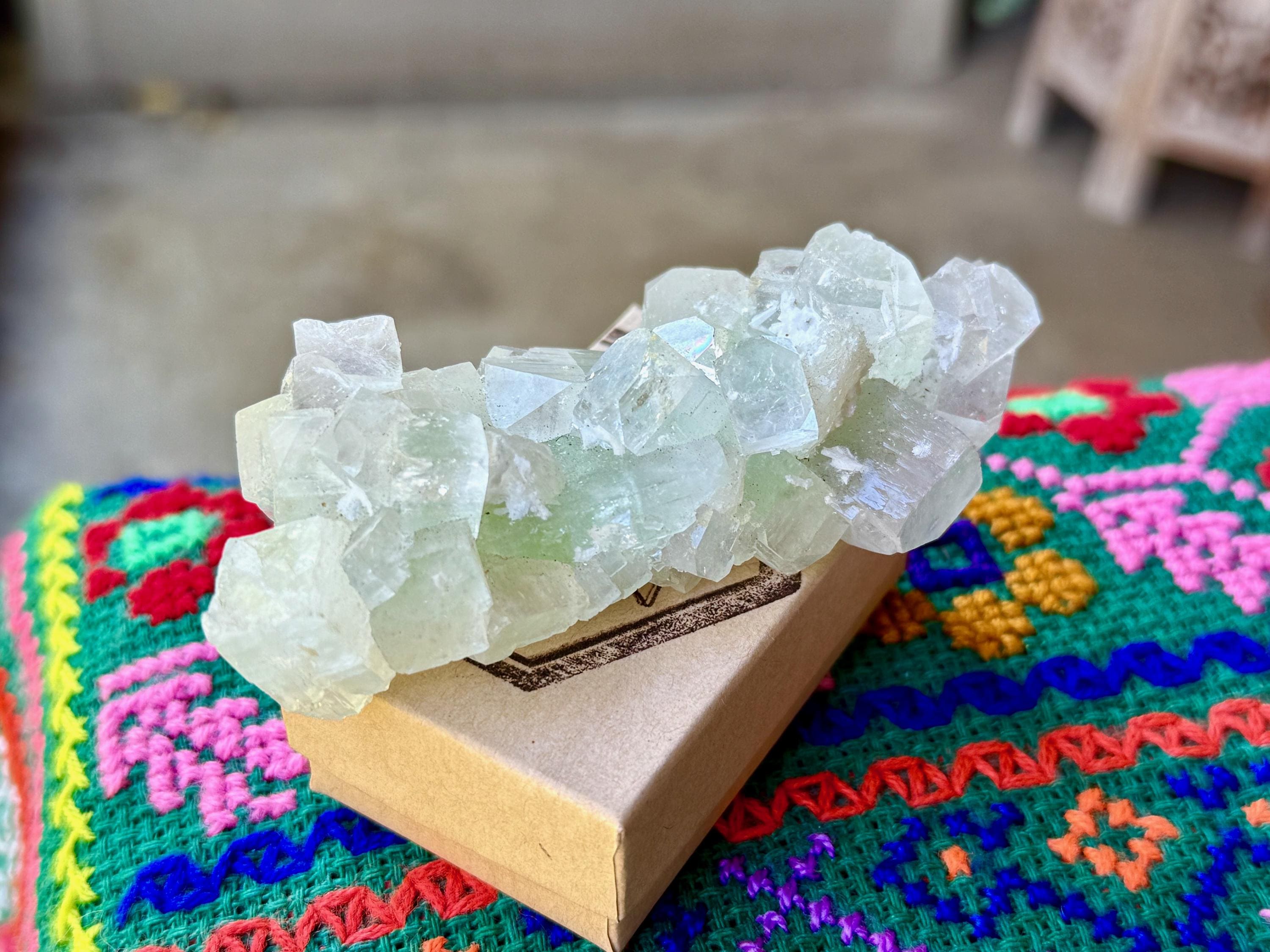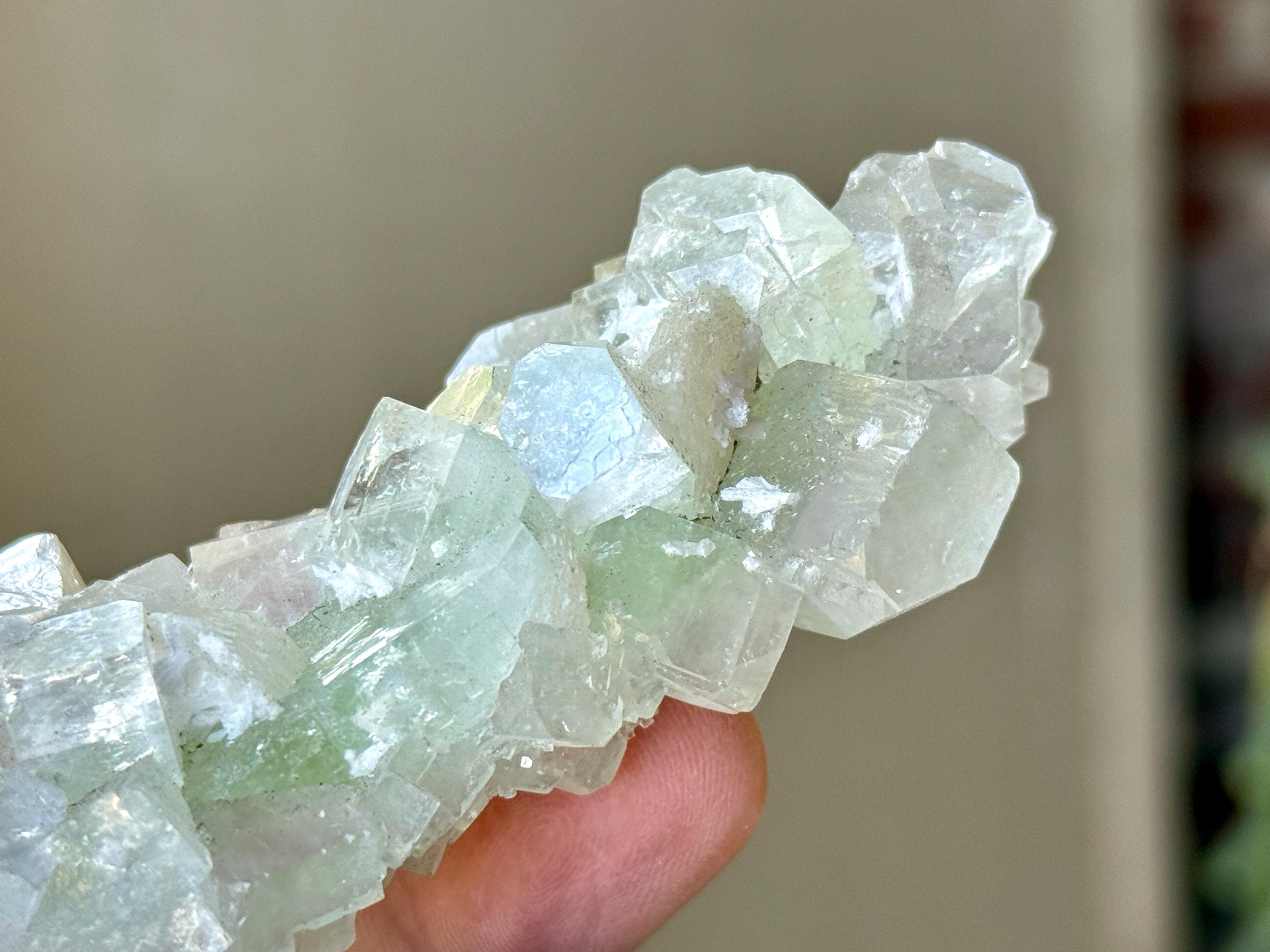One of the last Green Apophyllite crystals from this collection, this is a sparkling cluster chain that looks to us like a bunch of crystalline grapes, with gorgeous naturally cubic crystals in shapes of clear and pale green. A true "disco ball" for sure. The color is beautiful and the photos just don't quite capture the sparkle of this one. Really lovely with great terminations. There's also a bit of a definitive "base" for this piece that is flat, allowing it to sit perfectly for display as pictured.