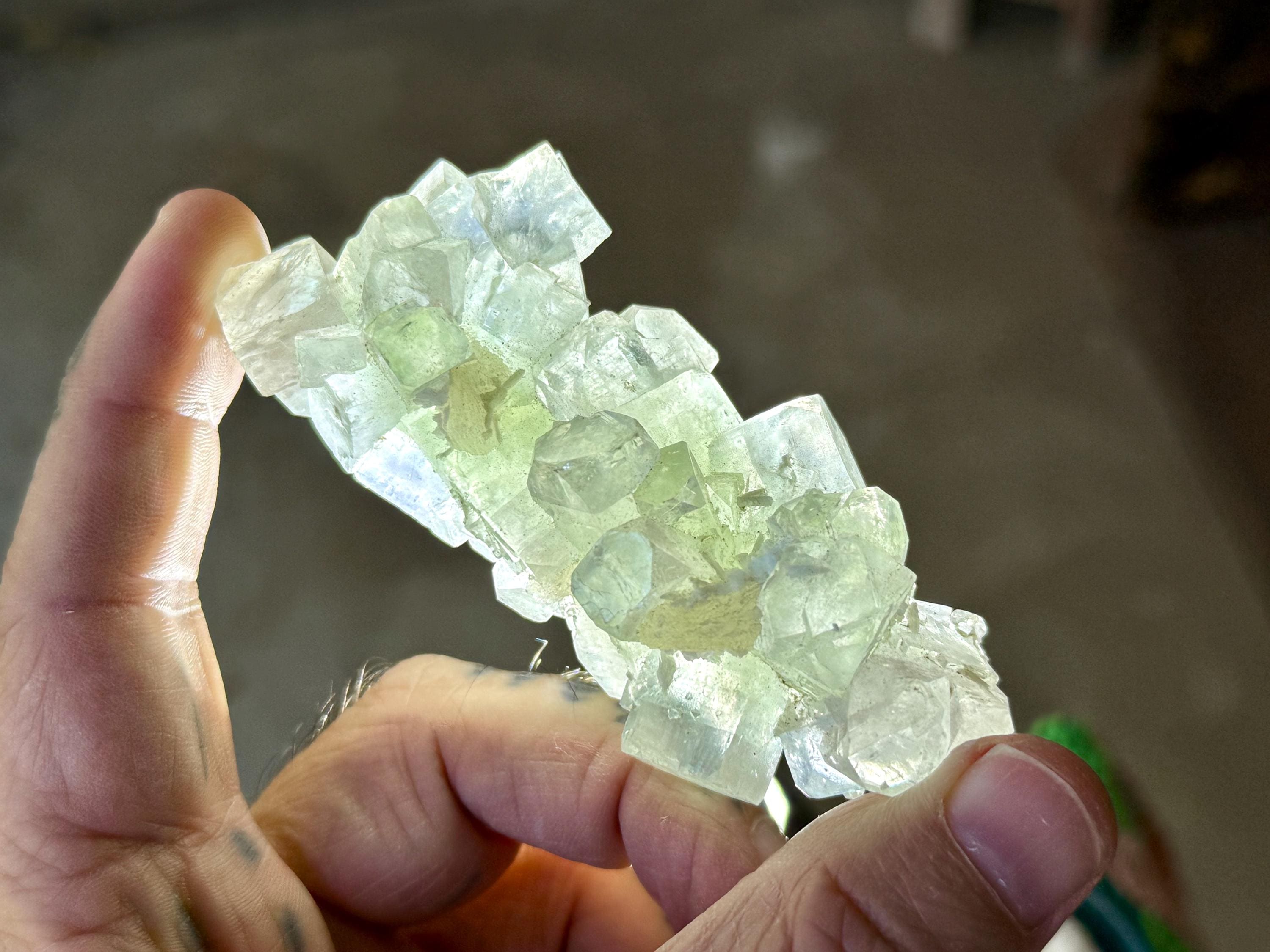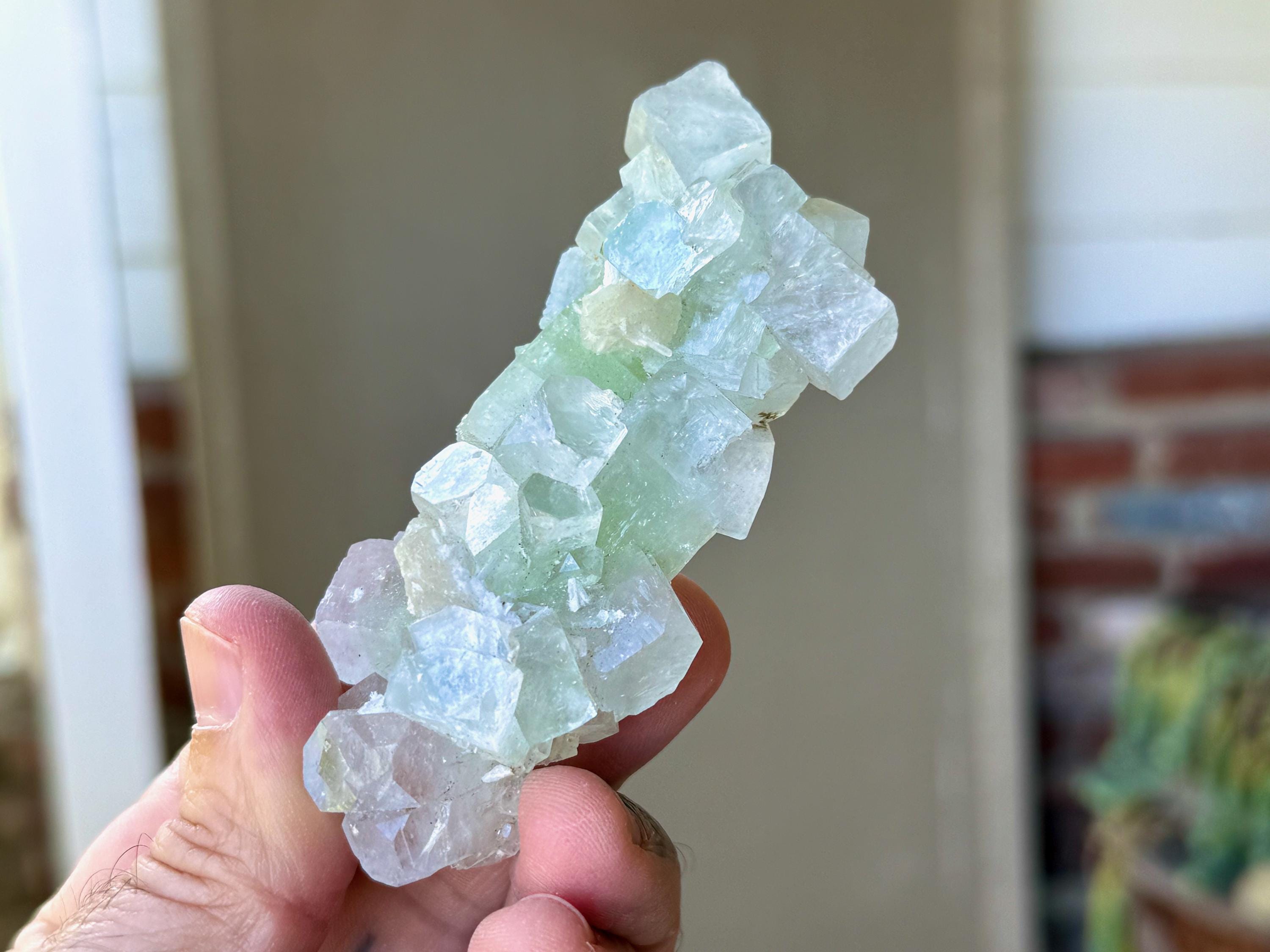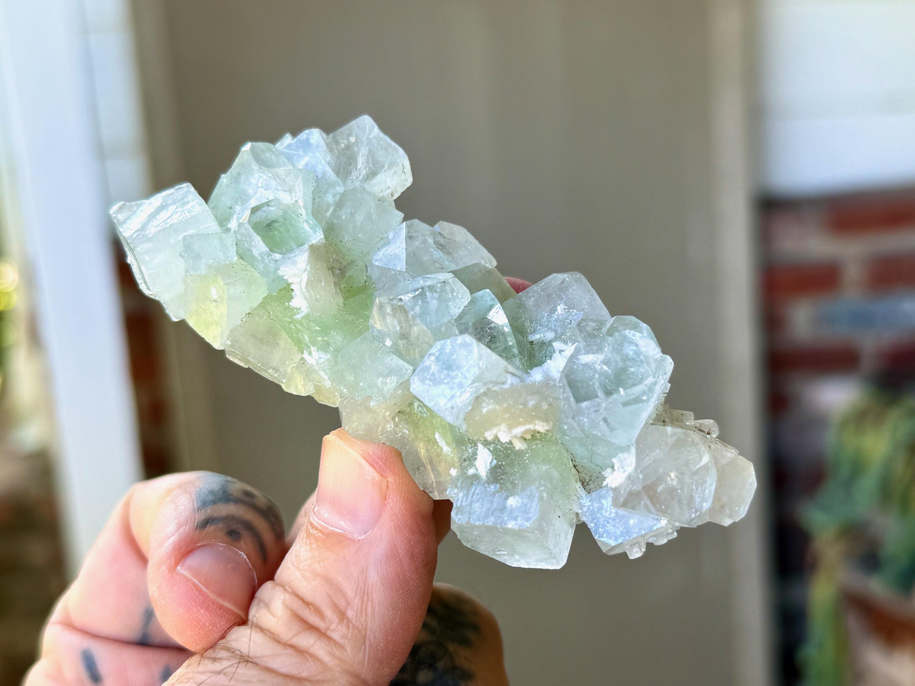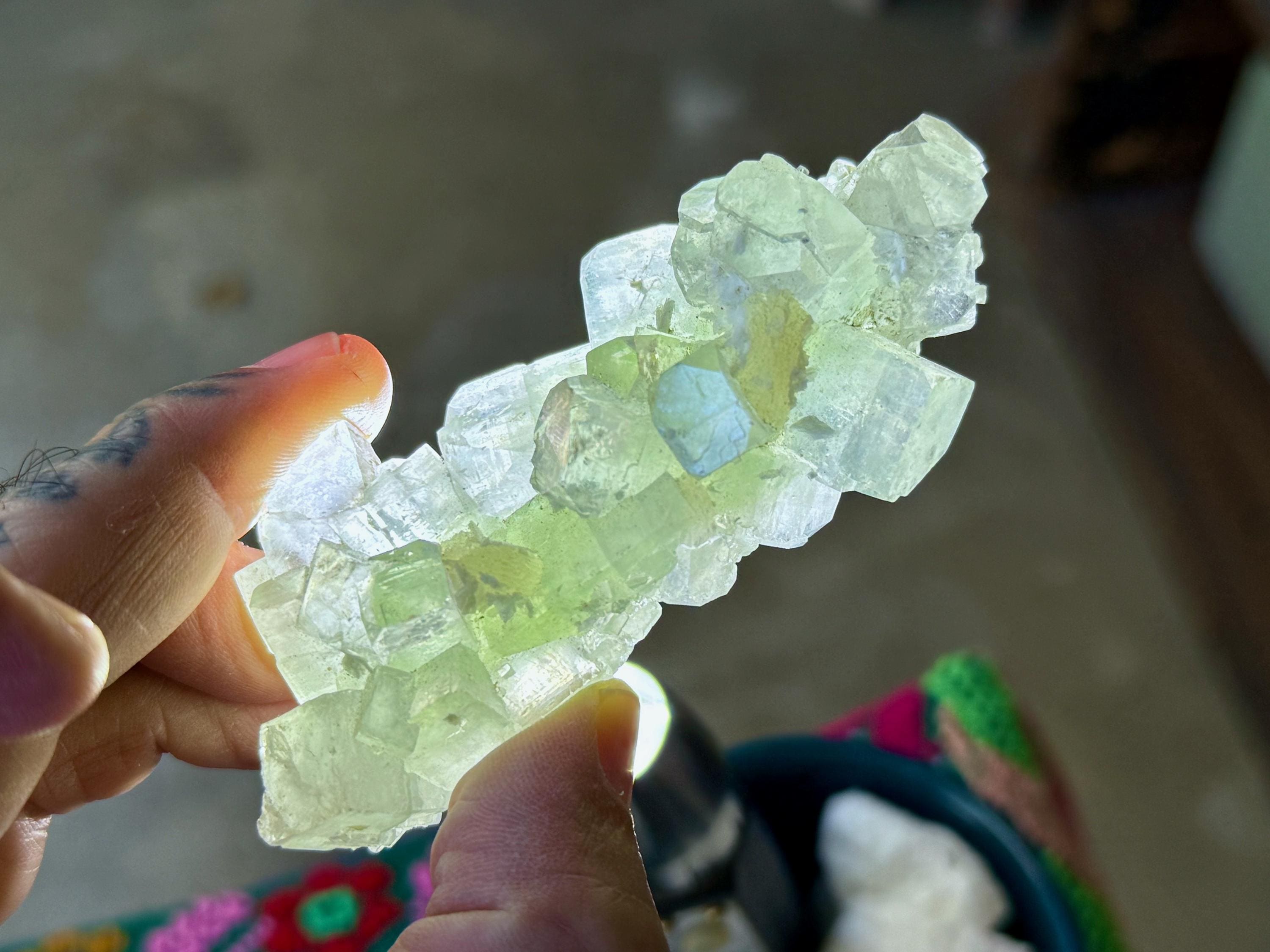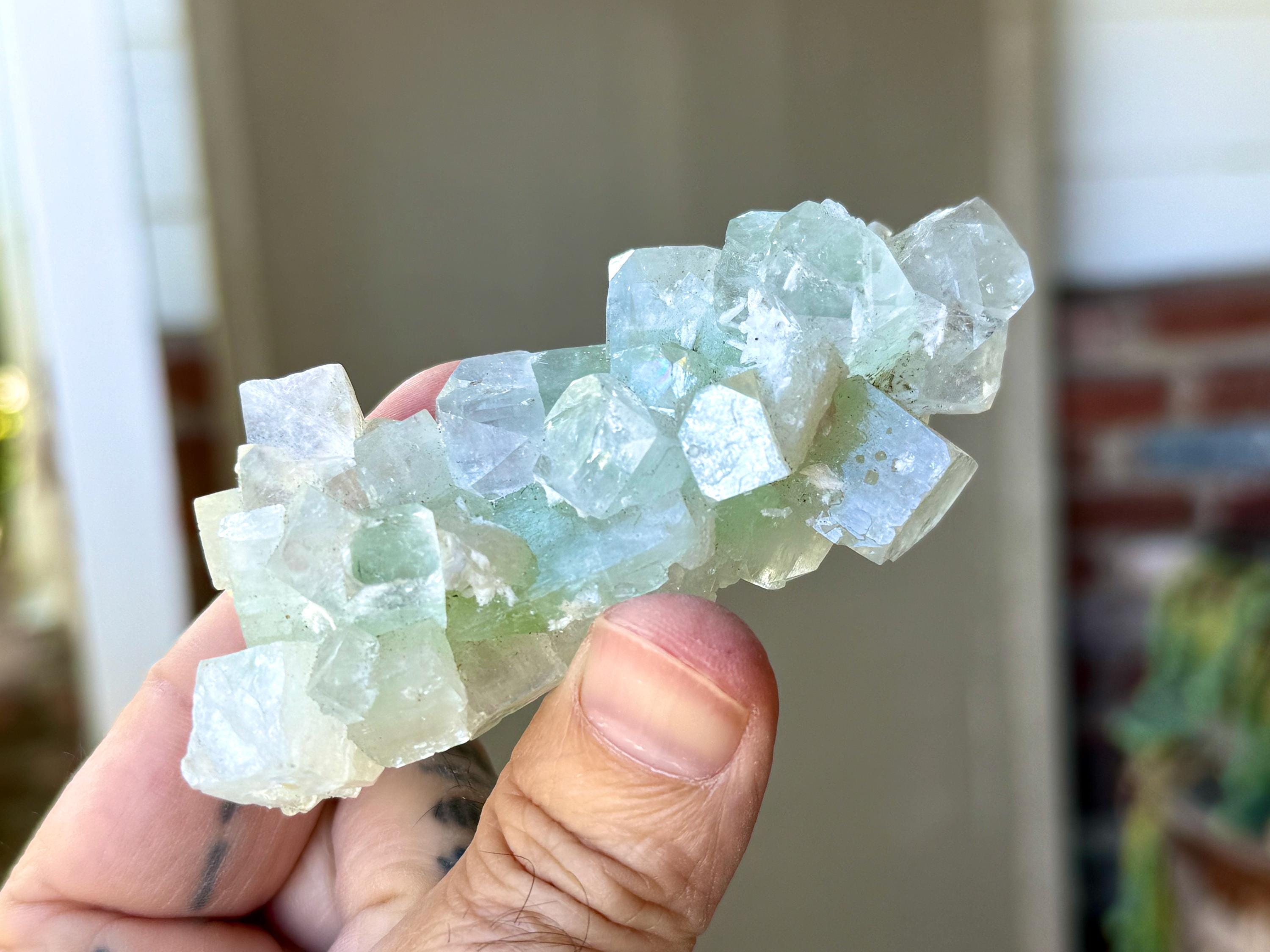 One of the last Green Apophyllite crystals from this collection, this is a sparkling cluster chain that looks to us like a bunch of crystalline grapes, with gorgeous naturally cubic crystals in shapes of clear and pale green. A true "disco ball" for sure. The color is beautiful and the photos just don't quite capture the sparkle of this one. Really lovely with great terminations. There's also a bit of a definitive "base" for this piece that is flat, allowing it to sit perfectly for display as pictured.
