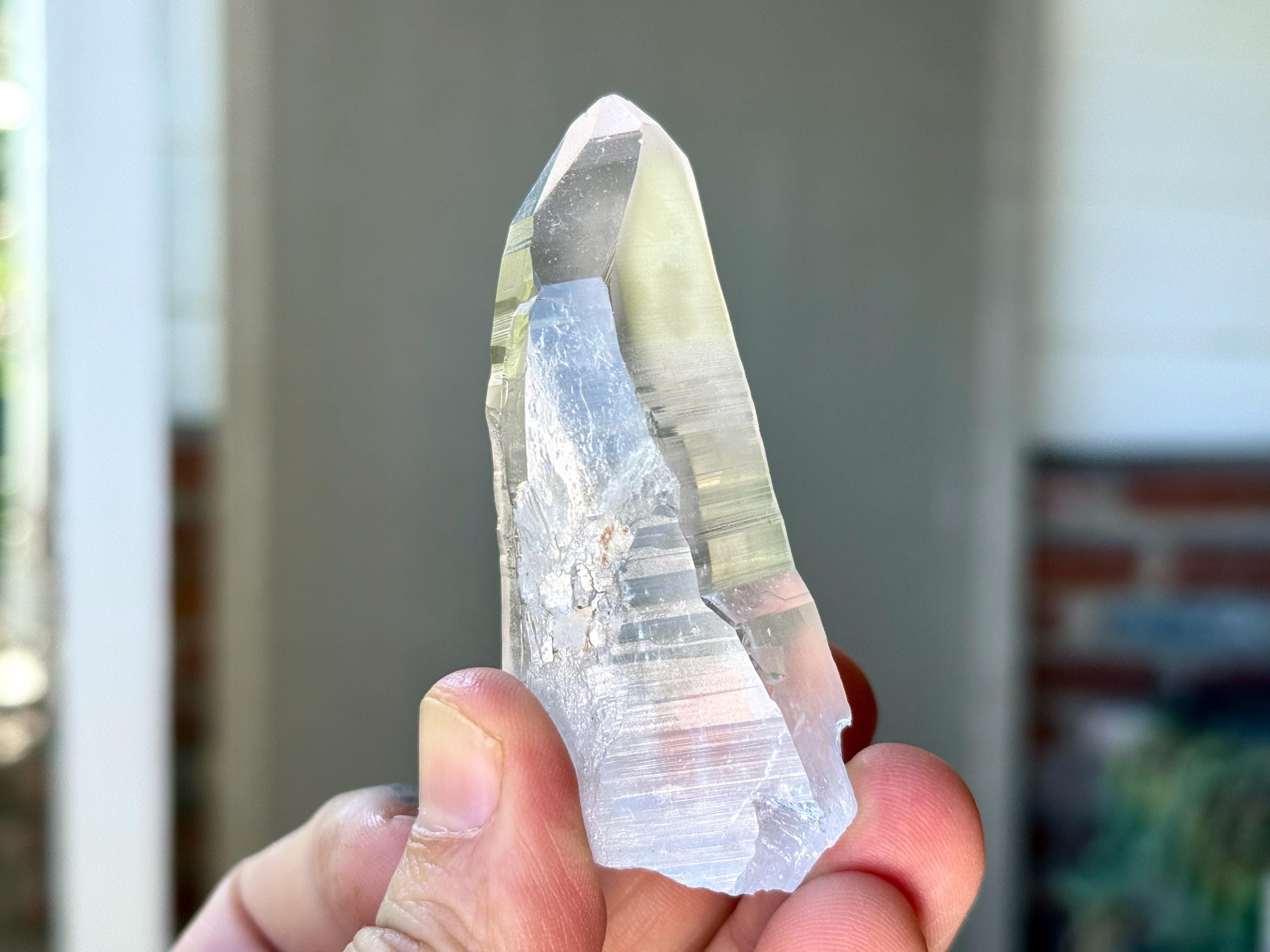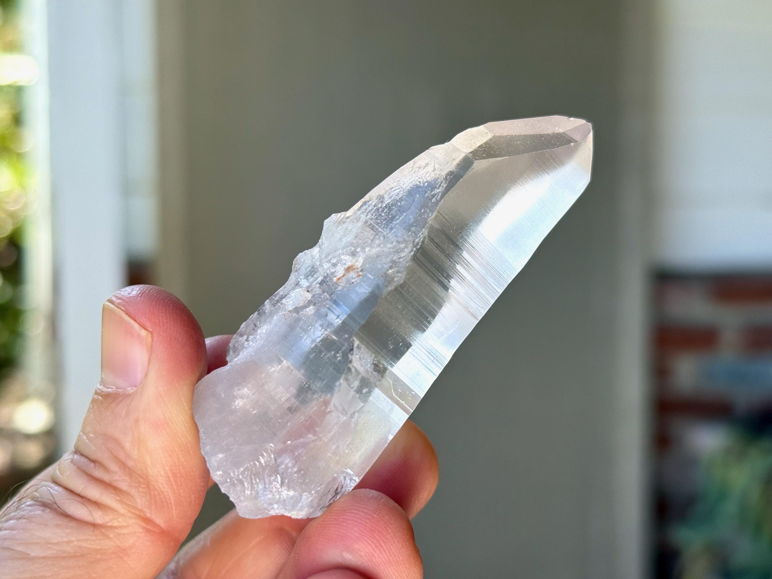 One of the best of the best! Water-clear clarity and brilliant luster to this Blue Needle Lemurian with very well defined ridges and striations on its sides. This piece has a self-healed indication that runs from the base on the left to the front of the body.
