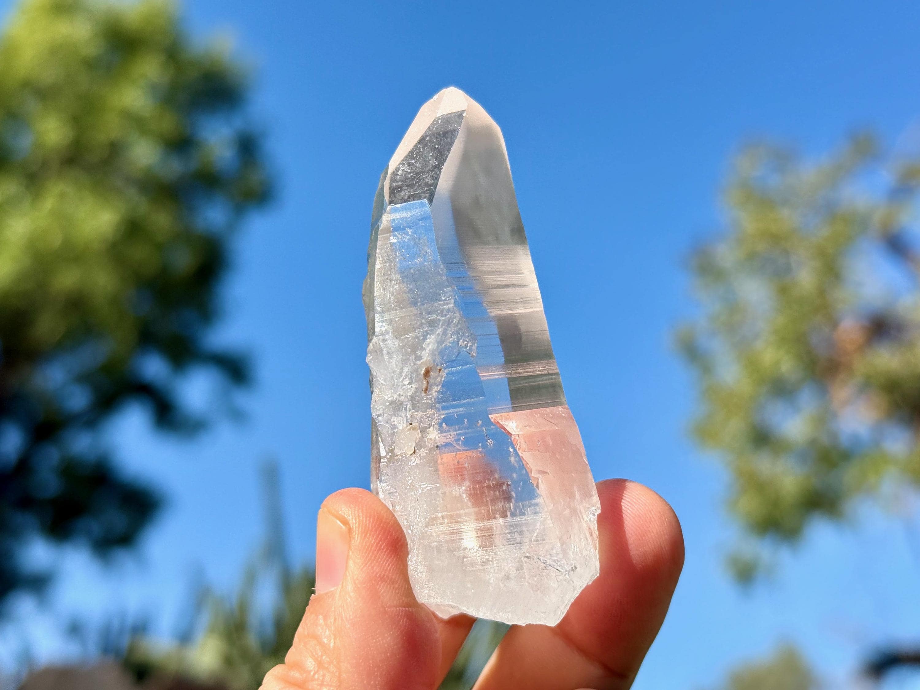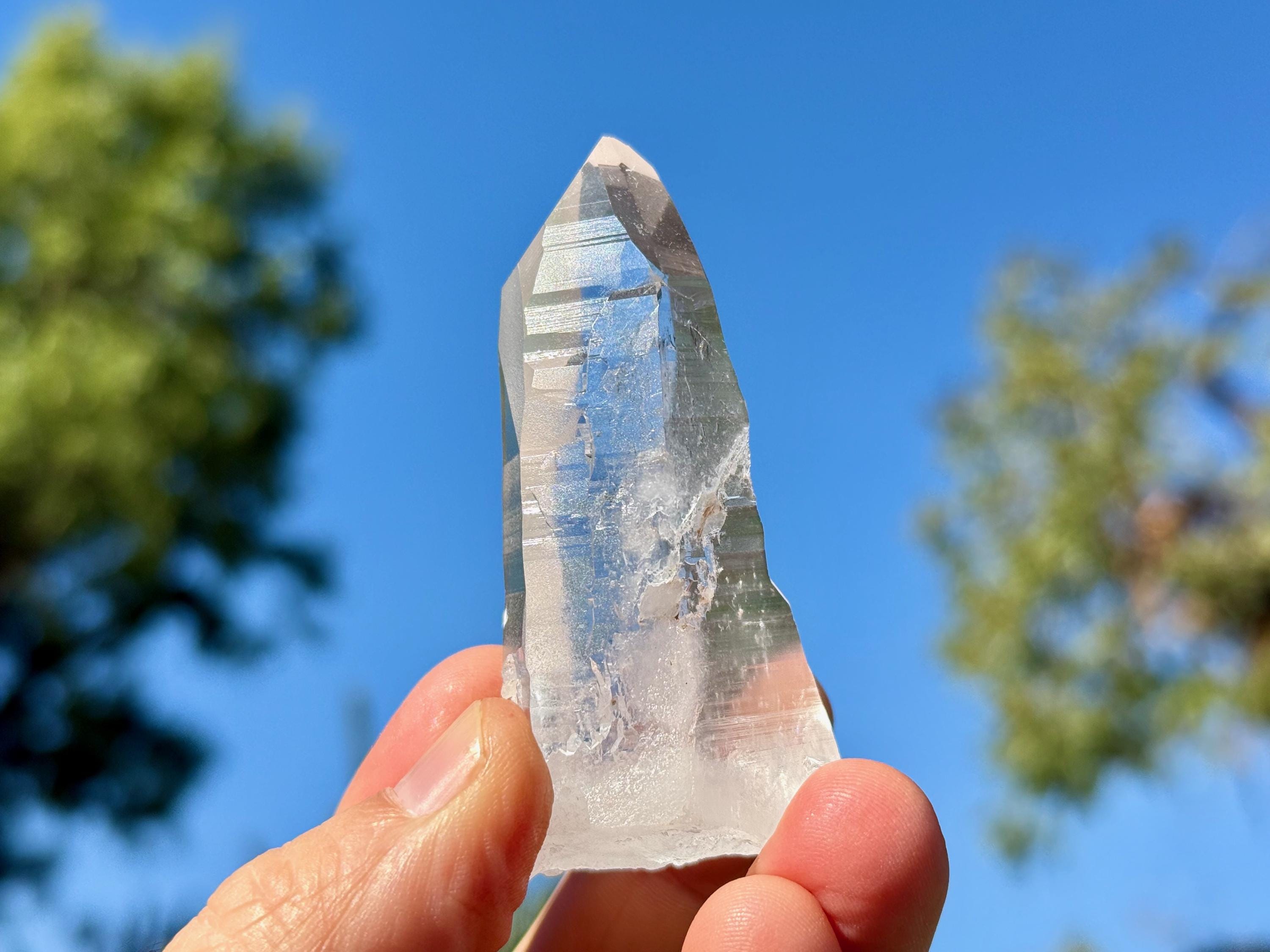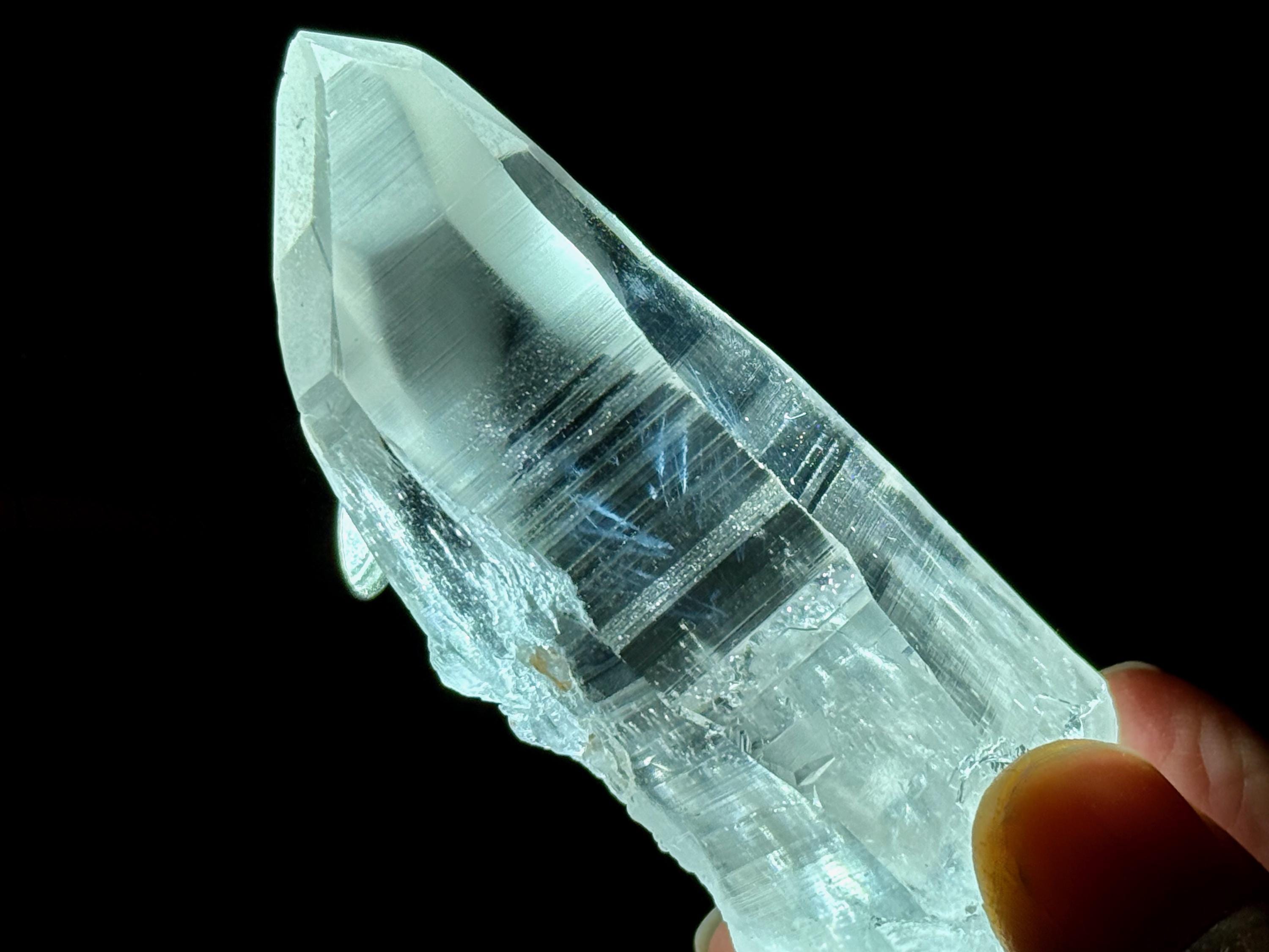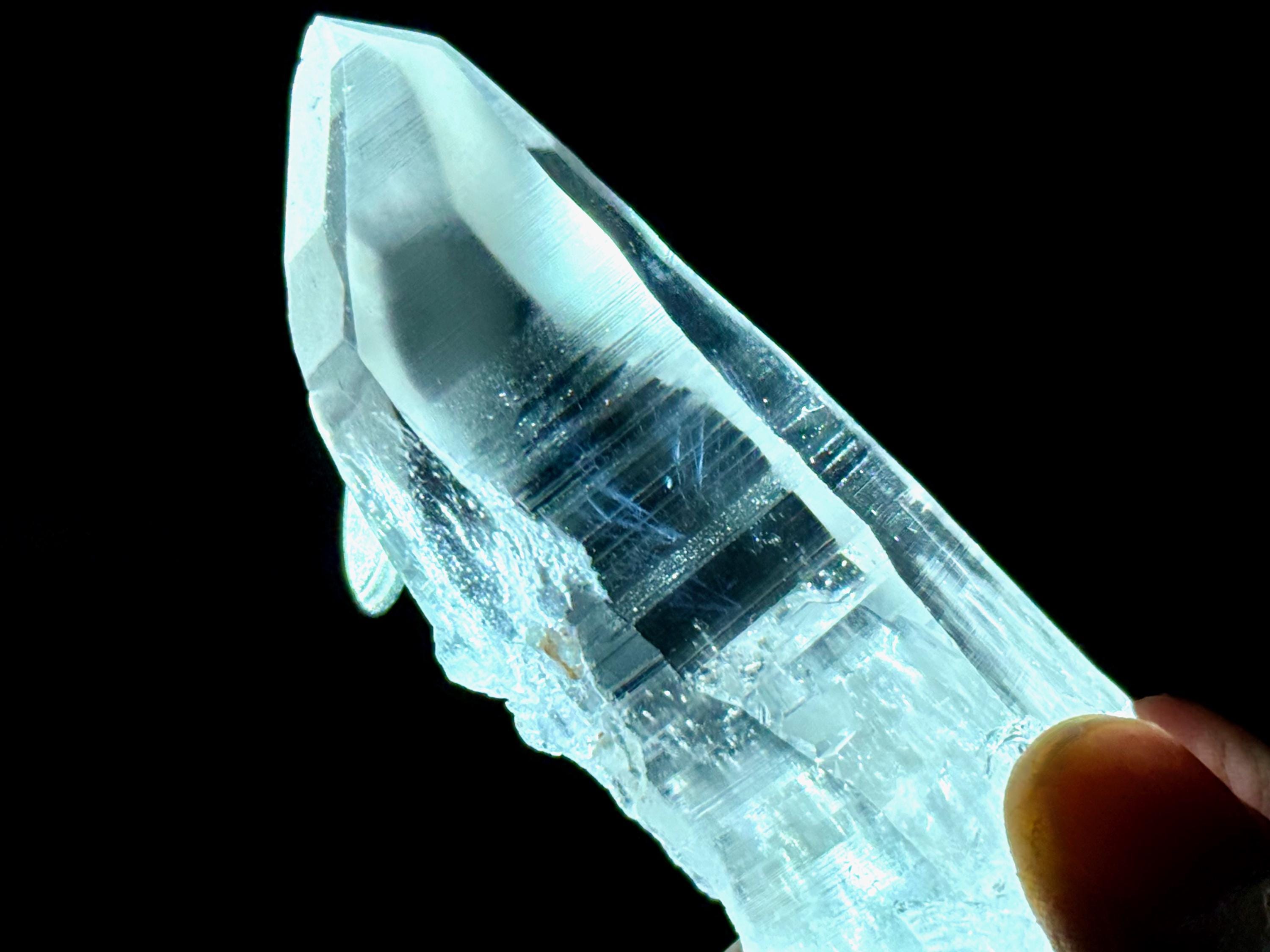Blue Needle Lemurians exhibit a unique phenomenon that causes the appearance of blue needle-like inclusions within. In actuality, these are not physical inclusions, but instead thin tubes of gas suspended within, formed naturally inside the crystal over hundreds of millions of years during the crystal's formation. When light is shone on them from the exact right angle, they glow a ghostly blue color (some say due to the Tyndall Effect).