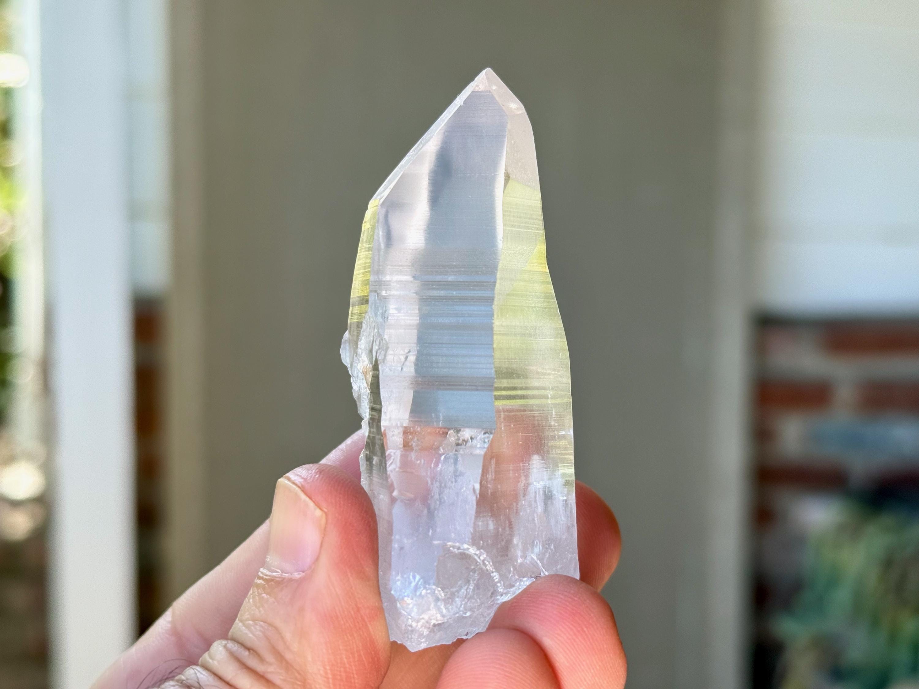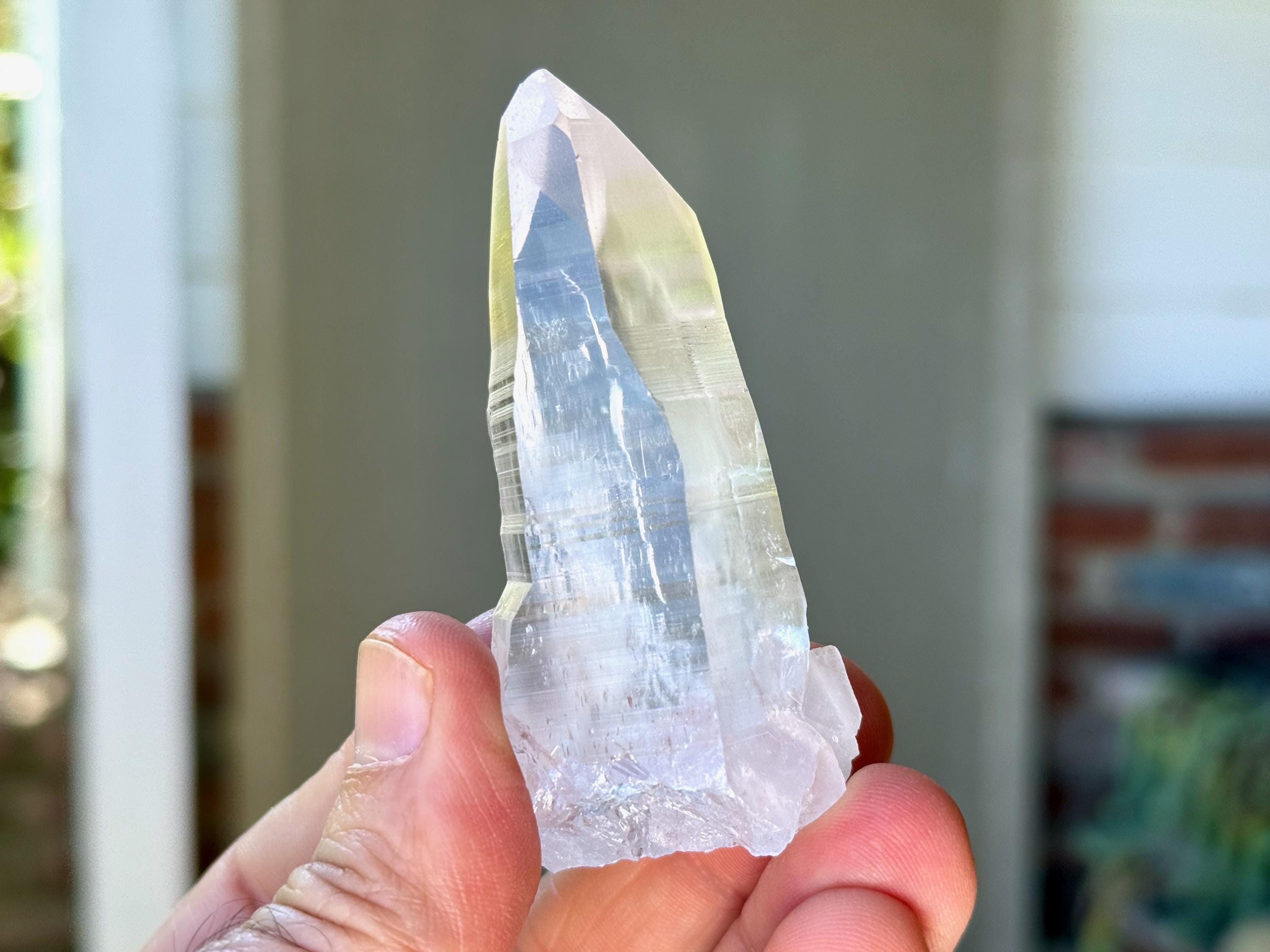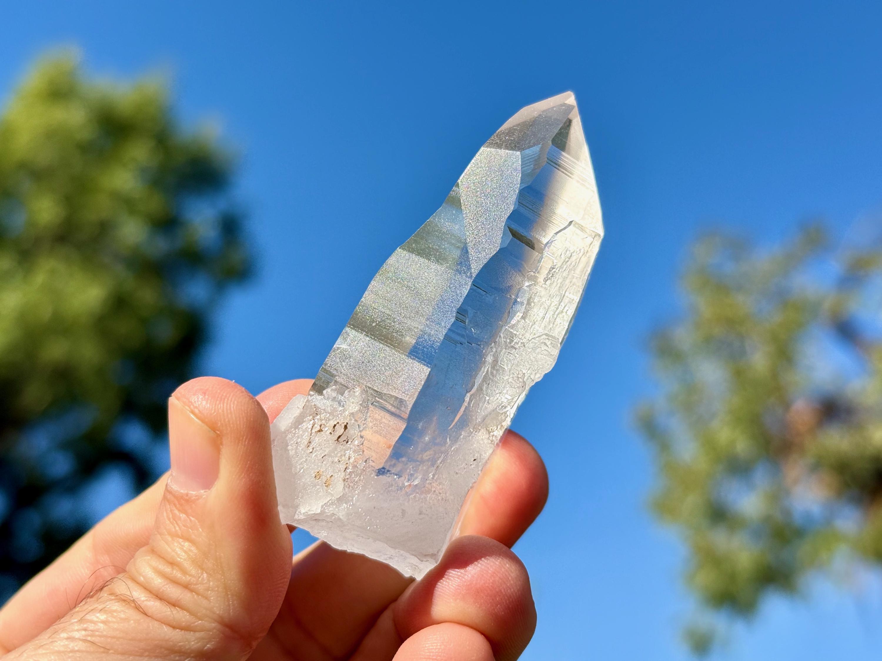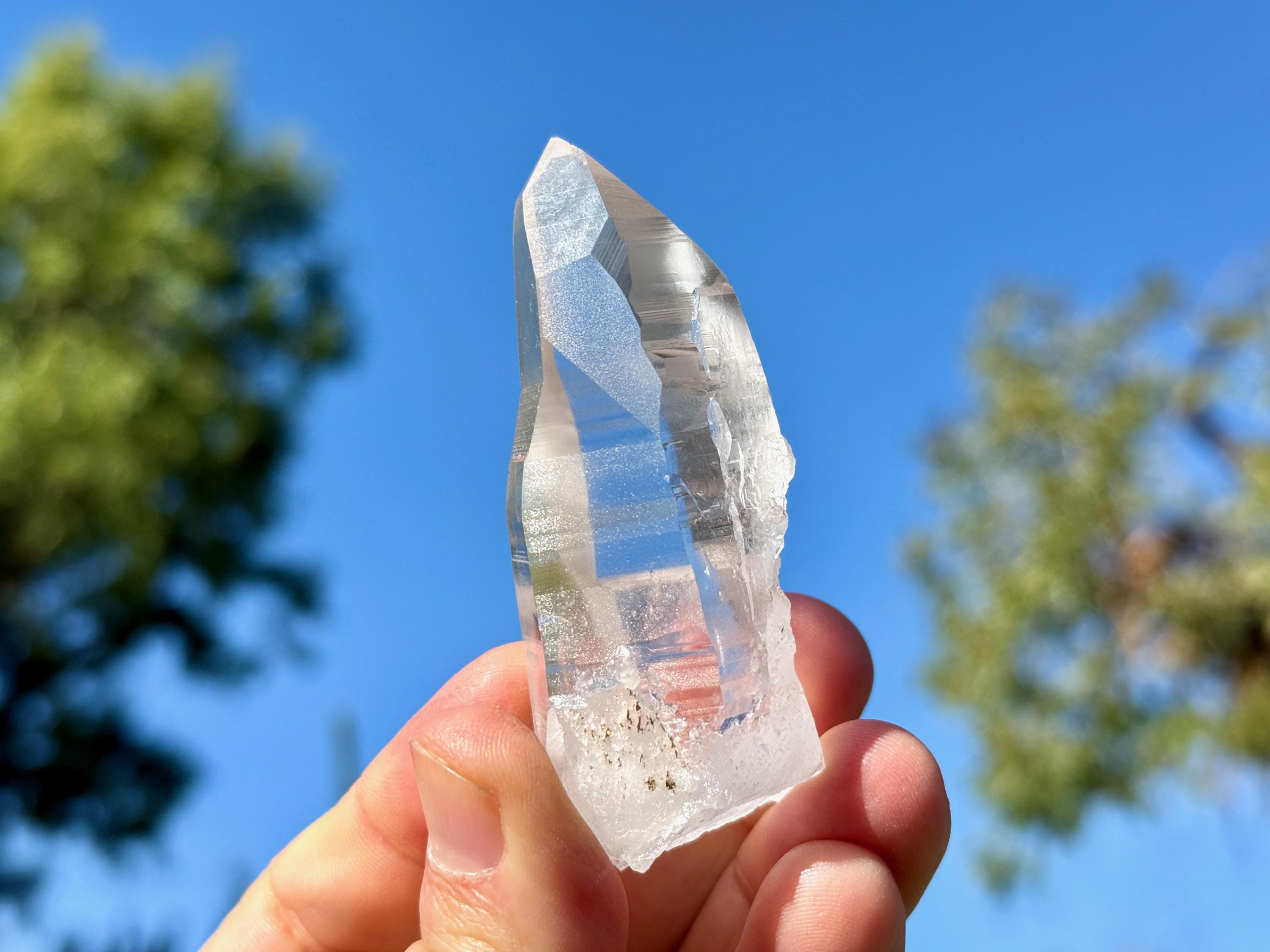 Blue Needle Lemurians exhibit a unique phenomenon that causes the appearance of blue needle-like inclusions within. In actuality, these are not physical inclusions, but instead thin tubes of gas suspended within, formed naturally inside the crystal over hundreds of millions of years during the crystal's formation. When light is shone on them from the exact right angle, they glow a ghostly blue color (some say due to the Tyndall Effect).
