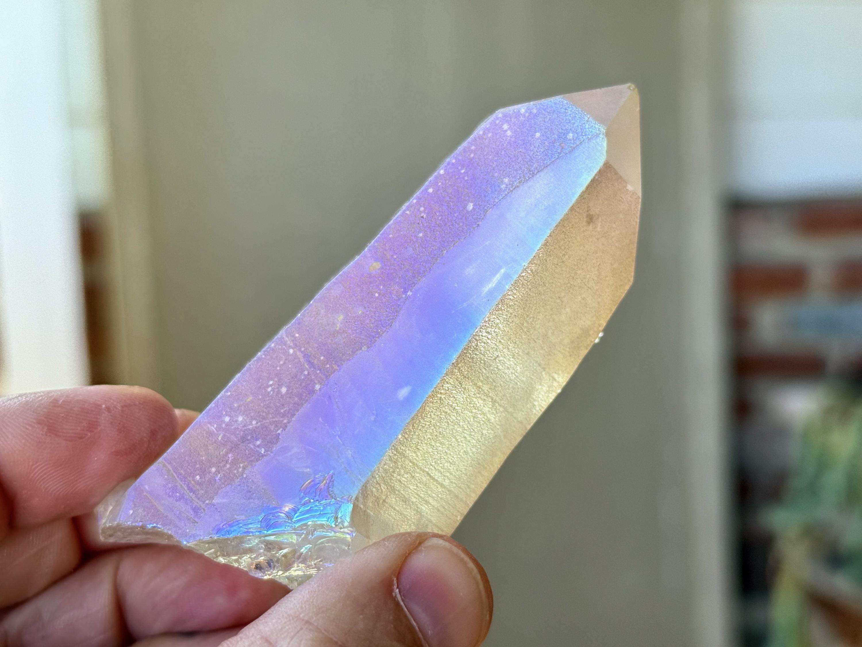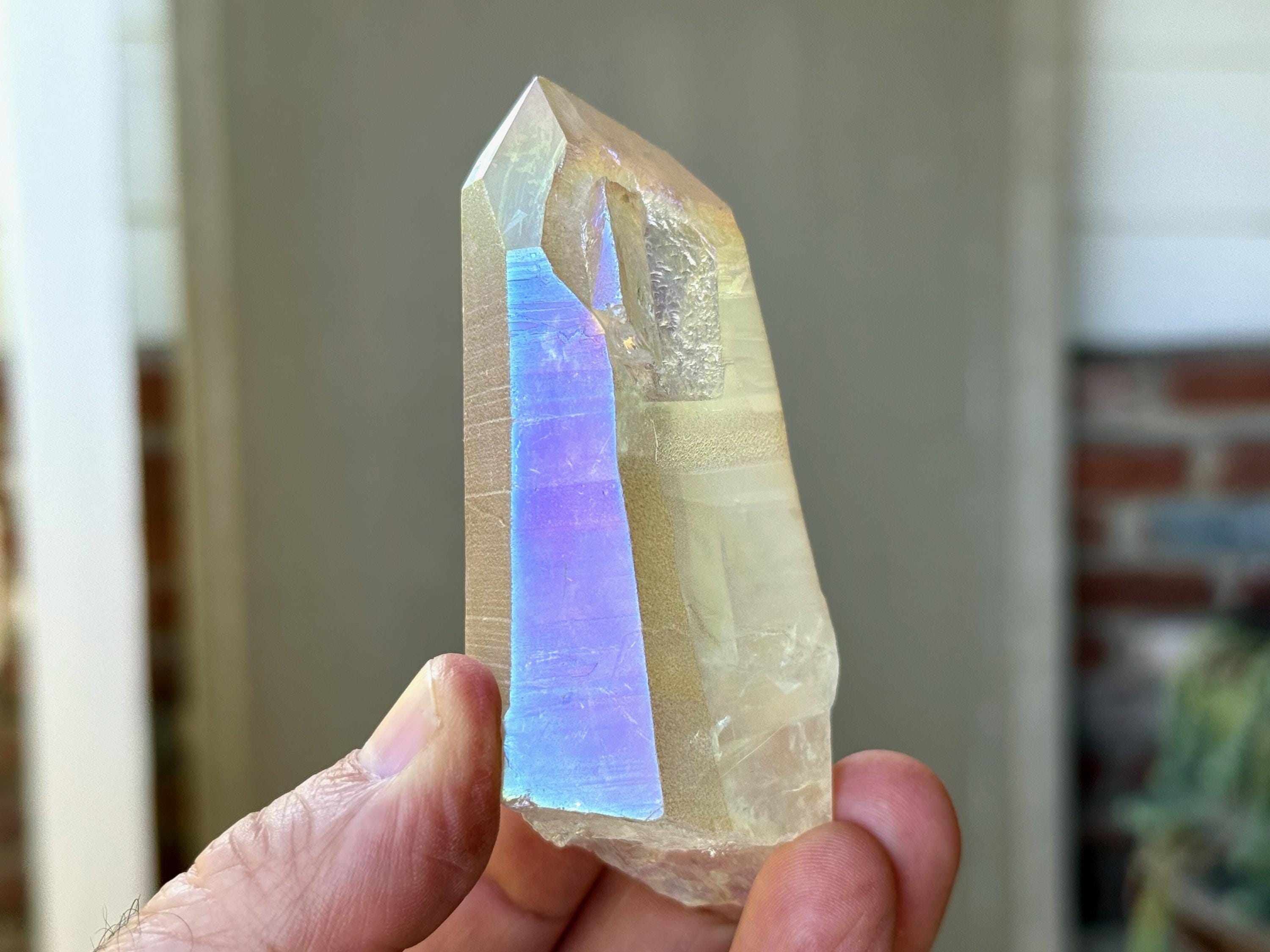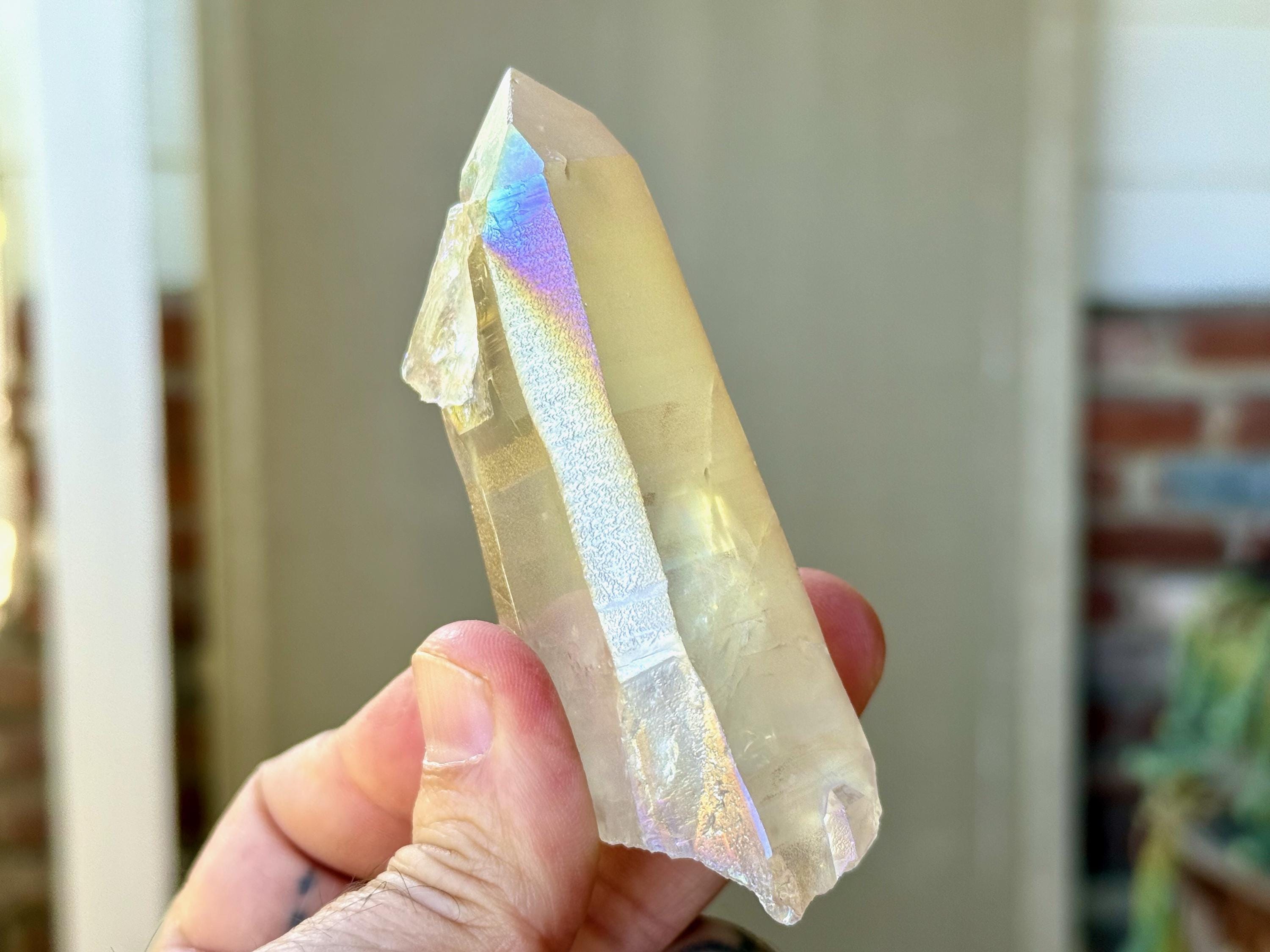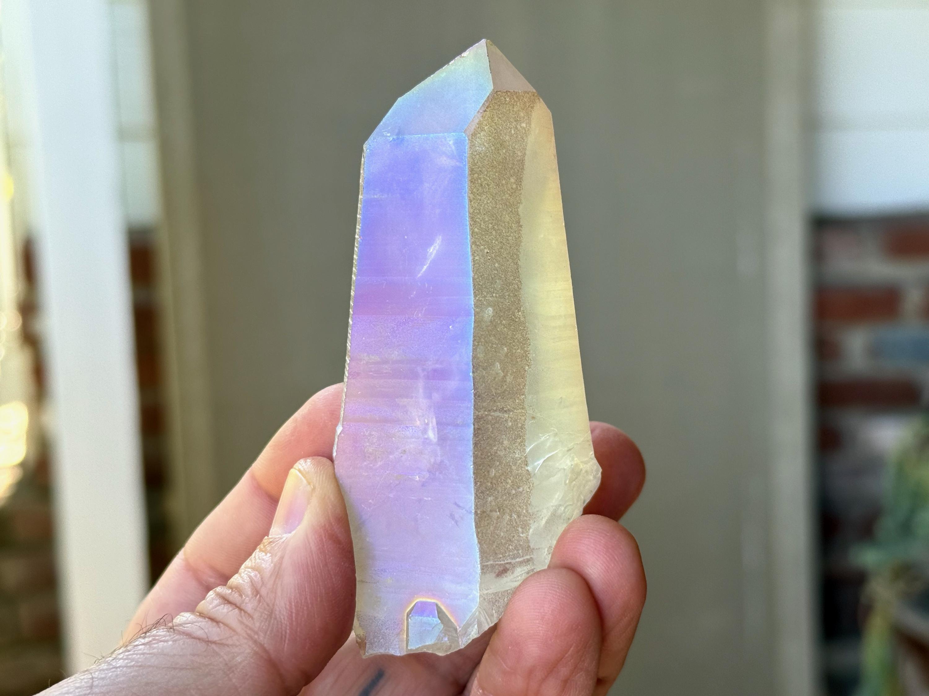 This stunning Opal Aura Lemurian Quartz comes from an old collection. Also known as "Angel Aura" Quartz, these crystals are the result of a lab process which bonds Platinum with, in this case, a high-quality Lemurian Quartz crystal from Minas Gerais, Brazil (many "aura" crystals begin with domestic quartz). The result is a heavenly opalescence, creating a truly ethereal, prismatic effect, while retaining all the physical and energetic features of the Lemurian itself. With the energetic properties of Platinum combined with the high vibration of Lemurian Quartz, these crystals are powerful healers, bringing cosmic consciousness into the physical realm to be integrated.