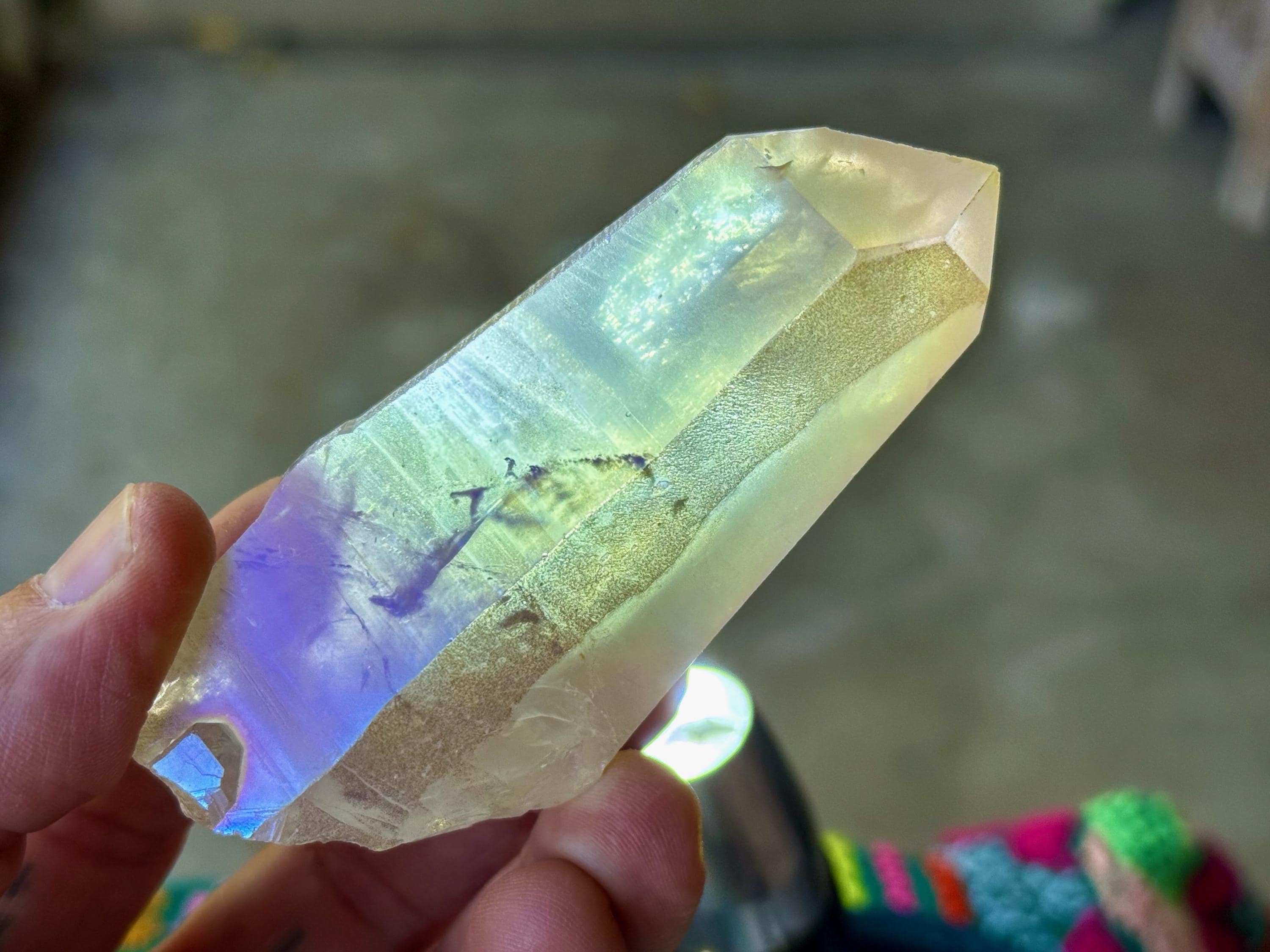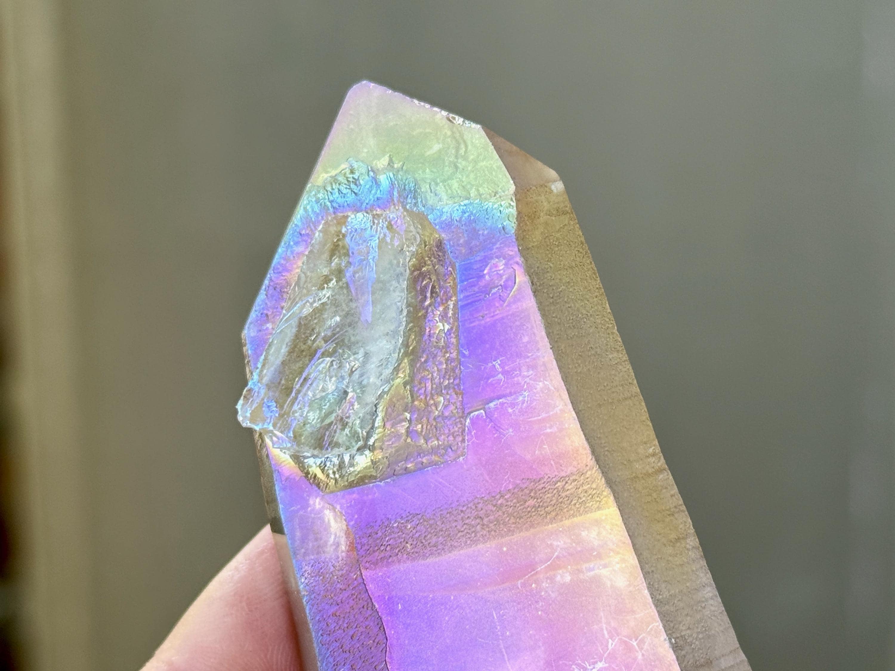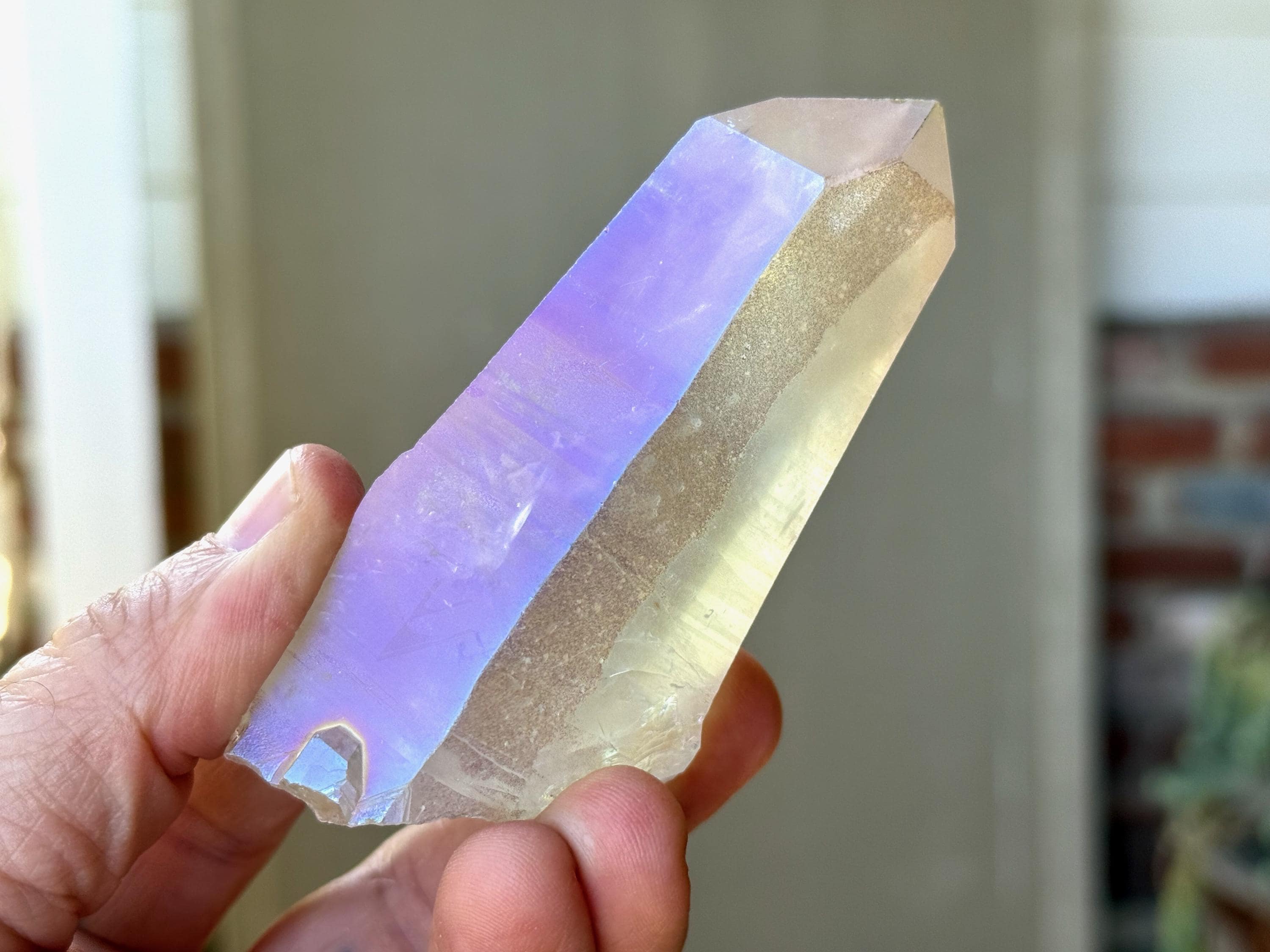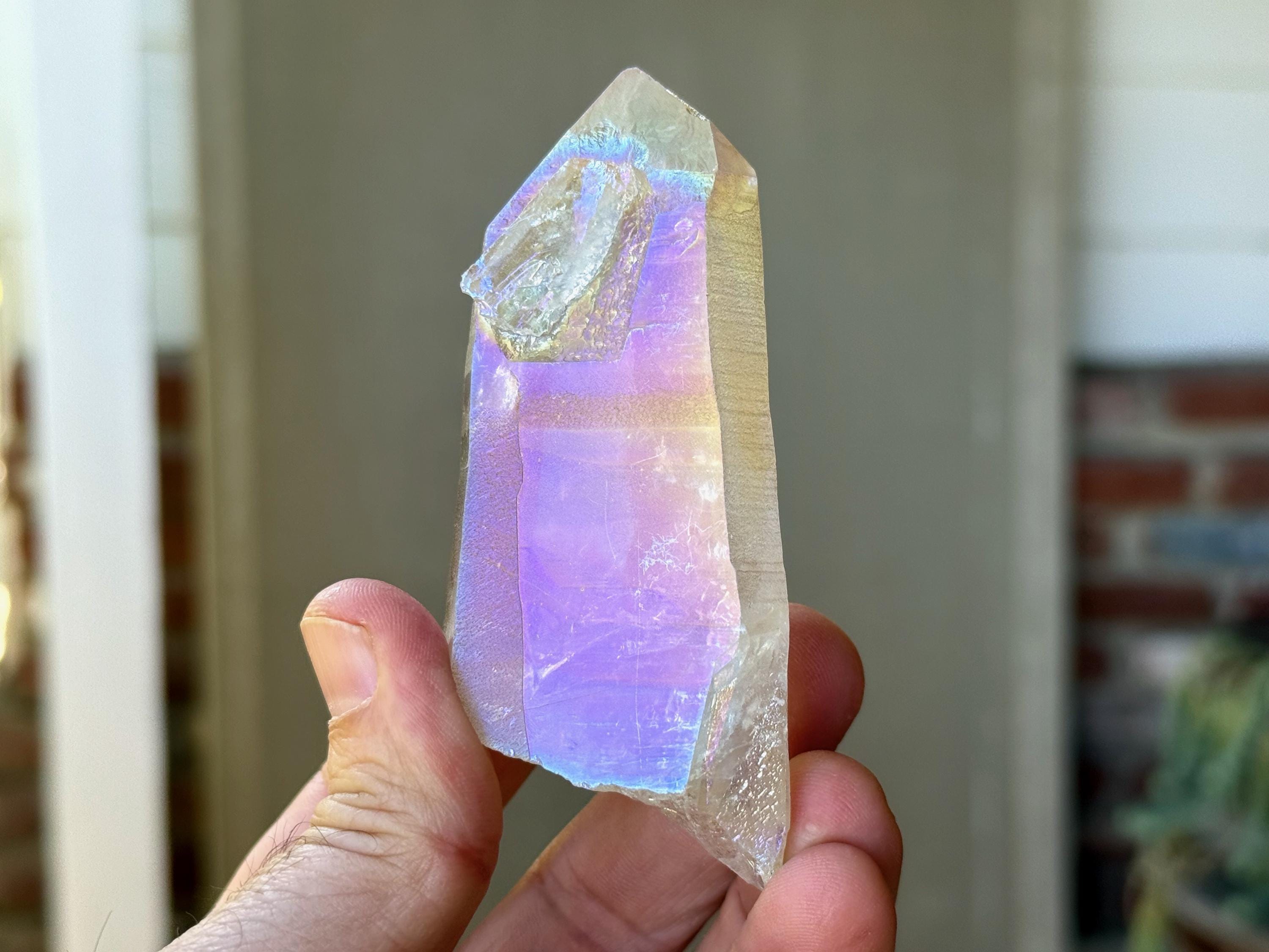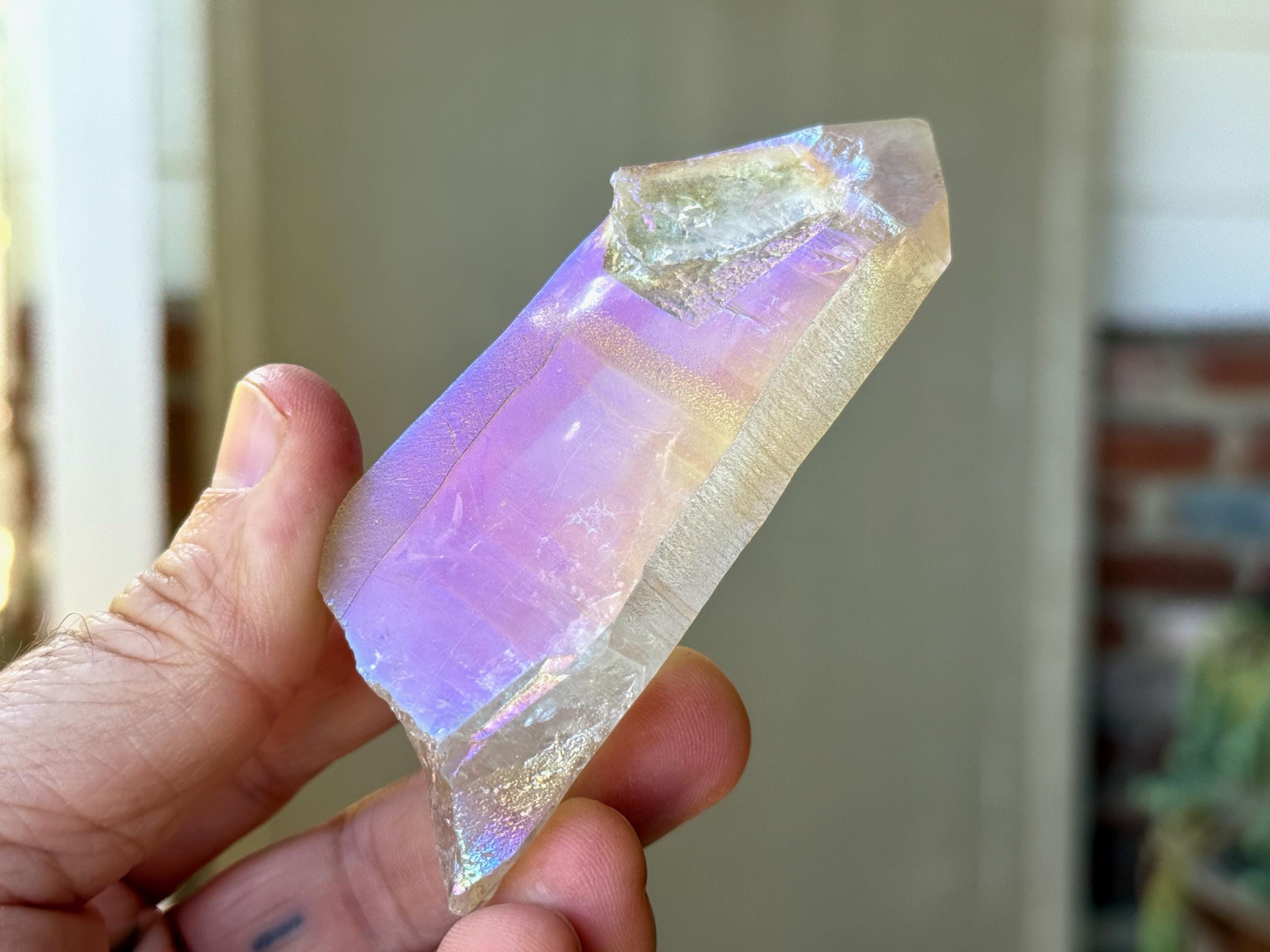 This stunning Opal Aura Lemurian Quartz comes from an old collection. Also known as "Angel Aura" Quartz, these crystals are the result of a lab process which bonds Platinum with, in this case, a high-quality Lemurian Quartz crystal from Minas Gerais, Brazil (many "aura" crystals begin with domestic quartz). The result is a heavenly opalescence, creating a truly ethereal, prismatic effect, while retaining all the physical and energetic features of the Lemurian itself. With the energetic properties of Platinum combined with the high vibration of Lemurian Quartz, these crystals are powerful healers, bringing cosmic consciousness into the physical realm to be integrated.