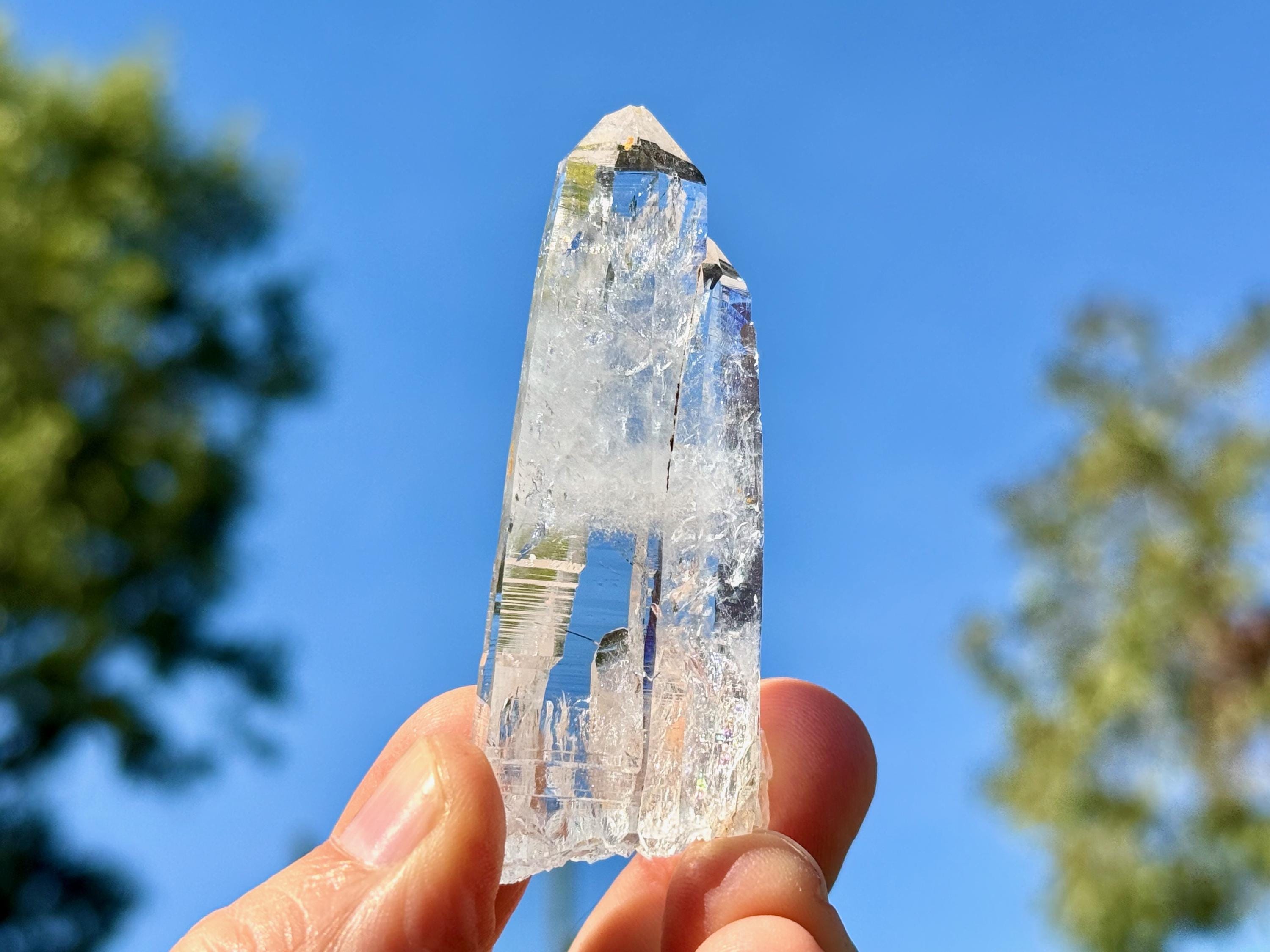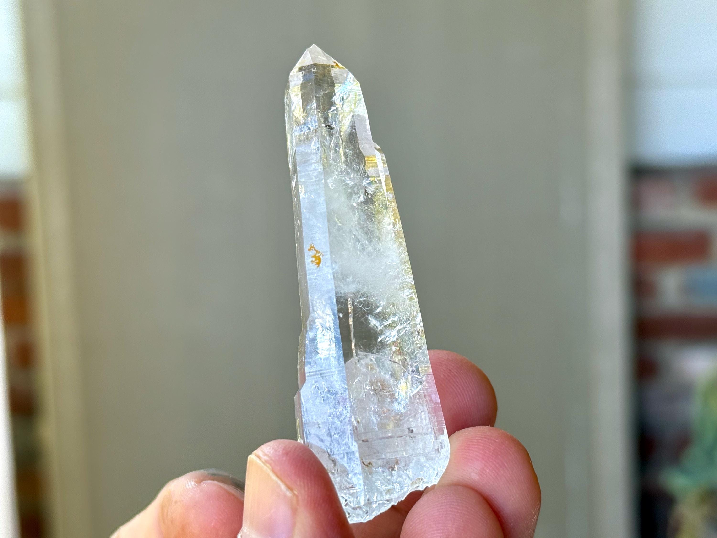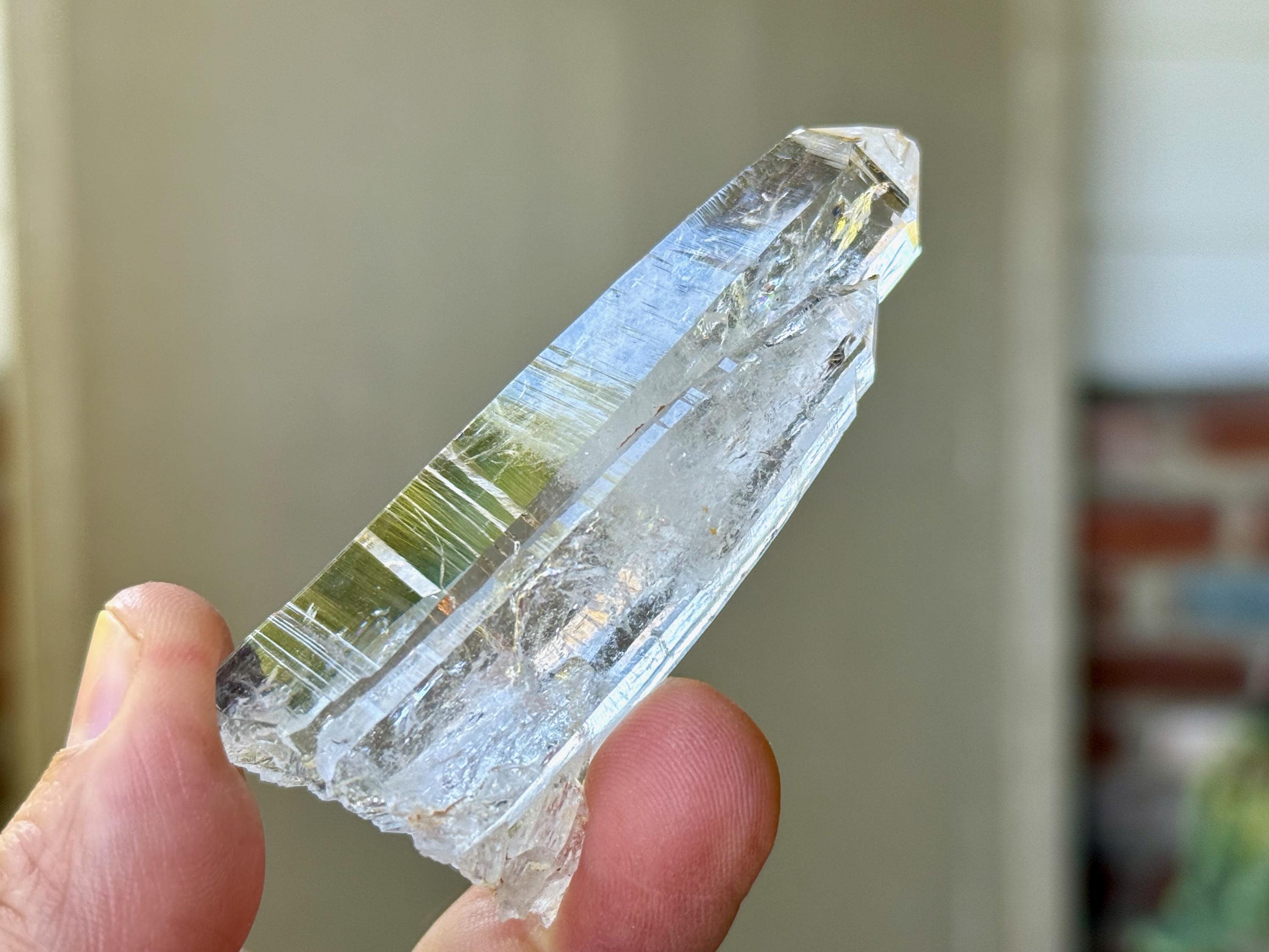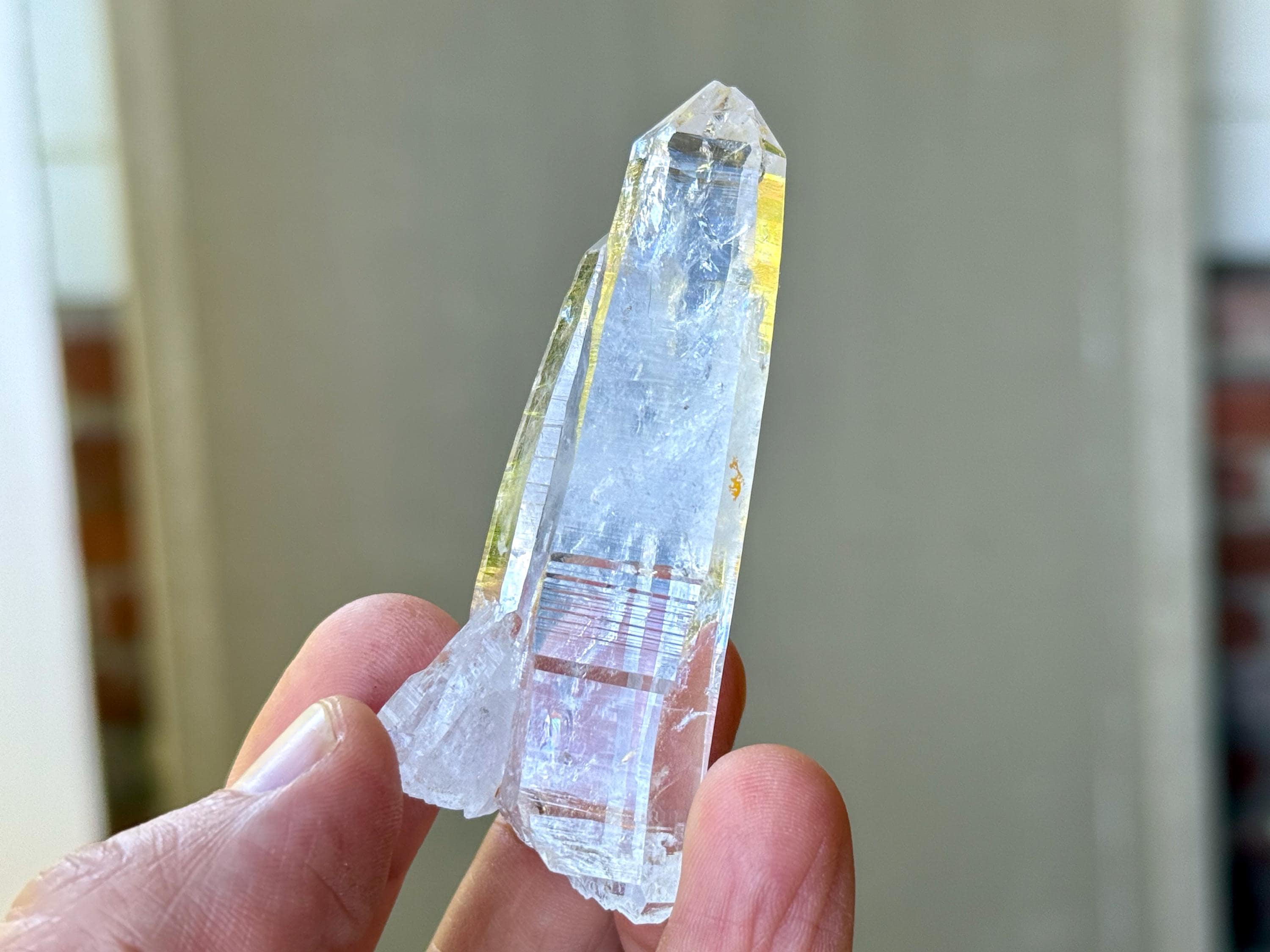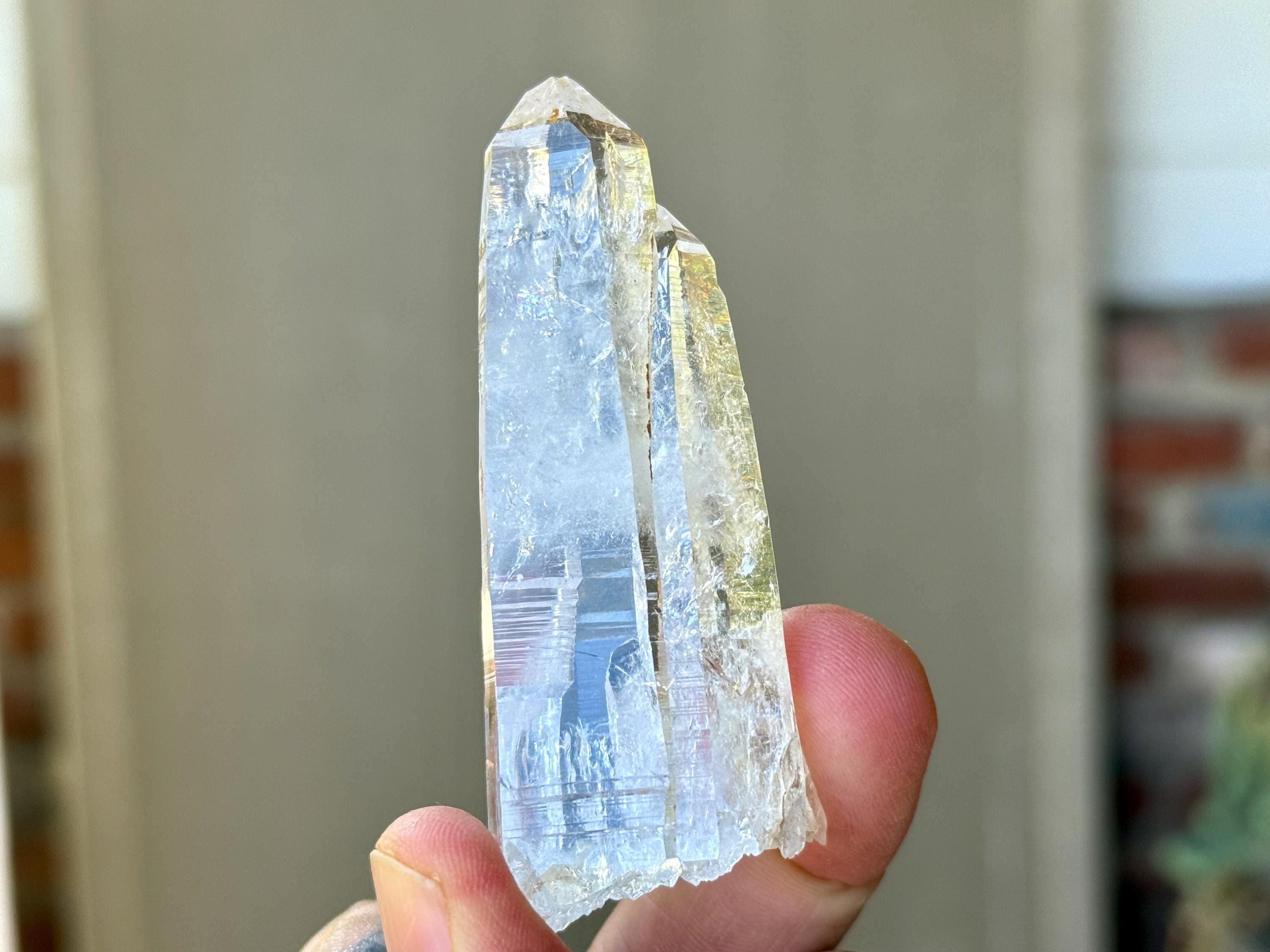 *Please note this crystal is clear and colorless. Any yellow hues in the photos are a result of the natural sunlight reflecting off the crystal.