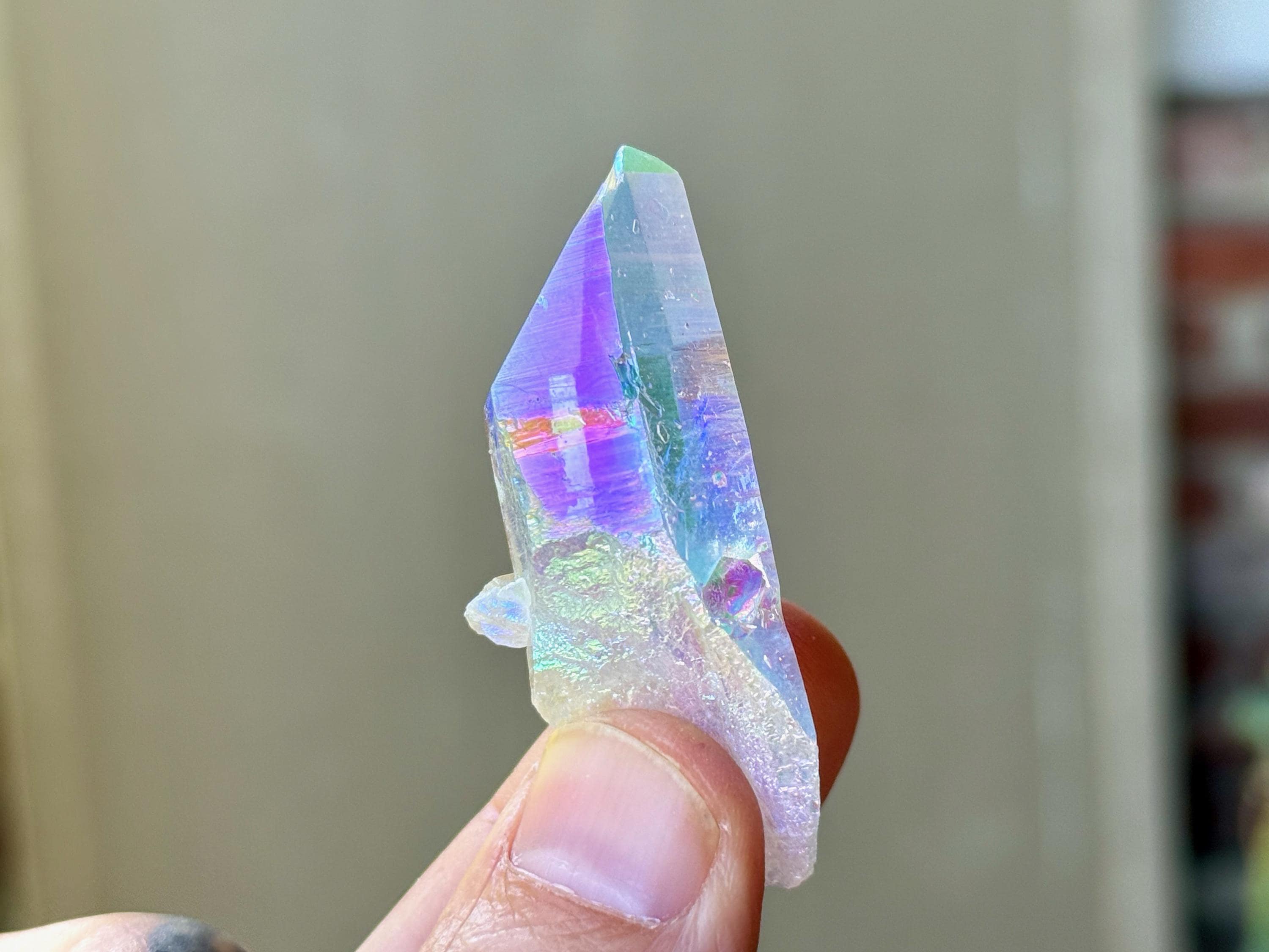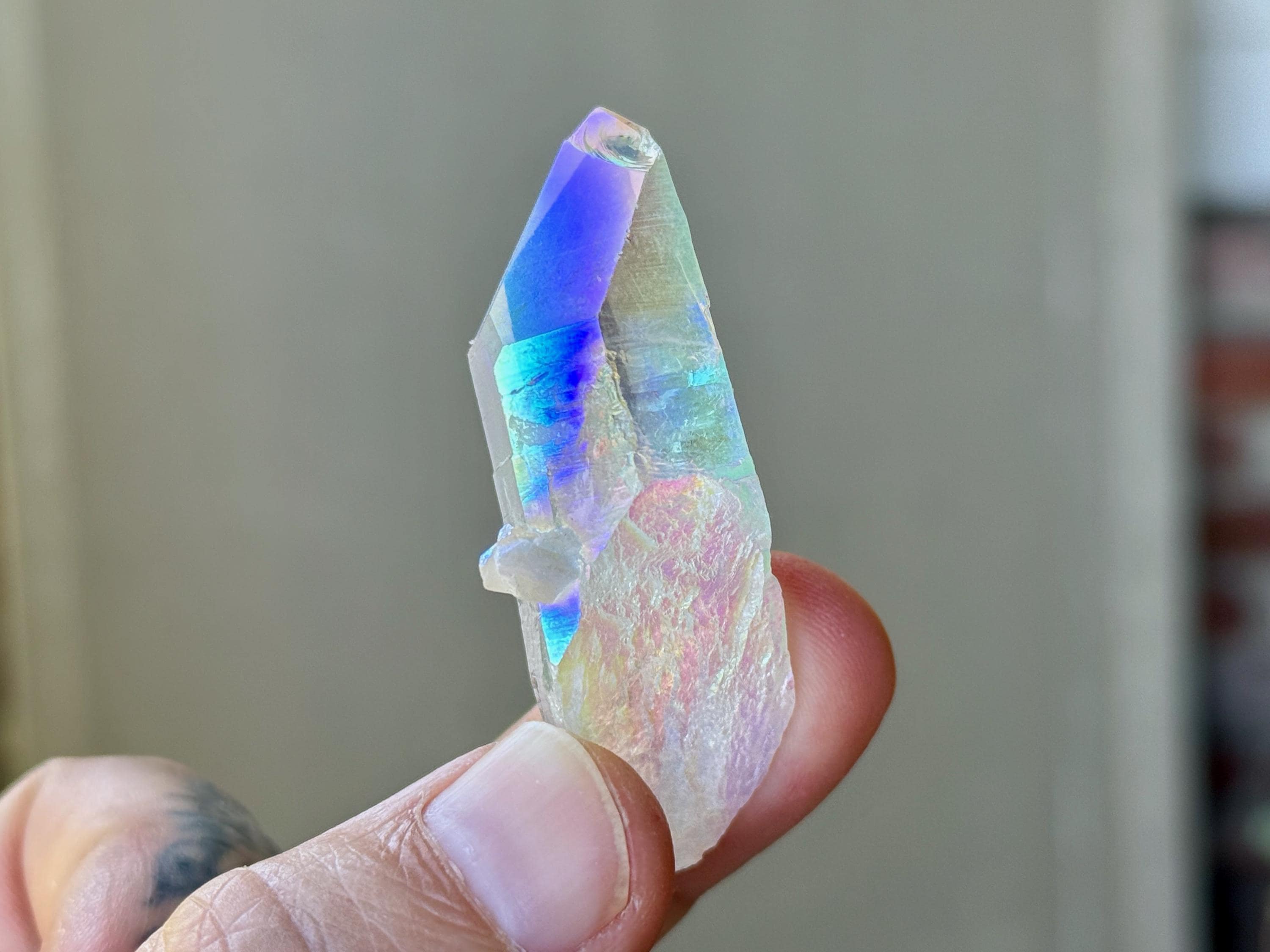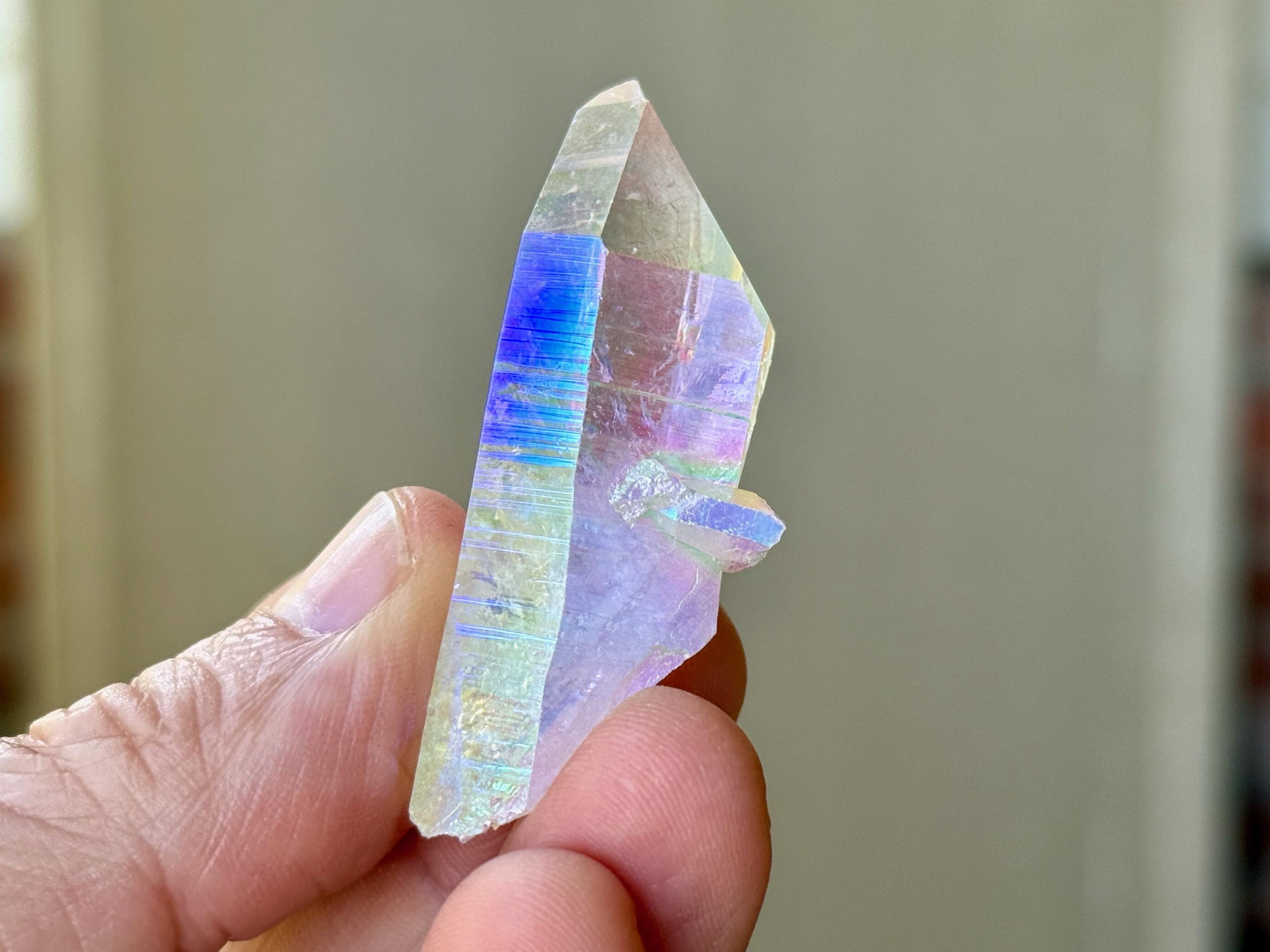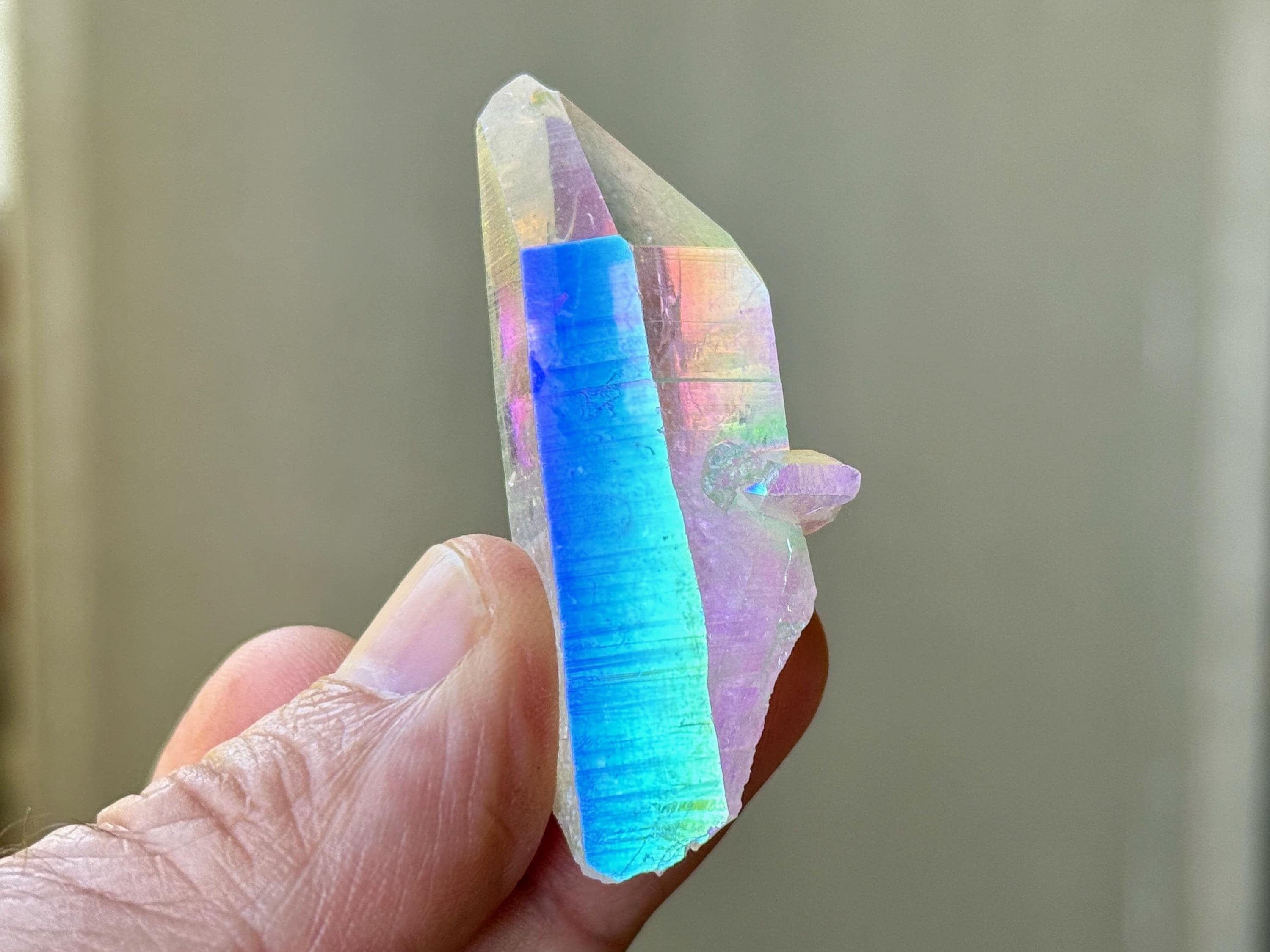 This superb Opal Aura Lemurian Quartz comes from an old collection. Also known as "Angel Aura" Quartz, these crystals are the result of a lab process which bonds Platinum with, in this case, a very high-quality Lemurian Quartz crystal from Minas Gerais, Brazil (many "aura" crystals begin with domestic quartz). The result is a heavenly opalescence, creating a truly ethereal, prismatic effect, while retaining all the physical and energetic features of the Lemurian itself. With the energetic properties of Platinum combined with the high vibration of Lemurian Quartz, these crystals are powerful healers, bringing cosmic consciousness into the physical realm to be integrated.