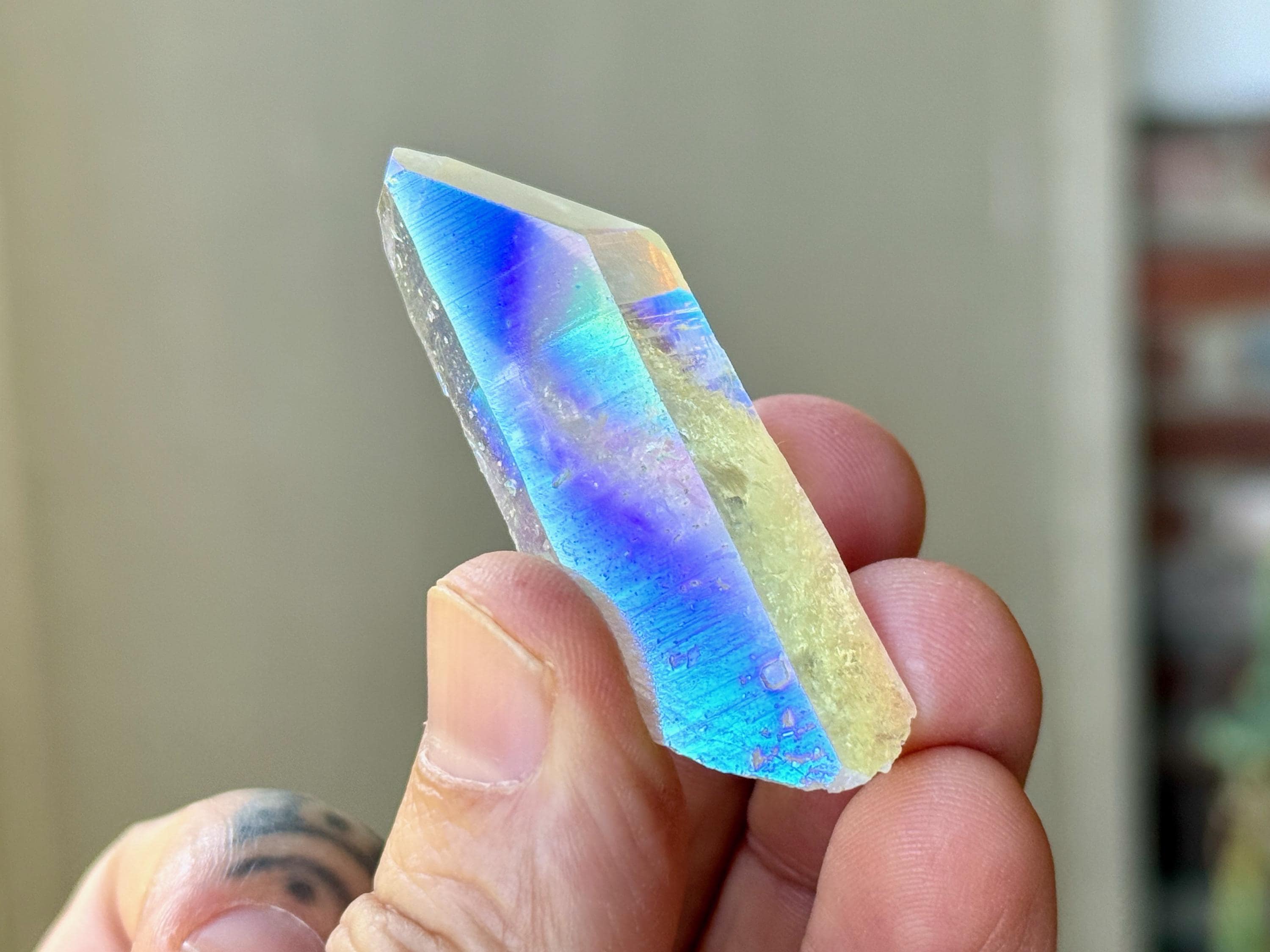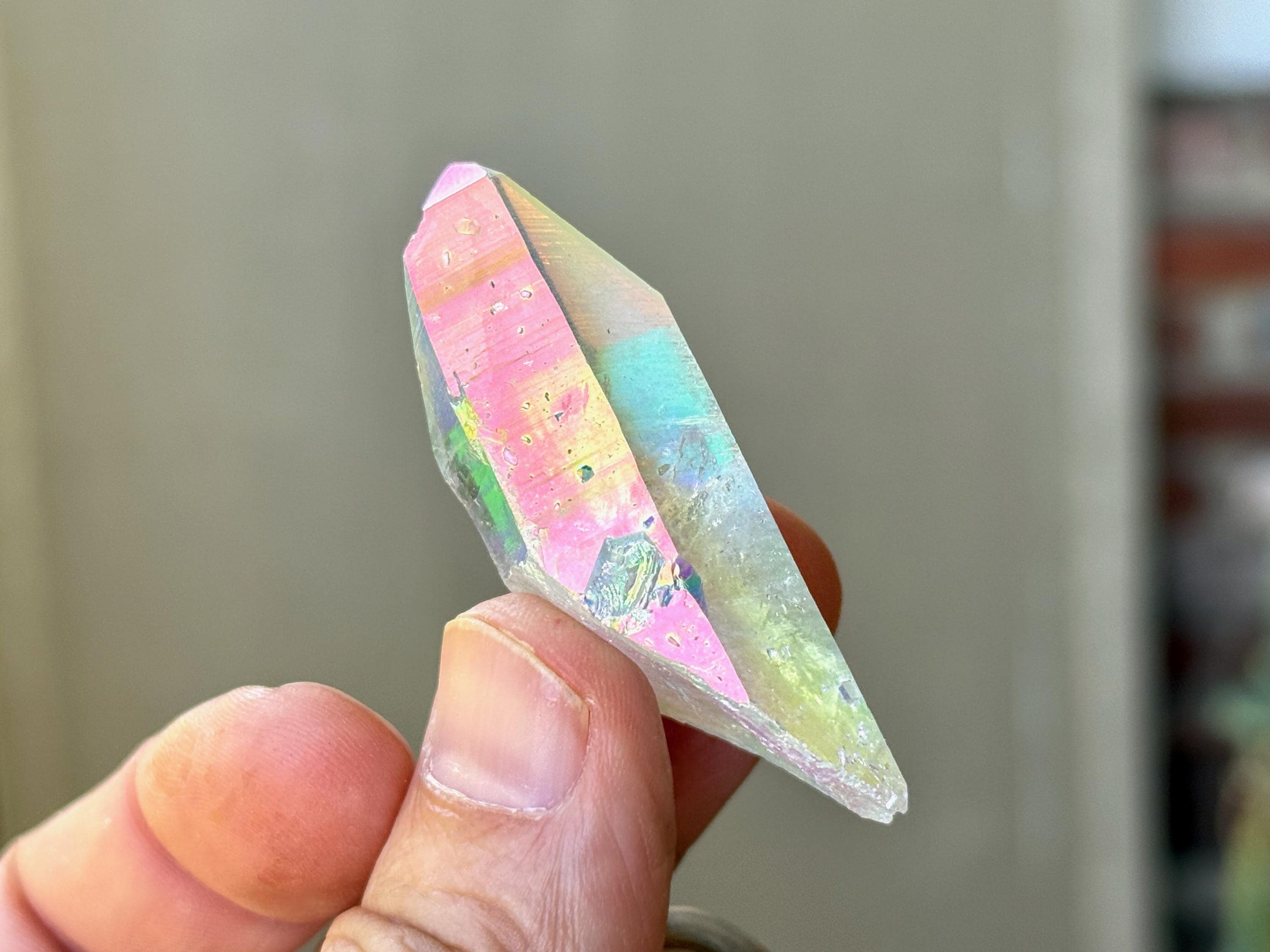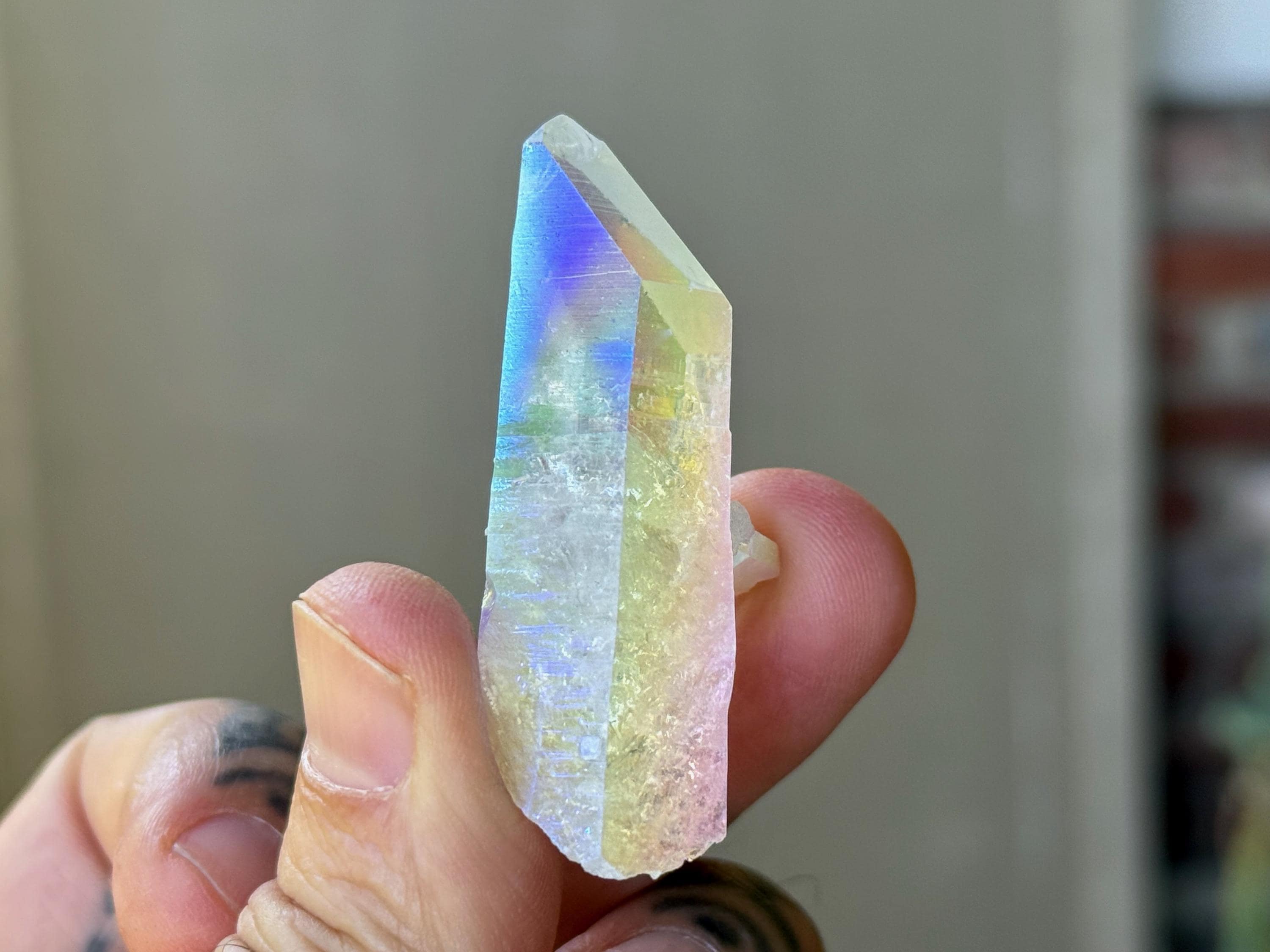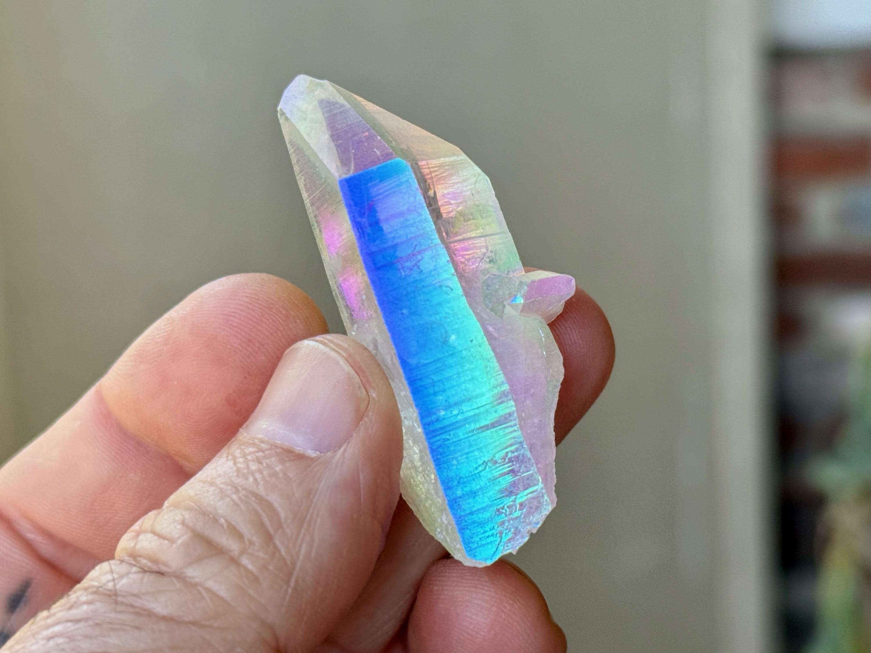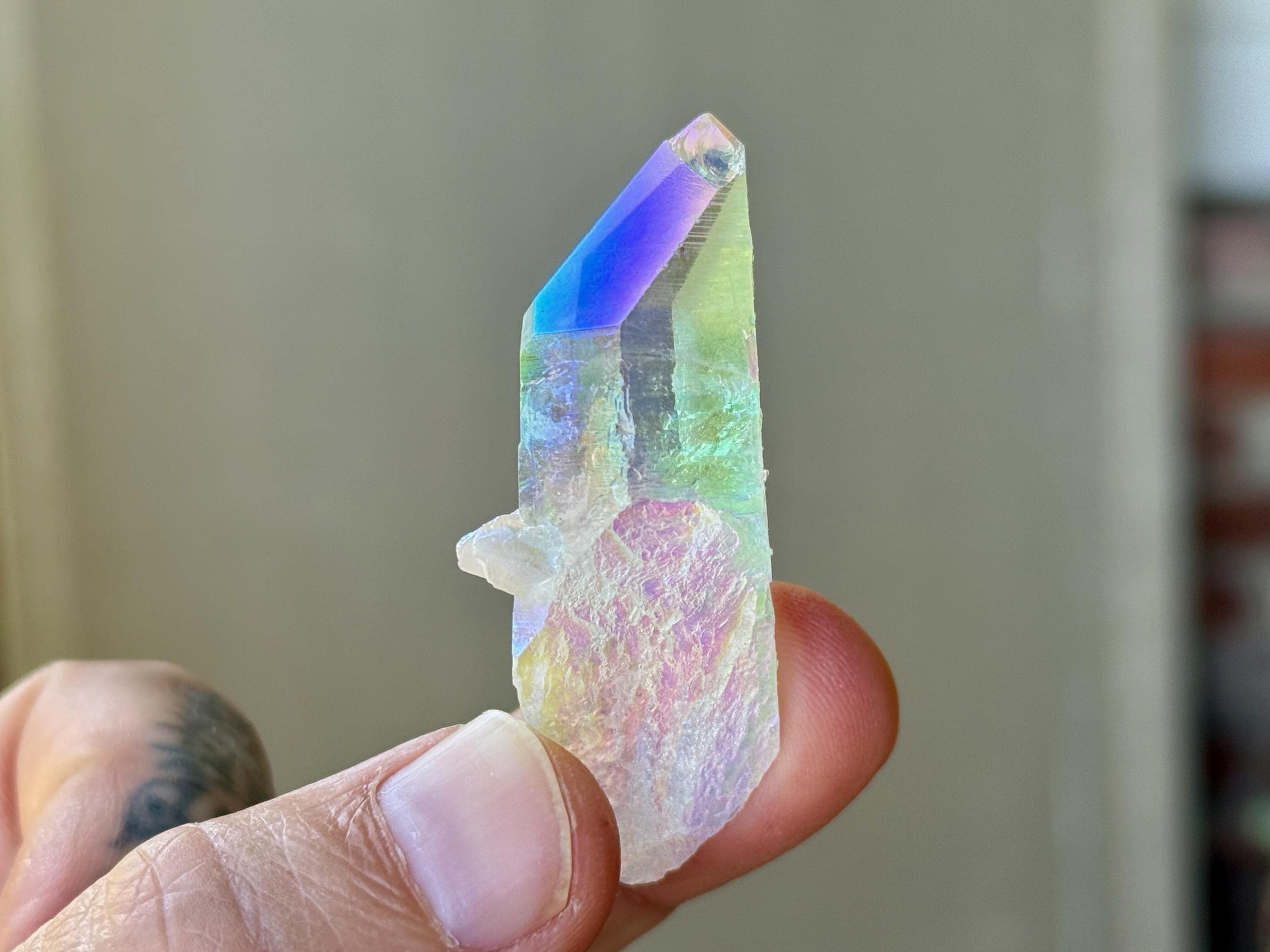 This superb Opal Aura Lemurian Quartz comes from an old collection. Also known as "Angel Aura" Quartz, these crystals are the result of a lab process which bonds Platinum with, in this case, a very high-quality Lemurian Quartz crystal from Minas Gerais, Brazil (many "aura" crystals begin with domestic quartz). The result is a heavenly opalescence, creating a truly ethereal, prismatic effect, while retaining all the physical and energetic features of the Lemurian itself. With the energetic properties of Platinum combined with the high vibration of Lemurian Quartz, these crystals are powerful healers, bringing cosmic consciousness into the physical realm to be integrated.