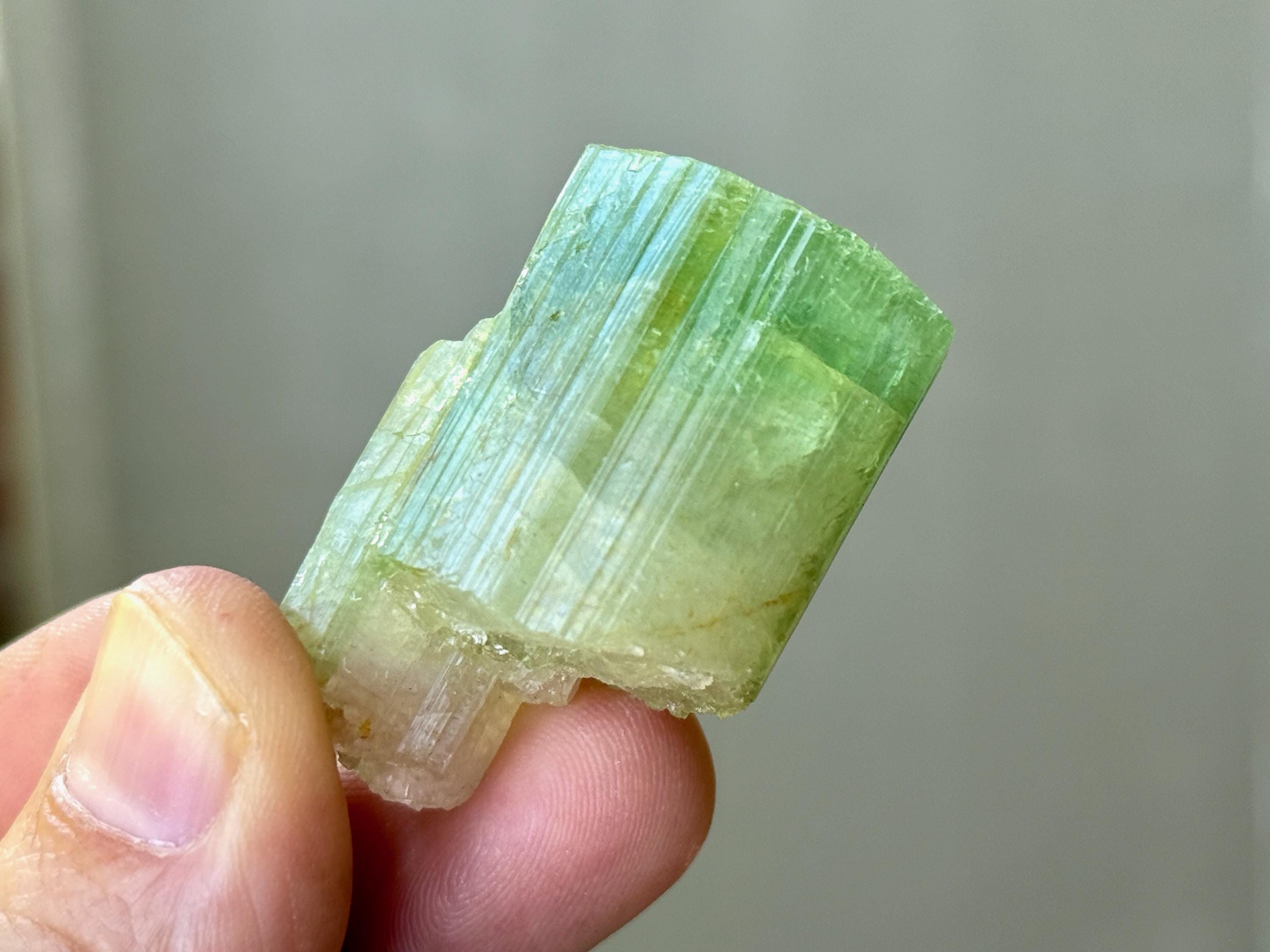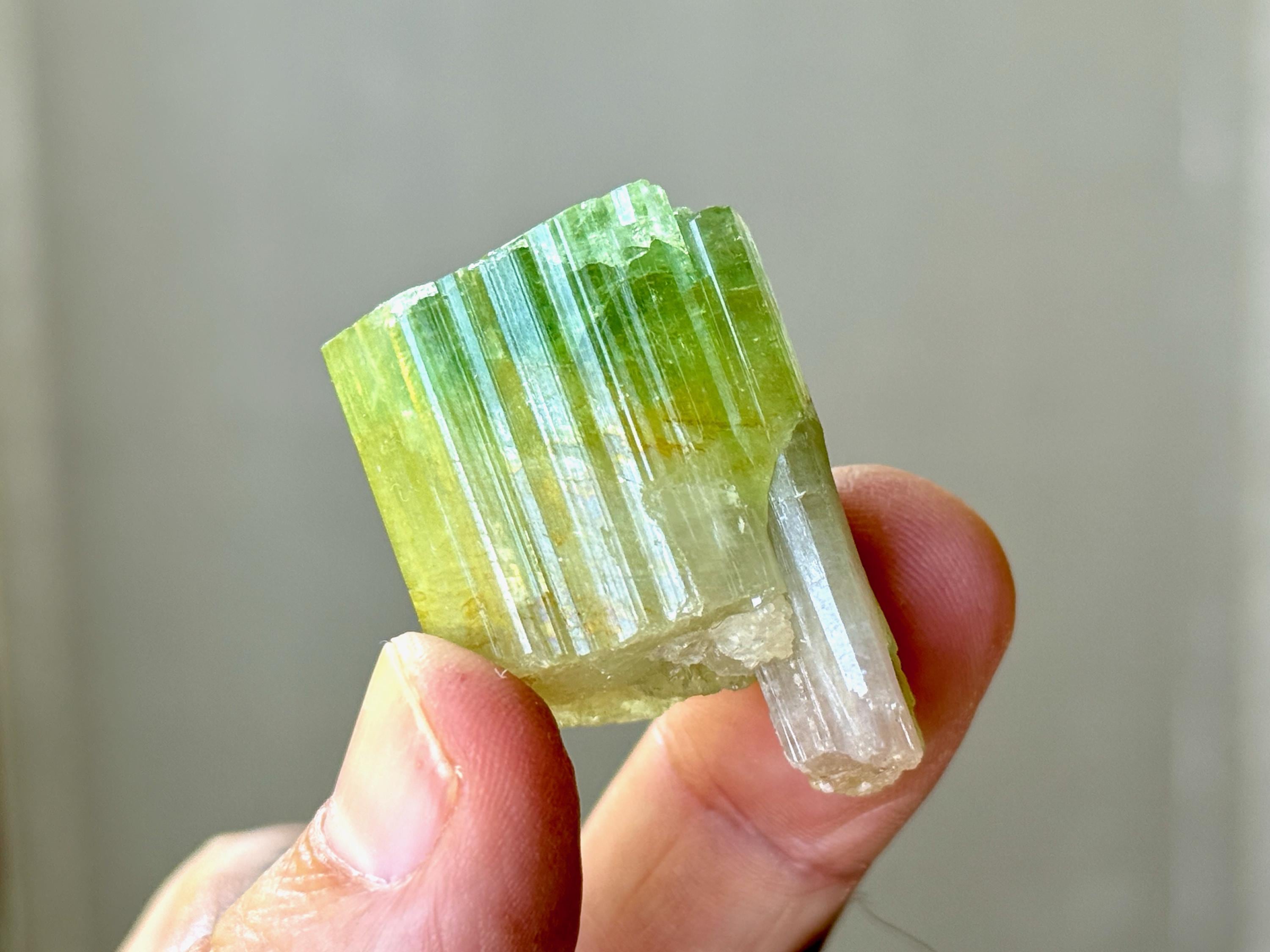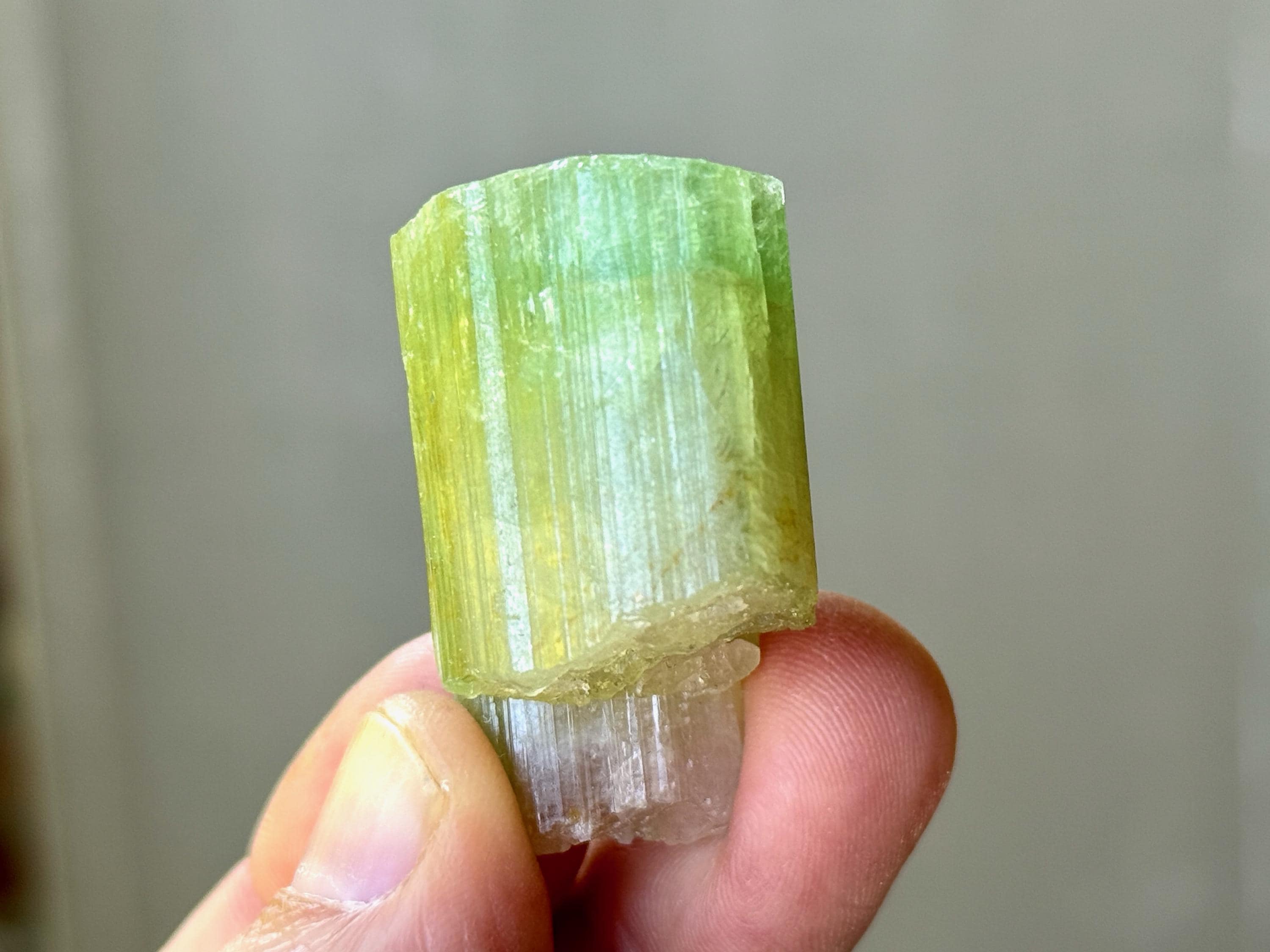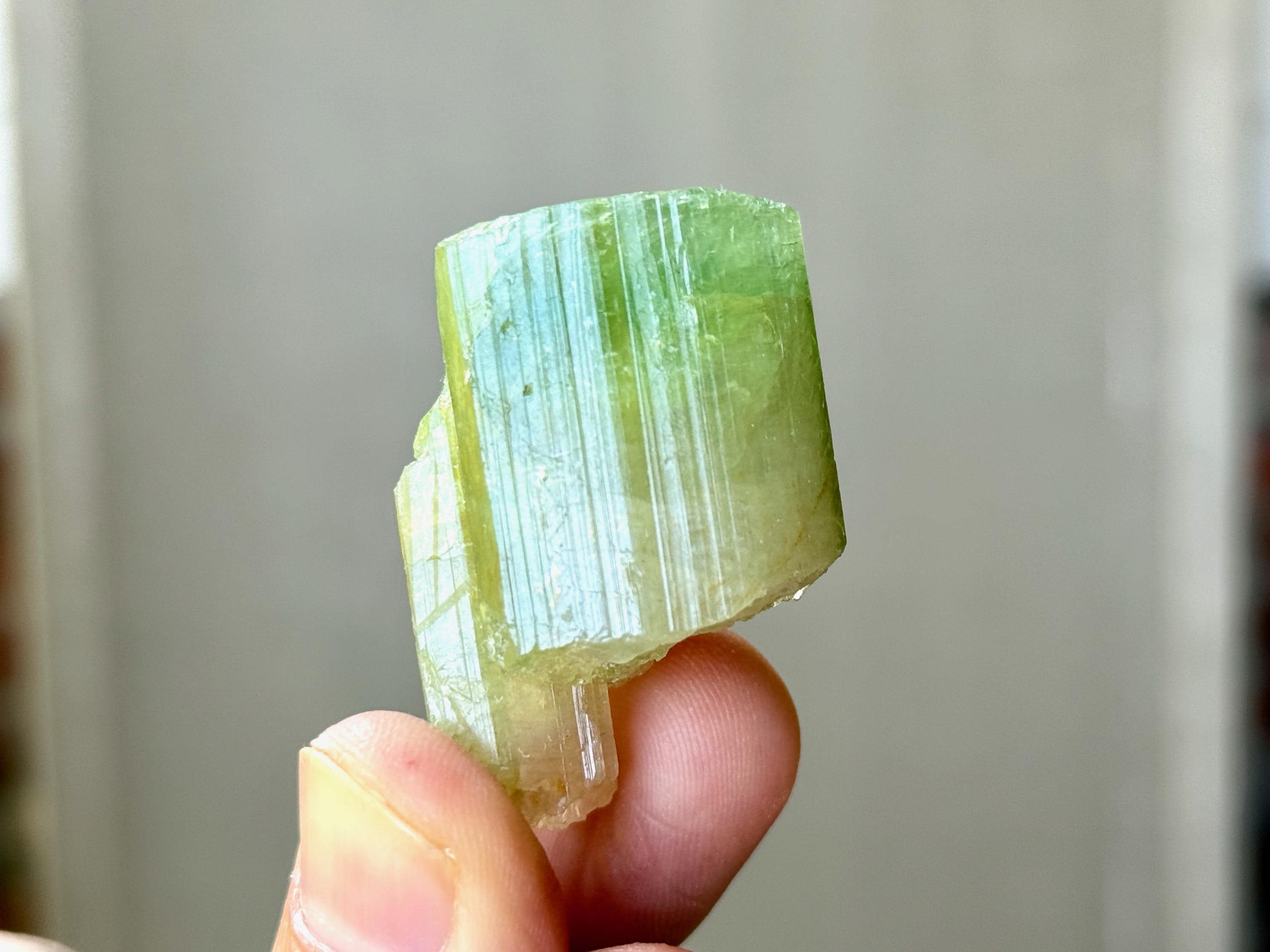 The unmistakable pastel green hues of the Urubu Mine here on this lustrous Tourmaline crystal! This unique crystal features gradient hues of green that are darker toward the top and more yellow in the midsection. When backlit, as in Photos 3-4, we can see it passes light beautifully.