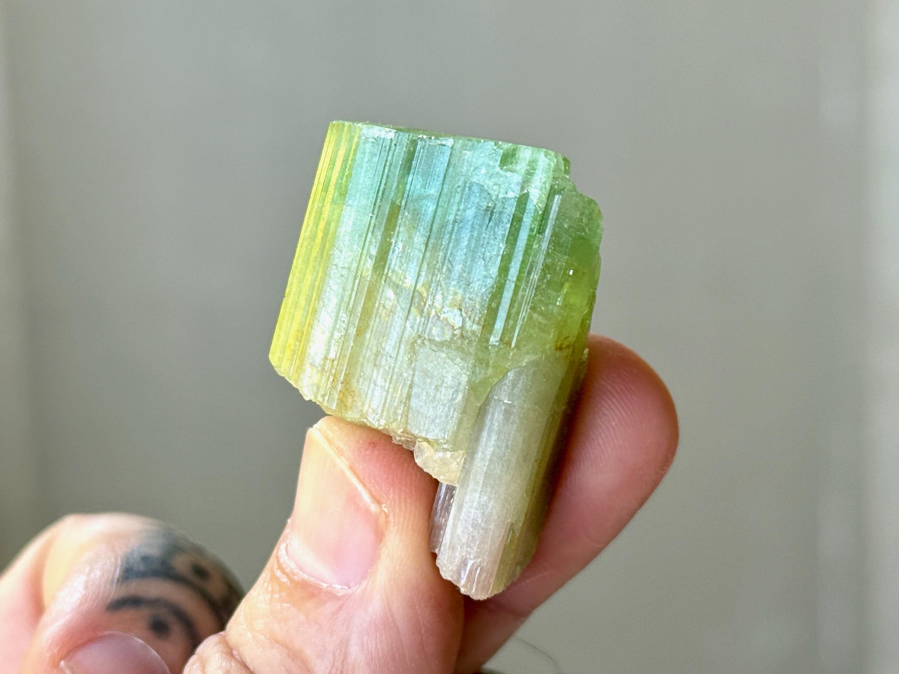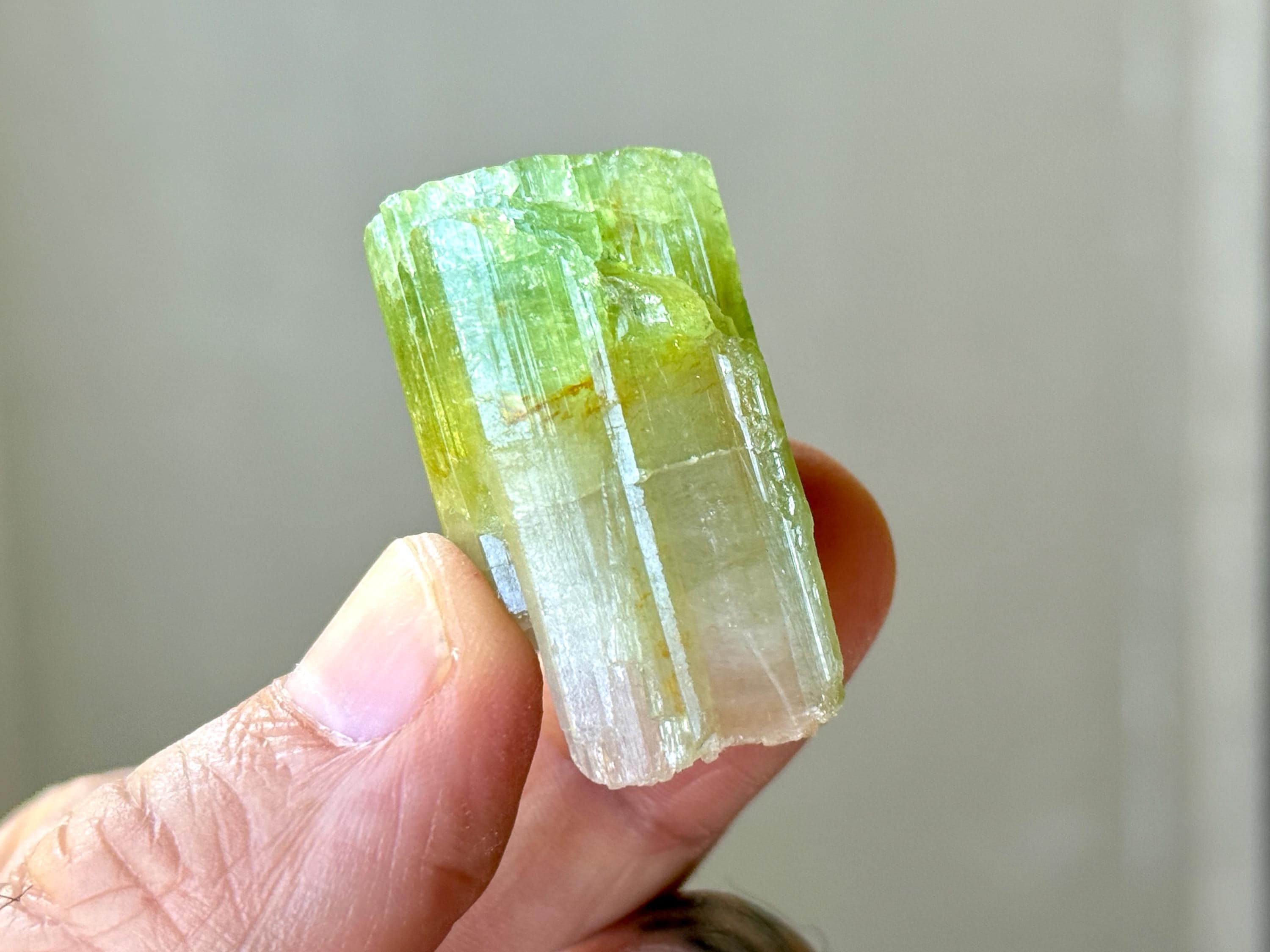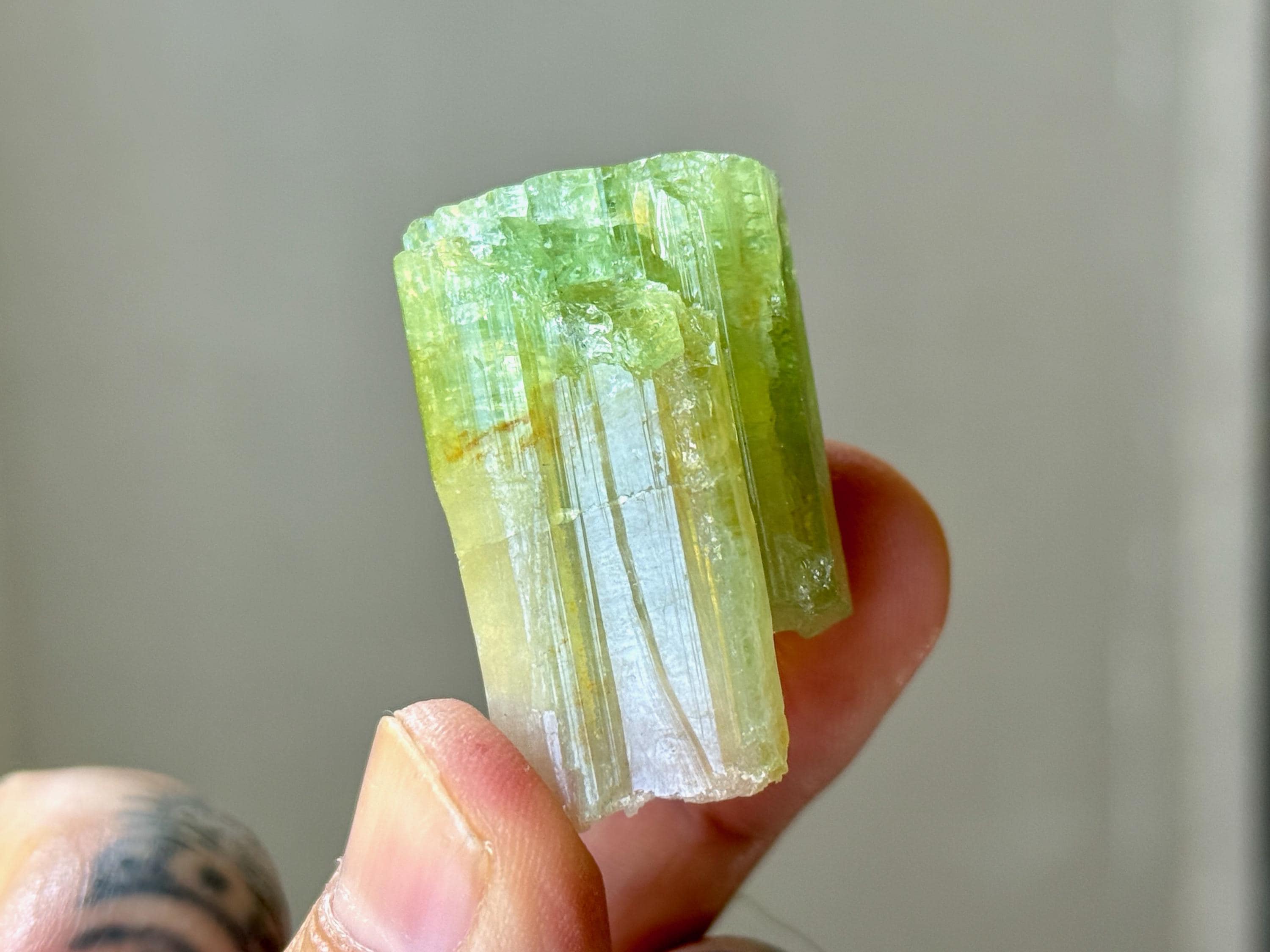 The unmistakable pastel green hues of the Urubu Mine here on this lustrous Tourmaline crystal! This unique crystal features gradient hues of green that are darker toward the top and more yellow in the midsection. When backlit, as in Photos 3-4, we can see it passes light beautifully.