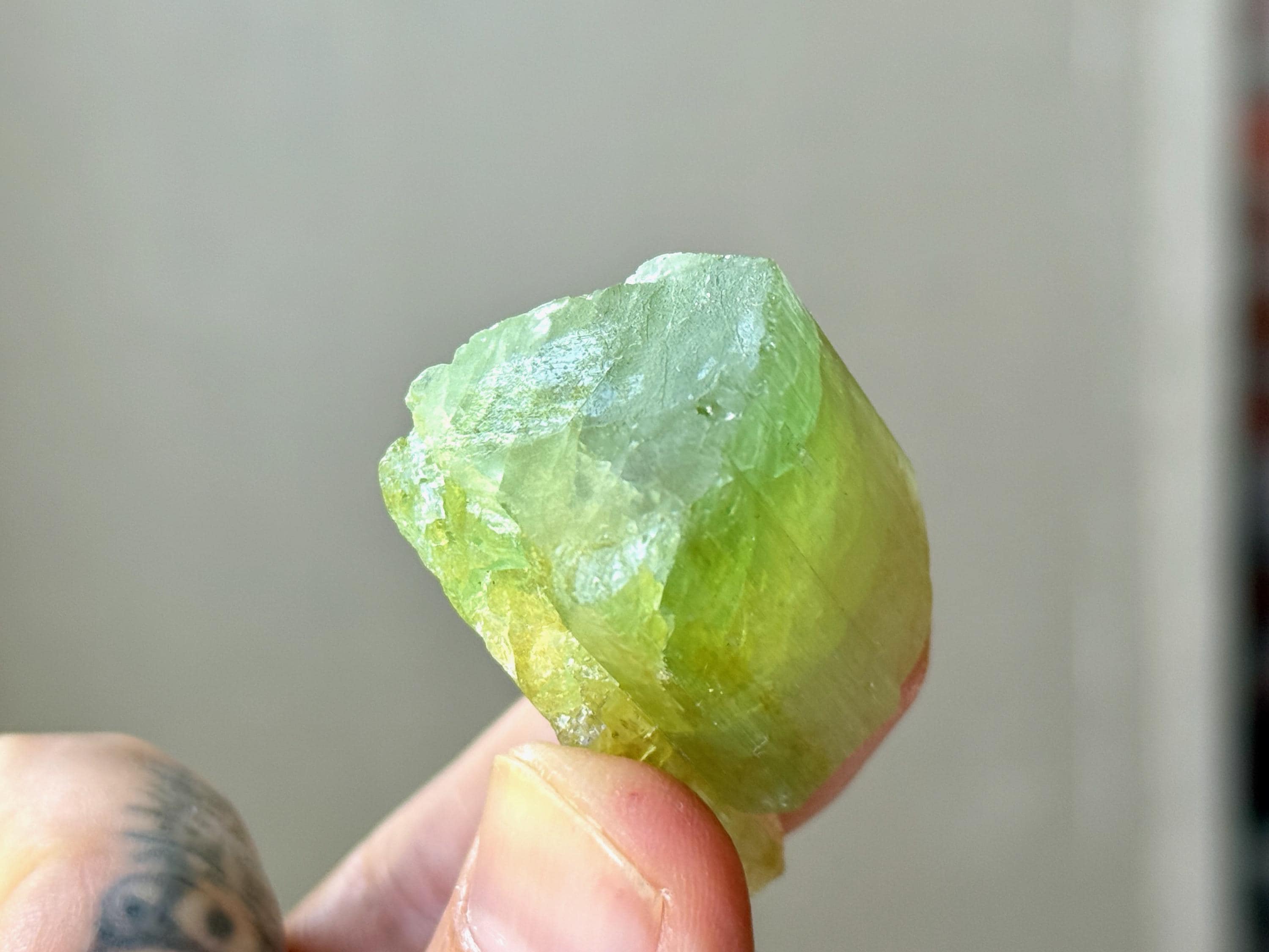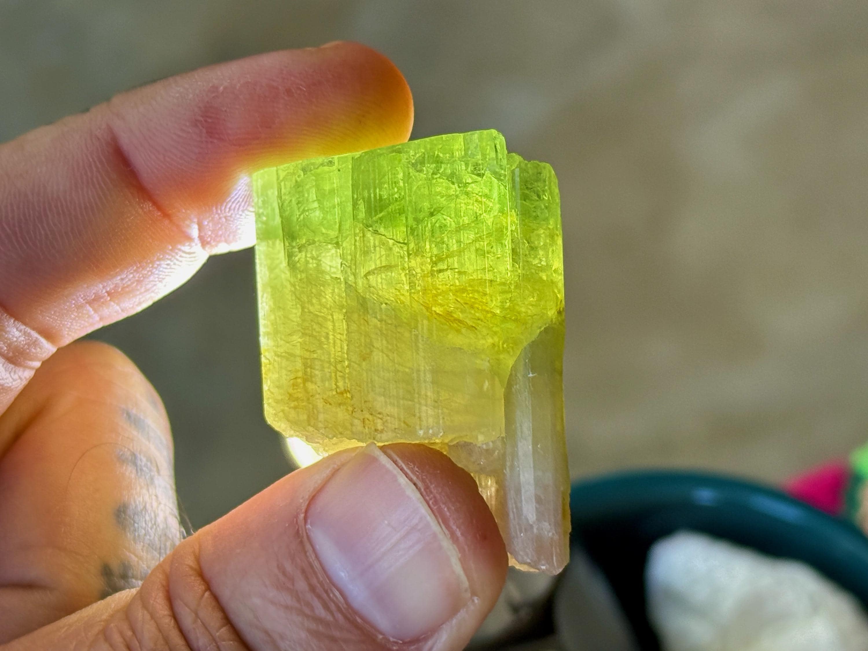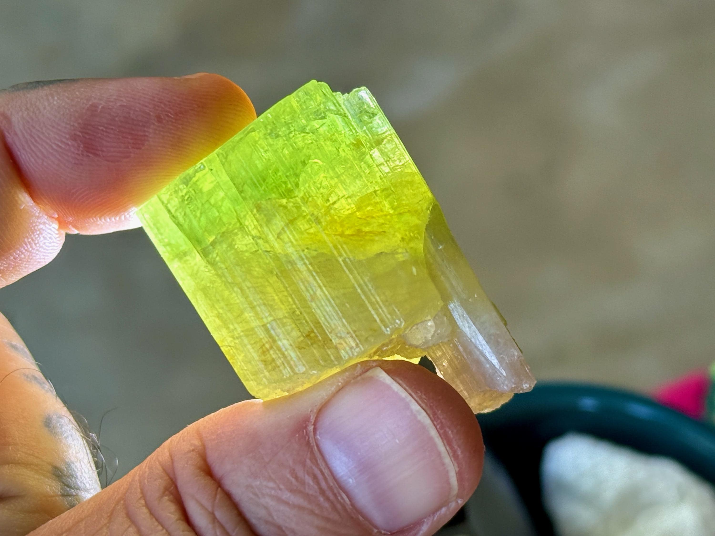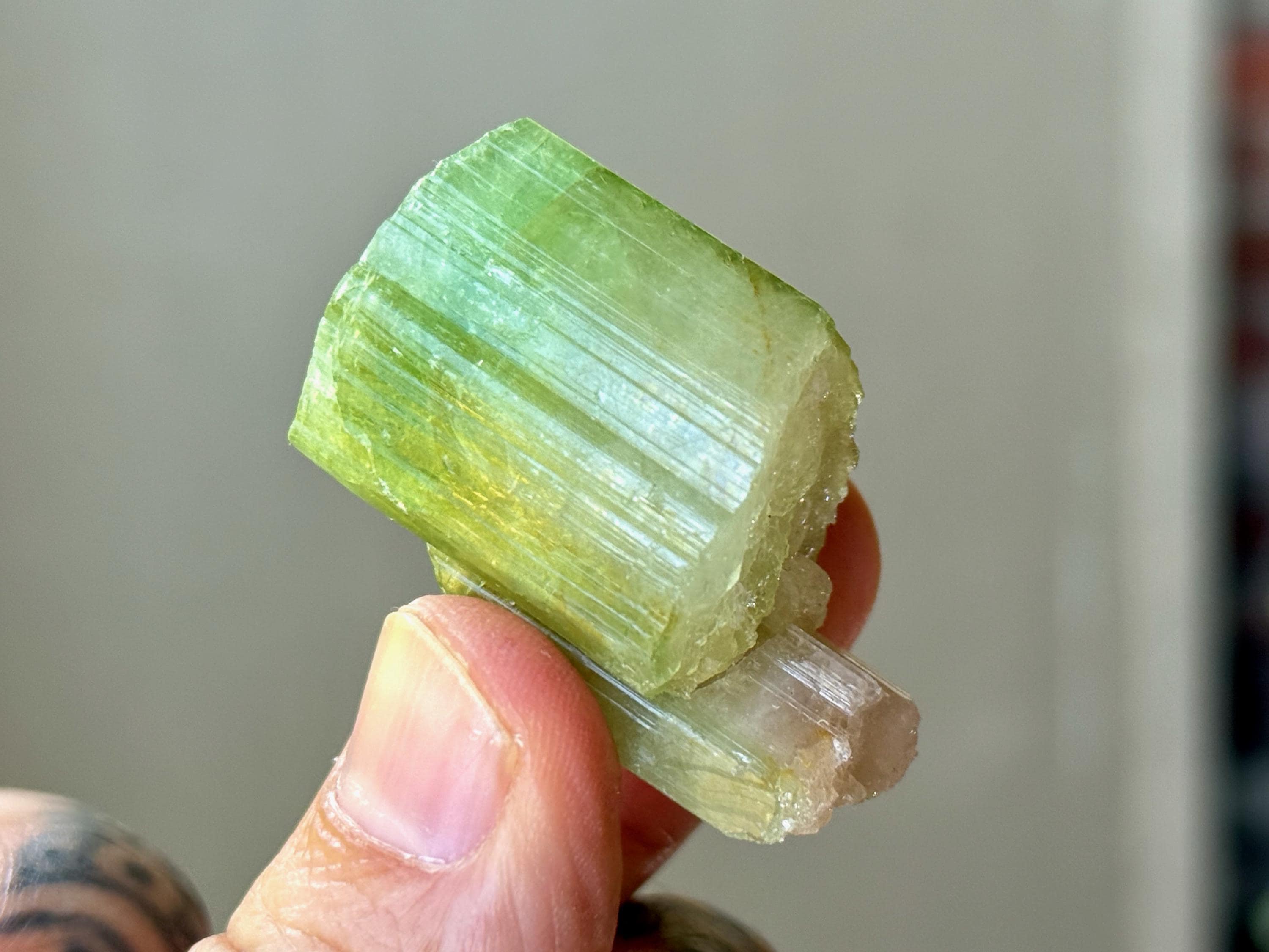 The unmistakable pastel green hues of the Urubu Mine here on this lustrous Tourmaline crystal! This unique crystal features gradient hues of green that are darker toward the top and more yellow in the midsection. When backlit, as in Photos 3-4, we can see it passes light beautifully.